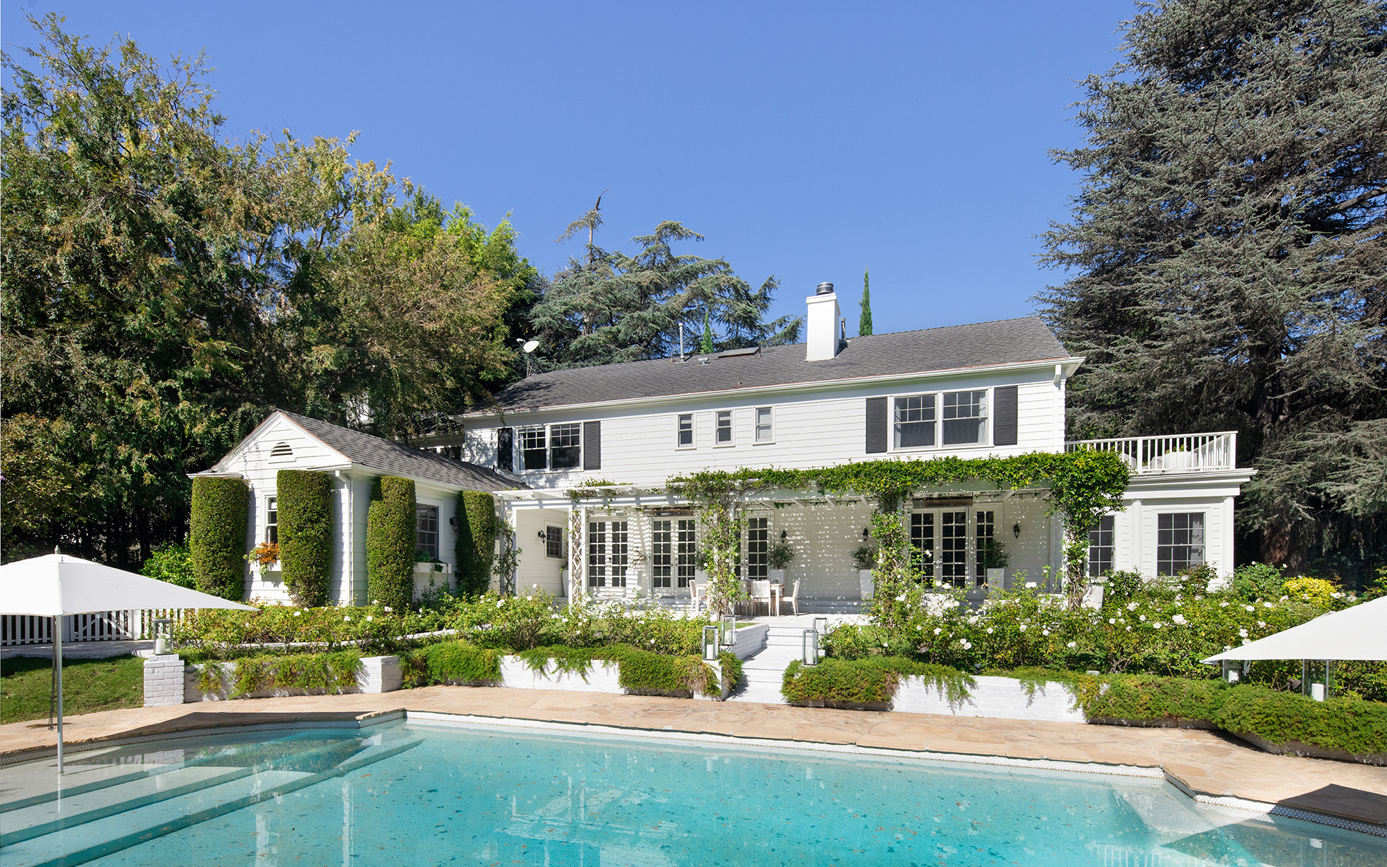 Stately Paul Williams on one of the largest lots in Little Holmby. Mature hedging and trees offer absolute privacy. Formal entry welcomes you to the elegantly scaled public spaces, perfect for entertaining. Beautiful millwork, high end finishes and French doors throughout all overlook the bucolic grounds. Formal living room with fireplace and attached sunroom anchor one side of the home, while the gracious dining room with wainscoting, eat-in gourmet kitchen and family room anchor the other. Upstairs features 4 bedrooms including a luxurious principal suite with sumptuous bathroom with soaking tub, two walk-in closets and private balcony. Additional maids and laundry room complete the main house. Separate two-story guest house with high-end screening room, spacious home office or living area, kitchenette and bathroom. Grounds feature large pool with Baja shelf, multiple sitting areas with fireplace and lush gardens. Gated driveway with 2-car garage and large motor court.