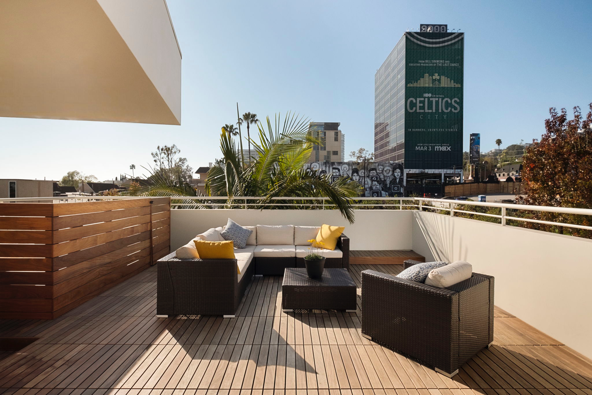 Thoughtfully reimagined by renowned designer Caroline Schoppe, this stunning, standalone home in a private WeHo gated community offers coveted indoor/outdoor living plus an expansive rooftop deck to enjoy city-to-ocean views. With a Scandinavian-inspired aesthetic, this home features an open floor plan that seamlessly flows from the airy living room, complete with a contemporary fireplace, to the kitchen and dining area. The top-of-the-line kitchen is a chef's dream, boasting custom cabinetry, quartz countertops, Thermador appliances, a dual-zone wine fridge, and a custom wine hutch. When you're ready to unwind, escape to the spacious primary suite with a private balcony, a walk-in closet, and an en suite bath with a dual-sink vanity and a luxurious soaker tub. The interior is flooded with natural light, thanks to four large patios and sliding glass doors that connect to the outdoor spaces. Outside, the home shines with an extraordinary ~800 sq. ft. rooftop deck offering 360 views, including a half IPE floating deck and premium turf with an elevated irrigation system, creating a lush, low-maintenance space. On the ground level, the private backyard is beautifully redesigned with a tiled patio, premium turf, and a composite IPE privacy wall. With a secure two-car garage, ample guest parking, and smart home features including Lutron outlets and security cameras, this home is both stylish and functional. Located in the heart of West Hollywood, this oasis is just moments away from the vibrant shops, restaurants, and nightlife of Sunset and Melrose.