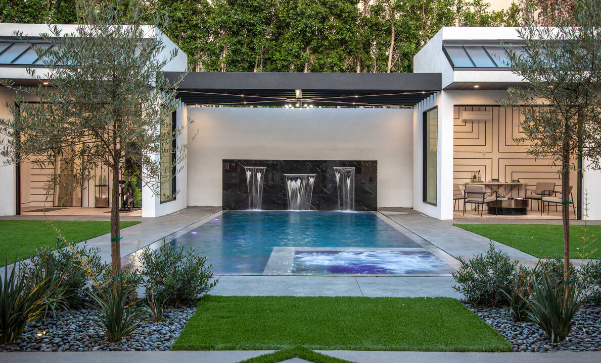 Immaculately constructed, this new contemporary estate offers an expansive open floor plan & resort-style backyard, while showcasing unprecedented details & beautifully luxe interiors. The 5 bedroom/7.5 bathroom gated home features a 30 ft. black quartz waterfall cascading down from the 2000 sq.ft. rooftop deck to the exterior front walkway, all surrounded by mature landscaping (6-car driveway parking.) Upon entry, 11ft. high ceilings beam with natural light & floor-to-ceiling glass pocket doors open up to a massive outdoor space, complete with two cabana-style, full bath ADUs, firepit lounge, BBQ & zero-edge pool/spa with water feature. White quartz stairs lead to the rooms upstairs that all encircle an exterior fireplace lounge terrace. The large primary suite includes an adjoining wellness/exercise room, along w/walk-in closet, steam shower, soaking tub & balconies throughout. Other notable features: temperature controlled wine cellar, 6-person theater & Control4 home automation system.