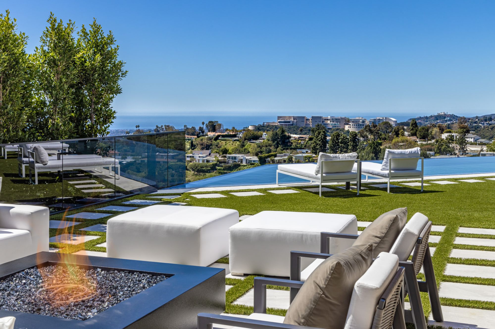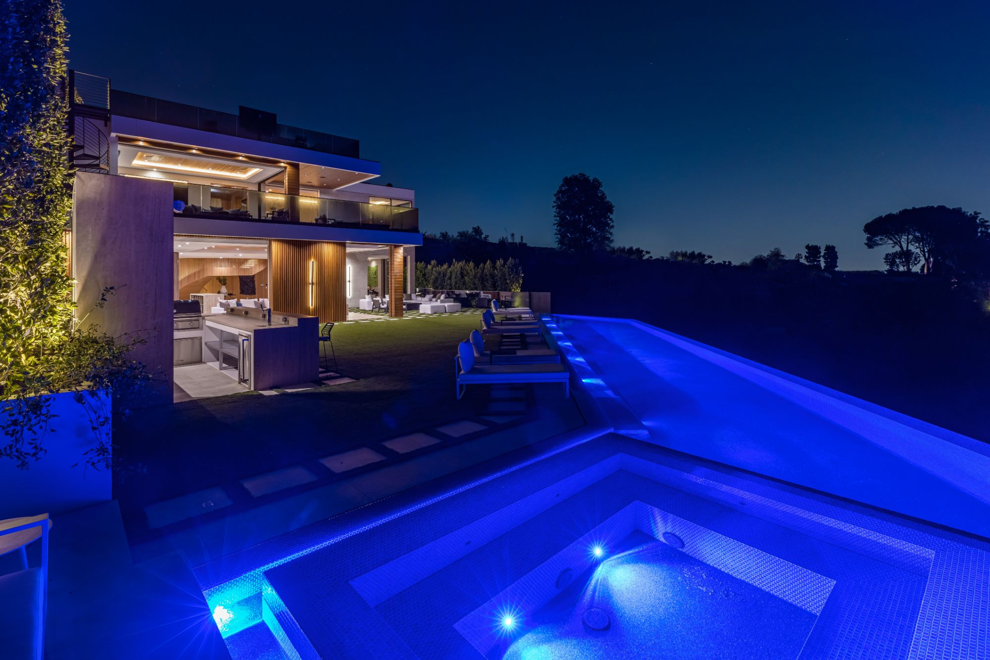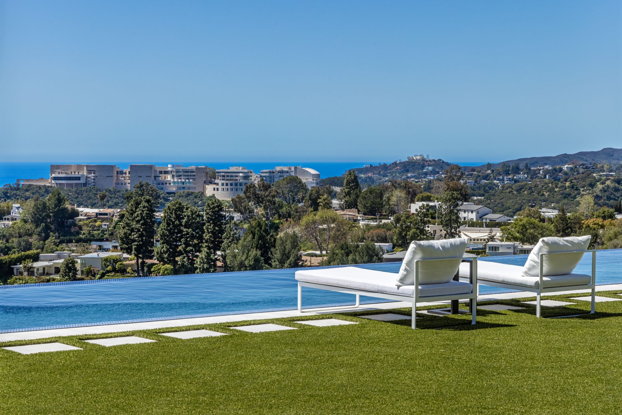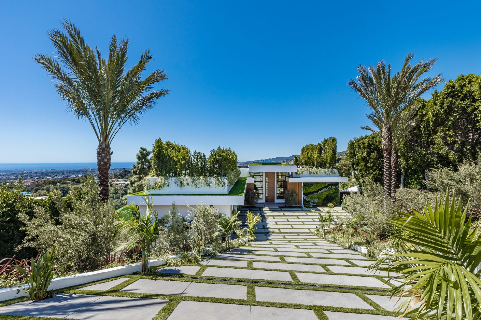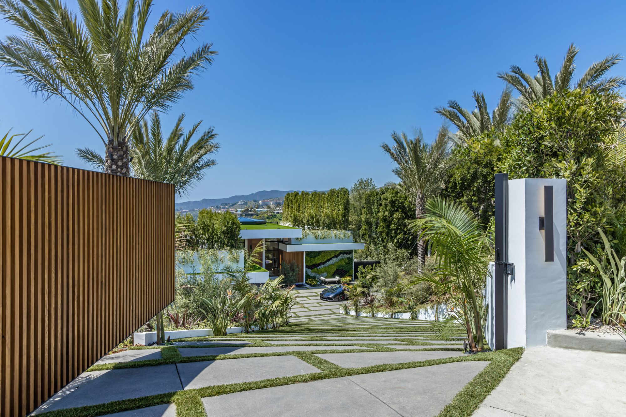 Welcome to Bel-Air Paradise, a brand-new estate, designed and built by the legendary Designer and Developer, Ramtin Ray Nosrati. Descend the private, gated driveway to this incredible oasis set in one of the most prestigious neighborhoods. The lush grounds and gated drive provide the utmost privacy and security. The oversized front door is flanked by walls of glass, wood, and a colorful living wall to create an unforgettable welcome. Step inside to experience the warm contemporary design, high-end finishes, show-stopping living wall, high ceilings, and panoramic ocean/city views. Automated Fleetwood glass doors open throughout the home to create a seamless indoor/outdoor lifestyle. The custom culinary center is a gourmand's dream, with state-of-the-art appliances, adjacent chef's prep area with restaurant-grade walk-in refrigerator, and oversized island. A travertine clad bar and stunning wine room with tasting area help to make this one of the most incredible homes for entertaining. The primary suite is complete with fireplace, wraparound deck with fire pit and sweeping views, spa-inspired bath with oversized rainwater shower, a Zen soaking tub, dual-sink vanity, and custom walk-in closet and dressing room. The latest and greatest amenities include a theater, gym, resort-style tropical landscaping, parking for 7 cars, smart-home system, and automated security. The outdoor oasis offers the perfect space for dining al fresco, outdoor kitchen with bar and flat-screen tv, flat grassy areas, spa, and a massive 80-foot zero-edge infinity-edge pool looking out to incredible city and ocean vistas. There is a large flat area that is perfect for adding a sports court, pickleball court, or tennis court. The outdoor space continues to the rooftop lounge with bar, large tv, fire pit, built-in BBQ, and putting green. Do not miss this opportunity to live at Bel-Air Paradise with jetliner views and incredible amenities in one of the most sought-after locations.