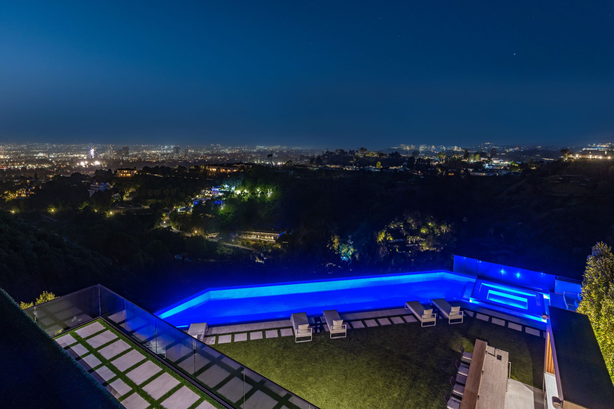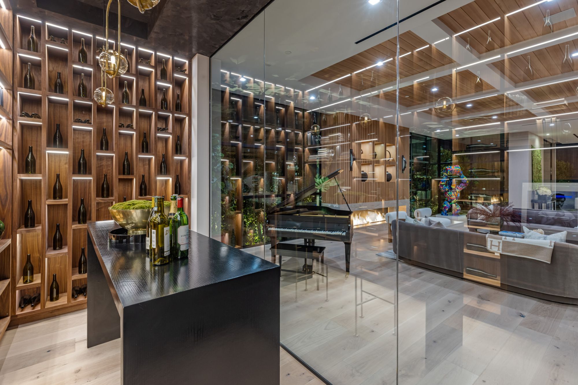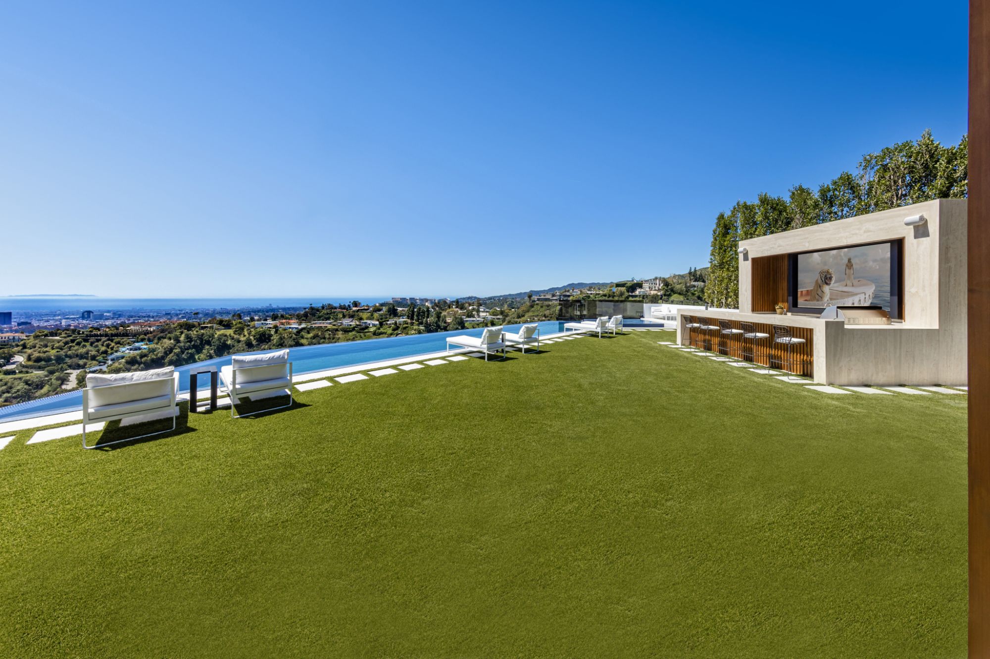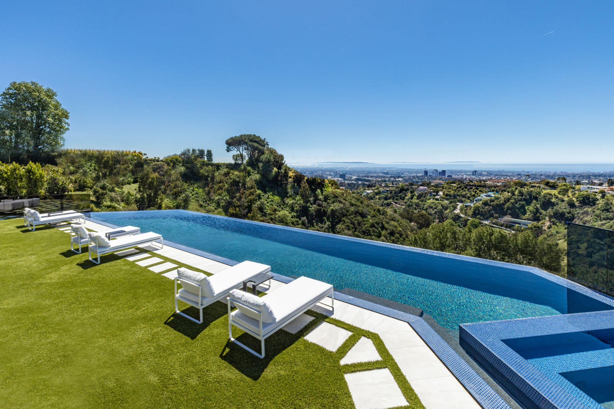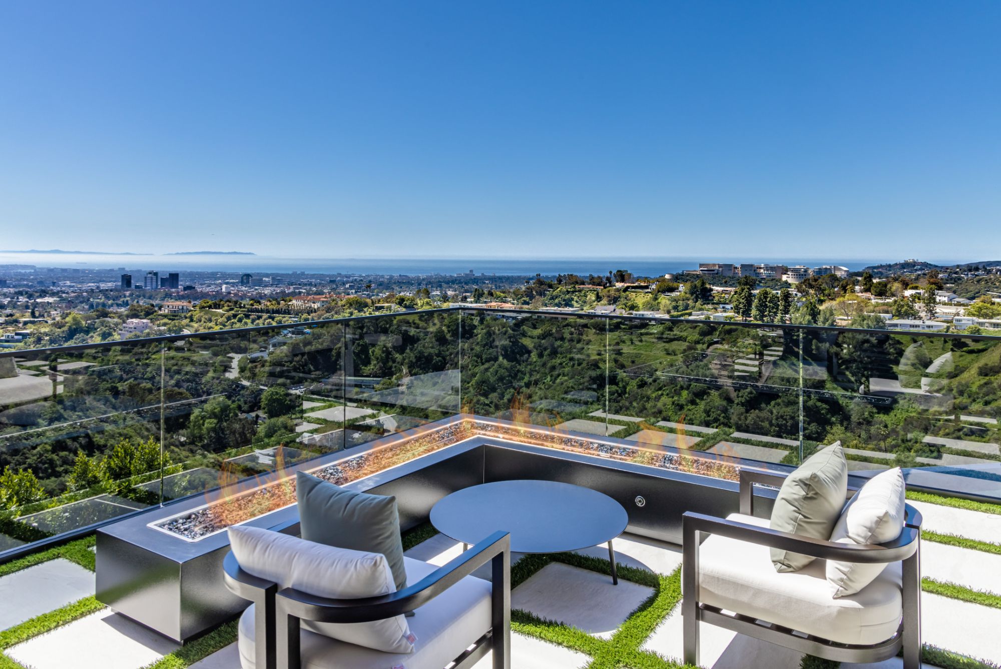 Welcome to Bel-Air Paradise, a brand-new estate, designed and built by the legendary Designer and Developer, Ramtin Ray Nosrati. Descend the private, gated driveway to this incredible oasis set in one of the most prestigious neighborhoods. The lush grounds and gated drive provide the utmost privacy and security. The oversized front door is flanked by walls of glass, wood, and a colorful living wall to create an unforgettable welcome. Step inside to experience the warm contemporary design, high-end finishes, show-stopping living wall, high ceilings, and panoramic ocean/city views. Automated Fleetwood glass doors open throughout the home to create a seamless indoor/outdoor lifestyle. The custom culinary center is a gourmand's dream, with state-of-the-art appliances, adjacent chef's prep area with restaurant-grade walk-in refrigerator, and oversized island. A travertine clad bar and stunning wine room with tasting area help to make this one of the most incredible homes for entertaining. The primary suite is complete with fireplace, wraparound deck with fire pit and sweeping views, spa-inspired bath with oversized rainwater shower, a Zen soaking tub, dual-sink vanity, and custom walk-in closet and dressing room. The latest and greatest amenities include a theater, gym, resort-style tropical landscaping, parking for 7 cars, smart-home system, and automated security. The outdoor oasis offers the perfect space for dining al fresco, outdoor kitchen with bar and flat-screen tv, flat grassy areas, spa, and a massive 80-foot zero-edge infinity-edge pool looking out to incredible city and ocean vistas. There is a large flat area that is perfect for adding a sports court, pickleball court, or tennis court. The outdoor space continues to the rooftop lounge with bar, large tv, fire pit, built-in BBQ, and putting green. Do not miss this opportunity to live at Bel-Air Paradise with jetliner views and incredible amenities in one of the most sought-after locations.