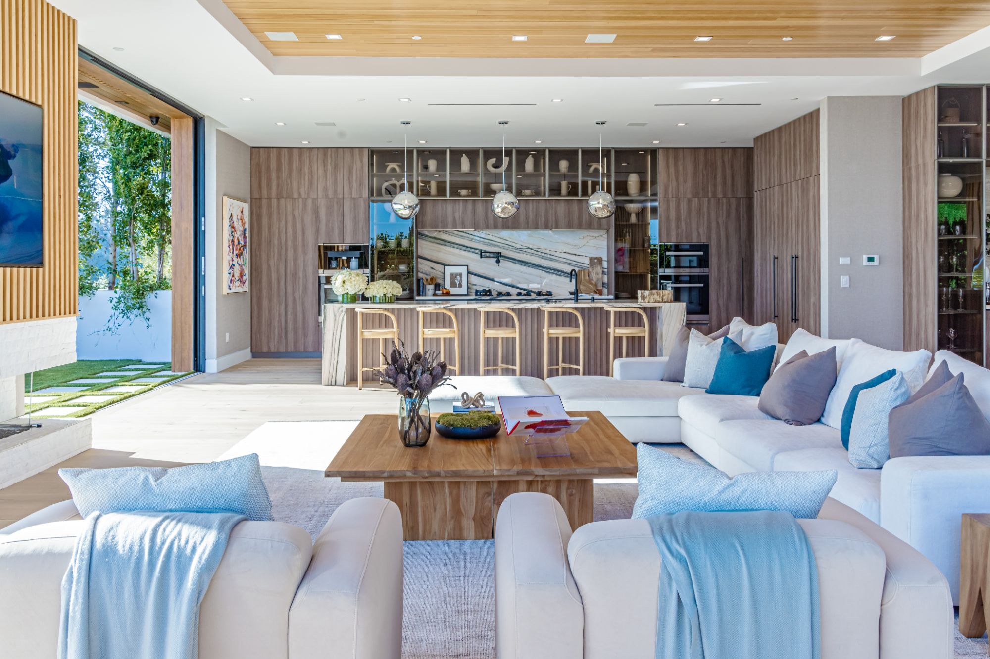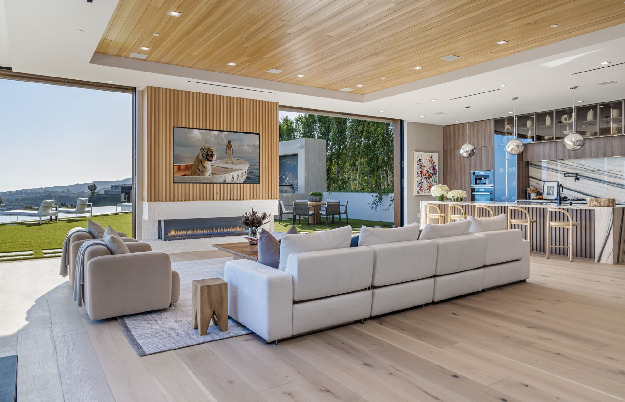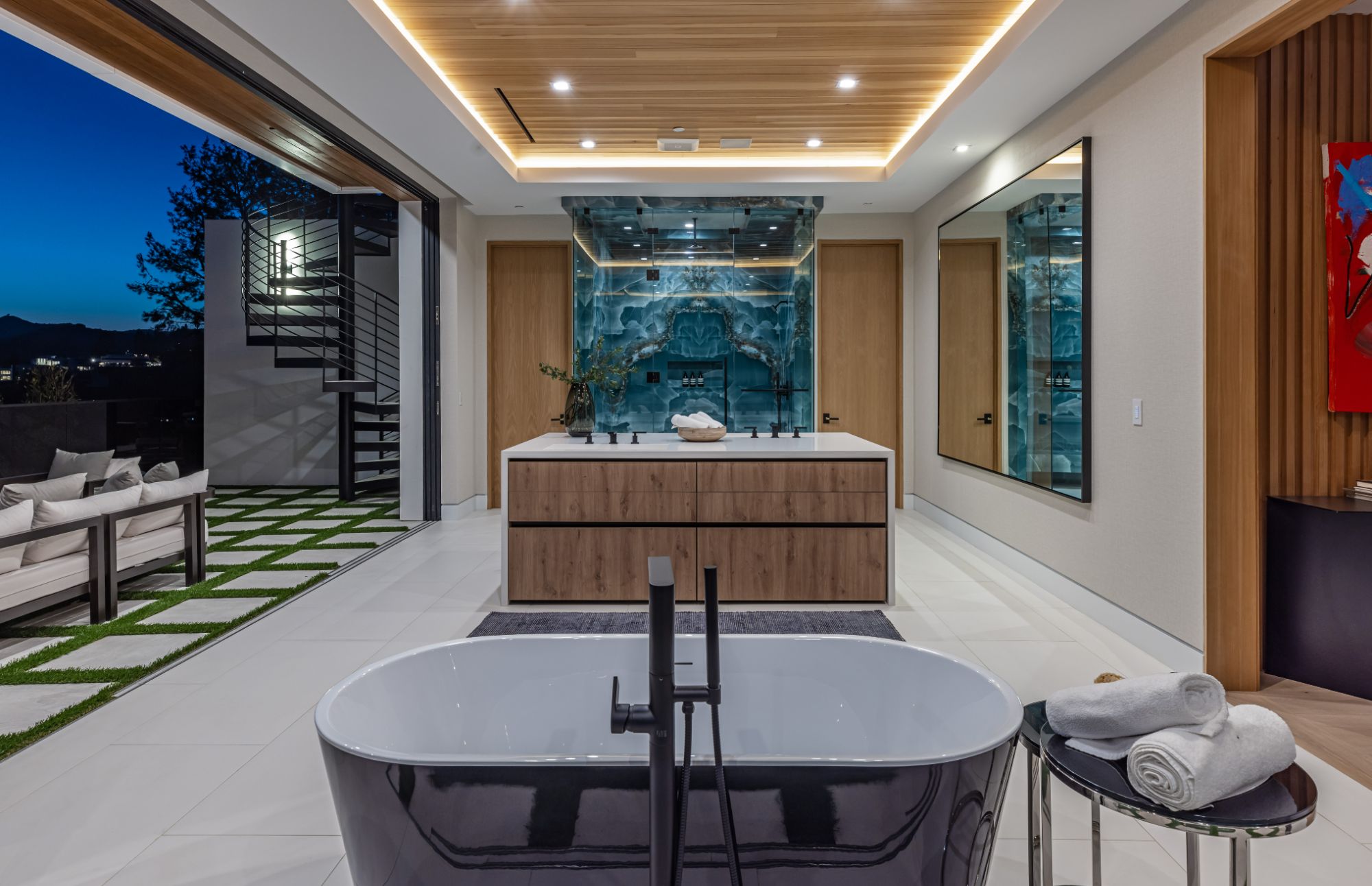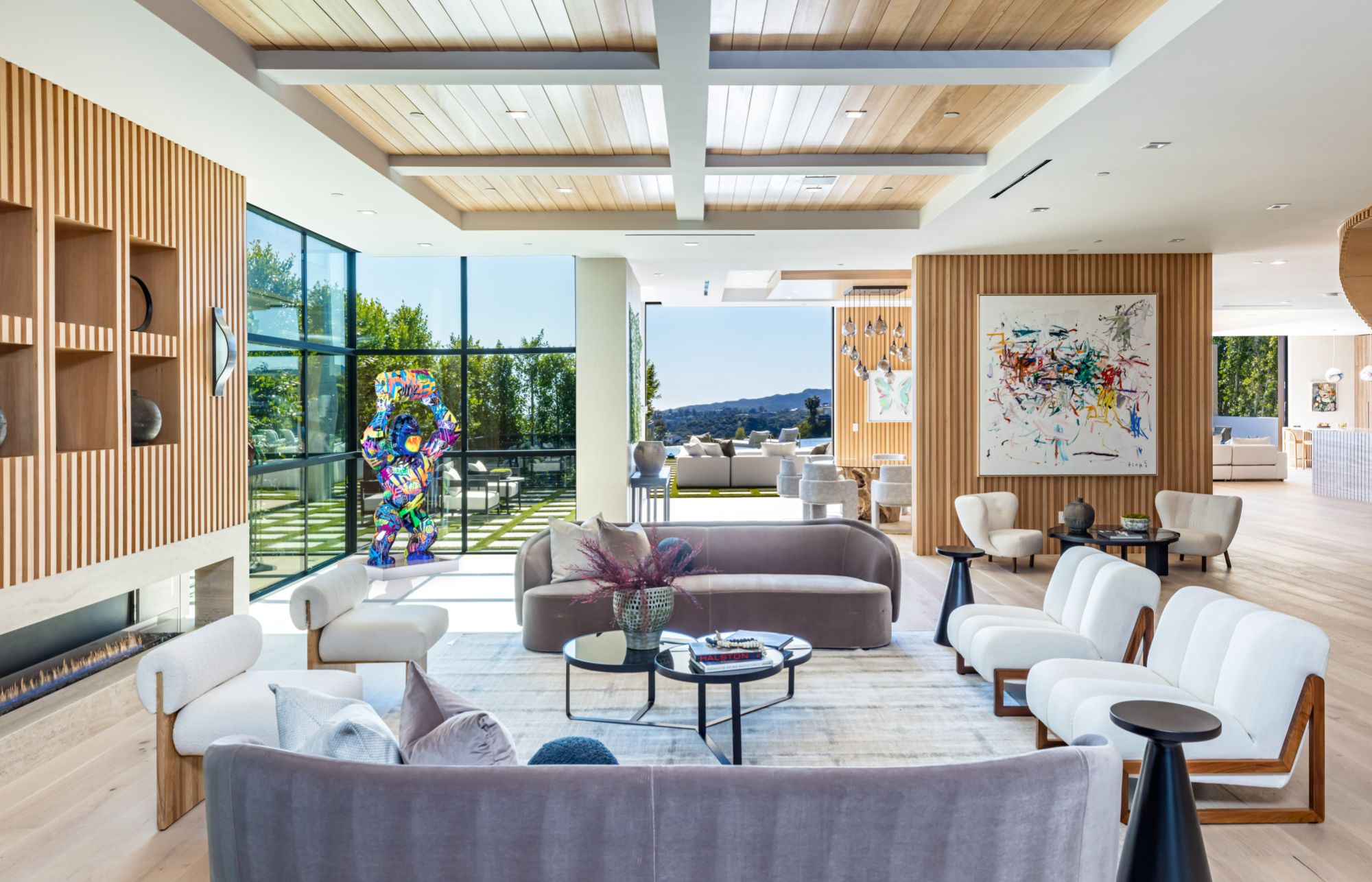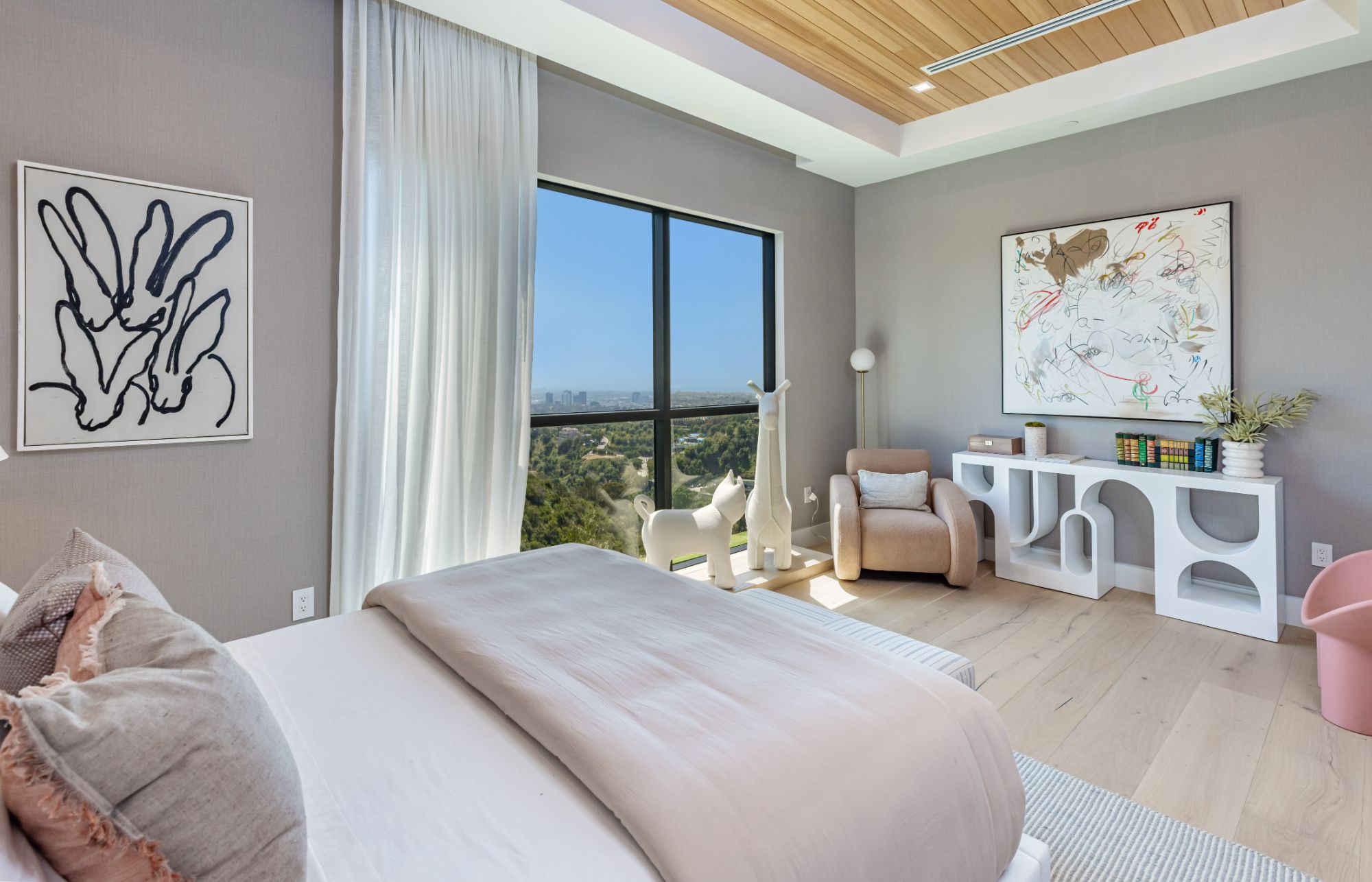 Welcome to Bel-Air Paradise, a brand-new estate, designed and built by the legendary Designer and Developer, Ramtin Ray Nosrati. Descend the private, gated driveway to this incredible oasis set in one of the most prestigious neighborhoods. The lush grounds and gated drive provide the utmost privacy and security. The oversized front door is flanked by walls of glass, wood, and a colorful living wall to create an unforgettable welcome. Step inside to experience the warm contemporary design, high-end finishes, show-stopping living wall, high ceilings, and panoramic ocean/city views. Automated Fleetwood glass doors open throughout the home to create a seamless indoor/outdoor lifestyle. The custom culinary center is a gourmand's dream, with state-of-the-art appliances, adjacent chef's prep area with restaurant-grade walk-in refrigerator, and oversized island. A travertine clad bar and stunning wine room with tasting area help to make this one of the most incredible homes for entertaining. The primary suite is complete with fireplace, wraparound deck with fire pit and sweeping views, spa-inspired bath with oversized rainwater shower, a Zen soaking tub, dual-sink vanity, and custom walk-in closet and dressing room. The latest and greatest amenities include a theater, gym, resort-style tropical landscaping, parking for 7 cars, smart-home system, and automated security. The outdoor oasis offers the perfect space for dining al fresco, outdoor kitchen with bar and flat-screen tv, flat grassy areas, spa, and a massive 80-foot zero-edge infinity-edge pool looking out to incredible city and ocean vistas. There is a large flat area that is perfect for adding a sports court, pickleball court, or tennis court. The outdoor space continues to the rooftop lounge with bar, large tv, fire pit, built-in BBQ, and putting green. Do not miss this opportunity to live at Bel-Air Paradise with jetliner views and incredible amenities in one of the most sought-after locations.