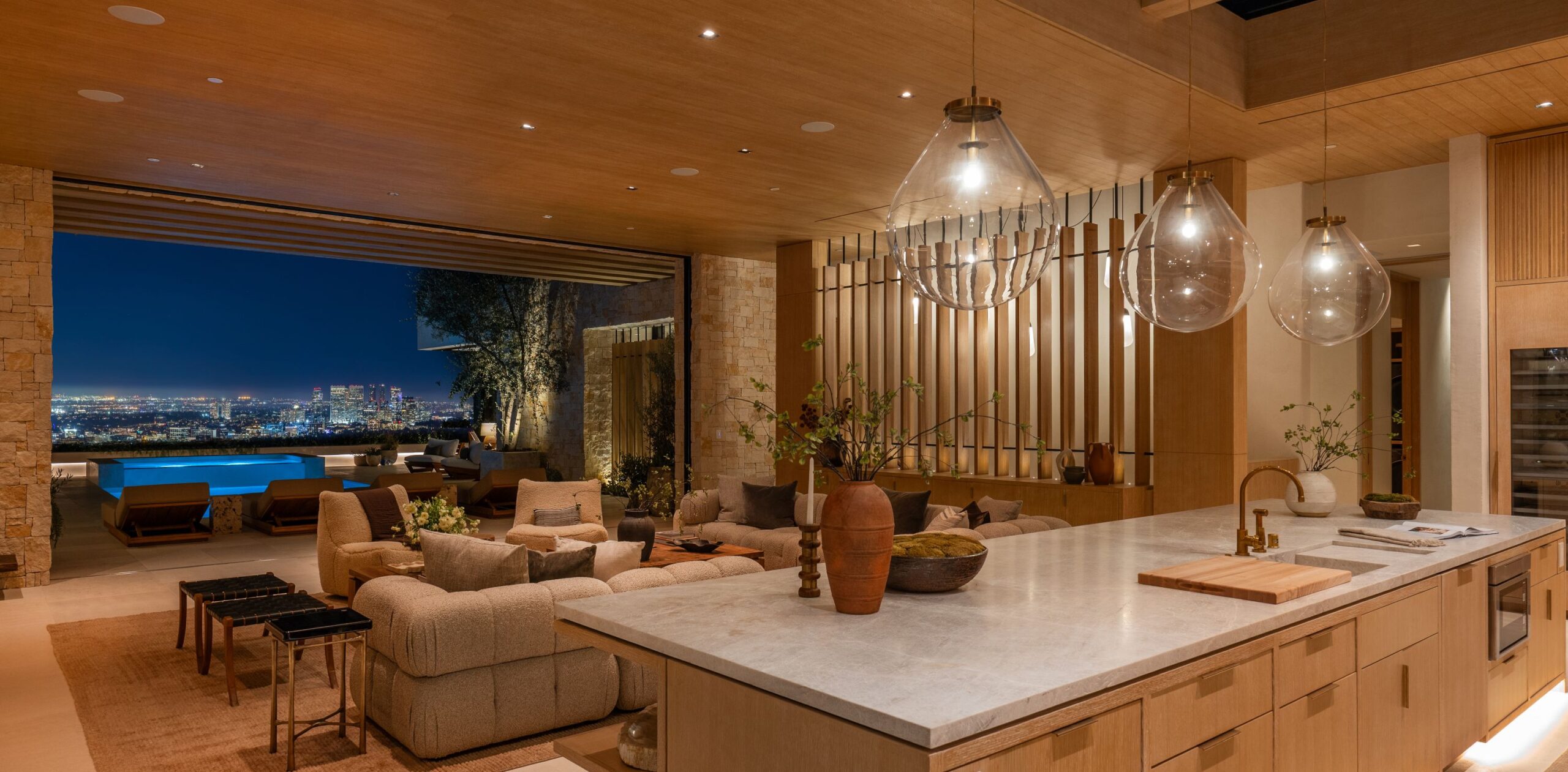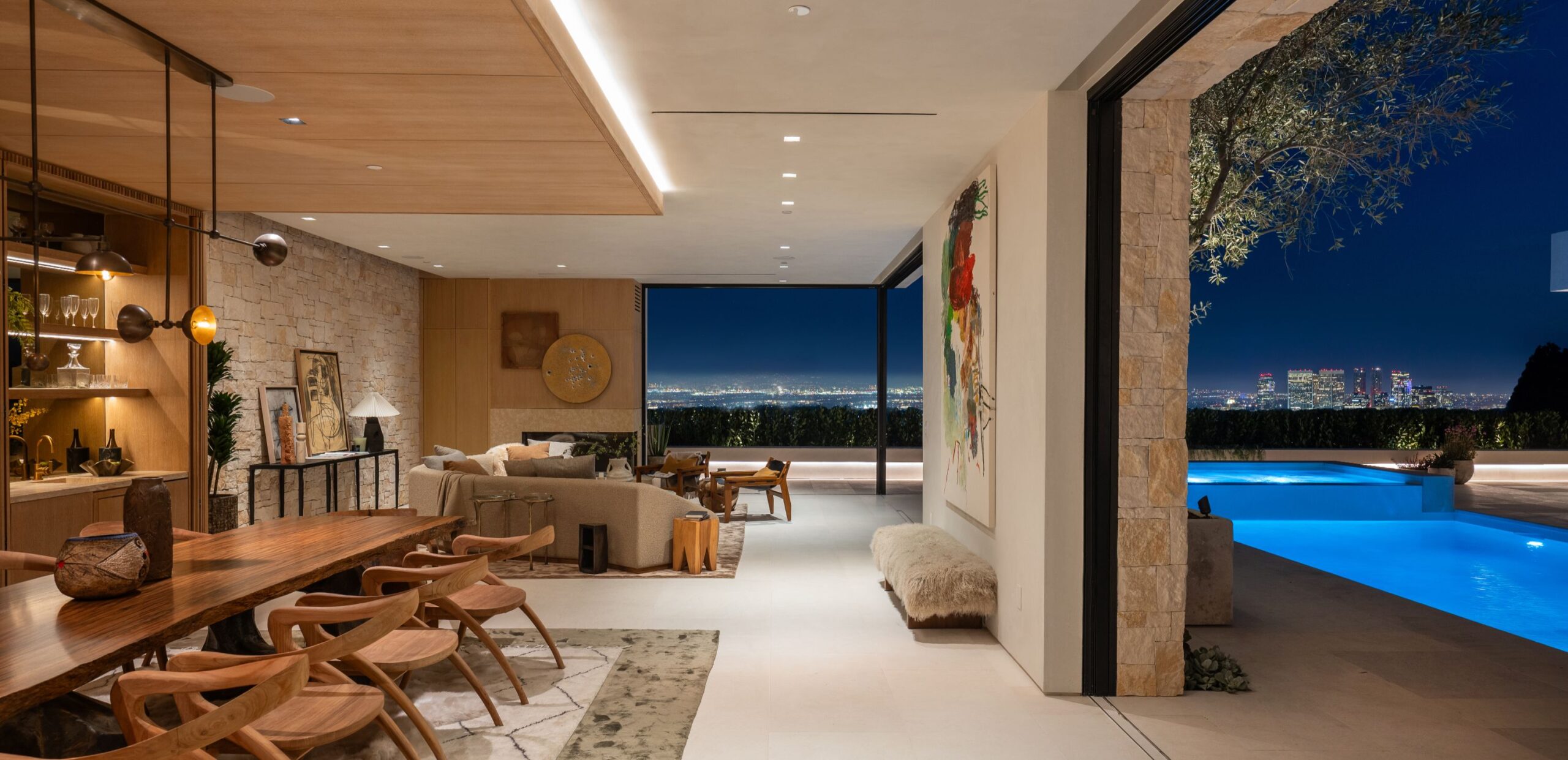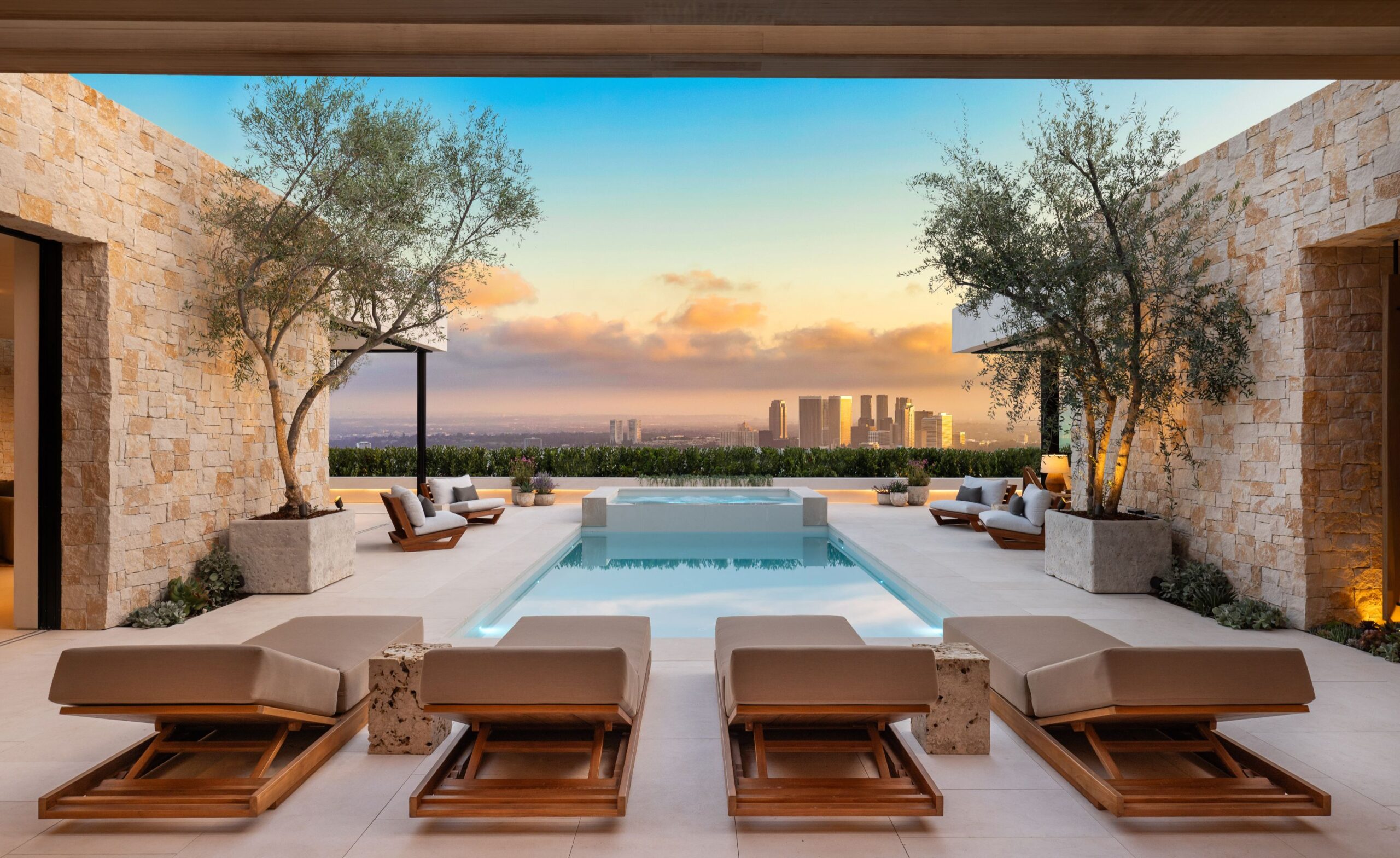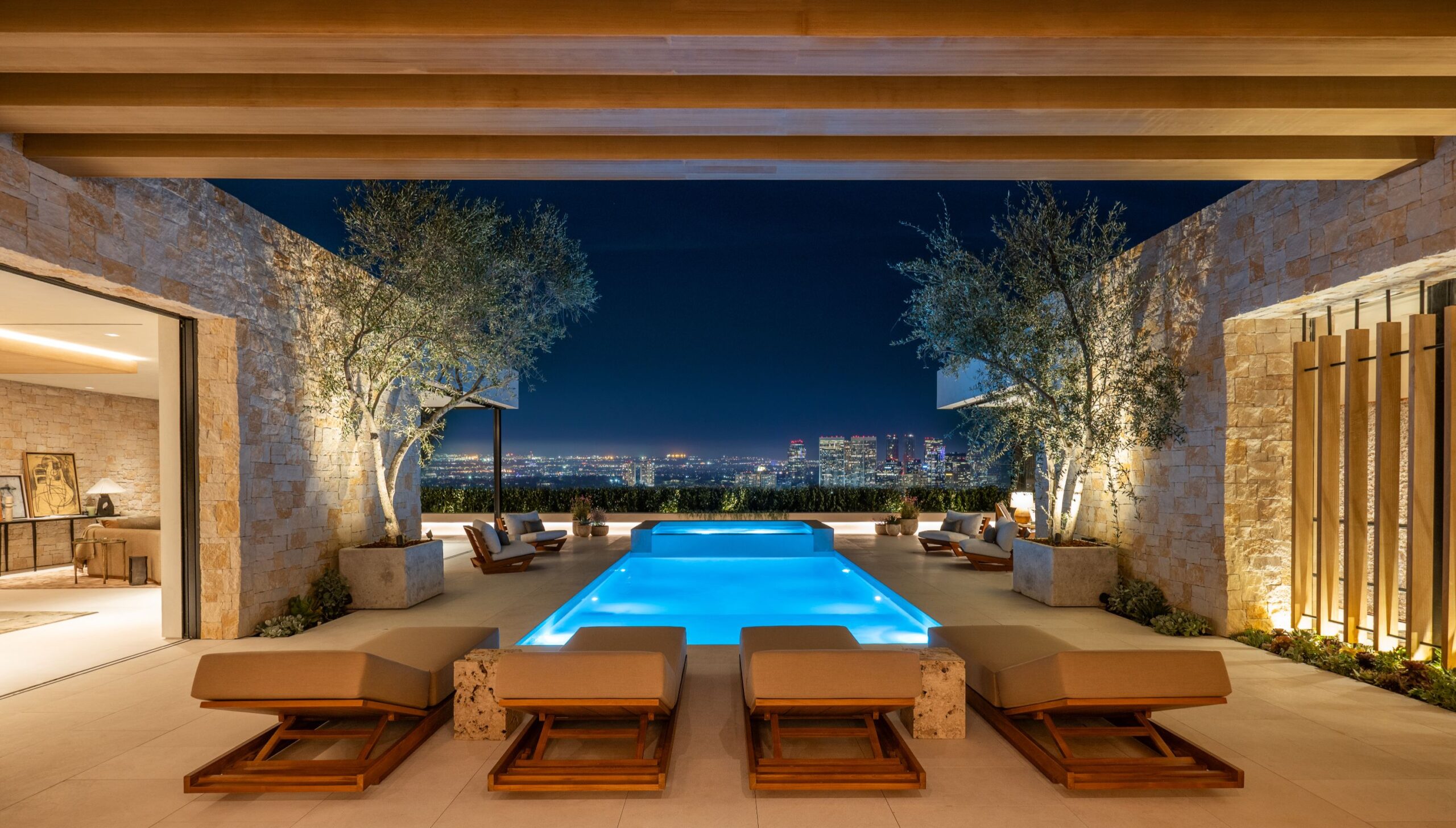 Experience timeless elegance in the exclusive Trousdale neighborhood of Beverly Hills. This organic estate designed by renowned designer Charles Infante, weaves his experience in film to create a narrative fit for entertainment and curated for elevated living in every possible way. Spanning 10,000 square feet, this architectural masterpiece showcases rich natural tones with Portuguese limestone, Italian Navona travertine, white oak paneling and floors, organic custom plaster walls, and motorized custom steel windows. Sleek lines perfectly frame cinematic city-to-ocean views. Inside, the main living spaces are open and airy, with walls of glass that fully pocket to create a seamless indoor/outdoor flow to the pool, spa, and patio. The expansive living room, dining area, and both the main and chef's kitchens are designed for grand scale living and entertaining. Four ensuite bedrooms offer refined comfort, in addition to a spacious, tranquil primary suite with motorized walls of glass, panoramic city views, and a spa-style bath. Luxurious amenities include a sleek gym with sauna, a temperature-controlled wine display, and an epic entertainment lounge with a sunken conversation pit, full bar, and state-of-the-art theater. The fully finished showcase garage features a car turntable; perfect for showcasing your collection. This is your moment to live above it all, in a home that sets the new standard for Trousdale living.