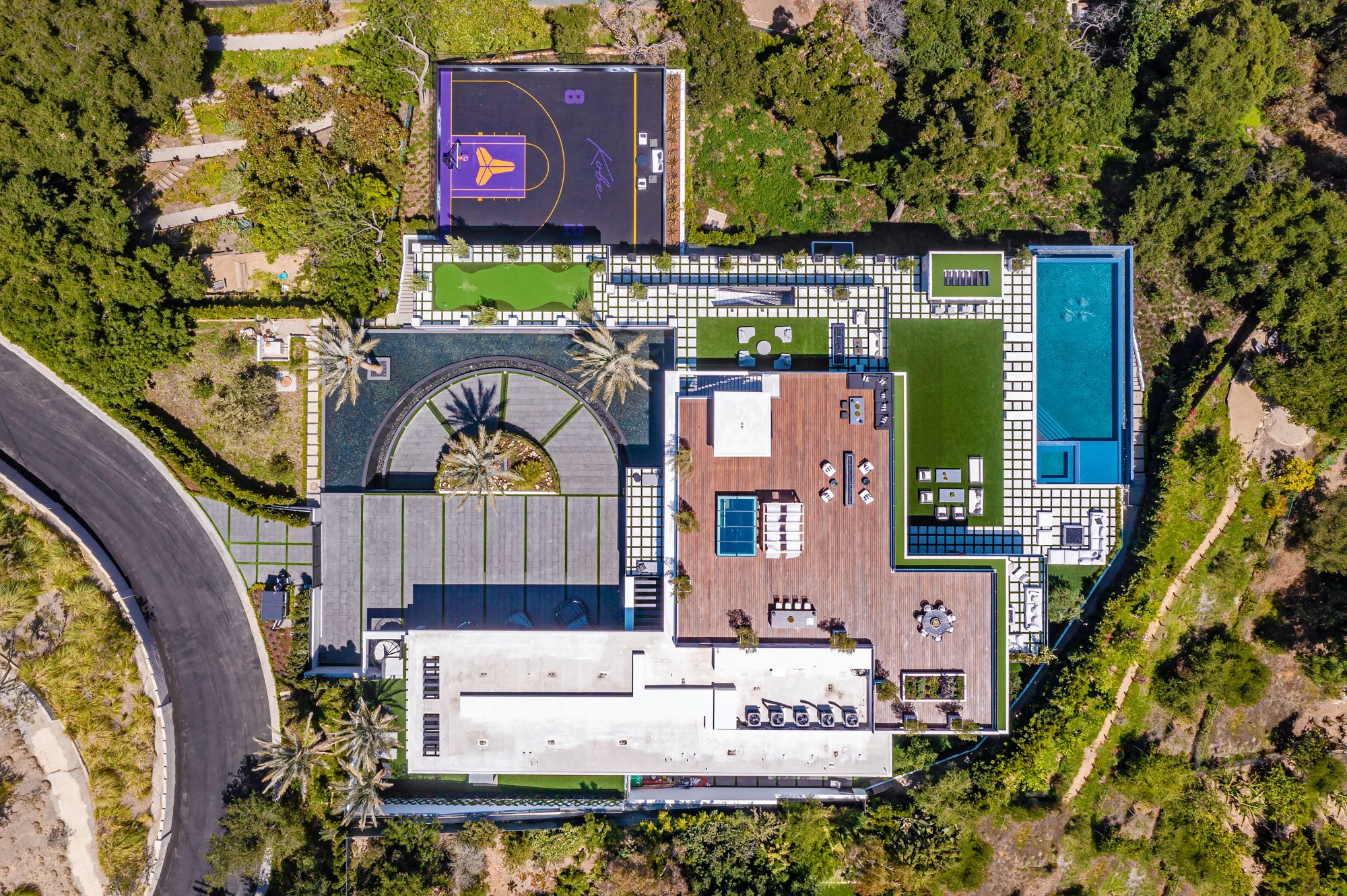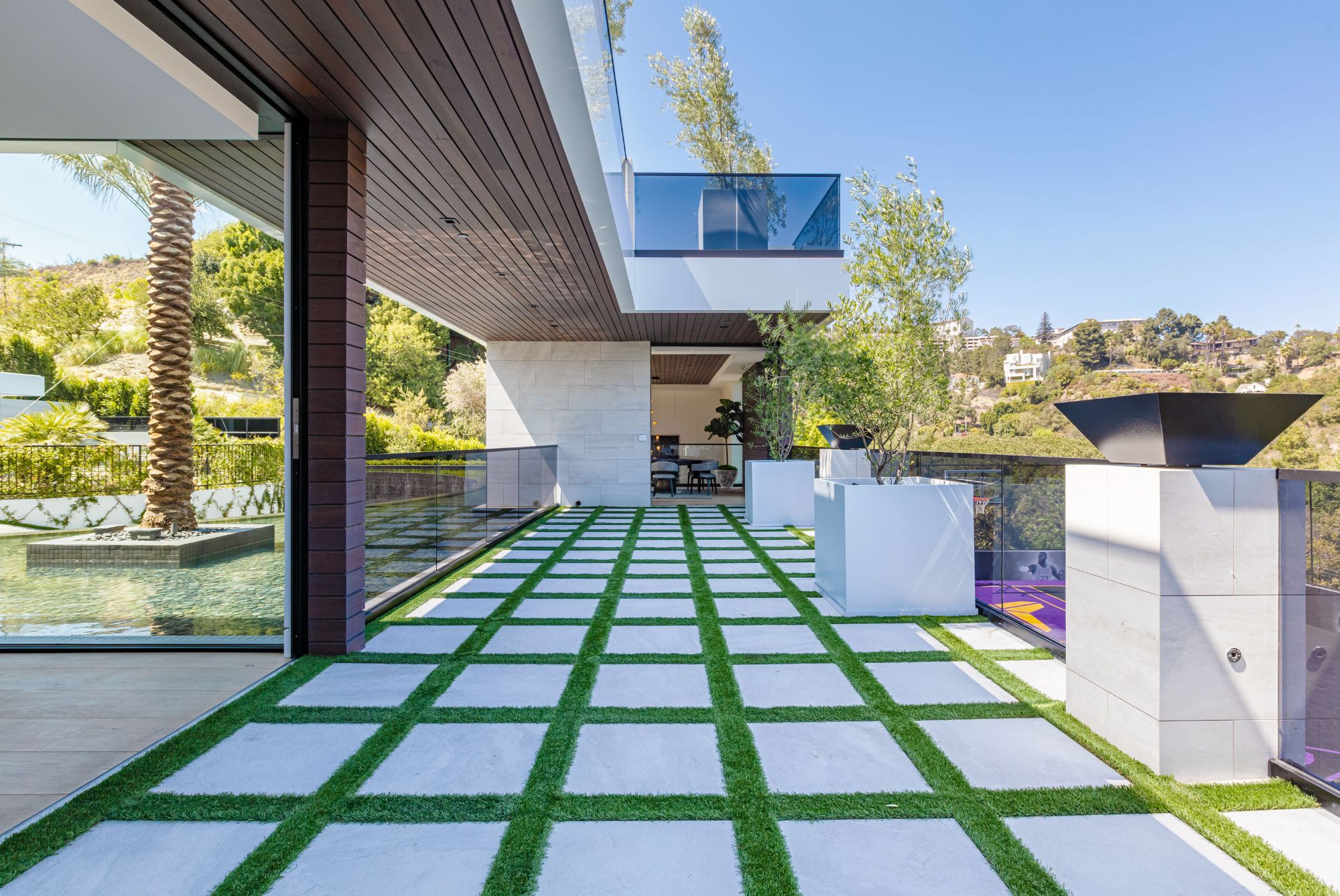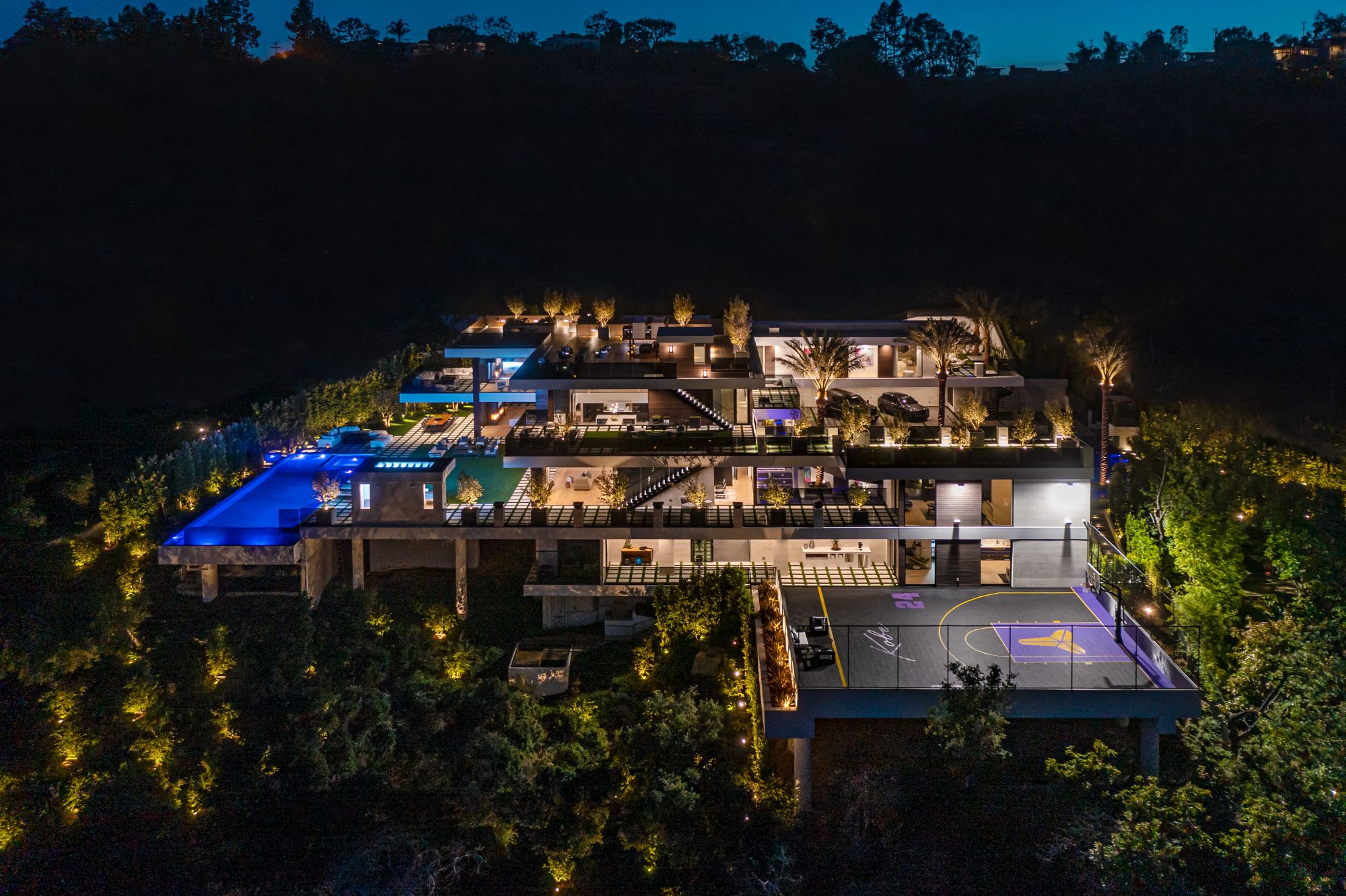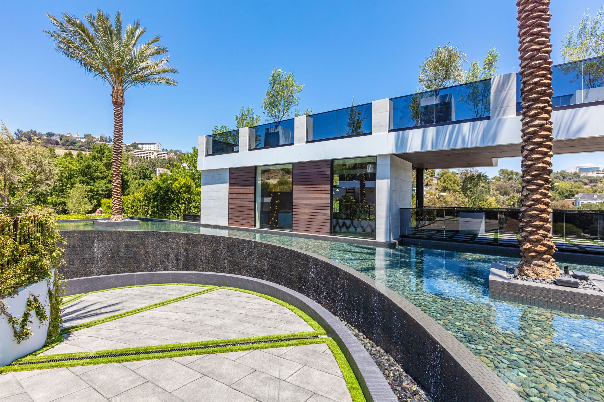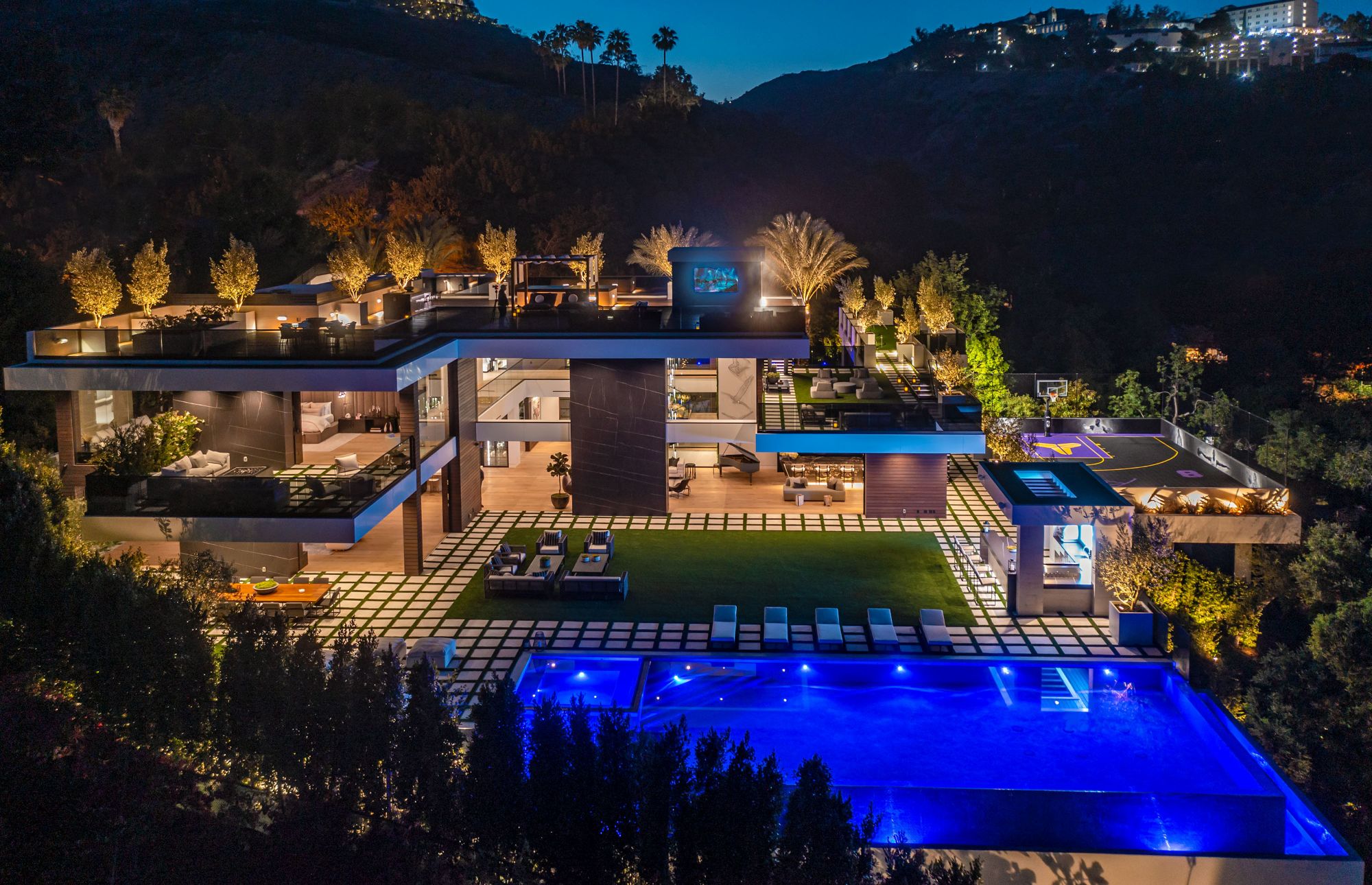 The Brentwood Oasis is a one-of-a-kind project to LA on over 1.2 acres of land. Towering gracefully above dazzling city lights, this newly built smart home has sweeping picturesque vistas throughout (including unobstructed Getty, city & ocean views), flat over approx. 30,000SF exterior living, water features & vast array of rare amenities for effortless resort-style living. The gated compound sits on a private cul de sac in exclusive Brentwood, N. of Sunset. Automobile showroom separated by floor-to-ceiling glass walls that open to an expansive lounge anchored by a 9-TV media wall, bar & barbershop. State-of-the-art gym w/sports simulator room, indoor pool & spa. Exterior lower level w/Kobe Bryant inspired NBA-sized basketball half court, outdoor seating & gym overlooking the city. Amenities include modern office, open-concept kitchen, 1000-gallon dual sided aquarium, prep kitchen, double height living room, 2-story guest house, balconies, city view putting green, 30' living wall, 26' chandelier, hotel-like primary w/spa bath & boutique worthy closets, & so much more. Outdoor oasis thru automatic glass pocket doors w/verdant lawn, cabana w/custom TV, bar, pizza oven, infinity edge pool w/Baja seating & spa, inviting sun-soaked relaxation year-round.