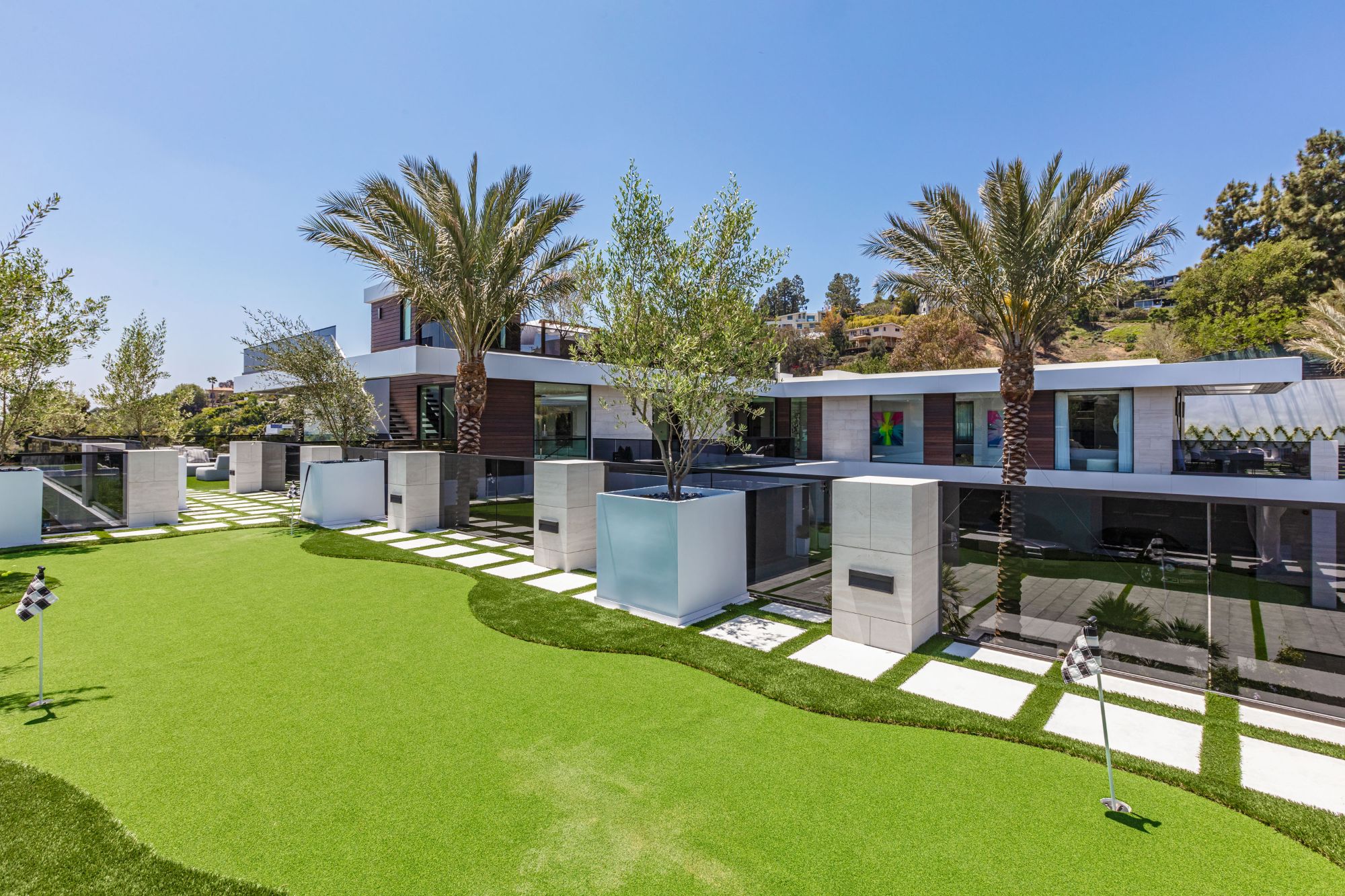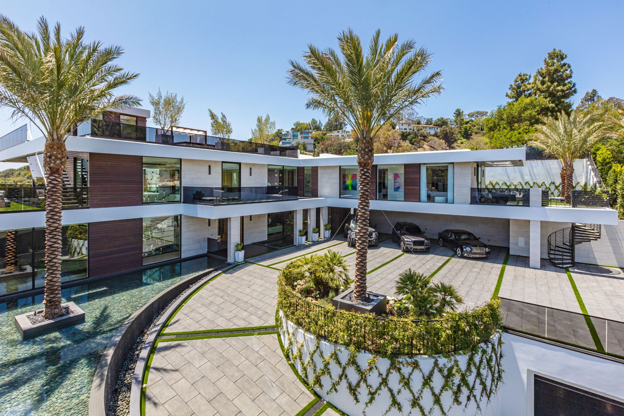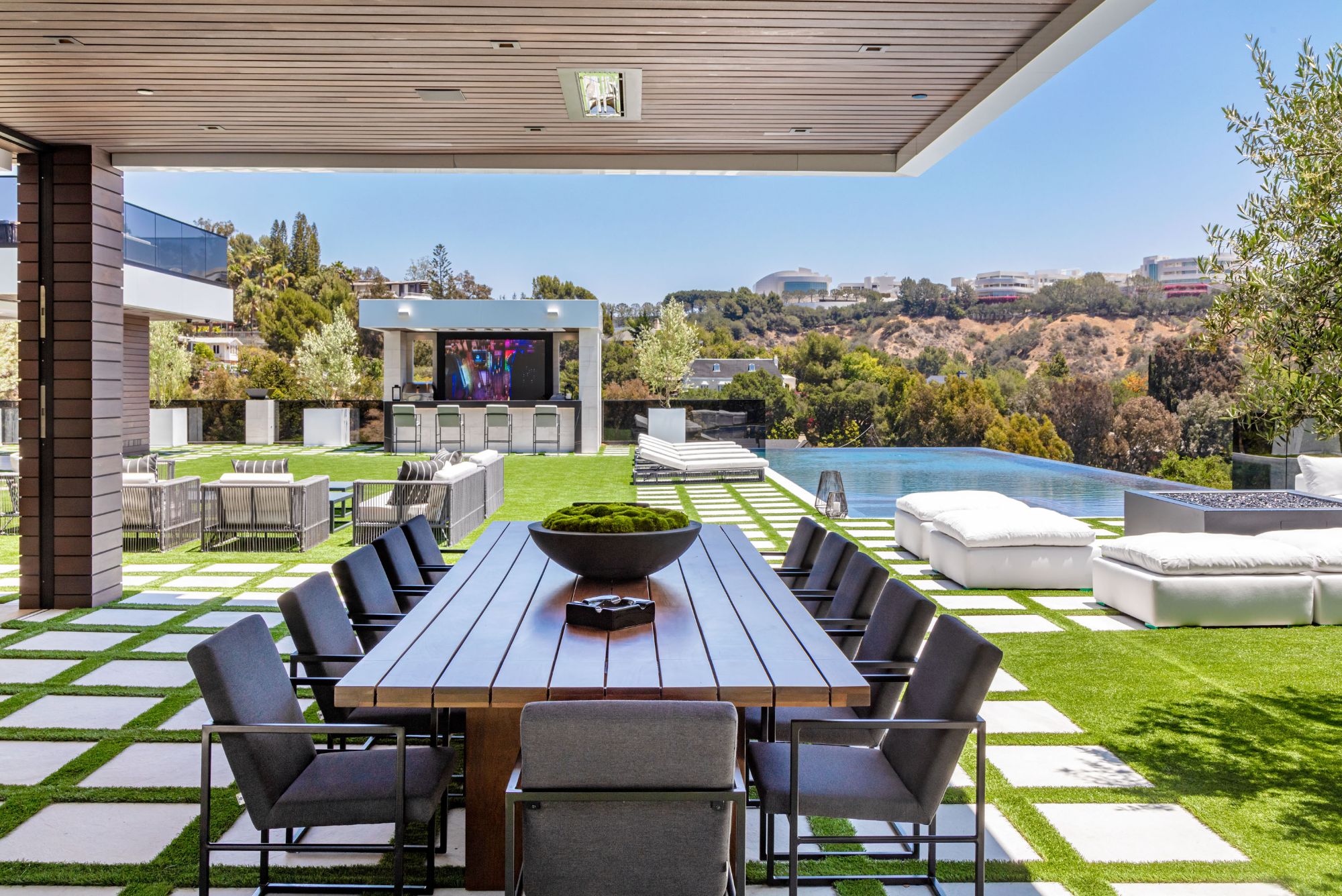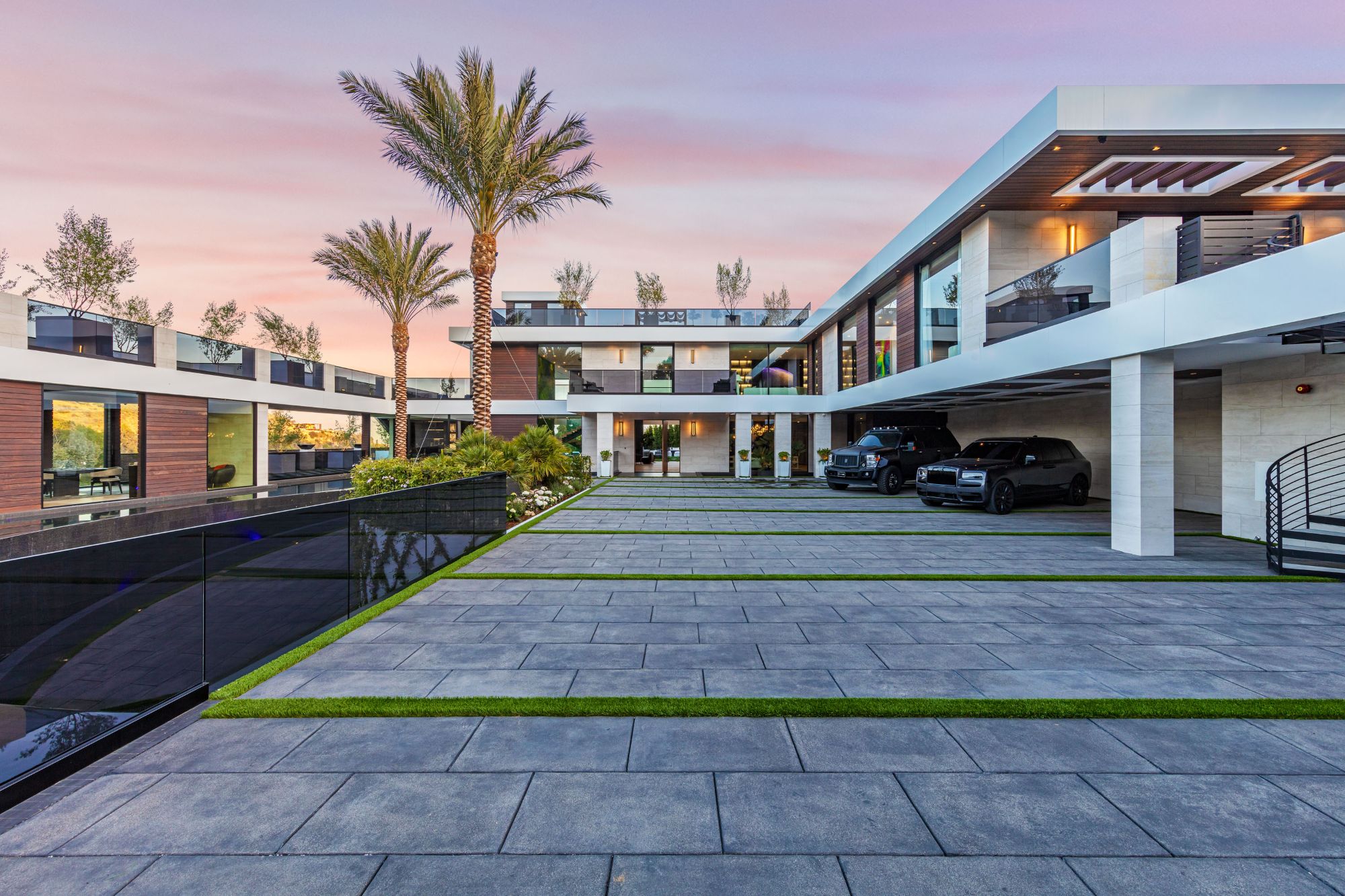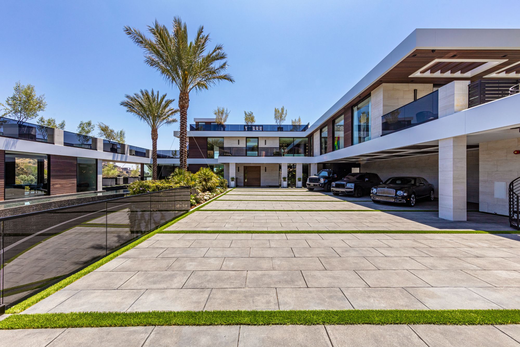 The Brentwood Oasis is a one-of-a-kind project to LA on over 1.2 acres of land. Towering gracefully above dazzling city lights, this newly built smart home has sweeping picturesque vistas throughout (including unobstructed Getty, city & ocean views), flat over approx. 30,000SF exterior living, water features & vast array of rare amenities for effortless resort-style living. The gated compound sits on a private cul de sac in exclusive Brentwood, N. of Sunset. Automobile showroom separated by floor-to-ceiling glass walls that open to an expansive lounge anchored by a 9-TV media wall, bar & barbershop. State-of-the-art gym w/sports simulator room, indoor pool & spa. Exterior lower level w/Kobe Bryant inspired NBA-sized basketball half court, outdoor seating & gym overlooking the city. Amenities include modern office, open-concept kitchen, 1000-gallon dual sided aquarium, prep kitchen, double height living room, 2-story guest house, balconies, city view putting green, 30' living wall, 26' chandelier, hotel-like primary w/spa bath & boutique worthy closets, & so much more. Outdoor oasis thru automatic glass pocket doors w/verdant lawn, cabana w/custom TV, bar, pizza oven, infinity edge pool w/Baja seating & spa, inviting sun-soaked relaxation year-round.