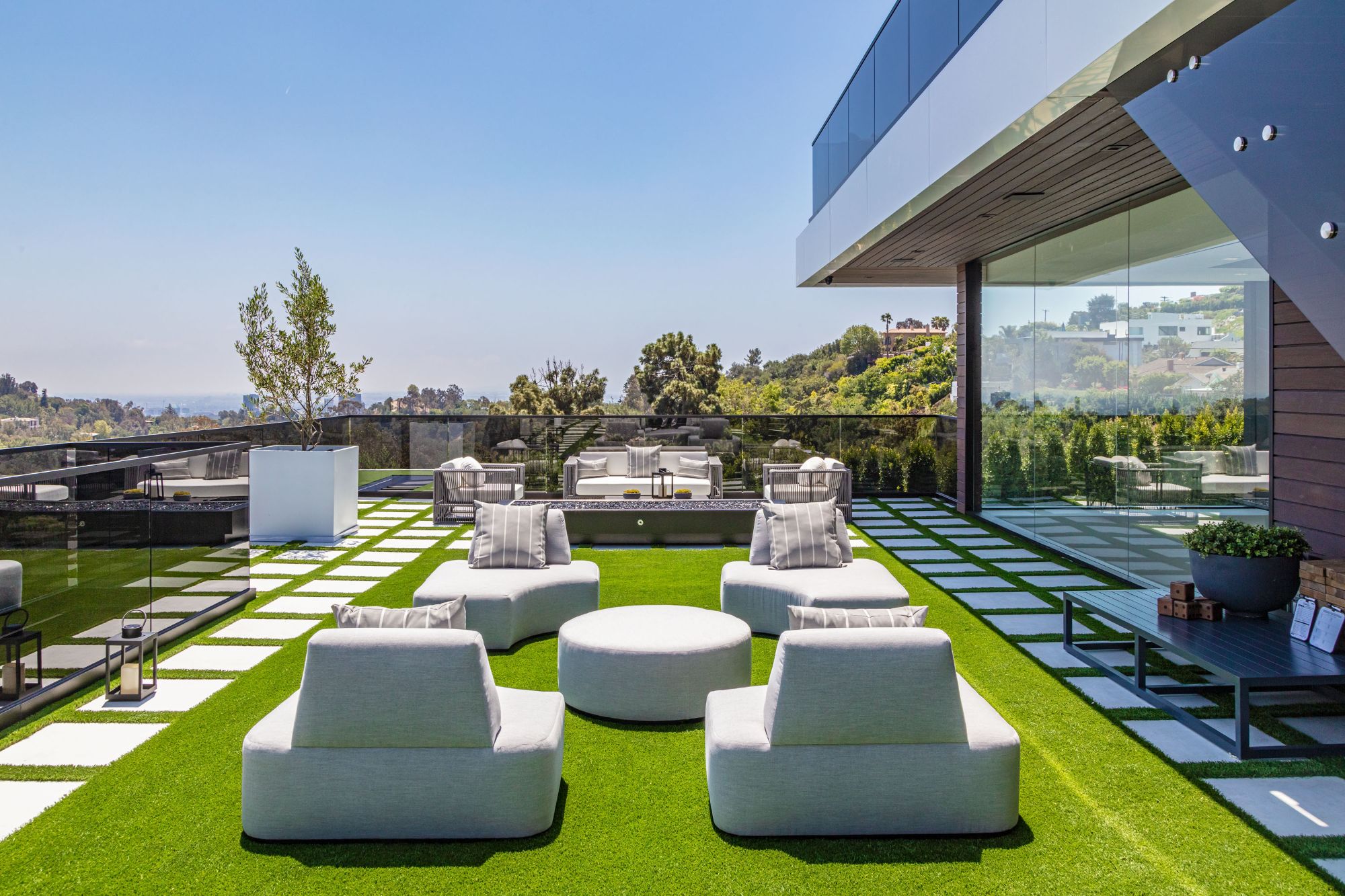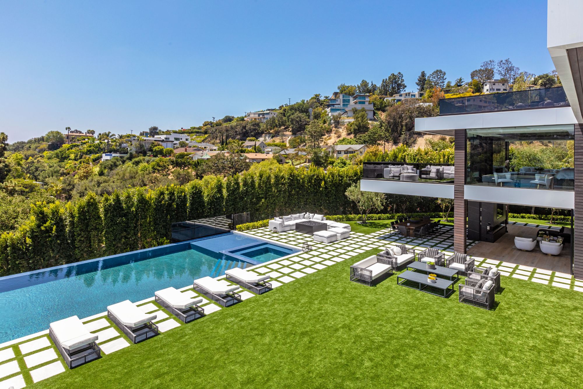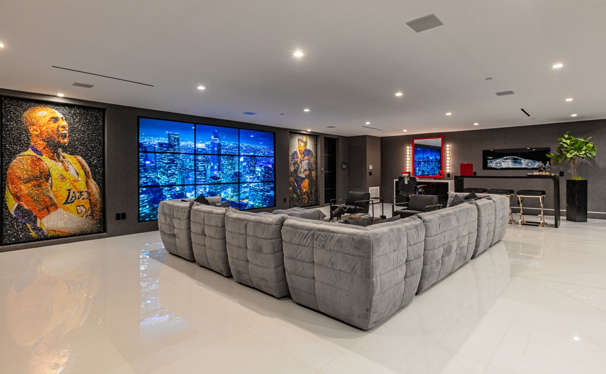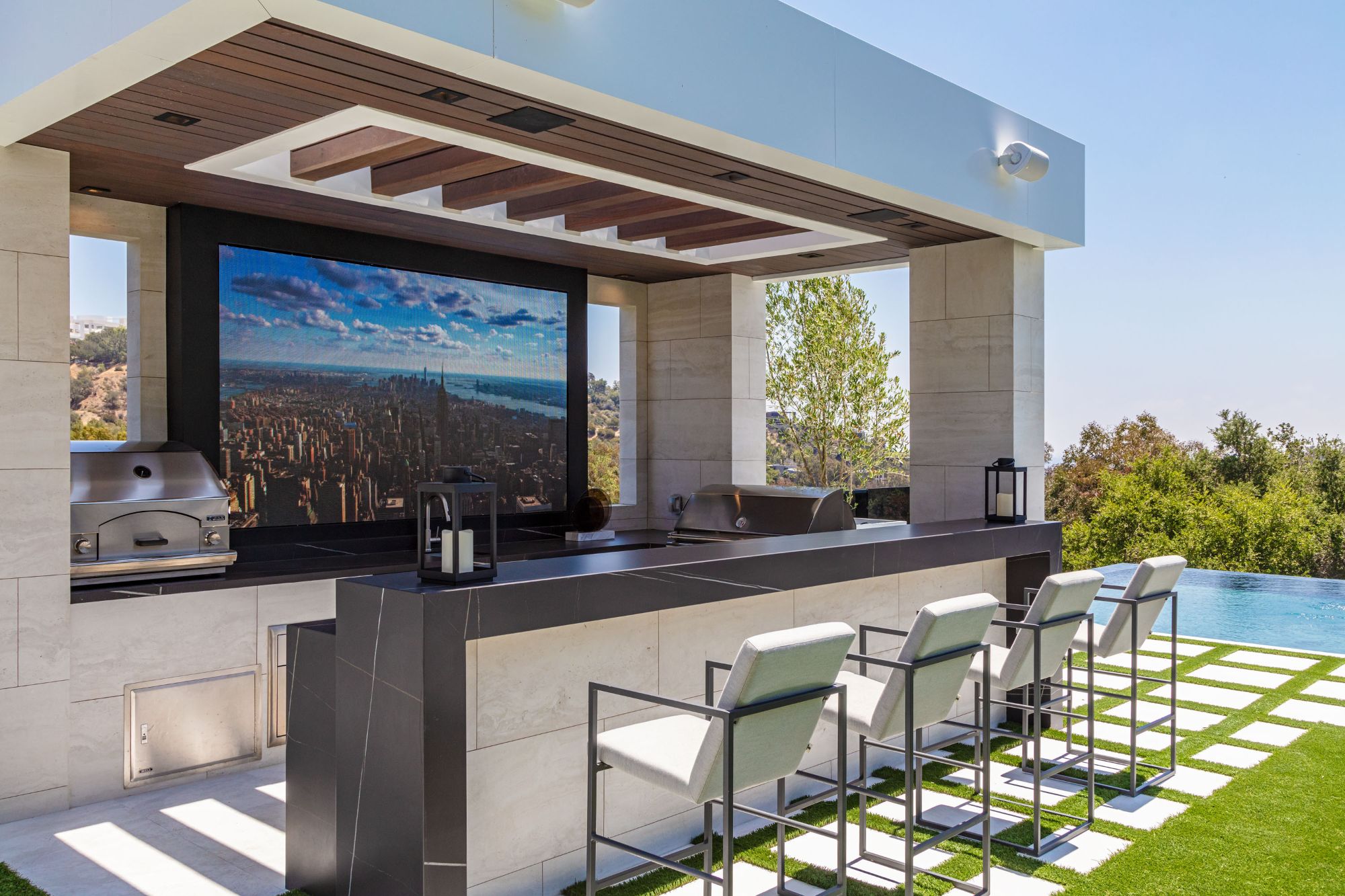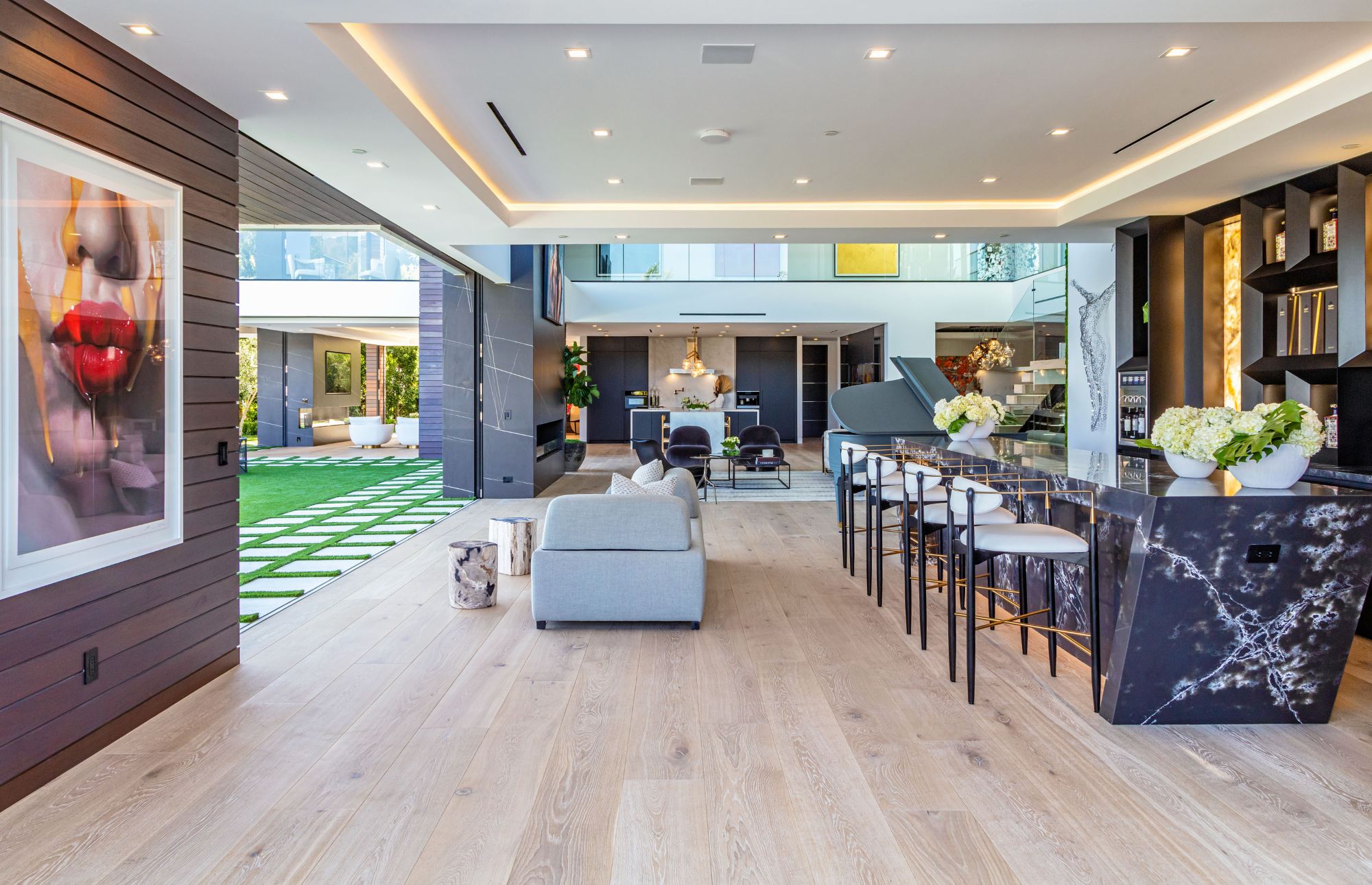 The Brentwood Oasis is a one-of-a-kind project to LA on over 1.2 acres of land. Towering gracefully above dazzling city lights, this newly built smart home has sweeping picturesque vistas throughout (including unobstructed Getty, city & ocean views), flat over approx. 30,000SF exterior living, water features & vast array of rare amenities for effortless resort-style living. The gated compound sits on a private cul de sac in exclusive Brentwood, N. of Sunset. Automobile showroom separated by floor-to-ceiling glass walls that open to an expansive lounge anchored by a 9-TV media wall, bar & barbershop. State-of-the-art gym w/sports simulator room, indoor pool & spa. Exterior lower level w/Kobe Bryant inspired NBA-sized basketball half court, outdoor seating & gym overlooking the city. Amenities include modern office, open-concept kitchen, 1000-gallon dual sided aquarium, prep kitchen, double height living room, 2-story guest house, balconies, city view putting green, 30' living wall, 26' chandelier, hotel-like primary w/spa bath & boutique worthy closets, & so much more. Outdoor oasis thru automatic glass pocket doors w/verdant lawn, cabana w/custom TV, bar, pizza oven, infinity edge pool w/Baja seating & spa, inviting sun-soaked relaxation year-round.
