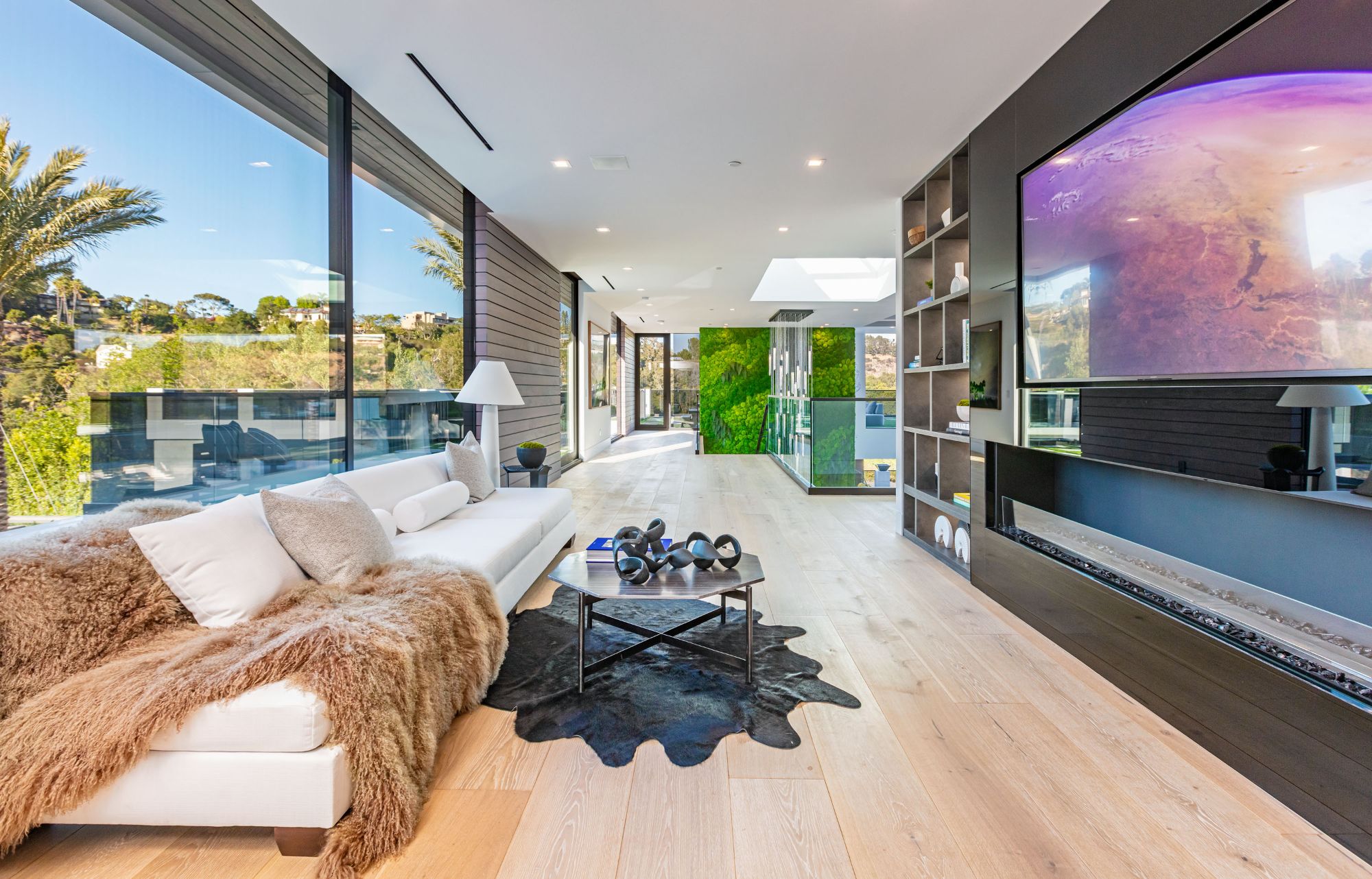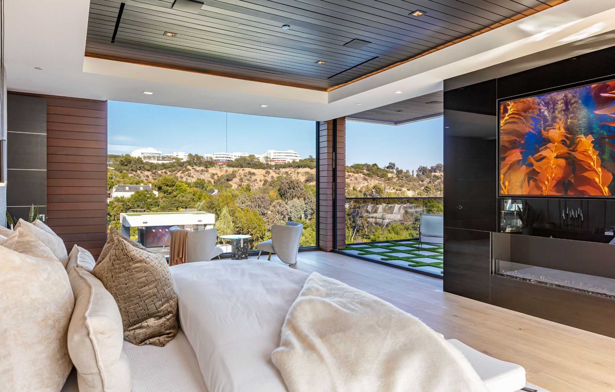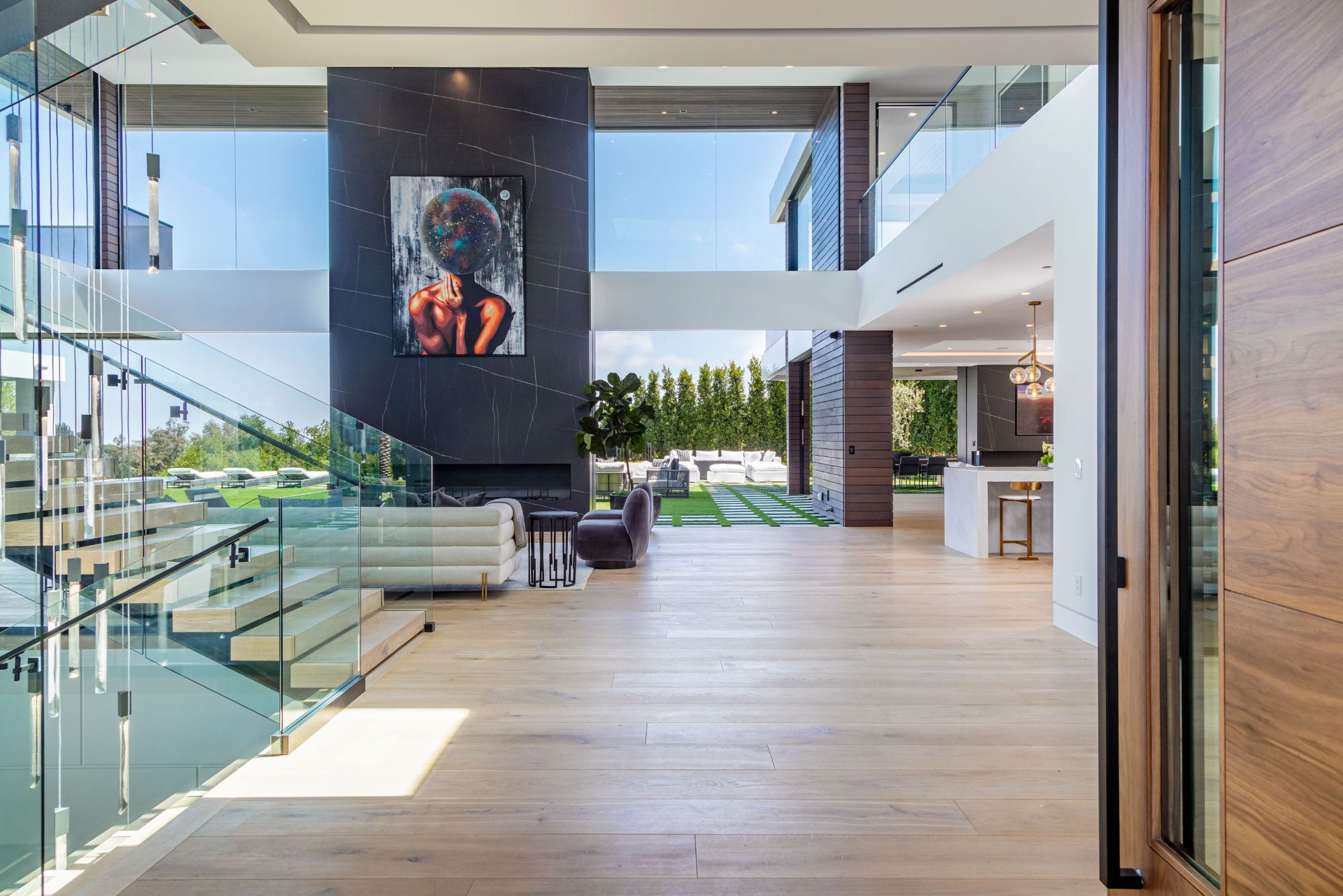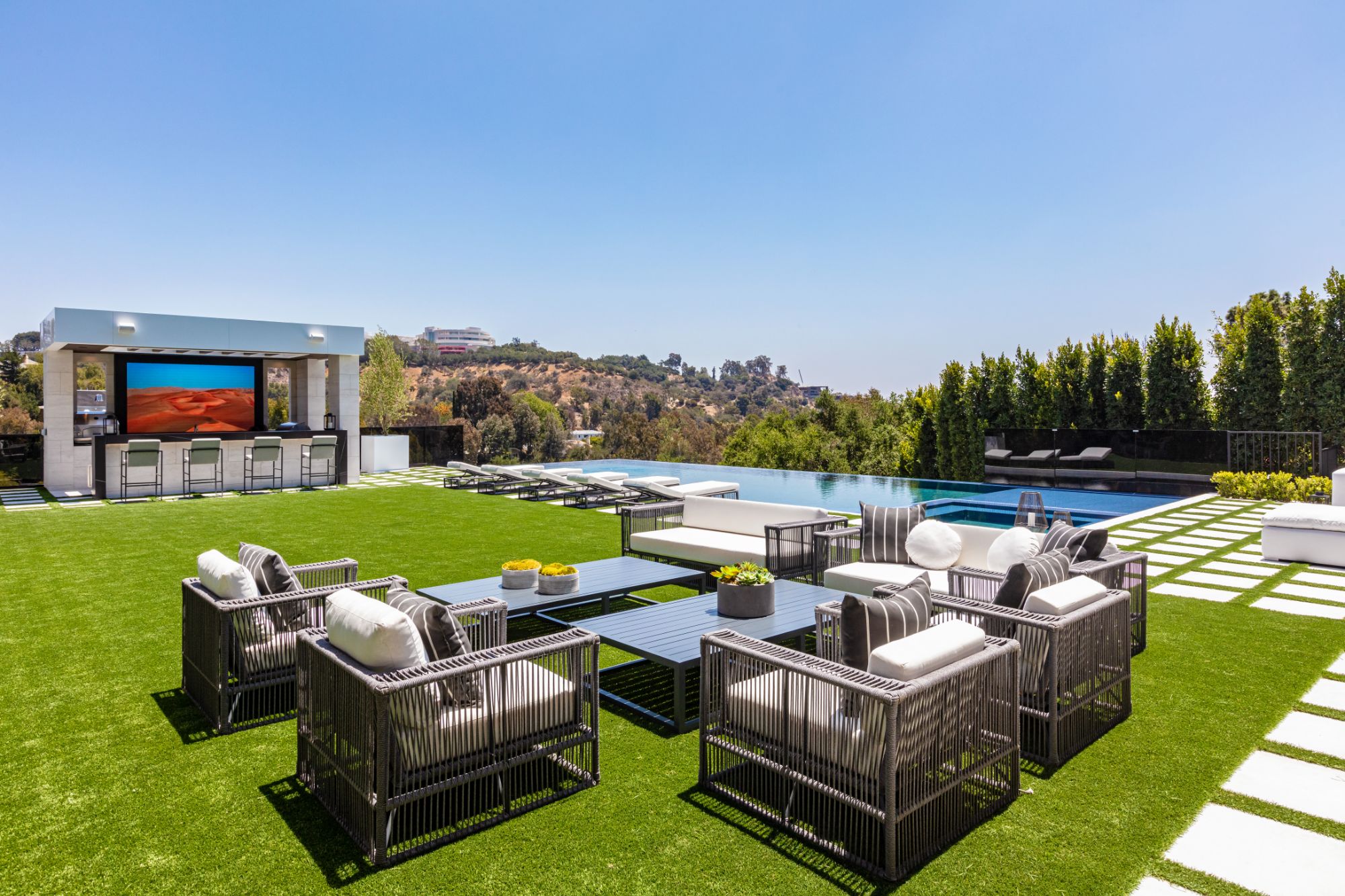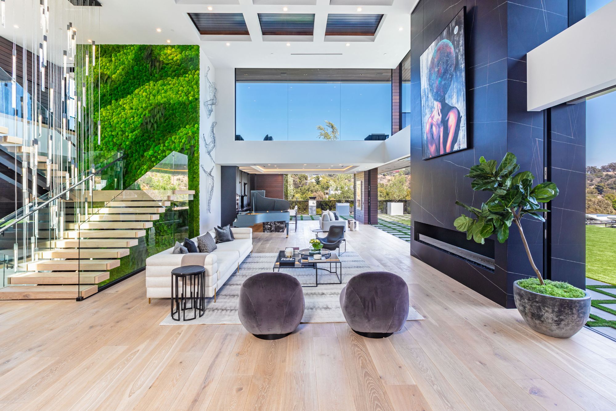 The Brentwood Oasis is a one-of-a-kind project to LA on over 1.2 acres of land. Towering gracefully above dazzling city lights, this newly built smart home has sweeping picturesque vistas throughout (including unobstructed Getty, city & ocean views), flat over approx. 30,000SF exterior living, water features & vast array of rare amenities for effortless resort-style living. The gated compound sits on a private cul de sac in exclusive Brentwood, N. of Sunset. Automobile showroom separated by floor-to-ceiling glass walls that open to an expansive lounge anchored by a 9-TV media wall, bar & barbershop. State-of-the-art gym w/sports simulator room, indoor pool & spa. Exterior lower level w/Kobe Bryant inspired NBA-sized basketball half court, outdoor seating & gym overlooking the city. Amenities include modern office, open-concept kitchen, 1000-gallon dual sided aquarium, prep kitchen, double height living room, 2-story guest house, balconies, city view putting green, 30' living wall, 26' chandelier, hotel-like primary w/spa bath & boutique worthy closets, & so much more. Outdoor oasis thru automatic glass pocket doors w/verdant lawn, cabana w/custom TV, bar, pizza oven, infinity edge pool w/Baja seating & spa, inviting sun-soaked relaxation year-round.