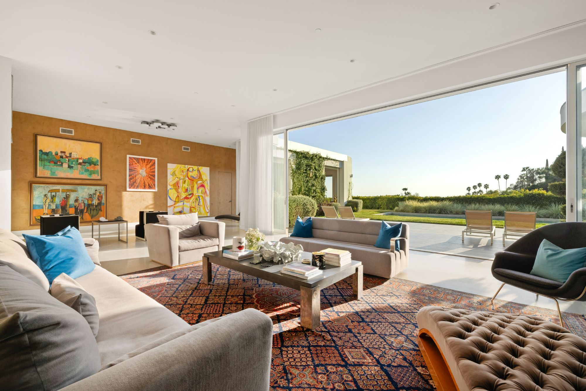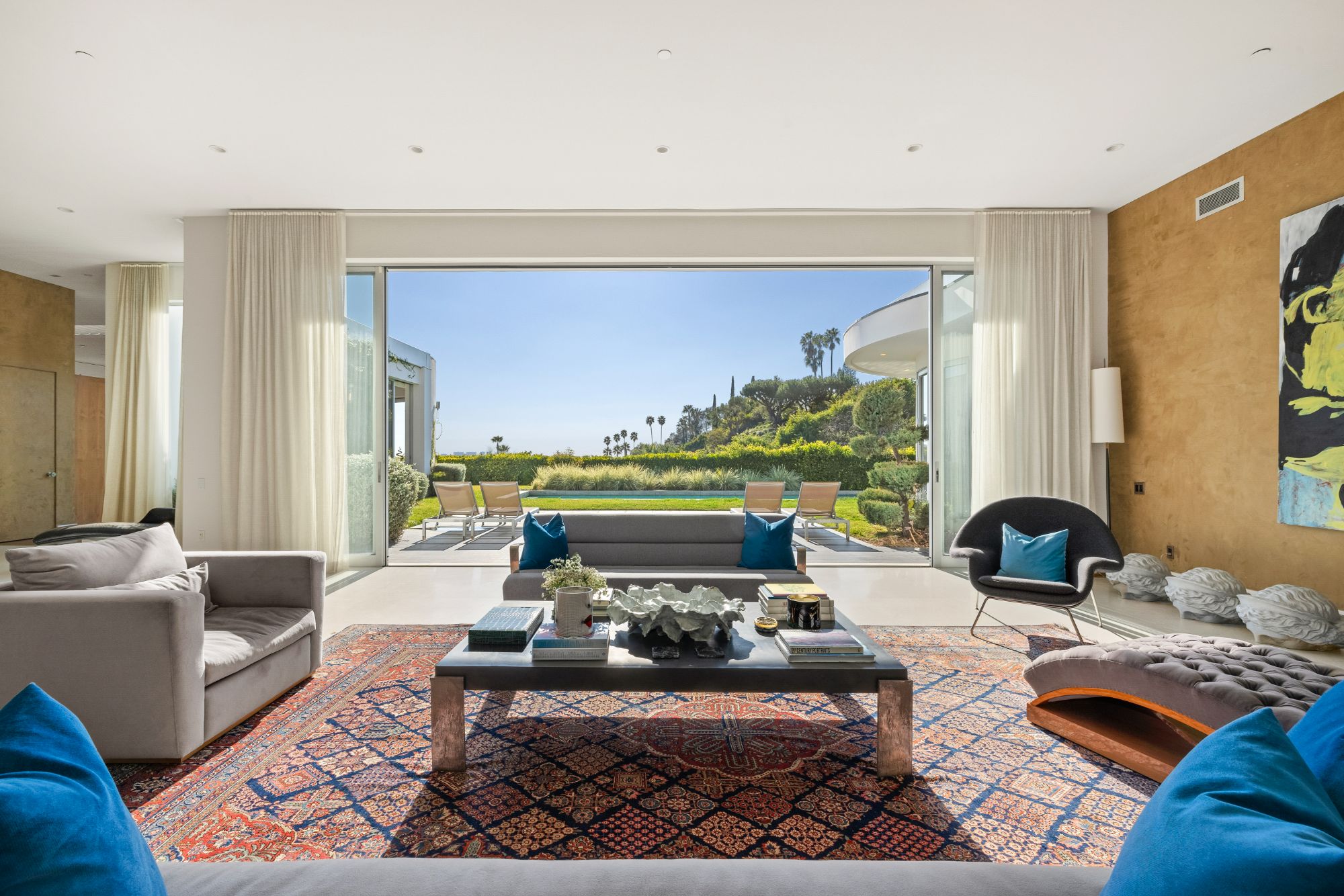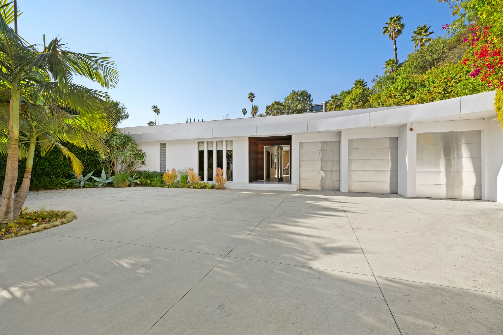 Perched in the exclusive Trousdale Estates of Beverly Hills, this iconic residence, originally designed by legendary architect Wallace Neff in 1956 for comedy great Groucho Marx, is a masterpiece of mid-century sophistication with modern enhancements. Behind private gates and lush hedges, a grand motor court welcomes you with space for over 10 cars, leading to a spacious three-car garage. A striking blend of Neff's signature horizontal lines, curved forms, and expansive glass walls defines the home's timeless exterior. Inside, terrazzo and walnut flooring set the stage for a refined yet inviting ambiance, while soaring ceilings create an open, airy feel throughout. At the heart of the estate, a state-of-the-art chef's kitchen, complete with an oversized island, flows effortlessly into a sunlit family room, where curved walls frame breathtaking city and ocean vistas. A sophisticated office, library, or home theater, wrapped in rich walnut paneling, provides a secluded retreat for work or entertainment. Set on an expansive 32,300 sq ft lot, the outdoor spaces are nothing short of spectacular. A heated pool and spa invite relaxation, while the tiled patio and fire pit offer the perfect setting for alfresco dining under the stars. Towering palm and lemon trees provide a lush backdrop, and a versatile sports court is ready for pickleball, basketball, or endless outdoor fun. A rare opportunity to own a true architectural gem in one of Beverly Hills' most sought-after enclaves.