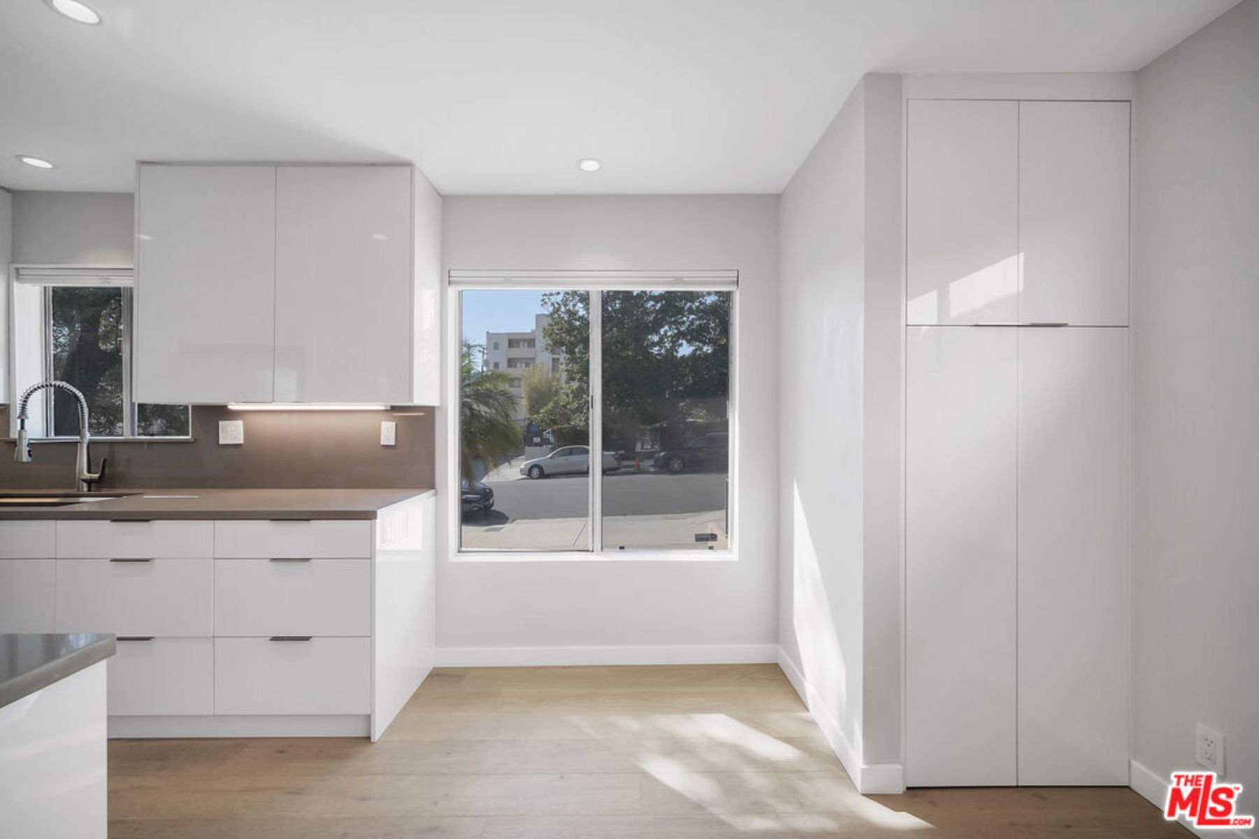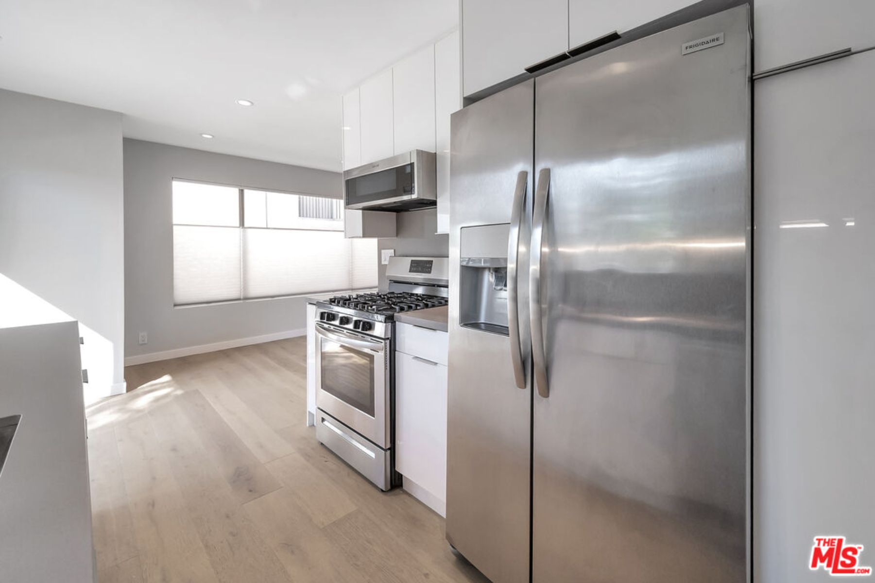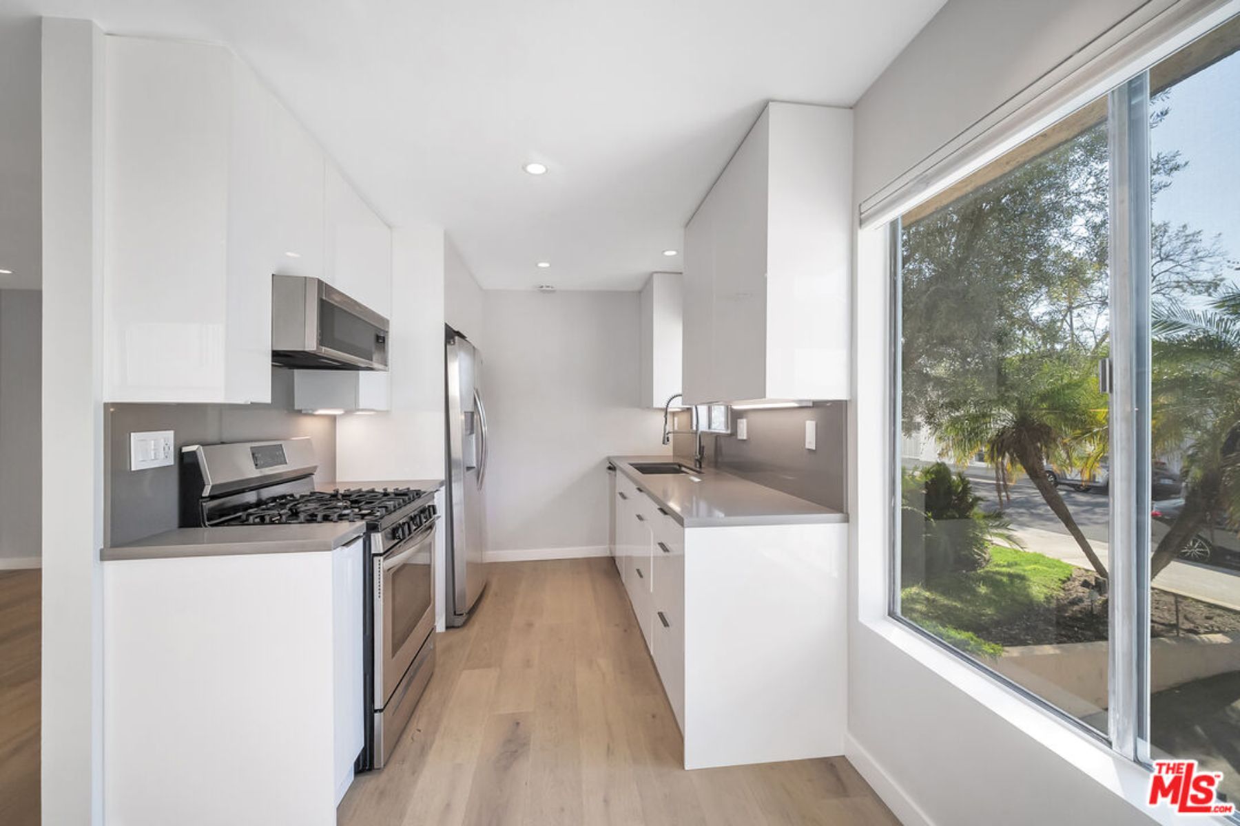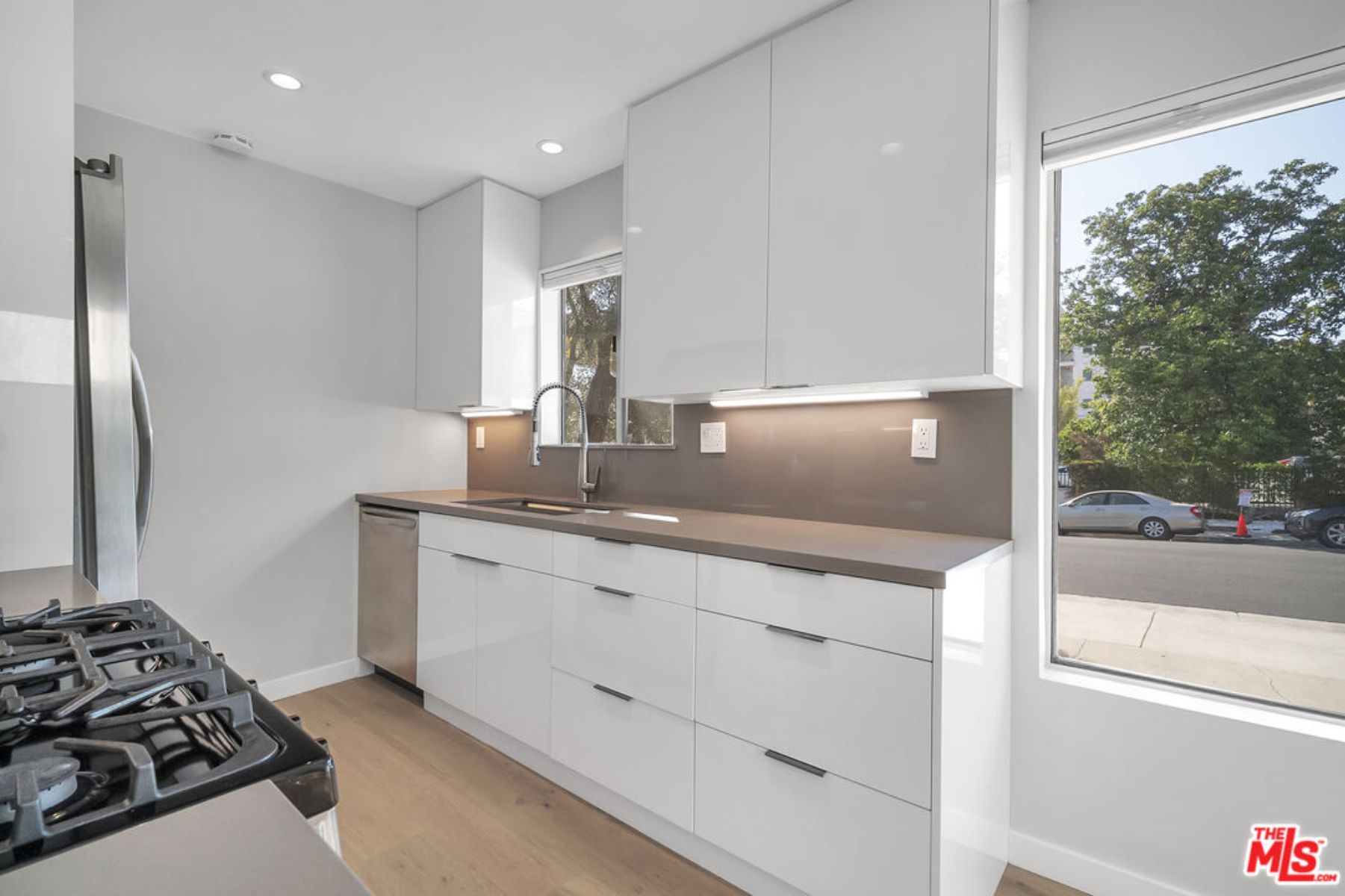 Designer 2 bedroom 2 full baths with washer & dryer in one of West Hollywood's prime most sought-after neighborhoods. Short term lease available. New remodel with hardwood floors, recessed lighting and solid core opaque glass panel doors for a modern element. Front west facing end unit flooded with natural light. Windows on three sides providing great cross ventilation and light exposure. Galley kitchen with new white lacquer cabinets, quartz countertop and backsplash. Gas stove and microwave. Ceiling fans in both bedrooms. New Wifi full size washer and dryer in unit. Both full bathrooms completely remodeled with under vanity lighting, one bathroom with full tub and other with shower only. Primary bath has double vanity. Gated parking for one car and permit street parking available. Extra storage over car in garage. Small 8 unit gated secured complex. Just a few steps to world famous restaurants, shops and nightlife on Santa Monica, La Cienega and Sunset Boulevard. Walker's paradise 94/100 Score.