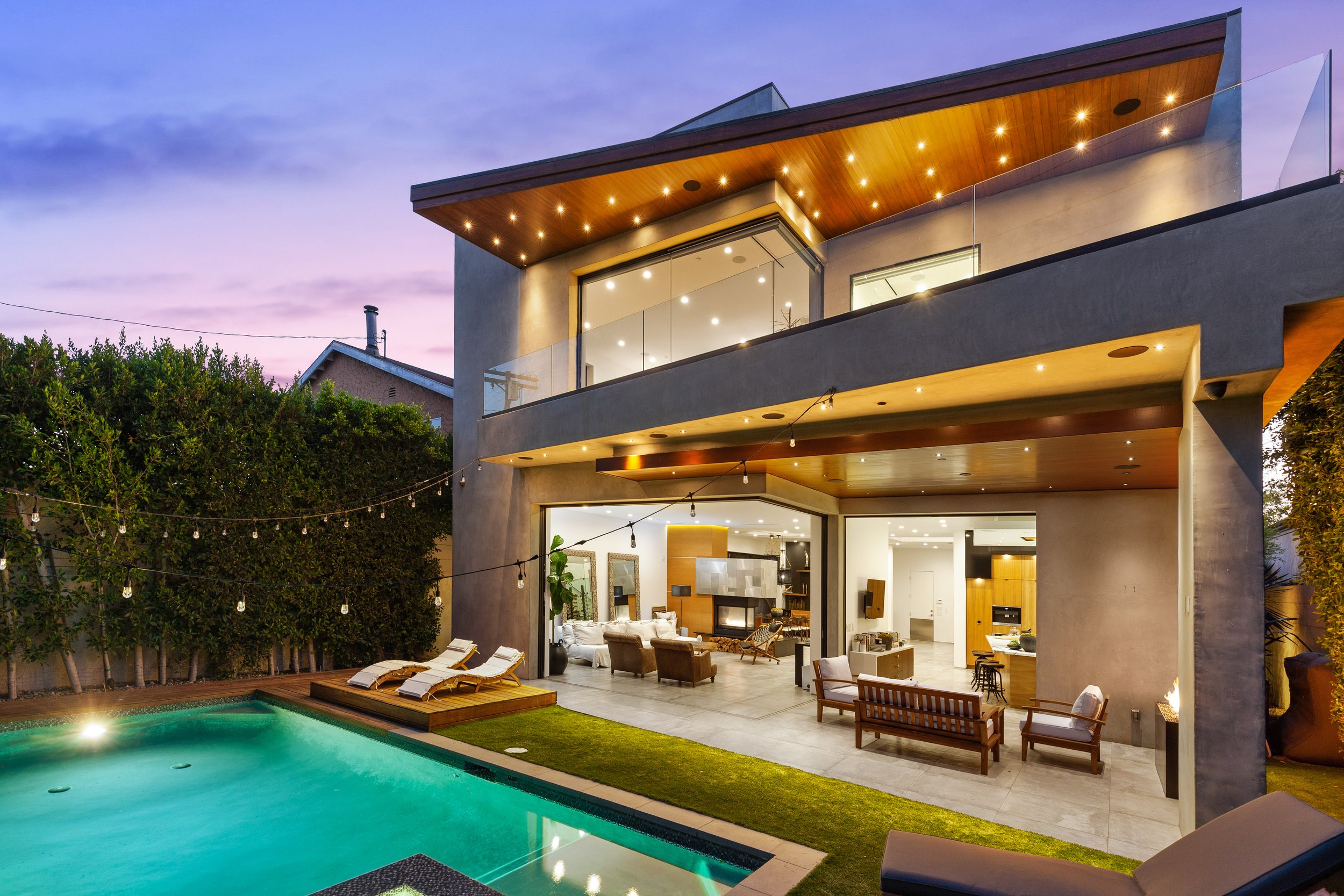 Presenting this gated 2016-built Beverly Grove modern smart home located south of Beverly Boulevard amidst all of the best the city has to offer. Enter the enclosed courtyard to discover a serene reflection pond surrounding a lush palm. Through the front door is an open-concept floor plan covered in large stone tiles. To the left is a wood-and-steel staircase with glass-enclosed wine storage and sitting area. A downstairs bedroom, currently used as a gym, wraps around the front courtyard with walls of glass and blackout shades. To the right of the entry is the formal dining area with Fleetwood doors to the outside, bringing the outdoors in and flooding the space in natural light. A statement glass-rock fireplace, cubic in appearance and visible from the dining and living areas, is accented by natural wood and steel for added visual pop. The pristine kitchen features built-in stainless-steel Miele and Thermador appliances, smooth wood cabinetry capped by slick black accents, a contrasting bright backsplash, recessed lighting, picture window, and a center island clad in marble with bar seating and range with overhead vent. Additional Fleetwood doors lead out to the rear patio with fire pit from both the living area and kitchen. Upstairs, the primary suite offers a fireplace, sitting area, and walls of glass opening to a private deck with views of the Hollywood Sign and Griffith Observatory perched atop the hills beyond. The spa-inspired primary bath offers separate free-standing tub, glass-enclosed shower with waterfall head, and dual-sink vanity. An additional second-floor open-air patio is accessed near a large landing space currently used as an office. Nearby, two bedrooms, both en-suite, feature massive picture windows with views of the hills and balcony access. The backyard includes complete privacy with hedges, pool, spa, a built-in barbecue with bar seating, and grassy areas for play and relaxation. Smart home features include security, Sonos with surround sound (inside and in backyard), and pool temperature control accessed via tablet and phone. Experience the ultimate indoor/outdoor California lifestyle in one of the most highly sought areas of Los Angeles, with a high walk score minutes to 3rd Street's exceptional dining, shops, and entertainment. Welcome!