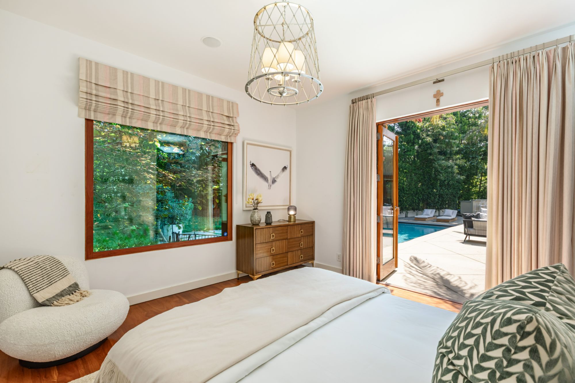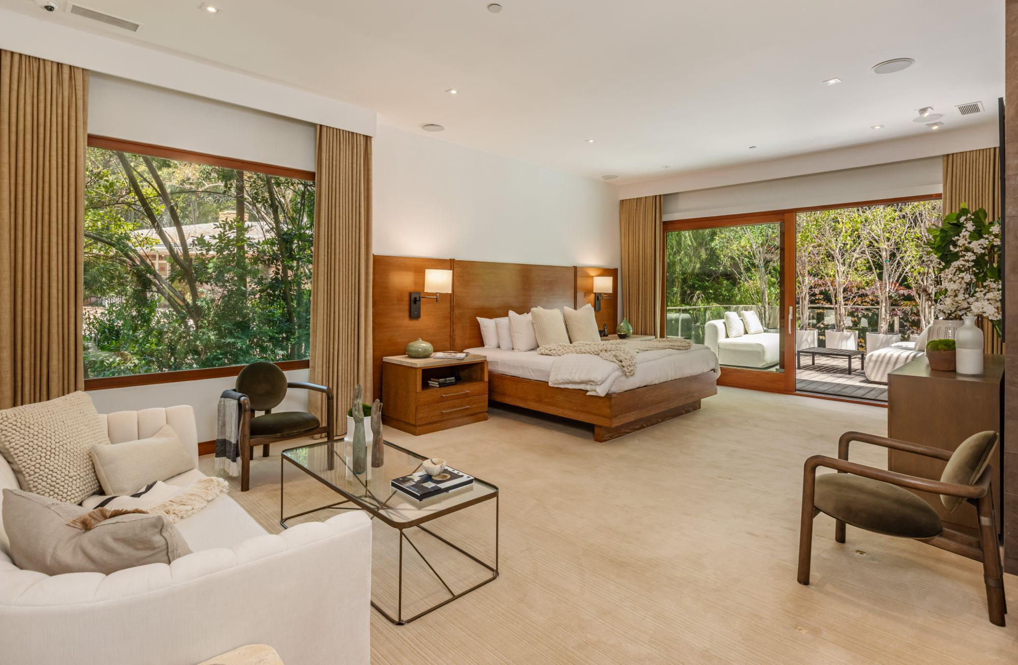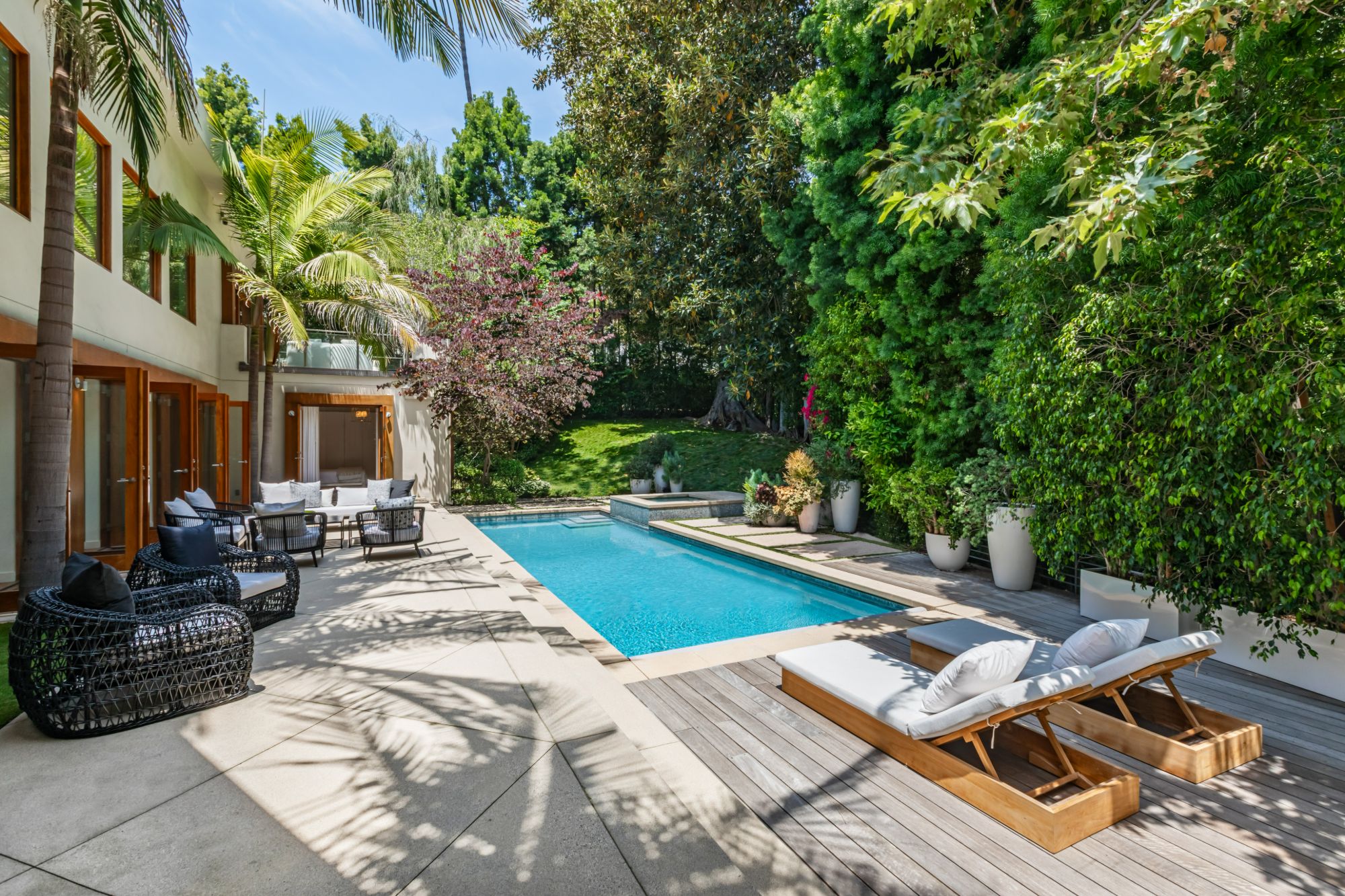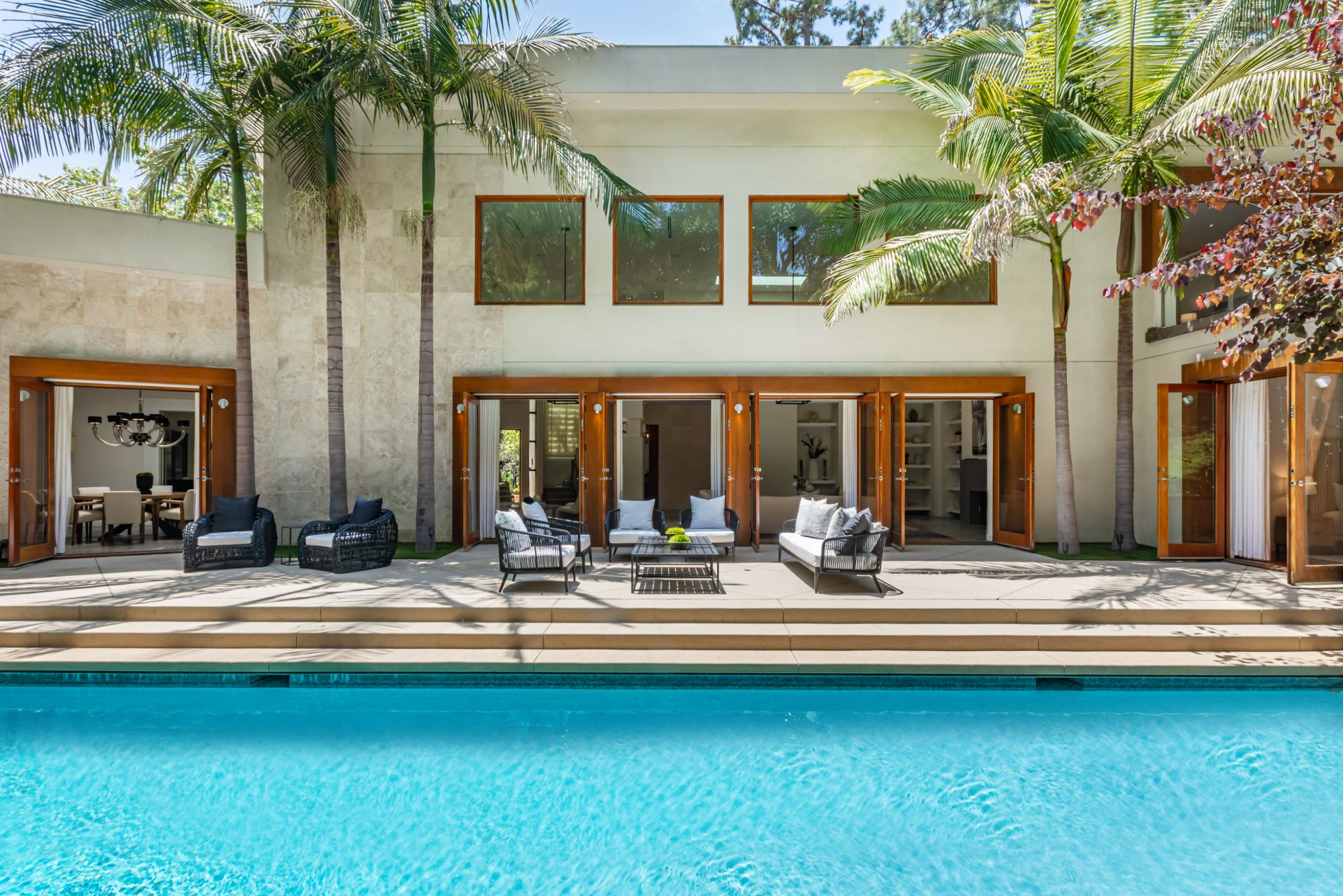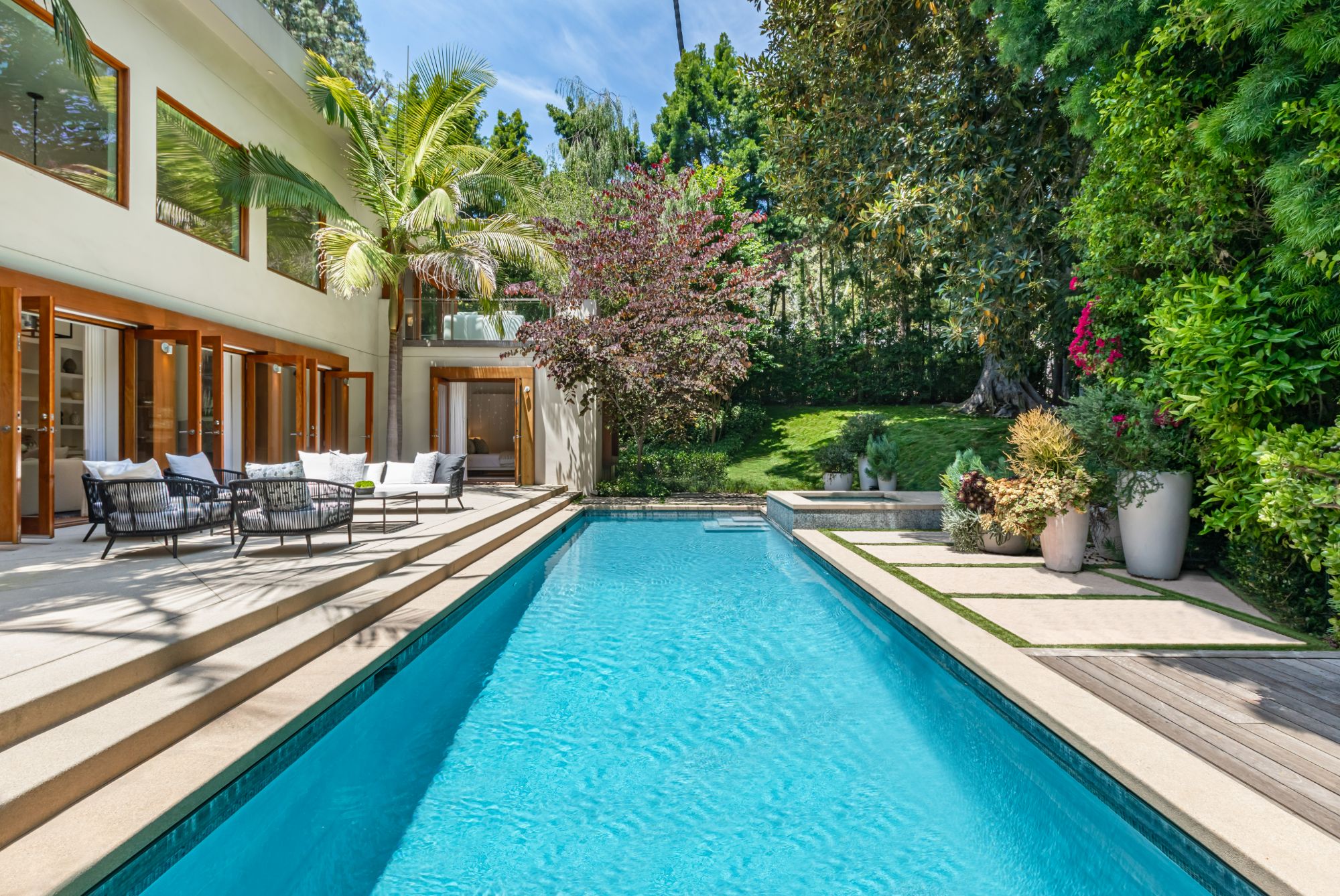 A contemporary estate nestled behind a long, gated driveway in prestigious Holmby Hills. This architectural home opens to a two-story living room with gallery lighting, skylights, and floor-to-ceiling windows framing lush, park-like grounds with pool, spa, and large deck on half an acre. The open floor plan seamlessly connects the dining room, family room, and sleek chef's kitchen with top-tier appliances. Upstairs, the primary suite offers a fireplace, a spacious balcony, a walk-in closet, and a spa-like bath. 5 bedrooms and 5.5 baths offer ample space for family and friends. Thoughtful details throughout include jade and Jerusalem stone, maple floors, and textured walls. House is equipped with a full-house generator, top of the line window break protection on all glass doors and windows, plus shutters that close at night. Large motor court and 3 car garage offer plenty of parking space. Ideally located near Harvard-Westlake Middle School, offering convenience and prestige. Also available for lease $49,500/month.