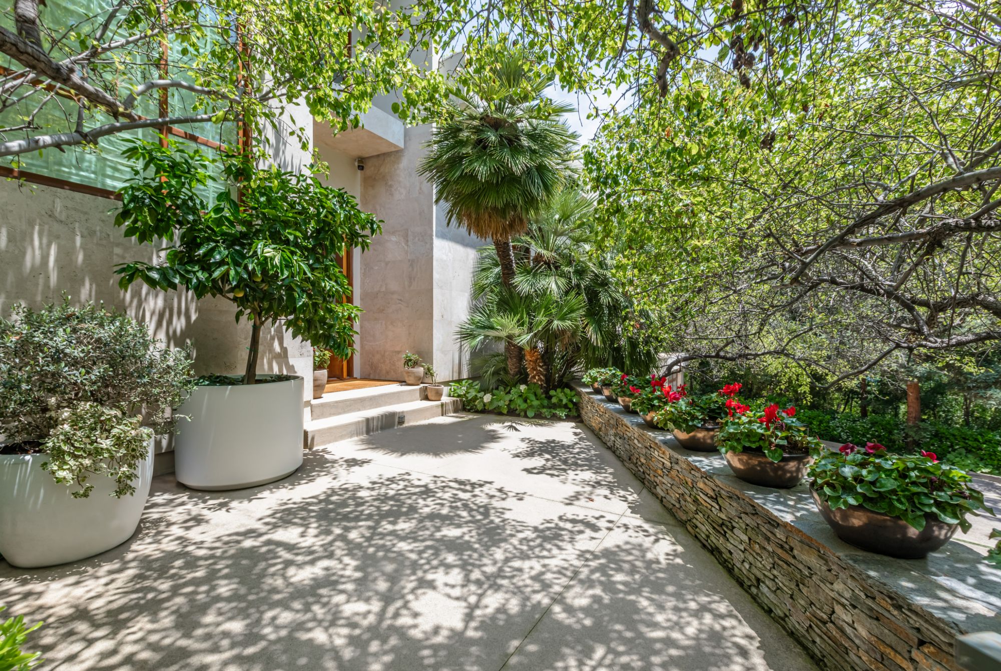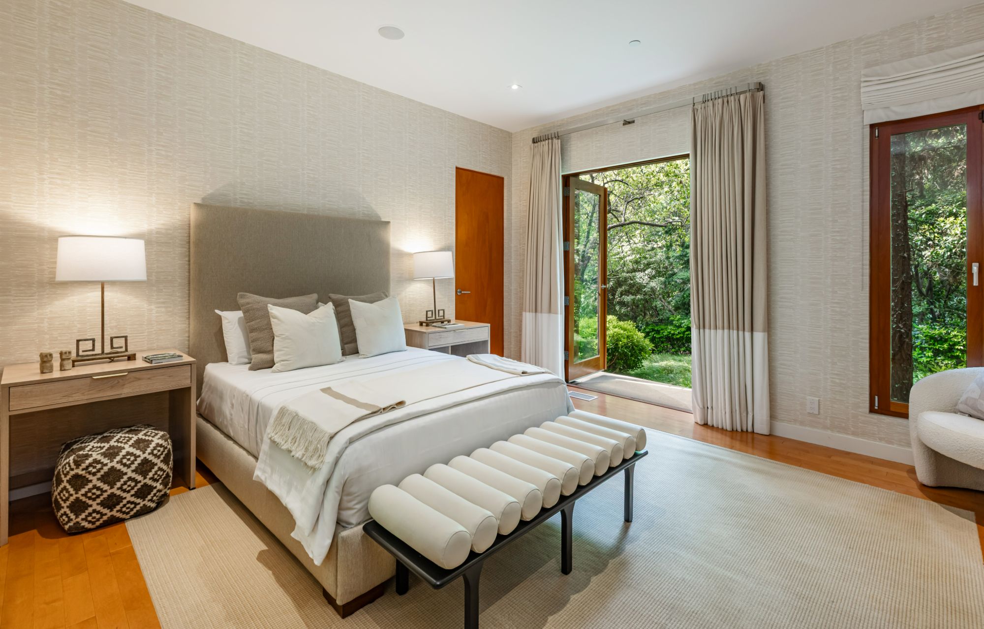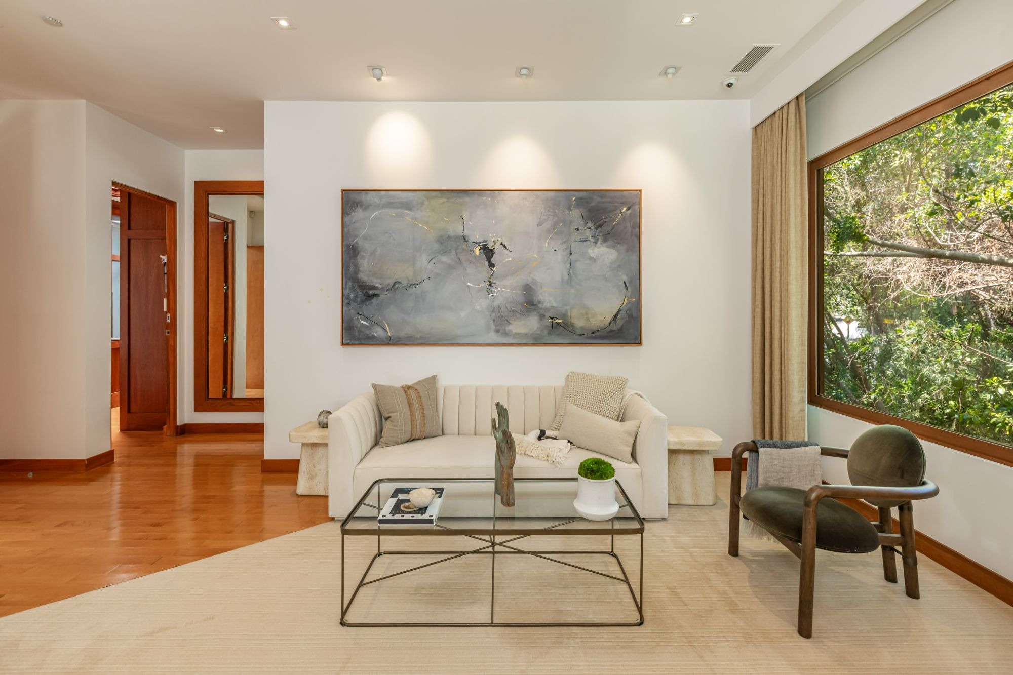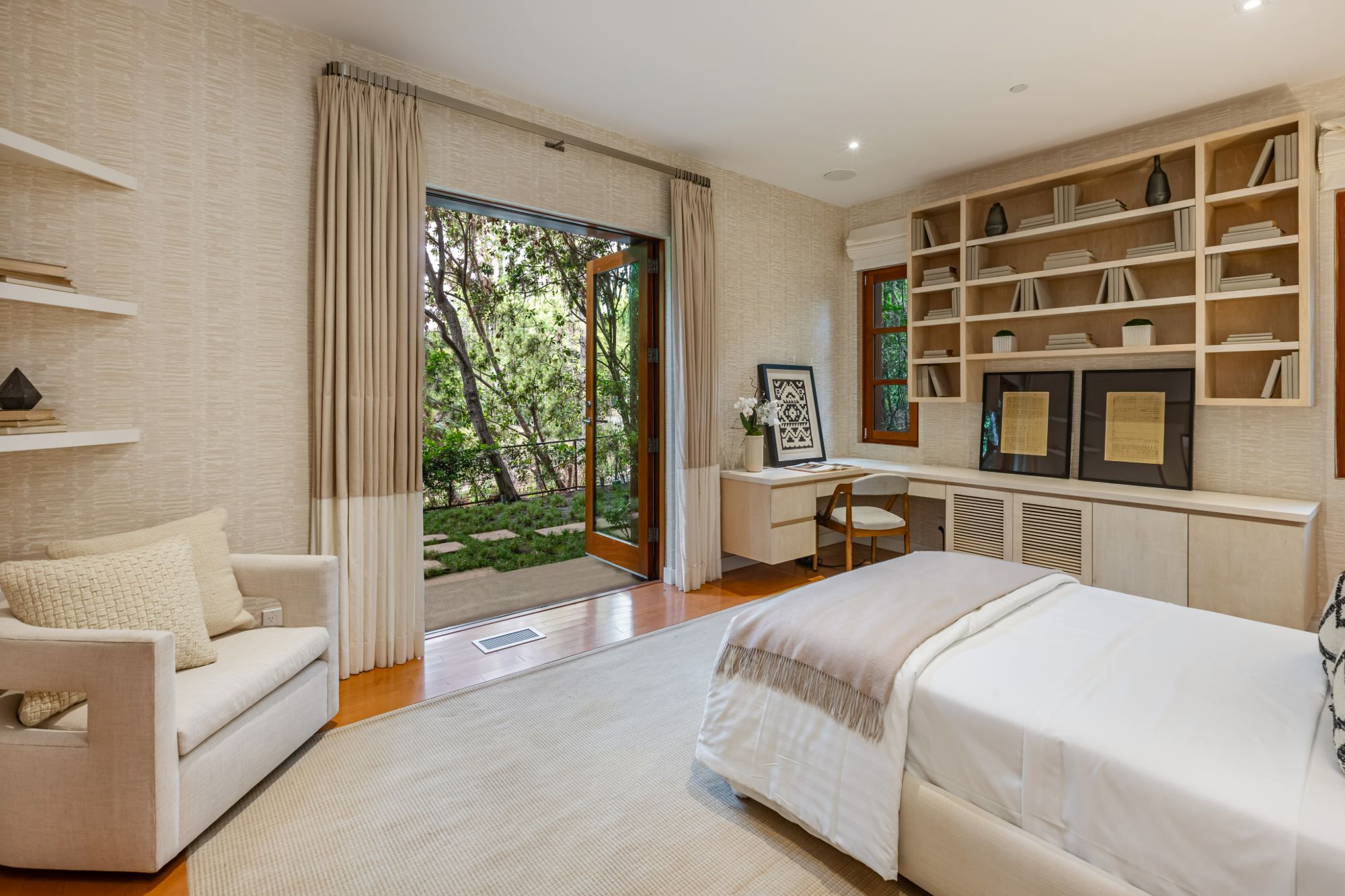 A contemporary estate nestled behind a long, gated driveway in prestigious Holmby Hills. This architectural home opens to a two-story living room with gallery lighting, skylights, and floor-to-ceiling windows framing lush, park-like grounds with pool, spa, and large deck on half an acre. The open floor plan seamlessly connects the dining room, family room, and sleek chef's kitchen with top-tier appliances. Upstairs, the primary suite offers a fireplace, a spacious balcony, a walk-in closet, and a spa-like bath. 5 bedrooms and 5.5 baths offer ample space for family and friends. Thoughtful details throughout include jade and Jerusalem stone, maple floors, and textured walls. House is equipped with a full-house generator, top of the line window break protection on all glass doors and windows, plus shutters that close at night. Large motor court and 3 car garage offer plenty of parking space. Ideally located near Harvard-Westlake Middle School, offering convenience and prestige. Also available for lease $49,500/month.