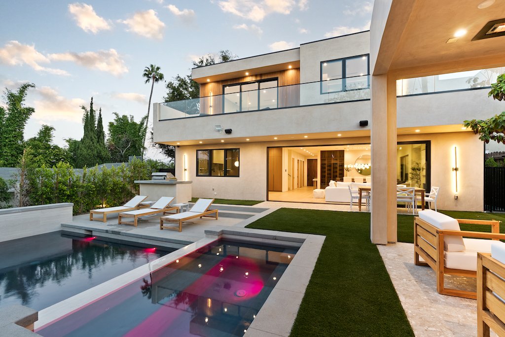 Presenting a sophisticated Mar Vista new construction residence with a seamless blend of natural materials and sleek design. The exterior showcases plaster limestone walls and warm wood accents, leading to a grand entry through a large wood ribbed door. Inside, an office or bedroom suite features an ensuite bath and spacious closet with grasscloth and rattan finishes, providing a refined, earthy touch. The great room is a centerpiece for entertaining, with custom marble elements, a porcelain encased fireplace, and a built-in wine display. Expansive doors open to a large, grassy backyard featuring a pool, elevated spa, and a plastered cabana equipped with heaters, a grill, and a covered dining area with tiled flooringperfect for enjoying panoramic views of the Los Angeles skyline. The marble-clad kitchen is designed for both function and style, featuring Miele appliances, custom cabinetry, and built-in storage solutions. A limestone powder room enhances the home's clean, modern aesthetic whilte the striking staircase, with floor-to-ceiling windows, offers tranquil treetop views. The primary suite opens to a large wraparound patio, surrounded by greenery and offering city views and a custom fireplace. The custom walk-in closet includes thoughtful storage solutions, while the primary bathroom is flooded with natural light, featuring a soaking tub, large shower, and elegant finishes. Upstairs, three additional bedrooms each have custom ensuite bathrooms, with two offering front-facing balconies. Grasscloth built-ins throughout the home add a sleek, textural element. The upper level also includes a convenient laundry room with side-by-side washer and dryer. Smart home technology is integrated throughout, offering modern convenience and effortless control. This home is the epitome of refined luxury, offering privacy, modern design, and seamless indoor-outdoor living. Nestled in a prime Westside location, you'll enjoy the best of Southern California living, with sweeping city views, gentle ocean breezes, all within the coveted Mar Vista Elementary school district.