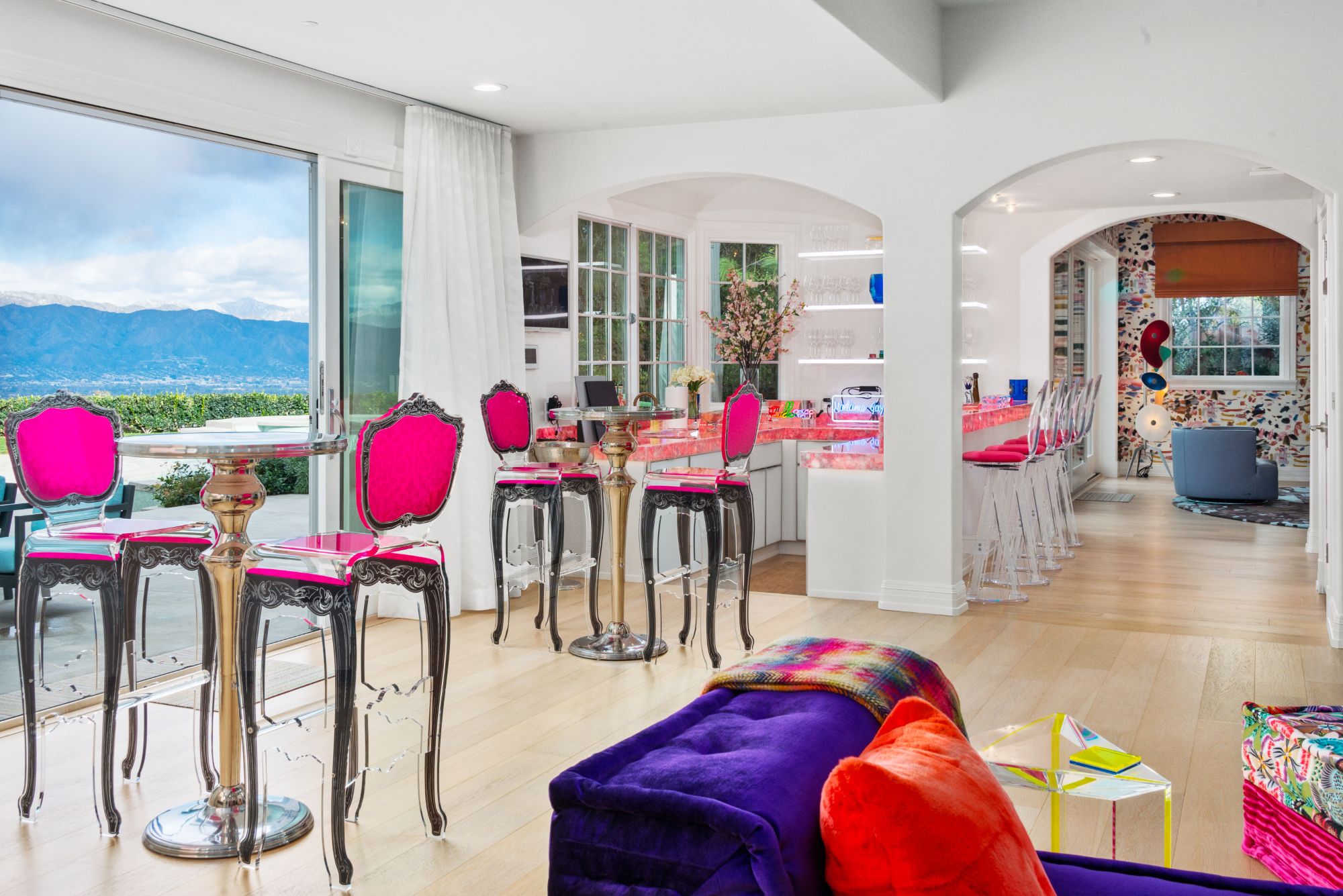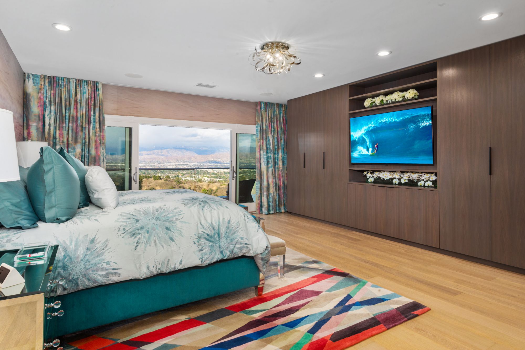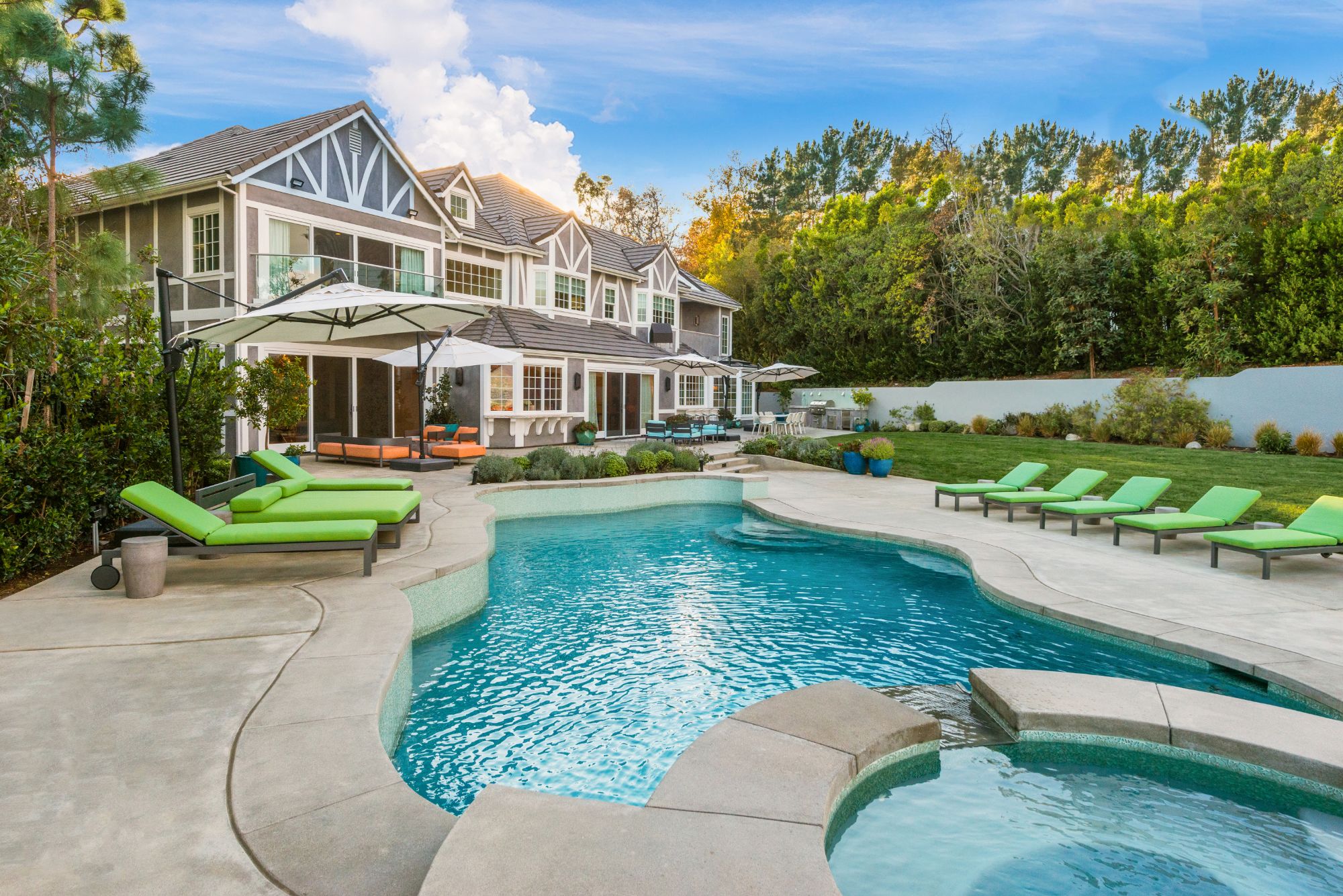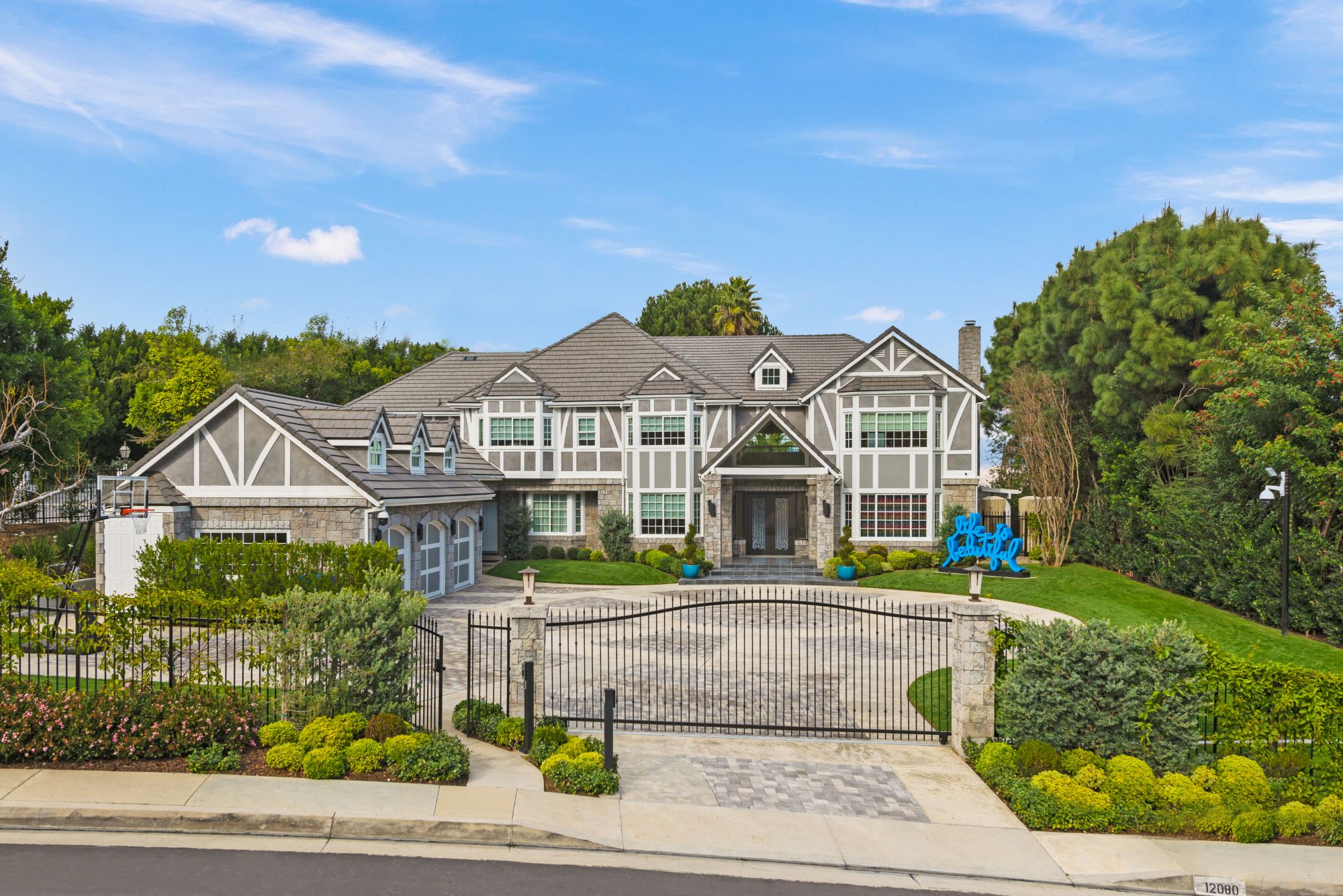 This renovated contemporary Tudor is the ultimate mountainside sanctuary with unrivaled panoramic views spanning from the city to the snowcapped mountains in the guard-gated enclave of The Summit Estates in Beverly Hills on a 34,000 SF flat lot. Beyond a magnificent circular motor court & soaring 25-ft entry, a perfect family and entertainment compound with sophisticated mix of avant-garde & timeless details such as vibrant accent colors, elegant arched openings & oak flooring finishes. Open floor plan features formal living/family/dining rooms and full bar opening up to the oversized, lush backyard. With explosive views, entertainment oasis offers perfect indoor/outdoor living with a saltwater pool, raised spa, BBQ, bar & large lawns. State-of-the-art chef’s kitchen with dining & glass wine room. Upstairs features a 2nd family pajama lounge with fireplace, guestrooms & a lavish primary suite and an exquisite bathroom with soaking tub. No expense was spared everything had to be the best.