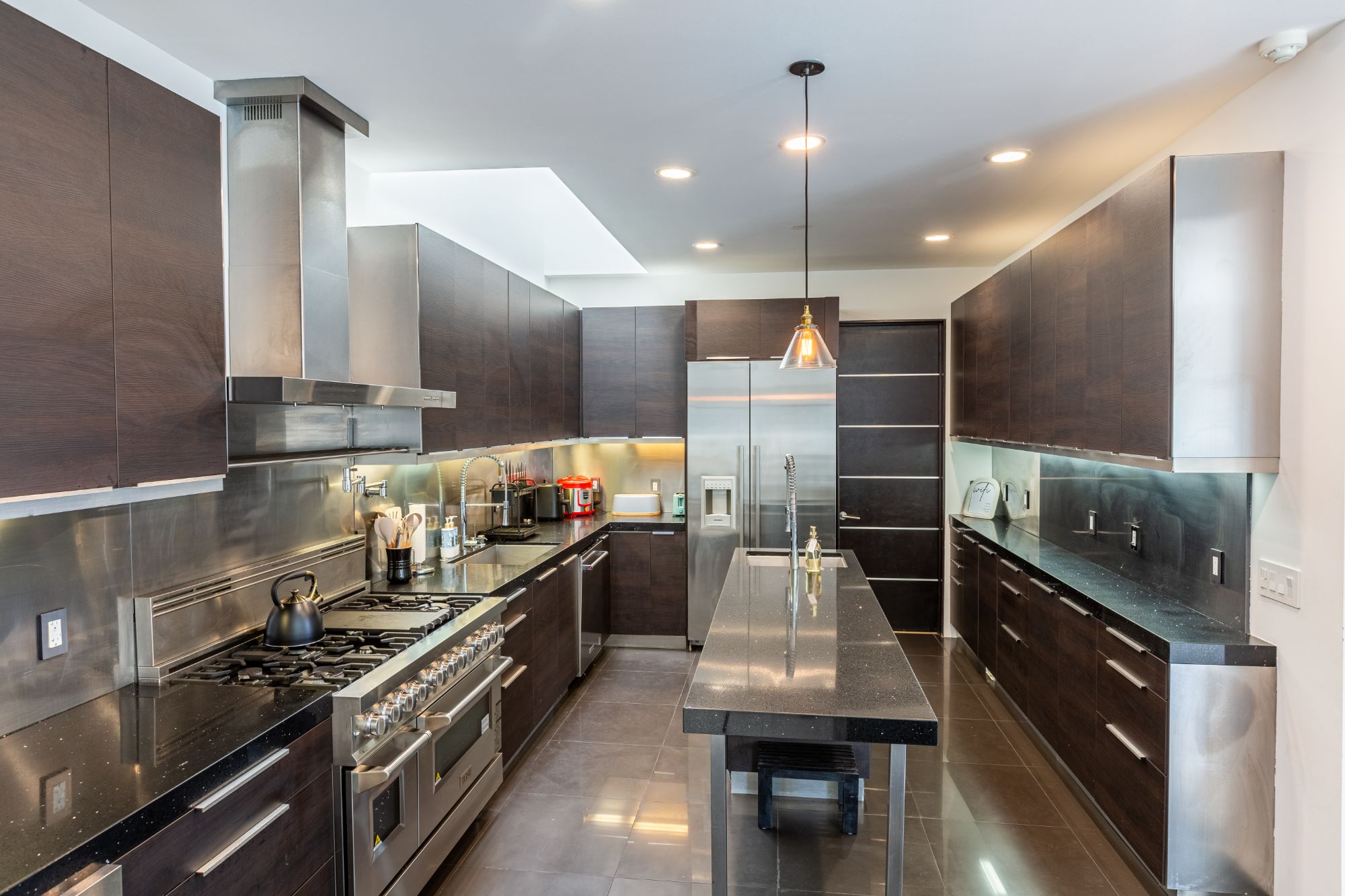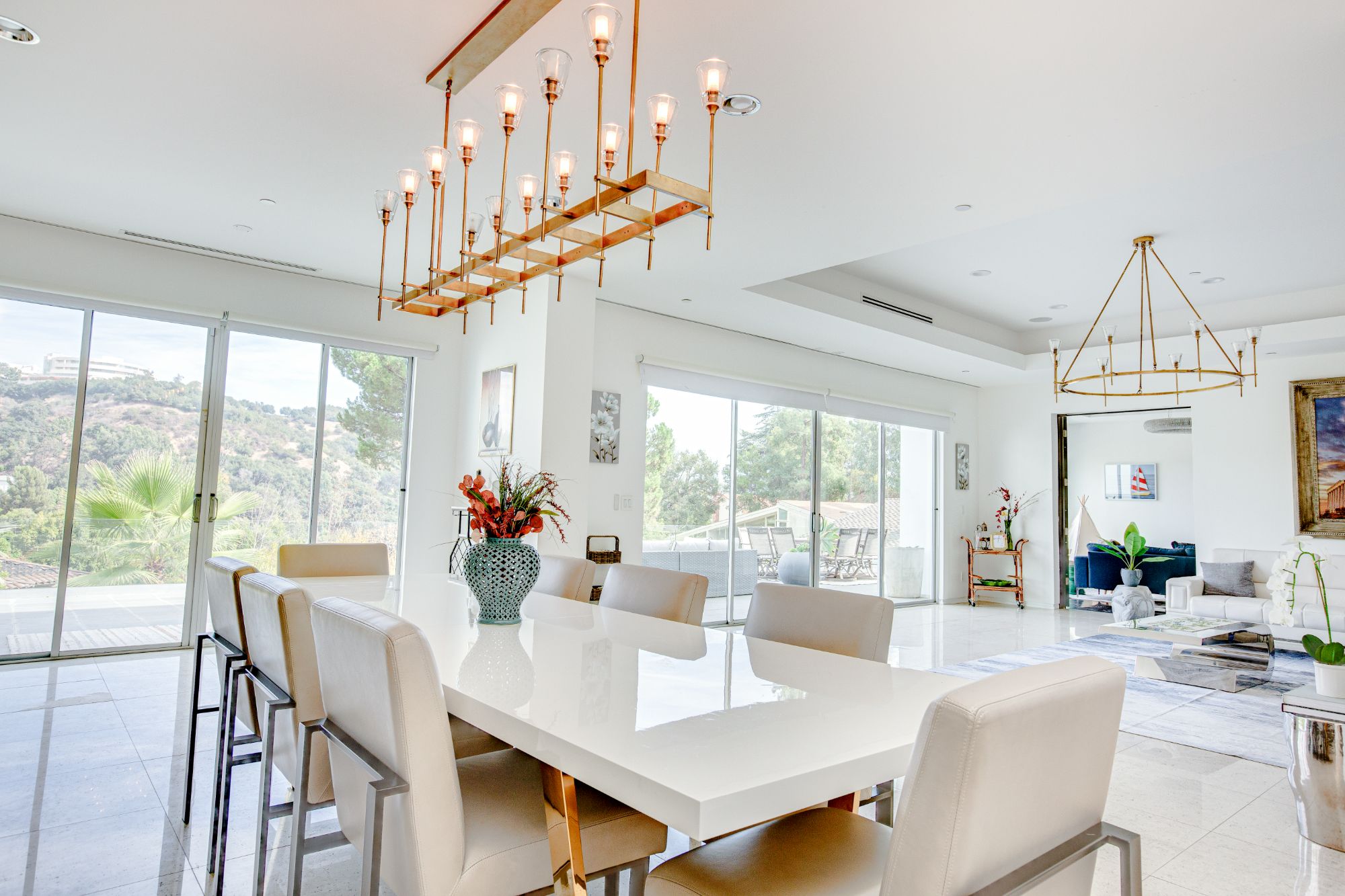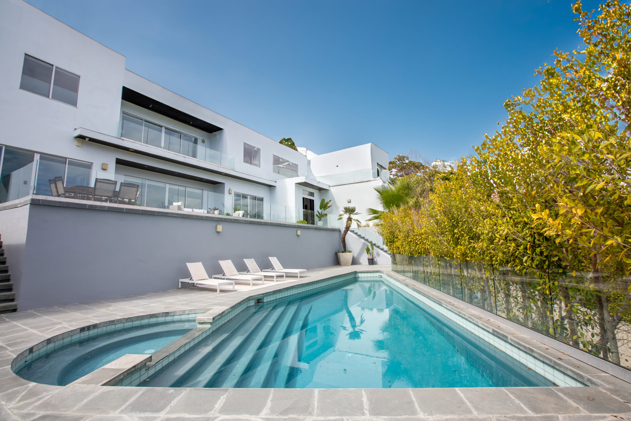 Incredible Brentwood Contemporary Estate located just above Brentwood Park and situated on a secluded 1/3 of an acre gated lot. Drive up a private street to this 5 bedroom, 7.5 bathroom architectural gem offering 5,056 square feet of luxurious living space, with breathtaking panoramic views of the Santa Monica Mountains and Getty Museum. A beautiful foyer leads to an open floor plan with an abundance of natural light throughout and seamless indoor-outdoor living. Designer kitchen with newer custom cabinets, top grade stainless appliances, center island, and a large pantry with wine storage. Kitchen opens to a sizable dining area and formal living room with fireplace, perfect for entertaining. Stroll into the welcoming library/theater room with a full bath and concession area. First floor also has two en-suite bedrooms, separate office, and powder room. The primary suite upstairs is a massive retreat, showcasing tremendous views, a private dressing area with custom closets, and a spa-inspired bath with dual vanities and digital shower. Also featured on this floor are two spacious newly renovated en-suite bedrooms plus a large laundry room. The garage has parking for three cars and includes a gym/yoga room. The motor court offers additional parking for multiple vehicles. Spacious backyard with an adjacent garden and mature pomegranate trees. The rooftop deck allows for further outdoor entertaining with stellar views. Resort-style pool and spa with newer pool equipment, an outdoor shower, a half-bath and a built-in BBQ area. An incredible fully furnished lease offering in a highly sought after location.