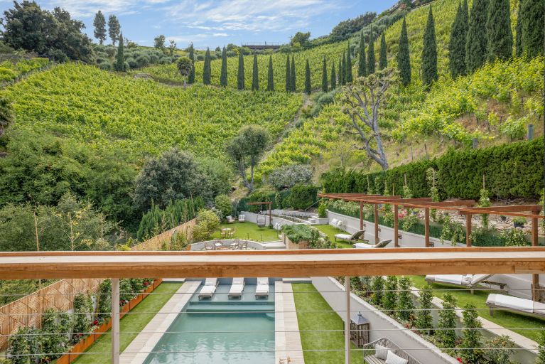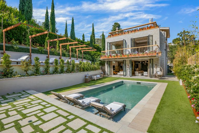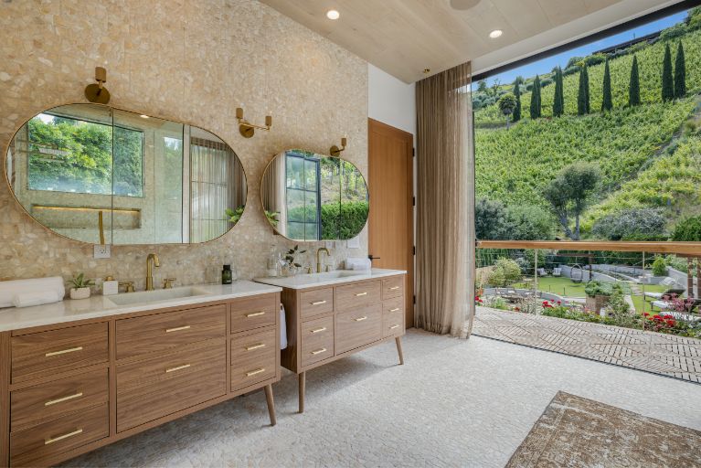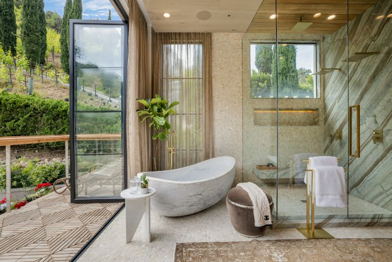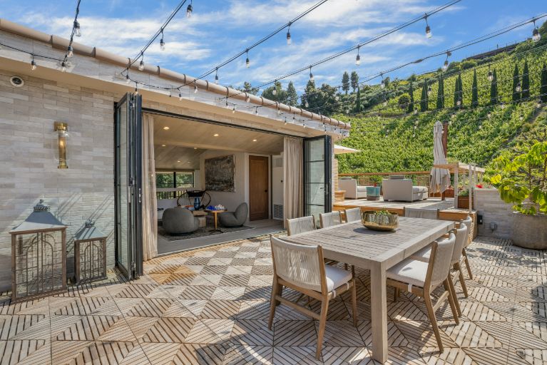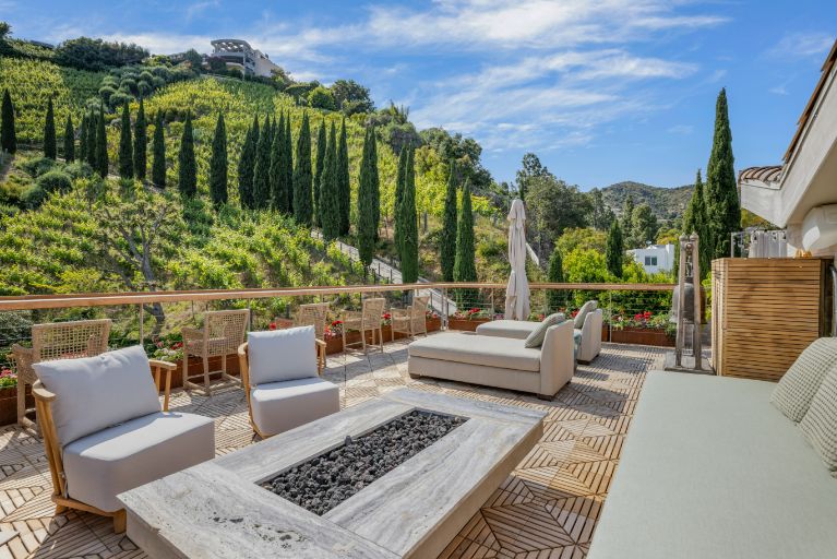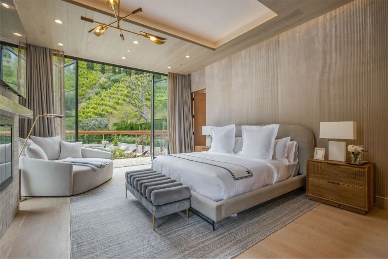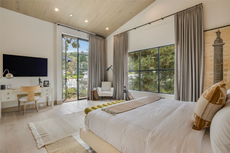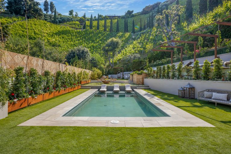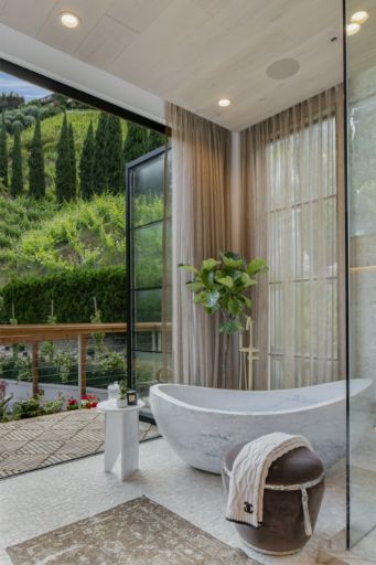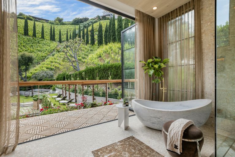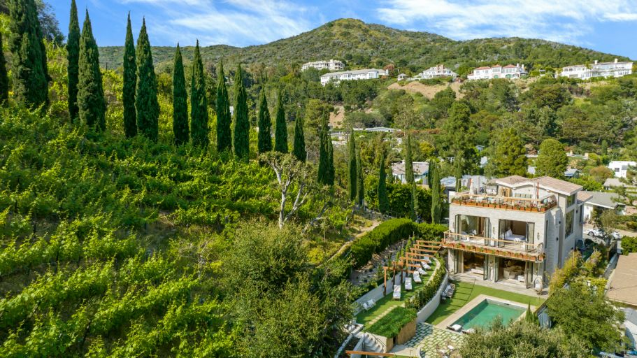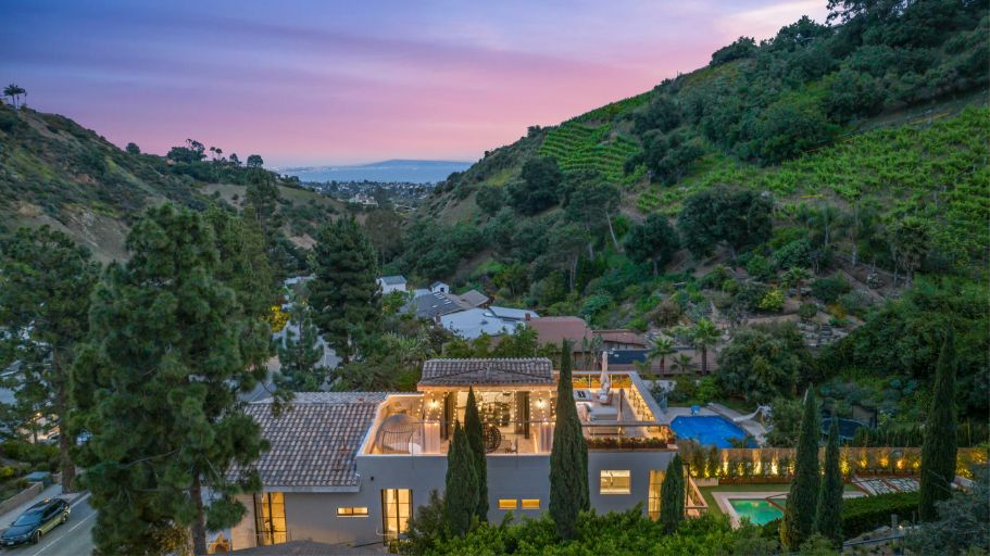 Welcome to Villa Montalcino. A slice of Tuscany awaits in the heart of the prestigious Pacific Palisades. A vision of elegance and charm, the estate was built in perfect harmony with its surroundings, where canyon serenity meets lush vineyards under a blanket of fresh ocean air. The newly completed Villa Montalcino is the latest in the lineage of architectural masterpieces by the renowned Arya Group. Nestled at the base of the Arya Estates Vineyard, this hillside haven is the only of its kind in Los Angeles, and transports you to a time and place that is uniquely its own. The perfect blend of warm modern luxury and comfortable functionality, the home boasts 4 beds & 6 baths, each offering its own glimpse of breathtaking canyon scenery. Tucked away in peaceful privacy, Villa Montalcino is only minutes from local beaches and the bustling Palisades Village. The sweeping open floor plan allows for a graceful flow through the main level, which includes formal dining, a breakfast area, beautiful kitchen, elegant powder room and two living spaces perfect for relaxation and entertaining alike. Seamlessly transition to the outdoor oasis through disappearing walls of glass, creating a harmonious indoor-outdoor experience. California living at its finest, the sprawling backyard includes a large pool with Baja shelf, BBQ area and endless patio / grass spaces for al fresco dining & lounging.The primary suite is a true sanctuary, featuring a fireplace and private balcony through accordion doors allowing for natural light, expansive green vistas, and fresh air to flood the space. The spa-like en-suite bath offers a gorgeous stone soaker tub, glass shower with three shower heads, dual vanities, heated floors, and a boutique-worthy closet. For breathtaking views of the ocean, escape to the expansive teak rooftop deck, where you can relax and soak in the beauty of the surroundings, or host an unforgettable gathering under the stars. Additional luxury amenities include well-appointed guest suites, state of the art security systems, an upper level loft, wide plank oak floors, Sonos sound system, Lutron light system, iPort, a laundry space with two washer / dryer sets & built-ins, and so much more. Uplighting throughout the interior & exterior accentuate the architectural beauty while creating a captivating ambiance. From impeccable finishes to seamless indoor/outdoor living and breathtaking views, this property offers an experience like no other. Decades of vision and imagination come to life with elegance, comfort and sophistication at Villa Montalcino.