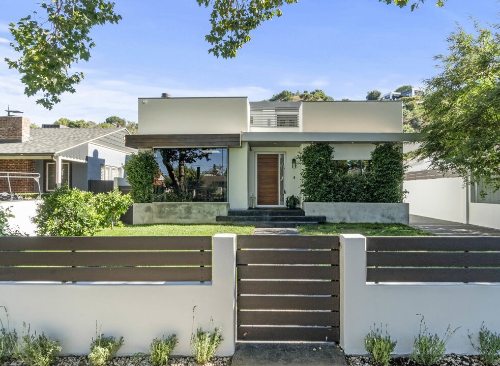 Welcome to 12334 Cantura, a re-imagined contemporary inspired residence in the heart of Studio City's coveted Silver Triangle. Situated on a picturesque tree lined street south of the boulevard, this home provides a serene escape from city life, while around the corner from the best restaurants, shopping and entertainment in Studio City. As you enter the home through a gated and verdant front yard with fruit trees, the open-concept living room, bathed in natural light from skylights, leads to the chef's kitchen with ample space to cook and entertain. There is a large dining area with floor to ceiling custom cabinets, a sleek wet bar and wine storage. As you transition from the dining and living areas through a hallway designed for showcasing art, you catch a glimpse of the Bali-inspired backyard oasis through glass doors. On this main floor there is a spacious living room, a powder room, a designer themed bedroom, bathroom and office/or additional bedroom. For those looking for a truly quiet space, there is a large closet creatively transformed into an isolation recording sound booth - perfect for music, reading, meditation or additional storage. Ascend the wood and glass floating staircase to the luxurious primary suite, featuring floor to ceiling custom built-ins, large picture windows, a linear fireplace and a private rooftop deck with panoramic views. The spa-like ensuite bathroom boasts dual vanities, an oversized walk-in rainfall shower, and a deep soaking tub. Upstairs, there is an additional en-suite bedroom perfect for family or guests. The Bali-inspired backyard is truly a showstopper, offering a covered patio, expansive outdoor kitchen, dining area, relaxing bed swing and swimming pool tastefully framed by bamboo and colorful ceramic planters boasting additional greenery. Experience refined living amidst the vibrant energy of the Silver Triangle in Studio City.