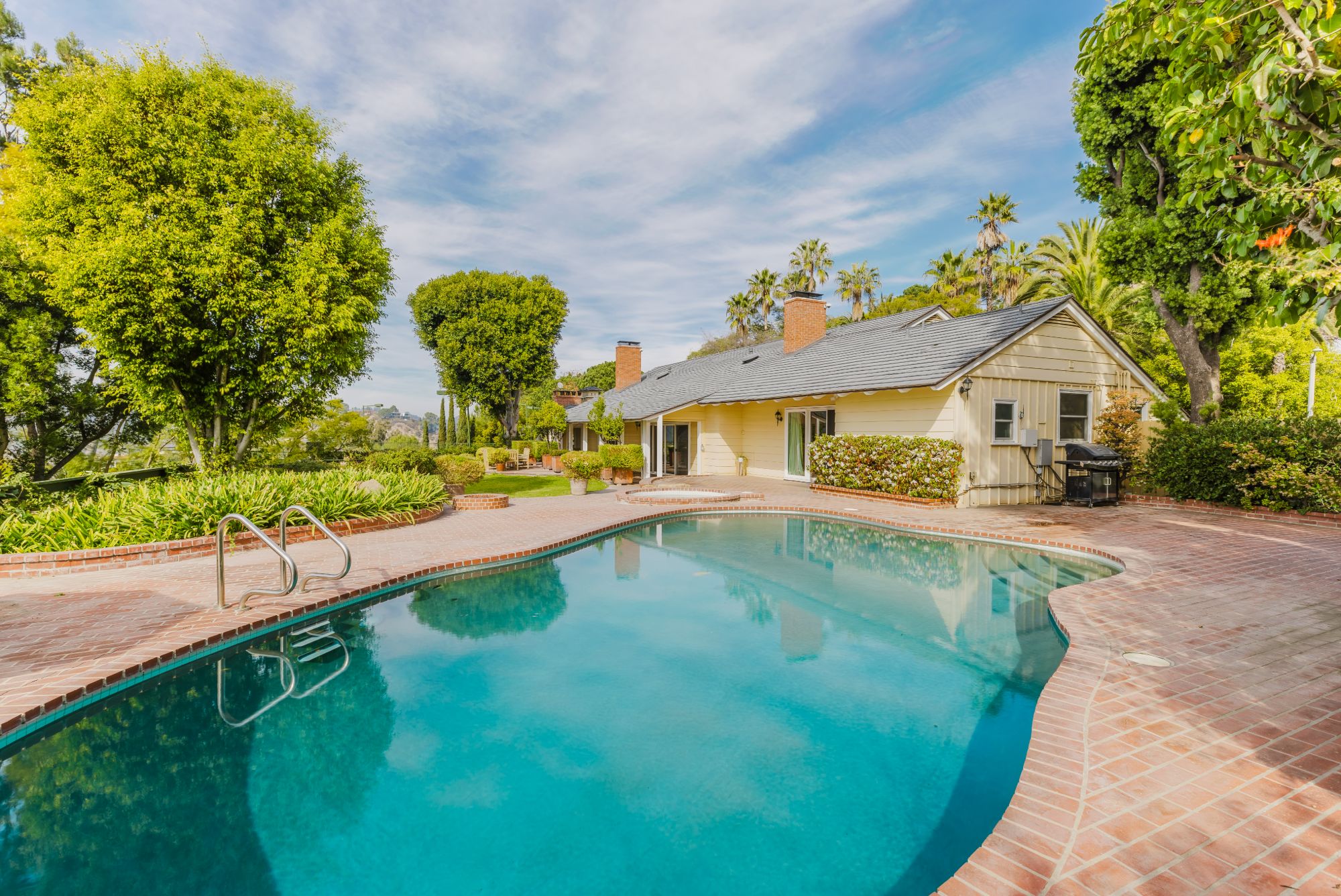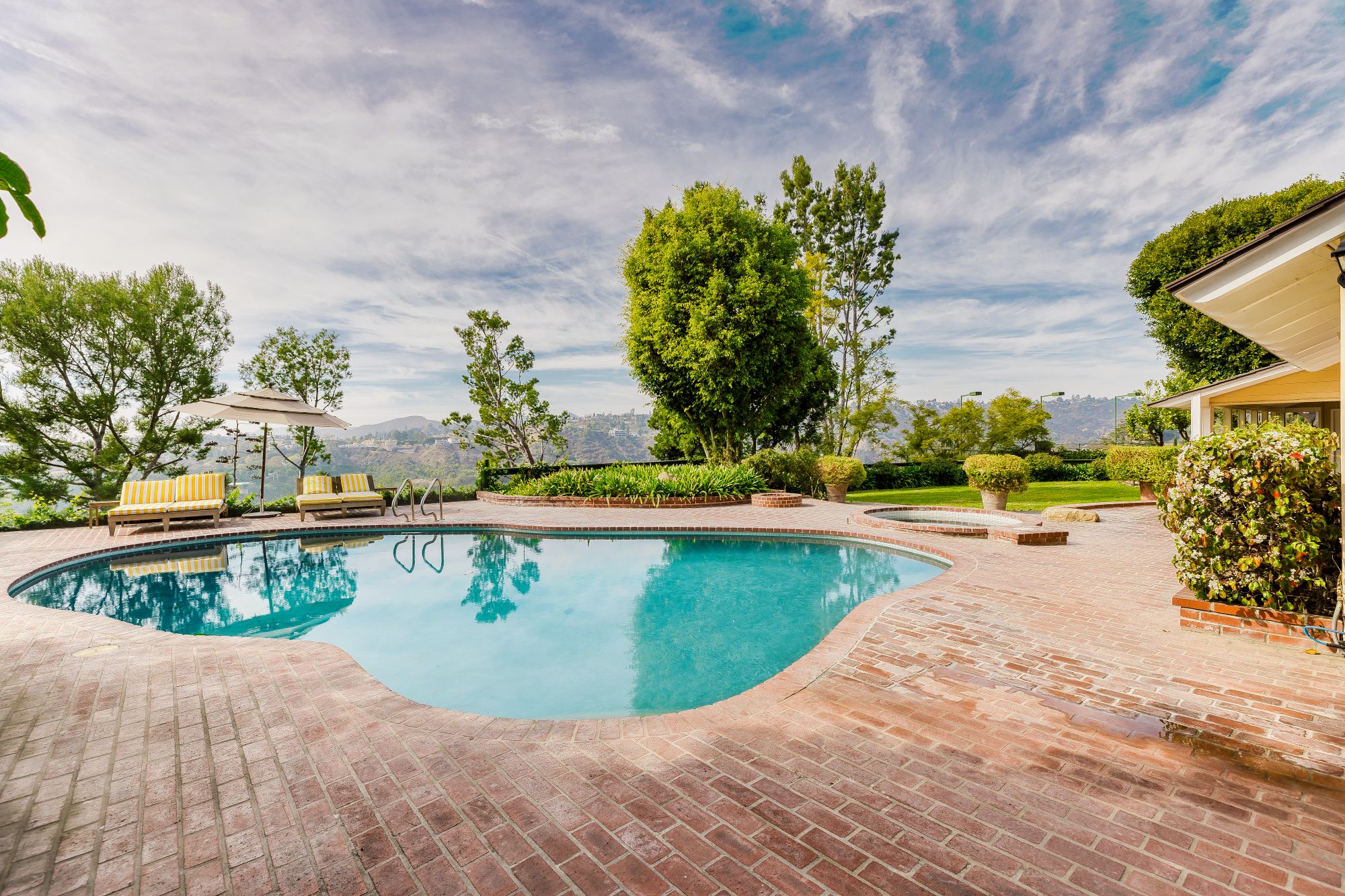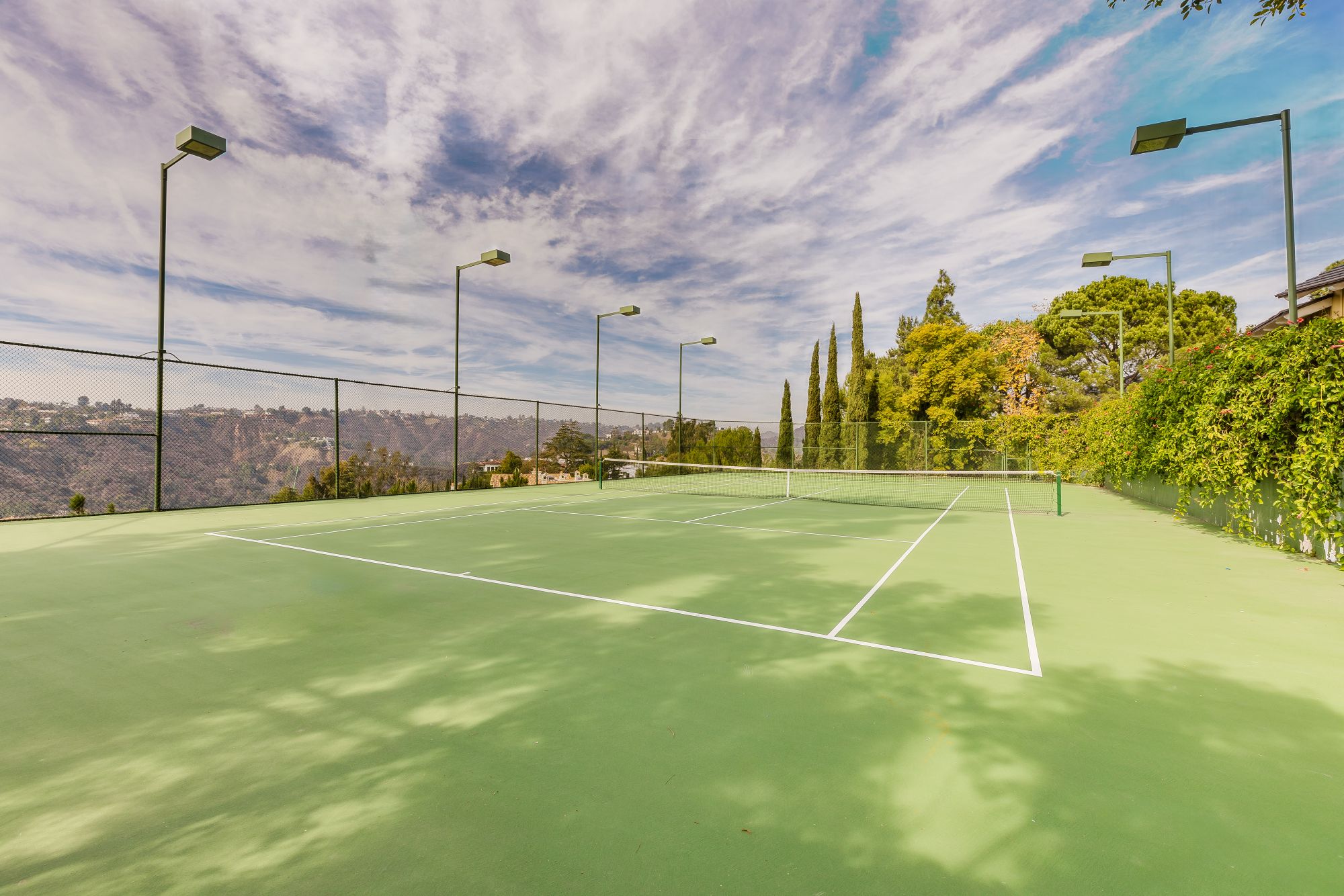 Set atop a prime Bel Air hilltop, this classic estate offers a serene escape with unobstructed ocean, city, and canyon views. Spanning almost an acre, the home blends mid-century charm with timeless appeal. A stunning cantilevered tennis court, sparkling pool and spa, and expansive grassy yard invite relaxation while enjoying the spectacular blue-sky vistas. The light-filled residence features spacious, well-appointed living areas, including a formal dining room, family room, and a vast bonus room perfect for entertainment. Hardwood floors flow throughout, enhancing the home's elegant atmosphere. The gourmet kitchen, complete with a sunny breakfast nook, is ideal for gatherings. Four bedrooms, including a luxurious master suite with a marble bath, offer comfort and privacy. Smart home capabilities, multiple fireplaces, and a two-car garage complete the offerings. The private backyard, with a tennis court featuring area lights, creates a resort-like atmosphere perfect for both active play and tranquil retreats. This estate is the epitome of refined living in Bel Air.