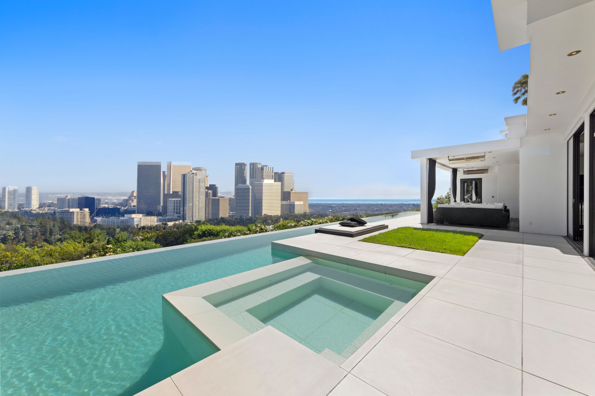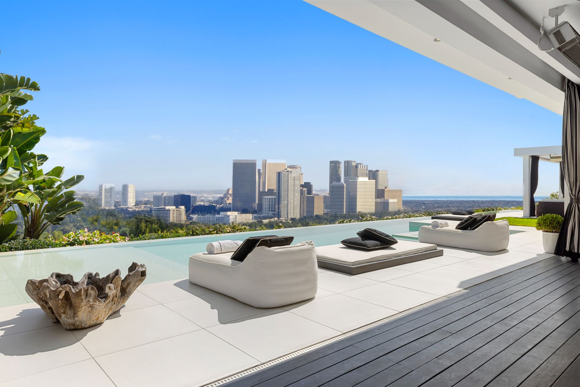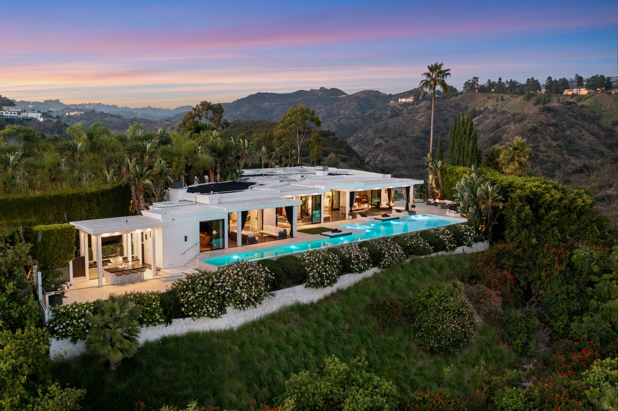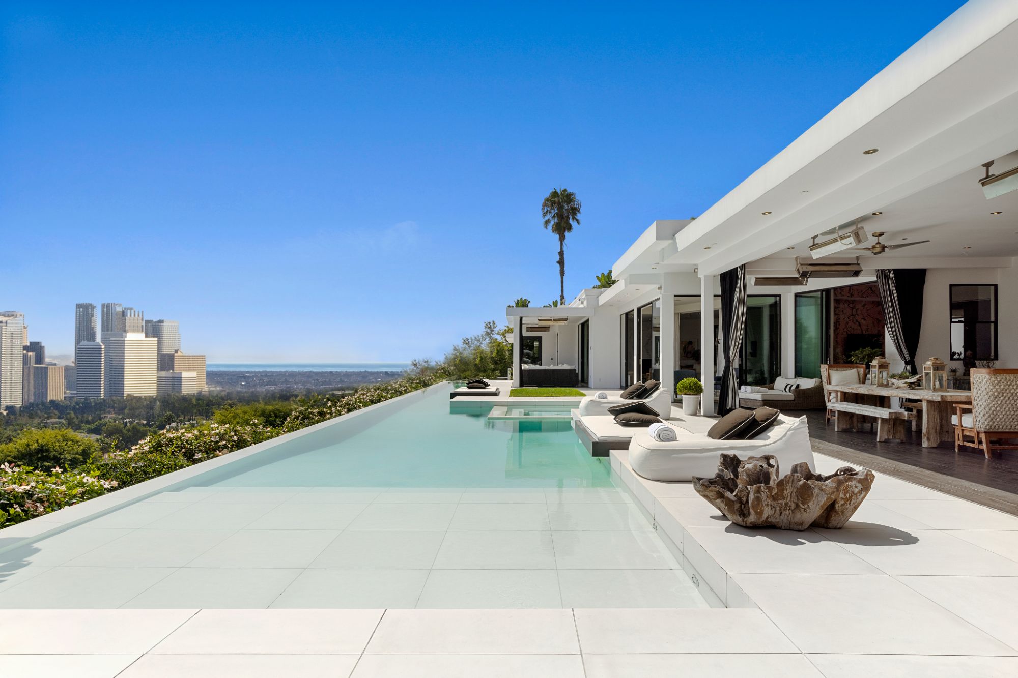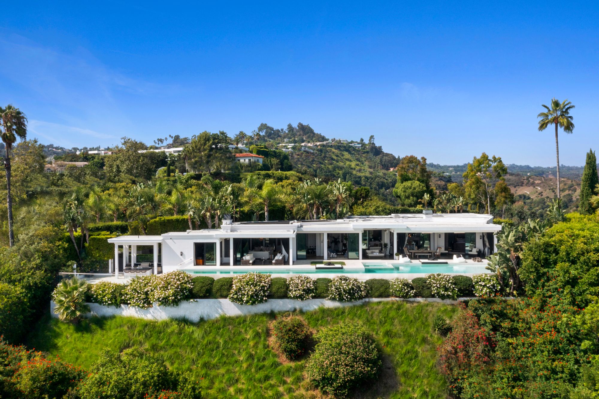 This architectural masterpiece is set upon a promontory on one of the most coveted hidden streets in Beverly Hills, Shadow Hill. One-level Ralph Lauren contemporary with seamless indoor/outdoor living and explosive views from downtown to the ocean and everything in between. Huge deck and an 80-foot swimmers infinity pool with spa that over looks the city. Oversized double-gated motor court. Walls of glass allow natural light to fill the home and frame the endless views. Stainless steel kitchen has an oversized island with seating, a mirrored fireplace, and opens to the deck for dining al fresco. Spacious primary suite with views, a spa-like bathroom, and walk-in closet. The latest and greatest amenities including home theater, office, and a guest house with separate entrance that offers 2BD, a gym, and canyon views. Outside enjoy a built-in BBQ, multiple poolside seating areas with heaters, a fire pit, and outdoor shower overlooking the canyon. Experience unparalleled luxury living in this modern estate, just minutes from the best shopping and dining Beverly Hills has to offer.