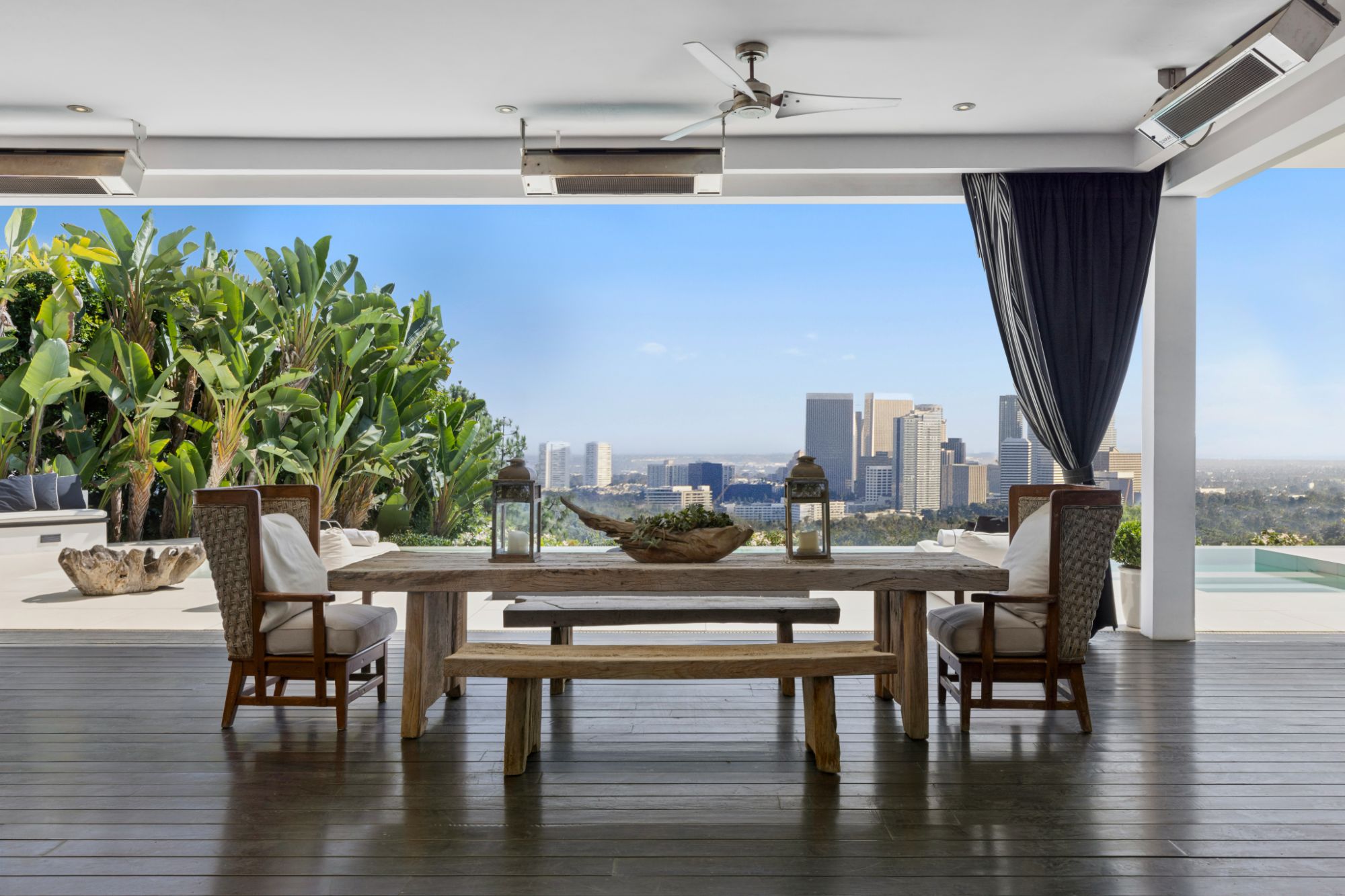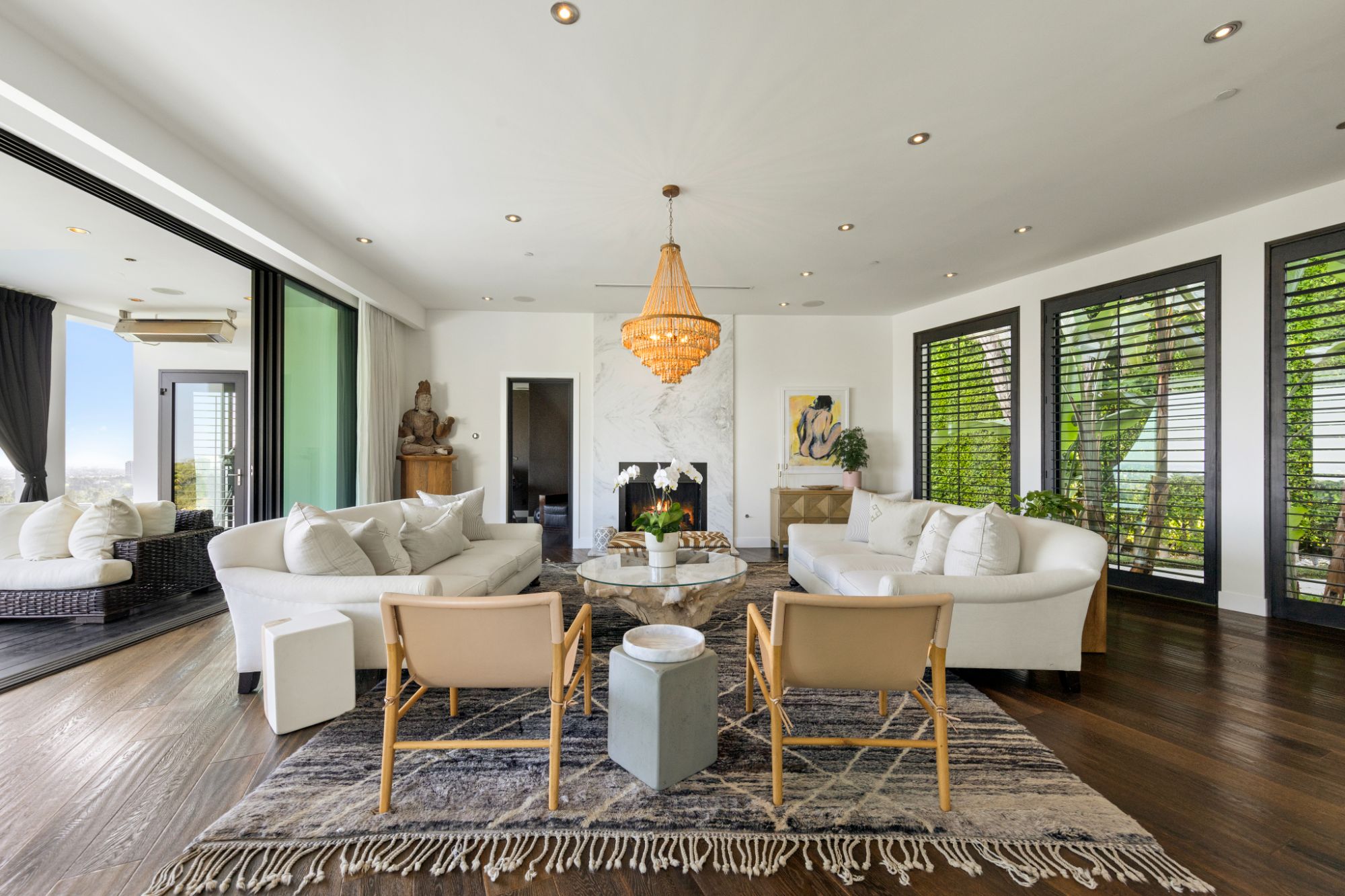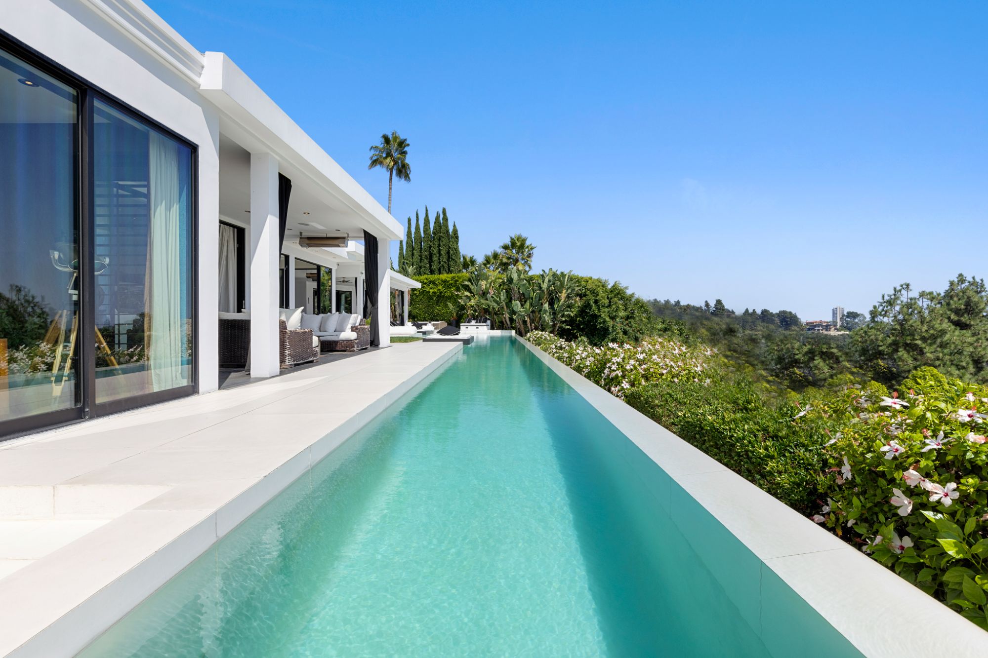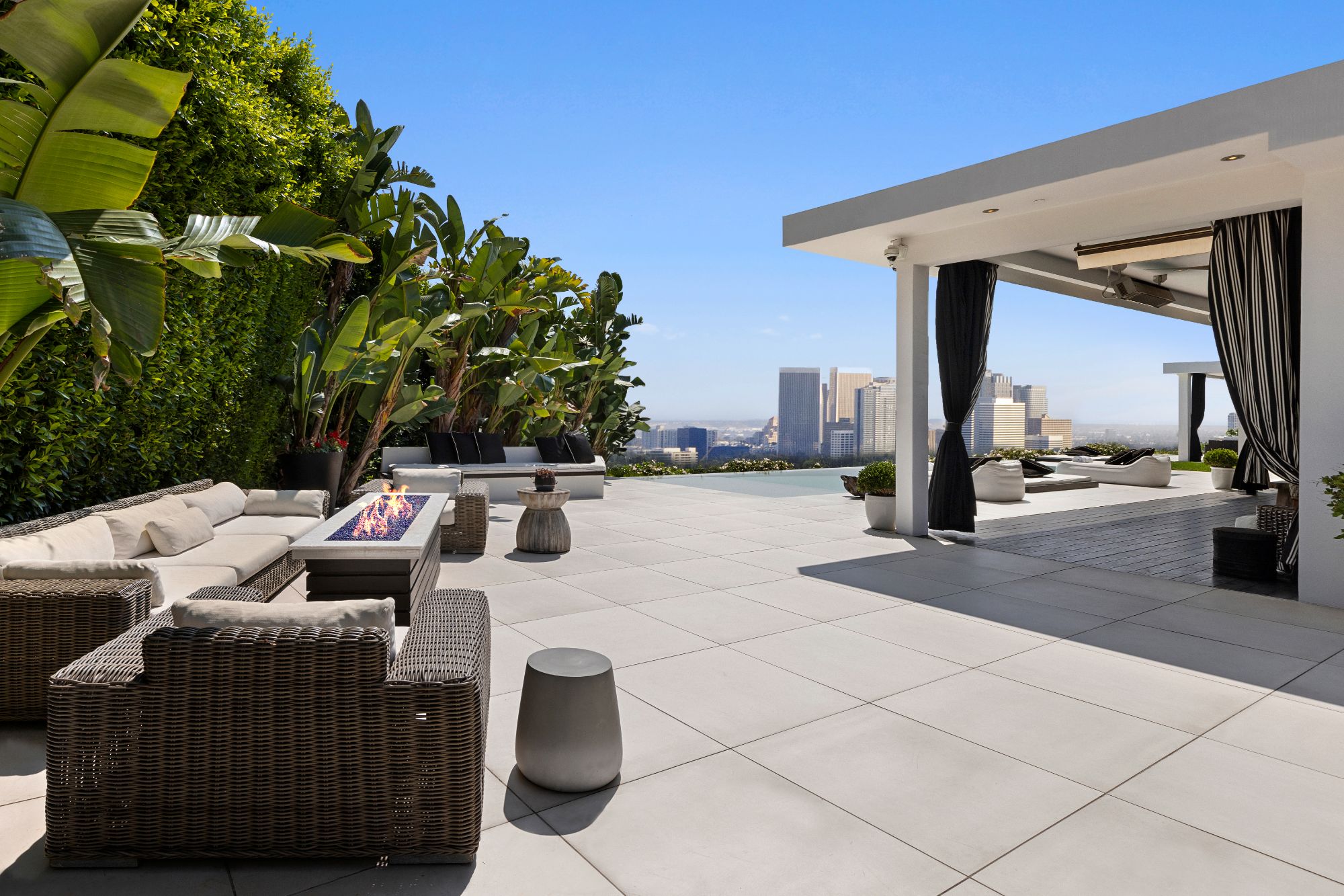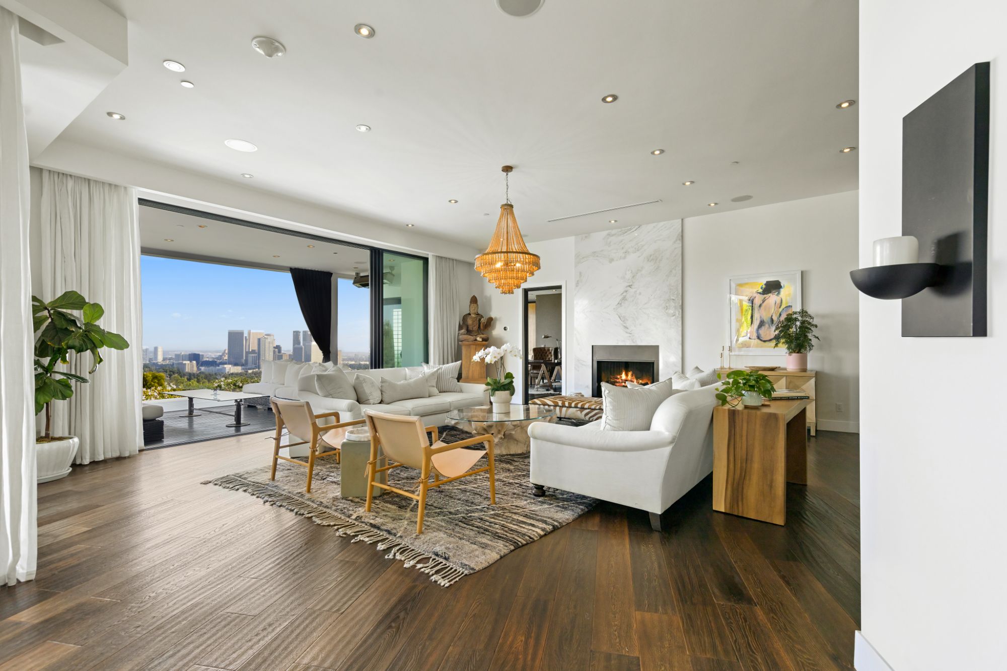 This architectural masterpiece is set upon a promontory on one of the most coveted hidden streets in Beverly Hills, Shadow Hill. One-level Ralph Lauren contemporary with seamless indoor/outdoor living and explosive views from downtown to the ocean and everything in between. Huge deck and an 80-foot swimmers infinity pool with spa that over looks the city. Oversized double-gated motor court. Walls of glass allow natural light to fill the home and frame the endless views. Stainless steel kitchen has an oversized island with seating, a mirrored fireplace, and opens to the deck for dining al fresco. Spacious primary suite with views, a spa-like bathroom, and walk-in closet. The latest and greatest amenities including home theater, office, and a guest house with separate entrance that offers 2BD, a gym, and canyon views. Outside enjoy a built-in BBQ, multiple poolside seating areas with heaters, a fire pit, and outdoor shower overlooking the canyon. Experience unparalleled luxury living in this modern estate, just minutes from the best shopping and dining Beverly Hills has to offer.