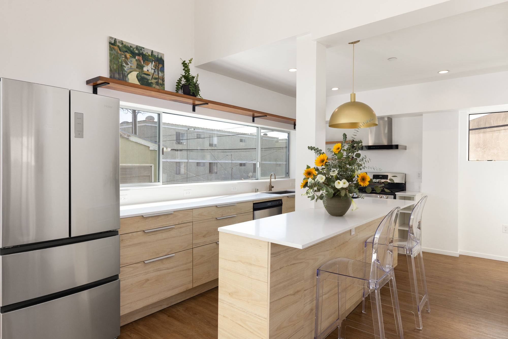 Welcome to 1244 14th St., an exceptional opportunity for a homeowner or investors seeking a like-new rental income property mere blocks from the beach in coveted Santa Monica. Spanning 2,248 square feet, this modern architectural condo features 3 bedrooms and 4 bathrooms, designed by acclaimed AIA architect Jennifer Wen. Flooded with natural light, showcasing clean lines, and appointed with high-end finishes, this home effortlessly blends luxury with functionality. The versatile layout features a spacious first-floor flex space, ideal for use as an additional bedroom, professional studio, home gym, or creative workspace. The main level boasts an open-concept living area and a gourmet kitchen equipped with the finest amenities, appealing to tenants who appreciate sophisticated coastal living. The primary suite provides a serene escape complete with a private patio and garden area, while the second bedroom offers its own balcony for enjoying the coastal breeze. The property's crown jewel is the private 500 sq ft roof deck featuring breathtaking 360-degree views of the ocean, mountains, and city skyline, perfect for dining al fresco or entertaining with friends. Additional amenities, including in-unit laundry, secure direct-access parking with two side-by-side spaces, solar panels (lowering monthly expenses), and an EV charging hookup, enhance convenience and sustainability. Situated in a prime Santa Monica walking distance to LA's best beaches, dining, shopping, and entertainment, this property presents a rare opportunity to own a home or to invest in the consistent rental demand in Prime Santa Monica.