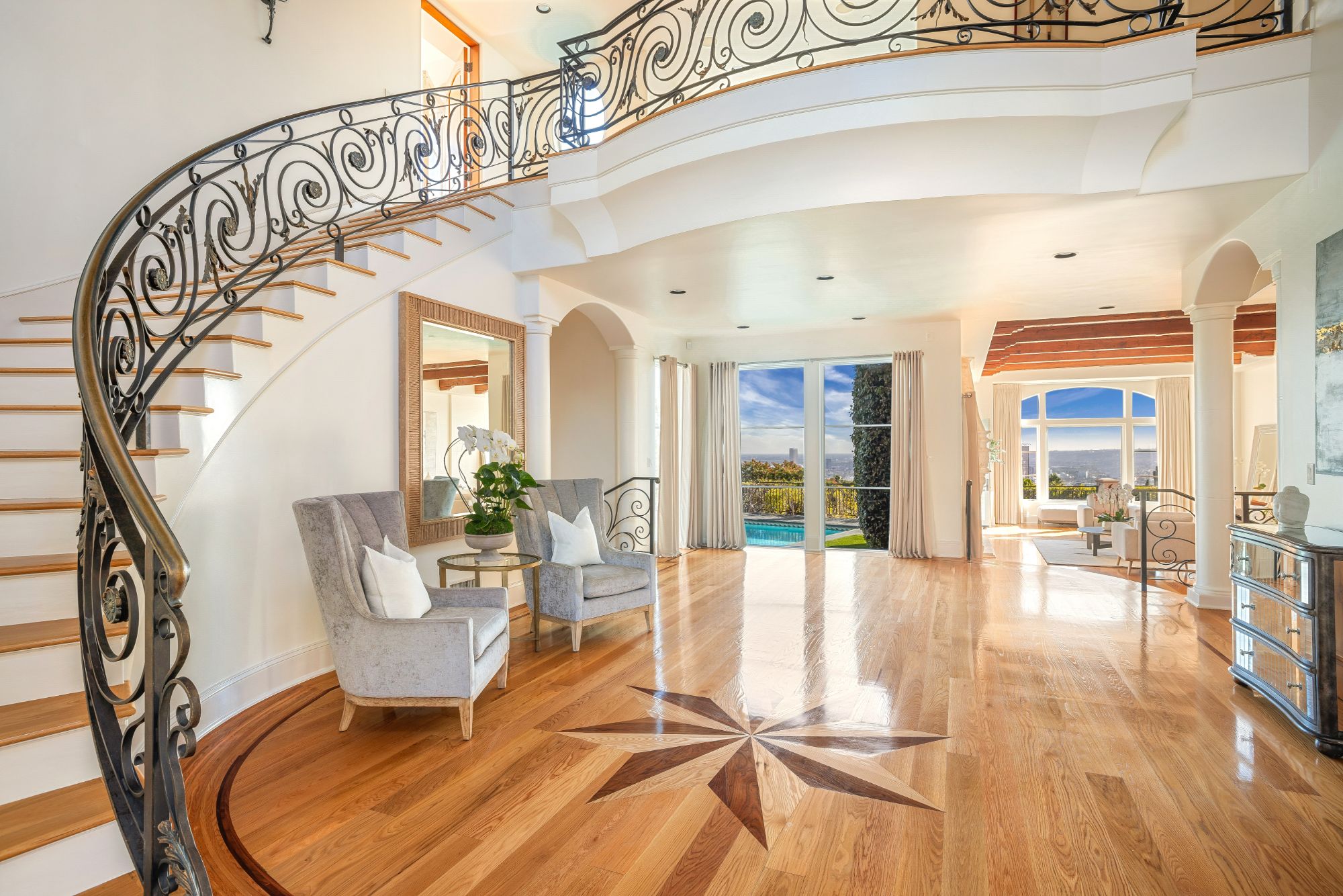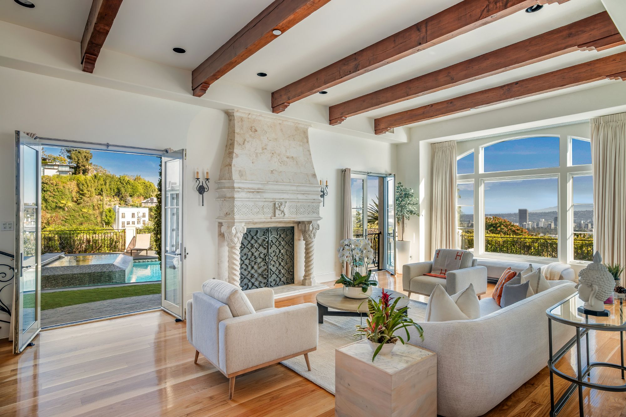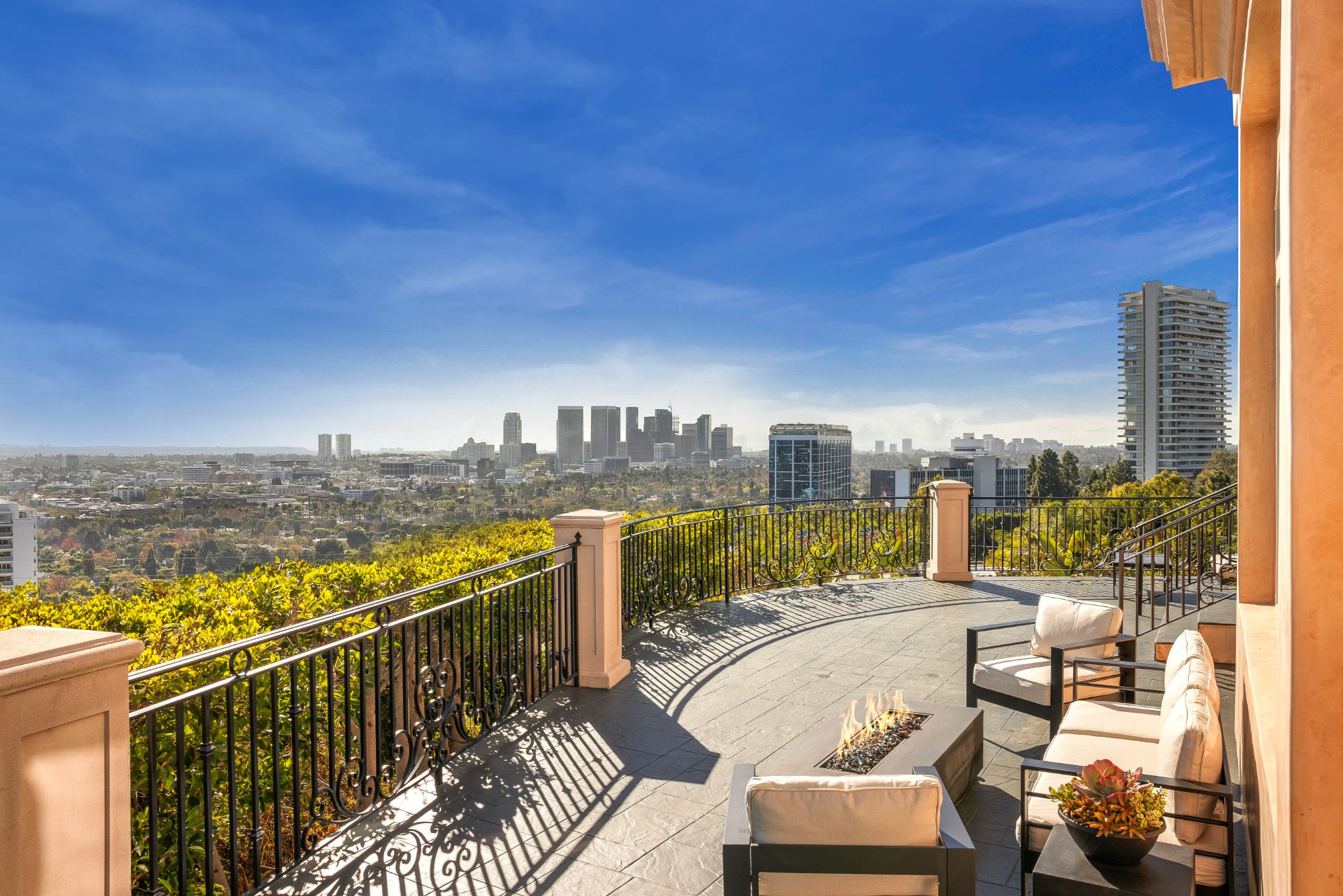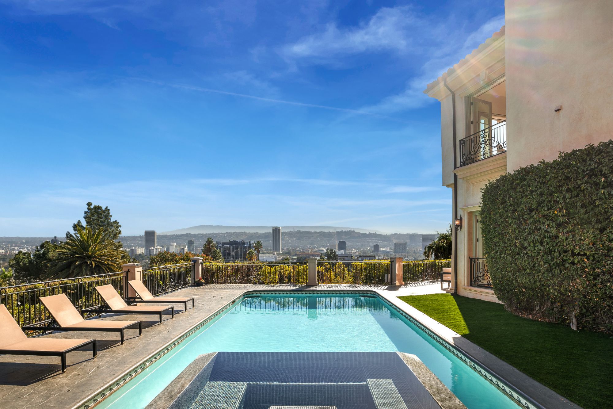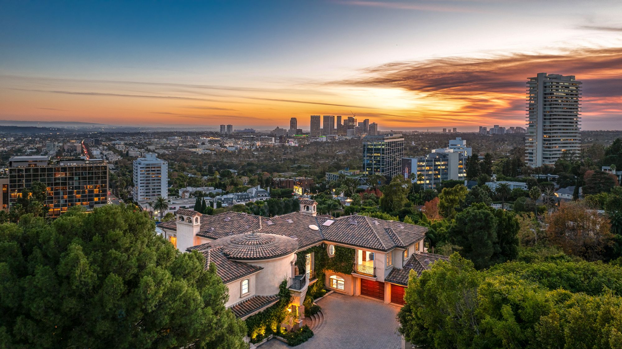 Perched atop a private cul-de-sac promontory above the Sunset Strip, this majestic estate offers castle-like grandeur, exceptional privacy, and panoramic city-to-ocean views.A dramatic flagstone motor court leads to a stately courtyard and 9,400 square feet of timeless Mediterranean design blended with modern sophistication. From the grand foyer featuring 30-foot vaulted ceilings and a sweeping staircase to the spacious living, dining, and family rooms, each space is designed to showcase breathtaking views from Downtown LA to Catalina Island. The gourmet kitchen is a chef's dream, outfitted with granite countertops, Viking appliances, Sub-Zero refrigeration, dual dishwashers, and a walk-in pantry. French doors open to a patio and BBQ area ideal for al fresco dining against the backdrop of Pacific sunsets. Upstairs, the primary suite is a private sanctuary with a sitting room, fireplace, wet bar, three Juliette balconies, and a sprawling terrace with commanding views. Dual spa-style bathrooms feature soaking tubs, steam showers, and custom walk-in closets. Four additional en-suite bedrooms offer luxury accommodations for family and guests. The lower level boasts a media room, custom wine cellar, yoga/dance studio, and a private guest suite with separate entrance. A private elevator connects all levels, and amenities include a three-car garage, ample guest parking, dual laundry rooms, and full smart home integration for effortless living. This is more than a home it's a private retreat designed for grand entertaining and serene living in one of LA's most coveted locations.