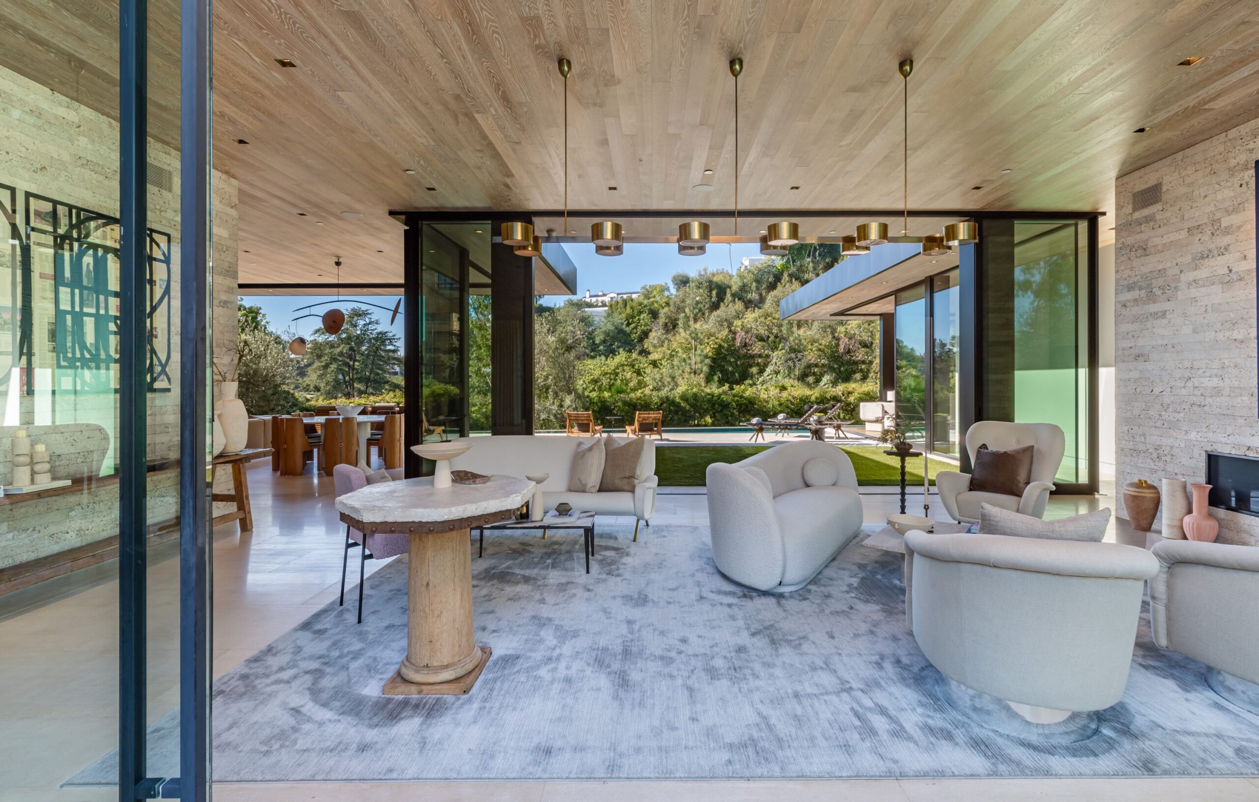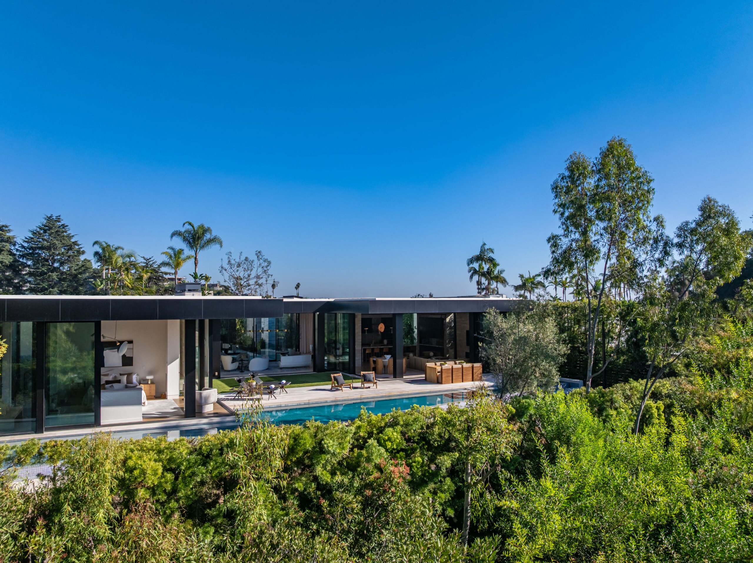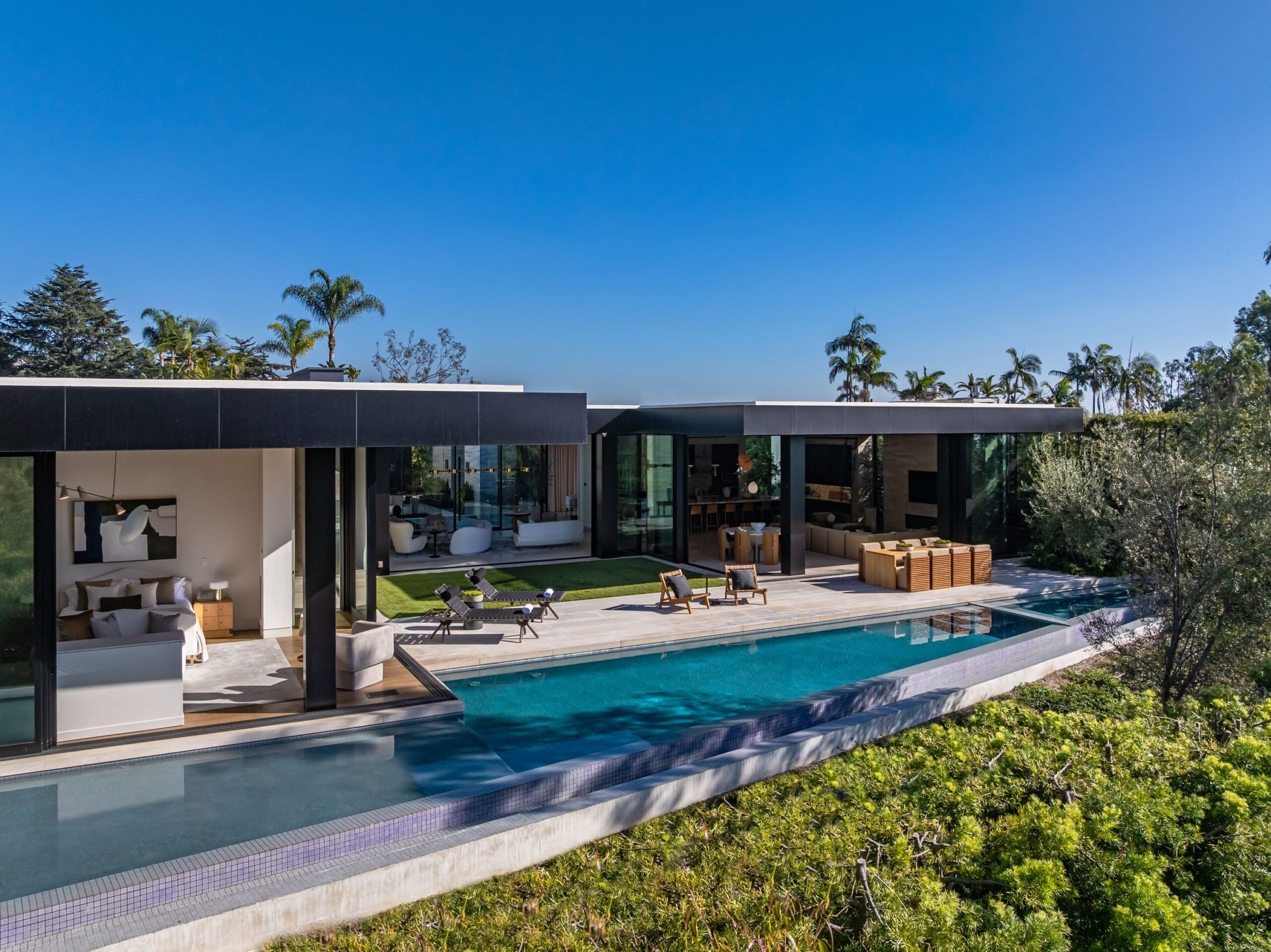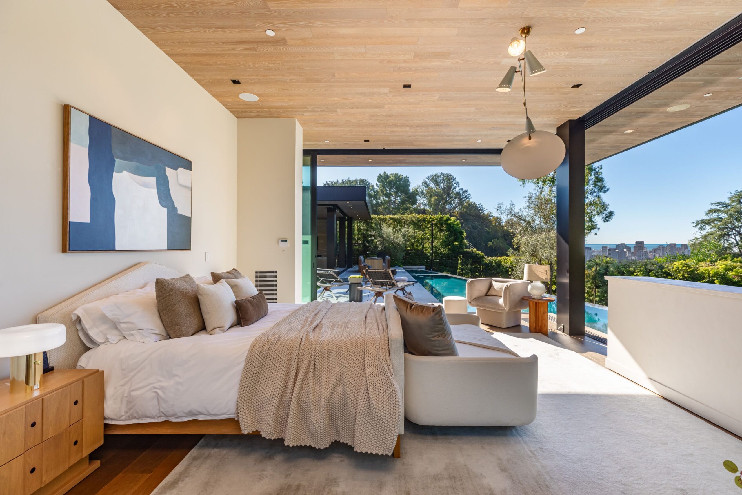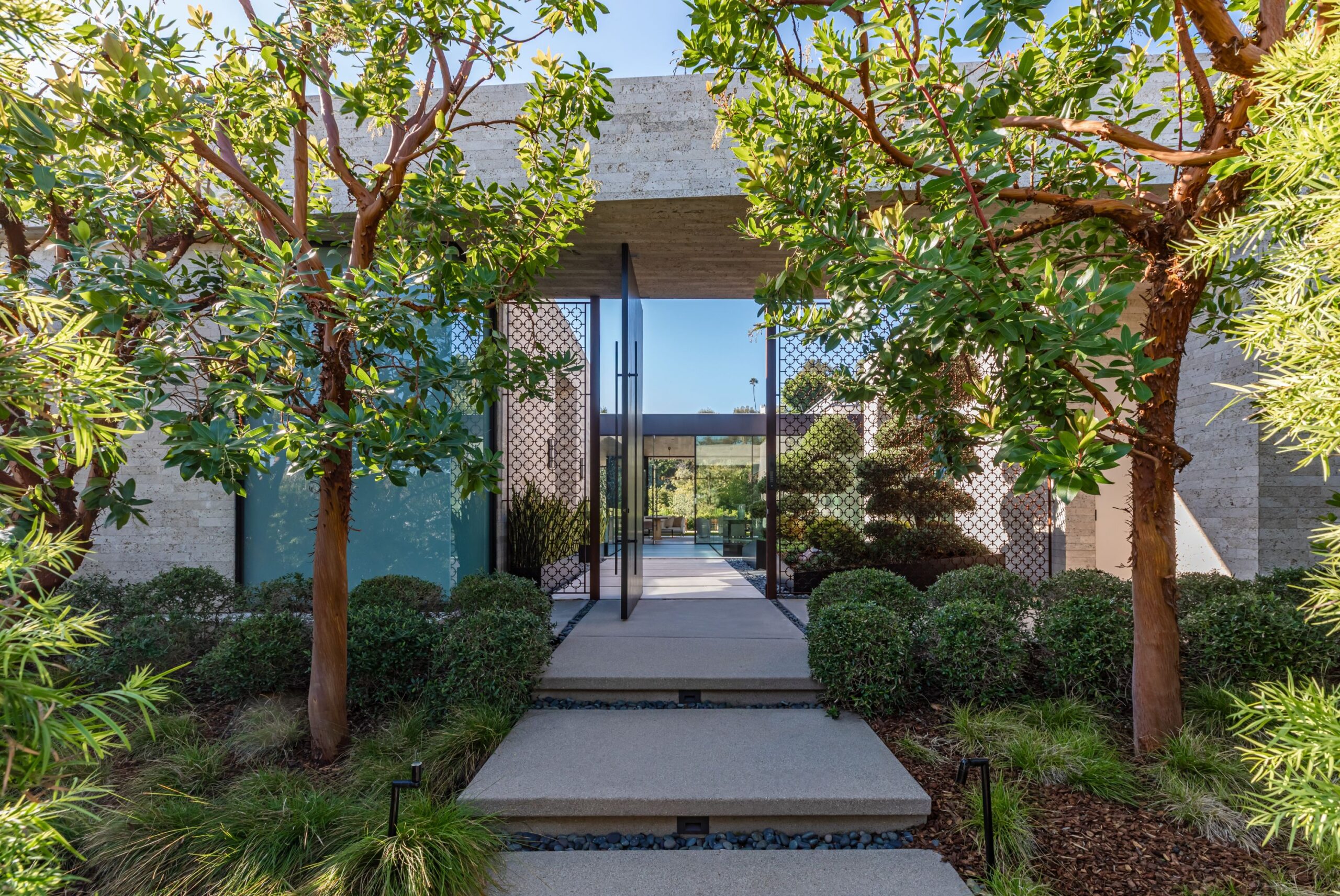 Discover world-class design and luxury in this organic contemporary Trousdale masterpiece crafted by award-winning architect Paul McClean and designer Lindsay Chambers and reimagined by Nate Berkus & Jeremiah Brent. Set on a prestigious, quiet cul-de-sac, this 11,000 SF home boasts an architectural exterior with custom Italian stonework. Mid-century-inspired steel grillwork surround the front door that opens to a showstopping glass bridge entrance. The two-story courtyard and walls of glass allow sunlight to fill the home and highlight the beautiful oak ceilings and Travertine walls. Glass walls open to a spectacular outdoor space featuring an expansive infinity pool with city and ocean views and a tranquil Japanese garden. The primary suite sits beside the pool as if it's floating above the water and offers a custom walk-in closet, and spa-like bathroom. Rejuvenate in the marble-clad indoor wellness center with hot and cold plunge, cedar sauna, and gym. Additional amenities include a stunning Nero Marquina-clad bar, home theater, subterranean auto gallery, and fairytale pink playroom. This architecturally significant home is a rare offering, even among the most discerning tastemakers in the city.