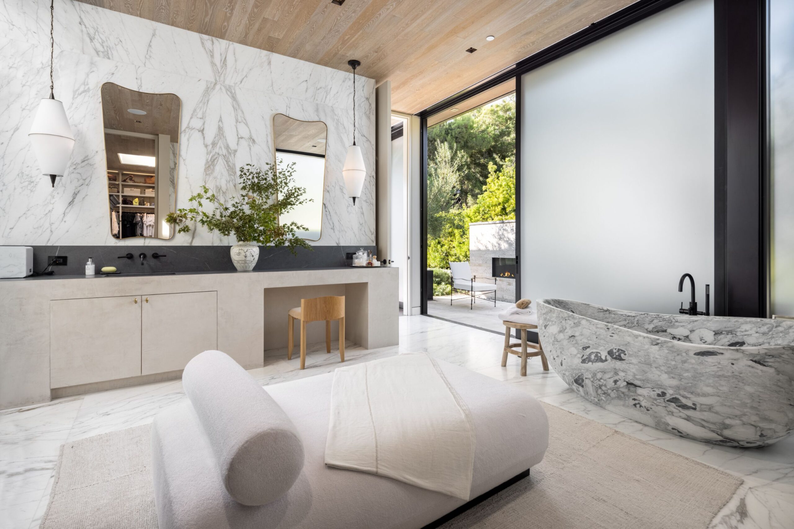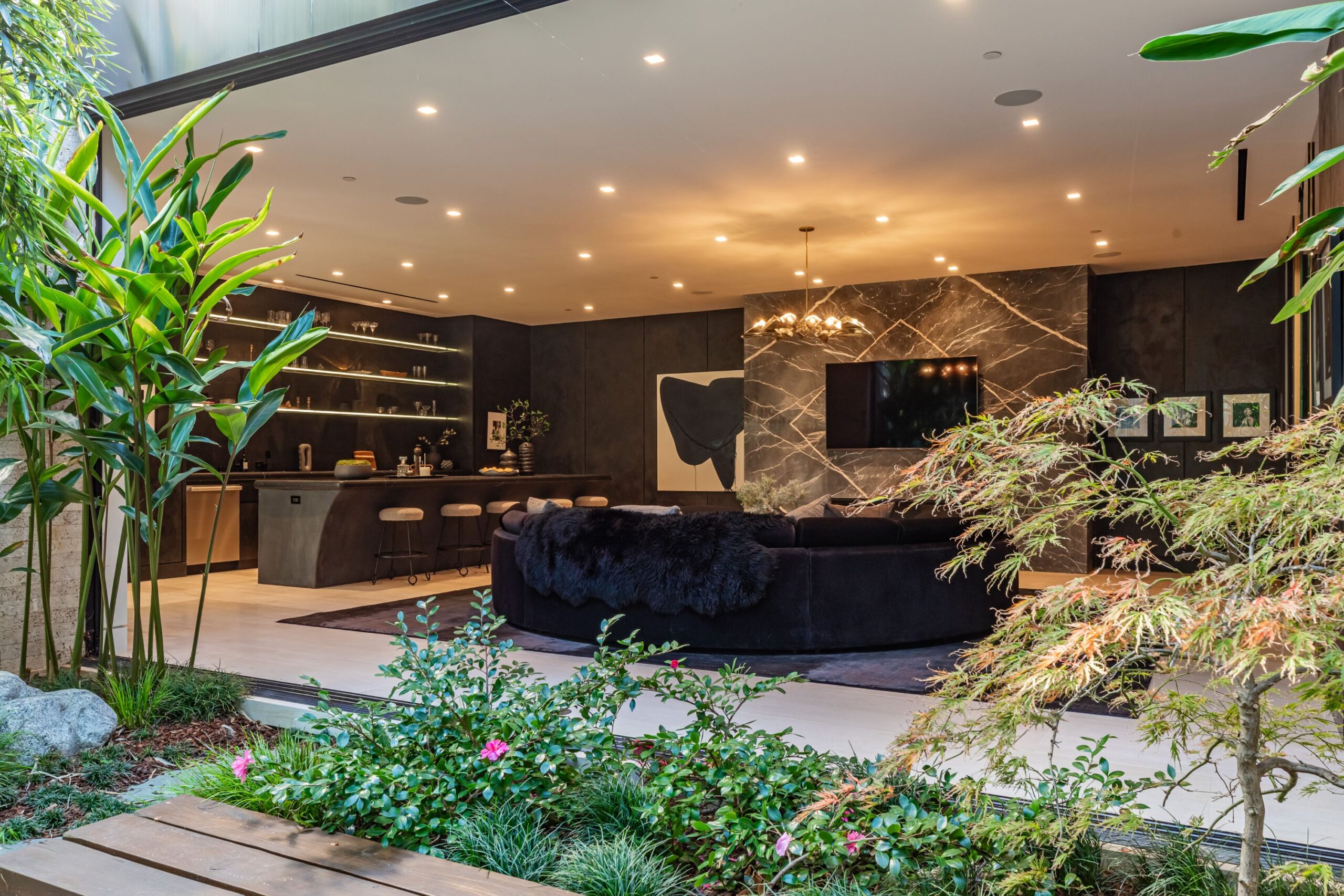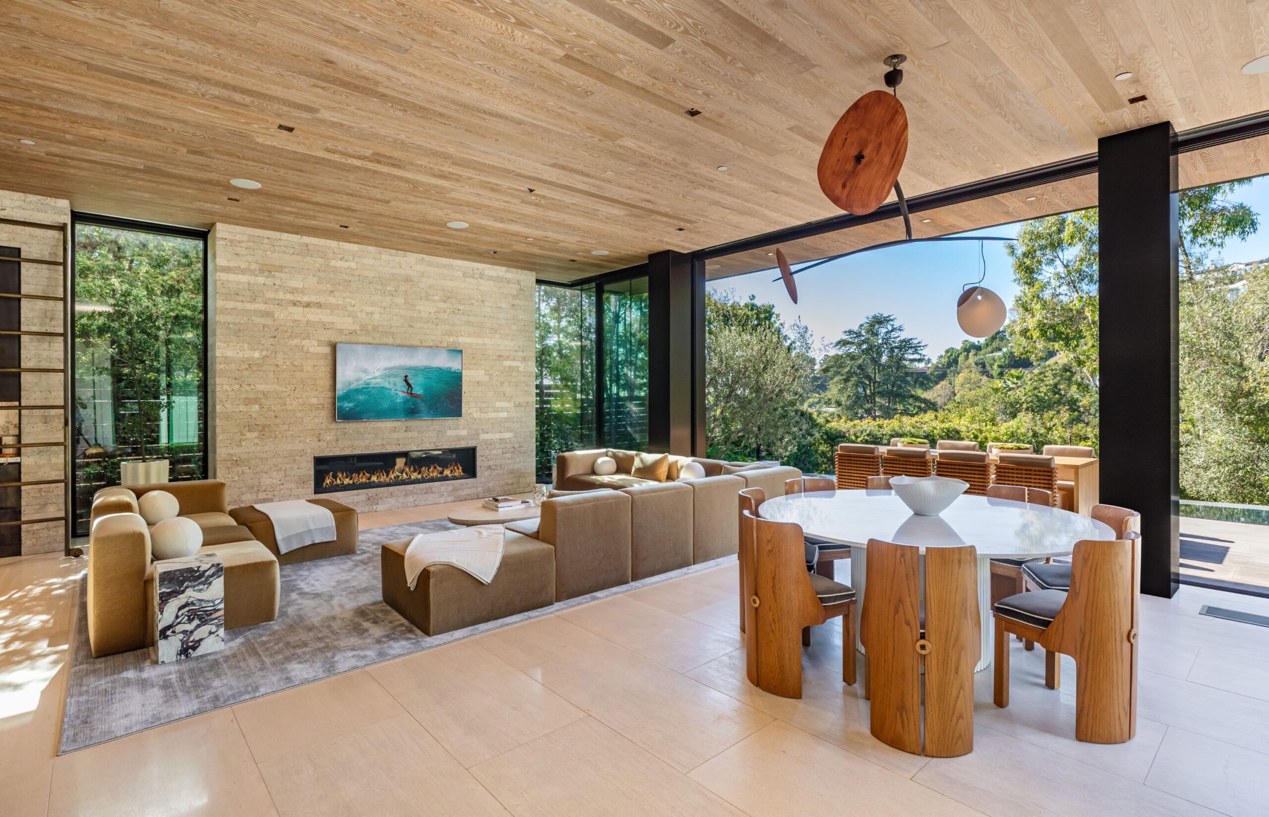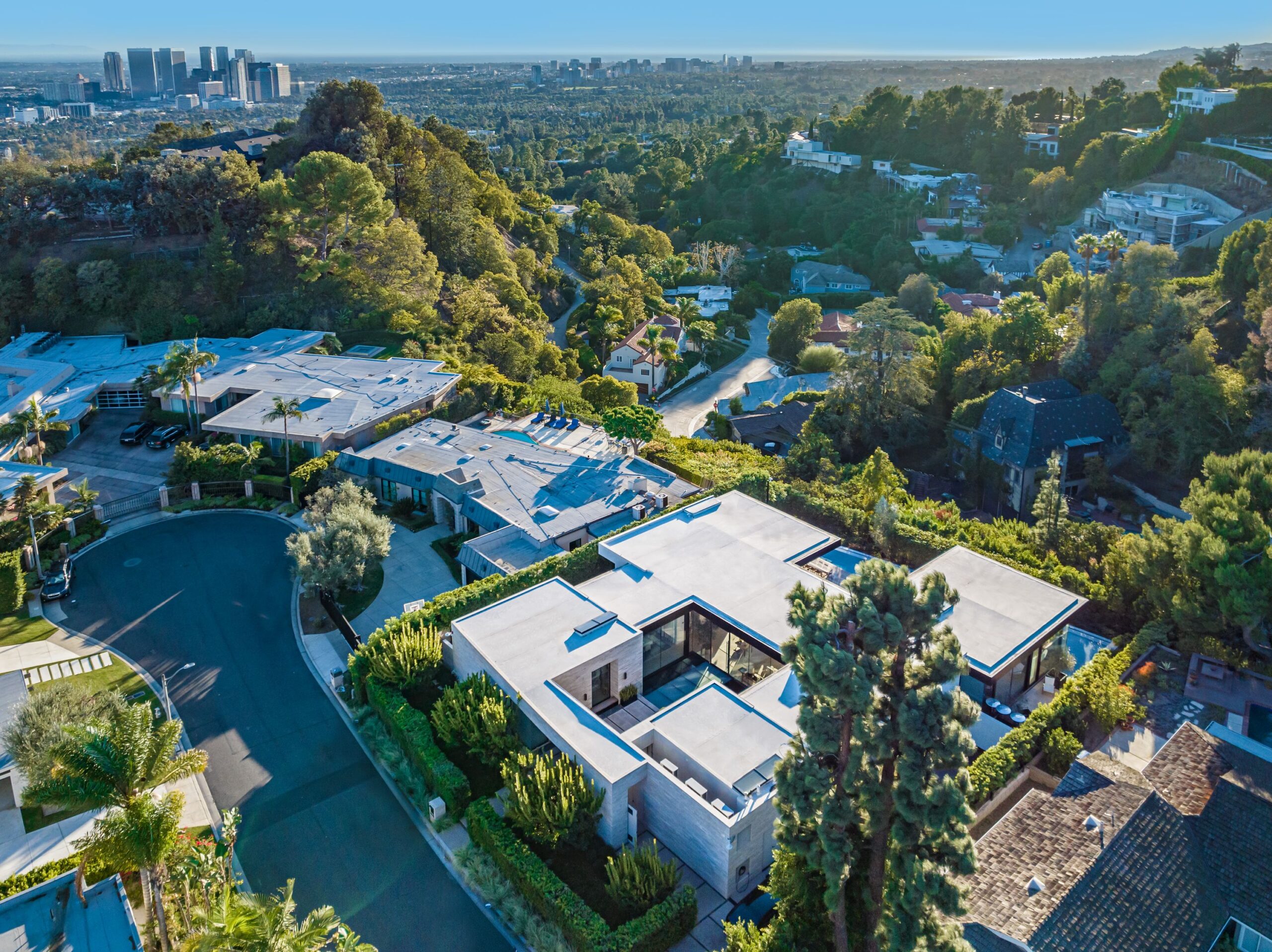 Discover world-class design and luxury in this organic contemporary Trousdale masterpiece crafted by award-winning architect Paul McClean and designer Lindsay Chambers and reimagined by Nate Berkus & Jeremiah Brent. Set on a prestigious, quiet cul-de-sac, this 11,000 SF home boasts an architectural exterior with custom Italian stonework. Mid-century-inspired steel grillwork surround the front door that opens to a showstopping glass bridge entrance. The two-story courtyard and walls of glass allow sunlight to fill the home and highlight the beautiful oak ceilings and Travertine walls. Glass walls open to a spectacular outdoor space featuring an expansive infinity pool with city and ocean views and a tranquil Japanese garden. The primary suite sits beside the pool as if it's floating above the water and offers a custom walk-in closet, and spa-like bathroom. Rejuvenate in the marble-clad indoor wellness center with hot and cold plunge, cedar sauna, and gym. Additional amenities include a stunning Nero Marquina-clad bar, home theater, subterranean auto gallery, and fairytale pink playroom. This architecturally significant home is a rare offering, even among the most discerning tastemakers in the city.