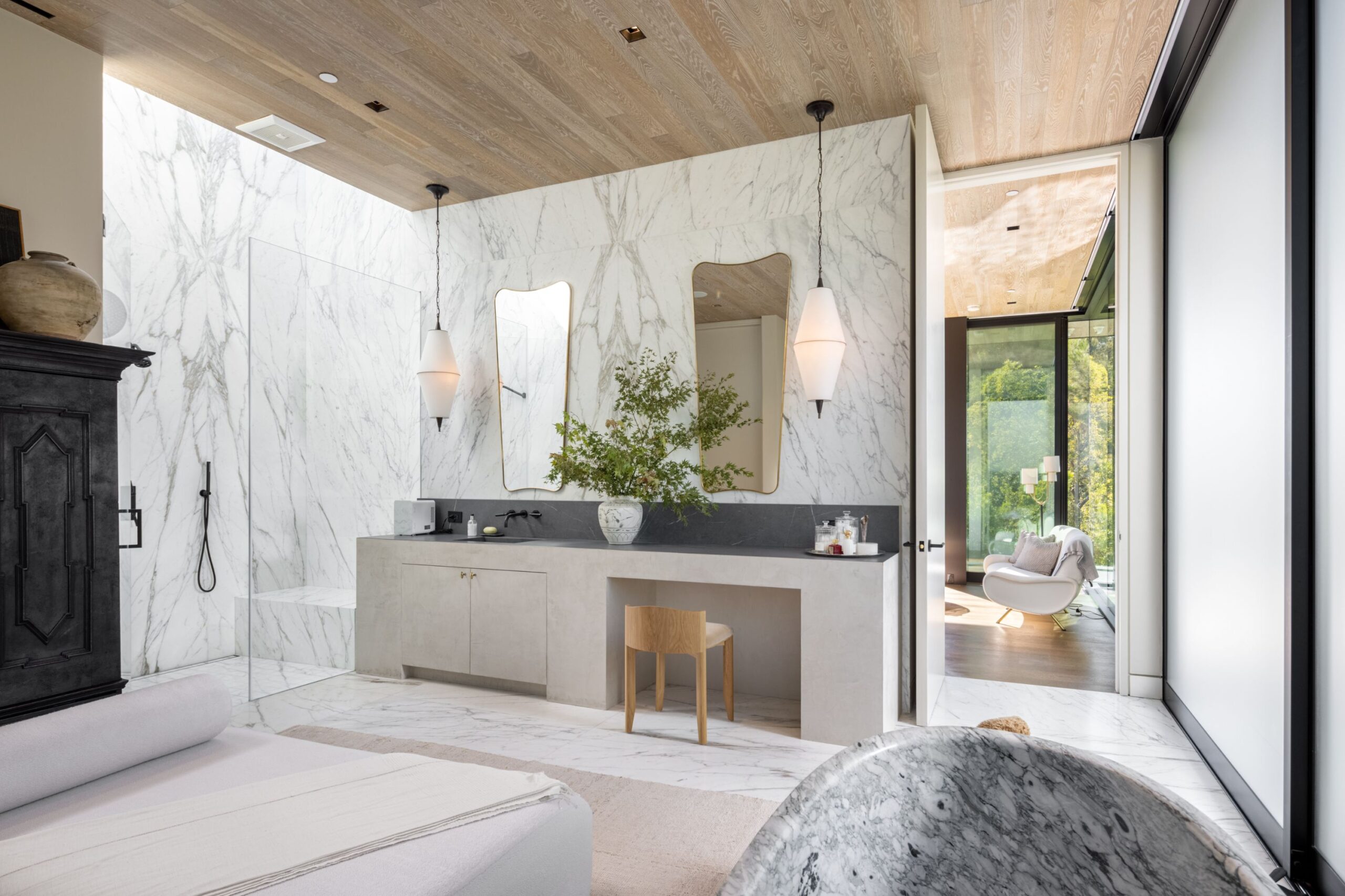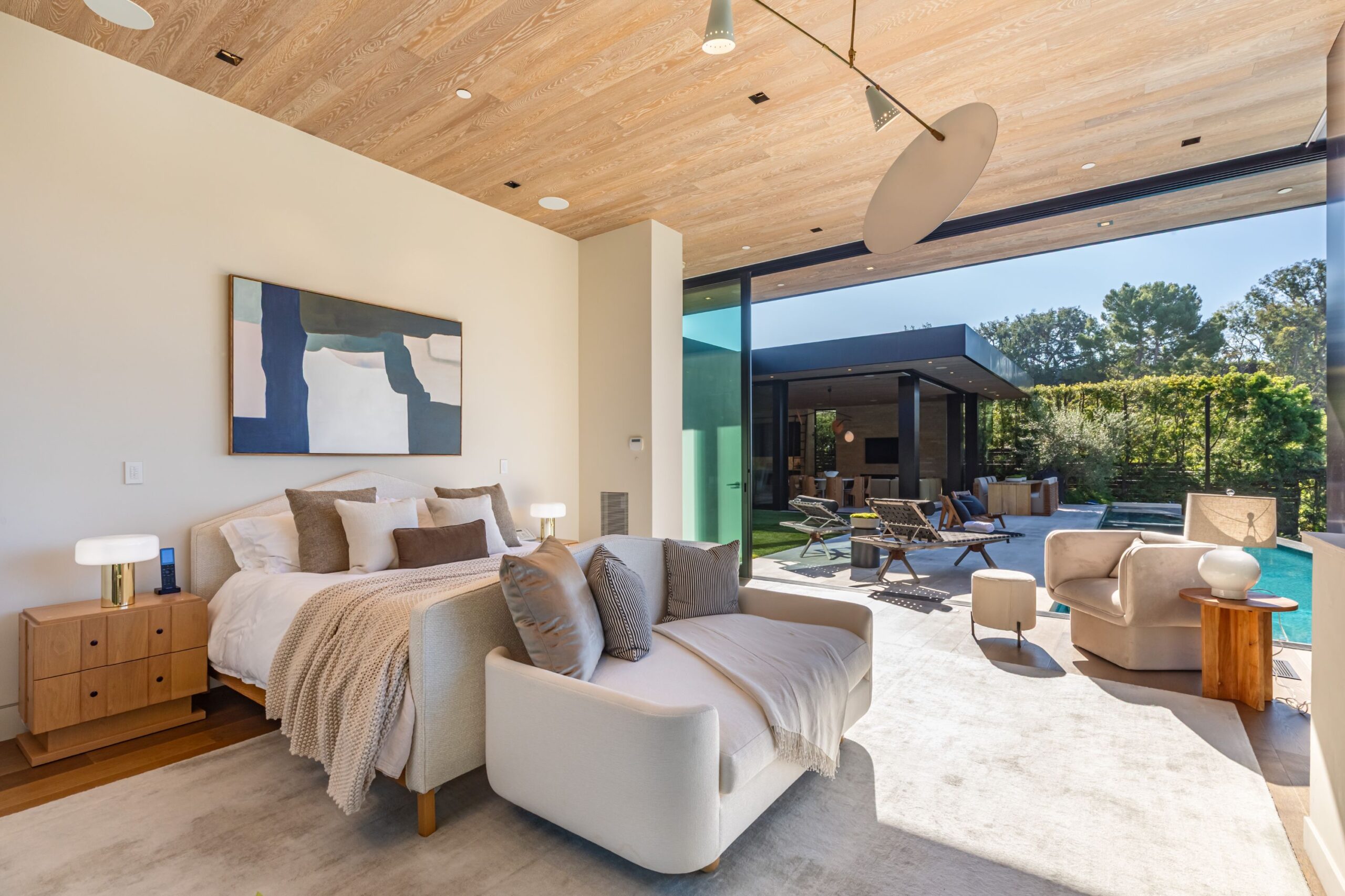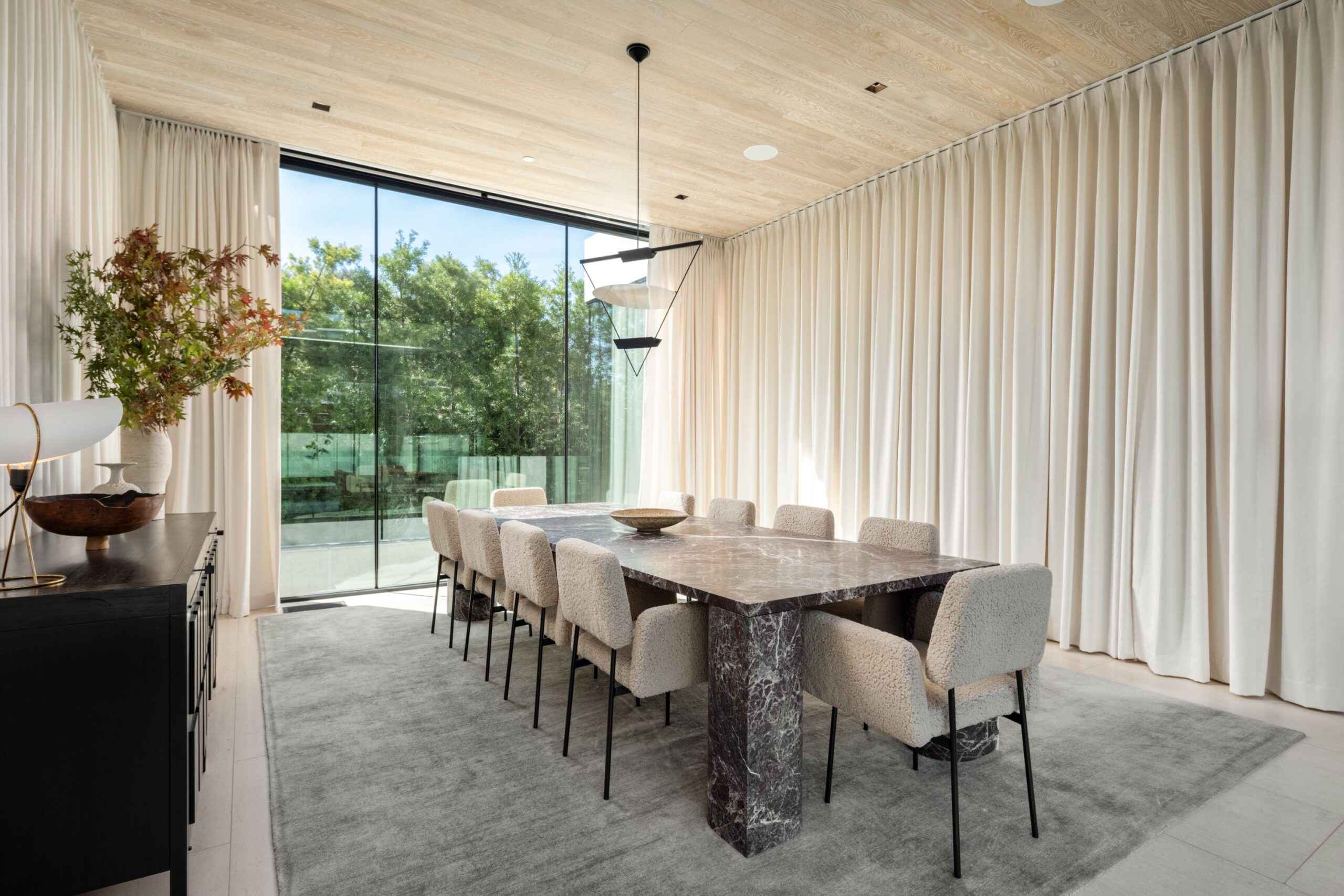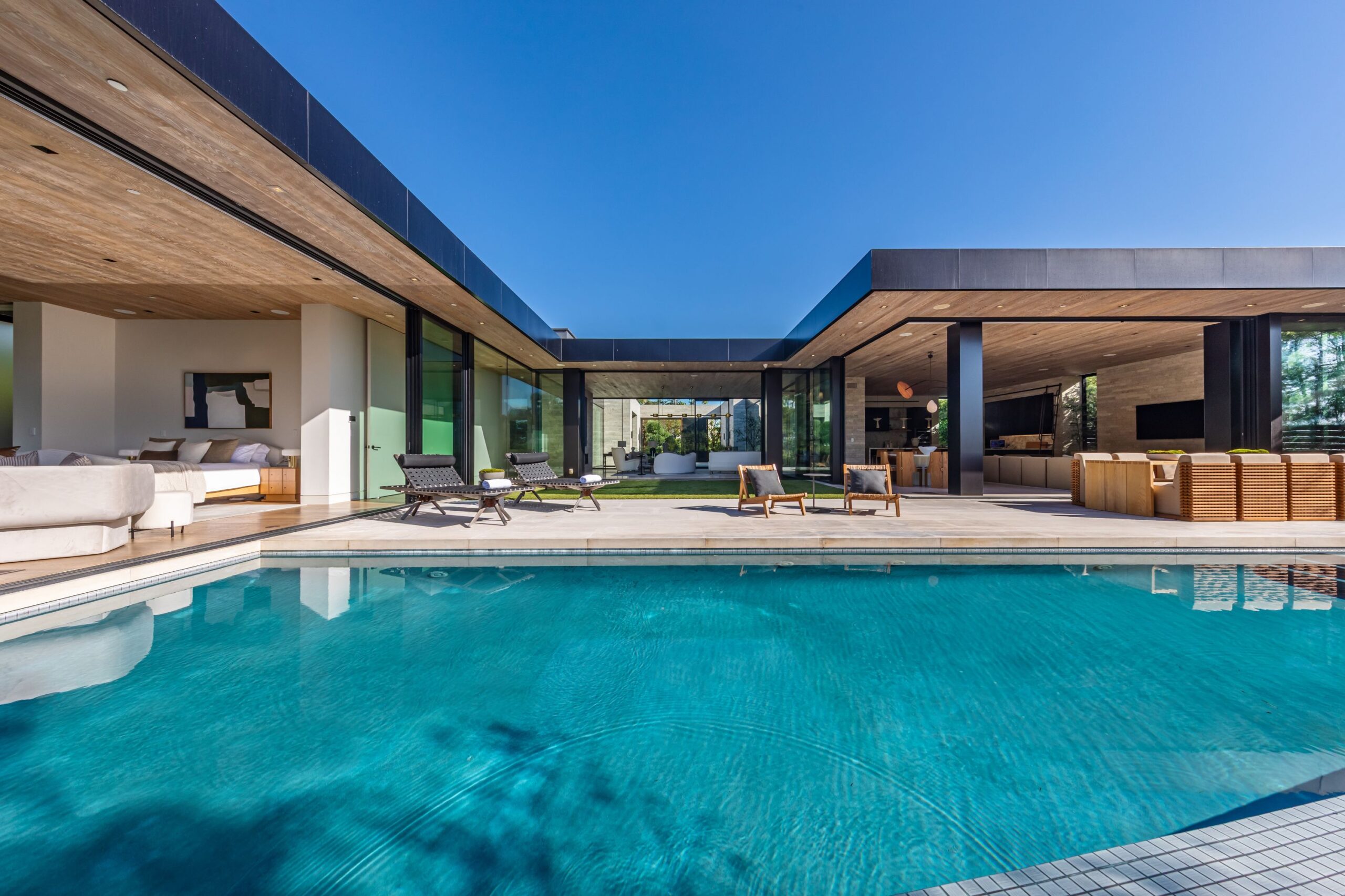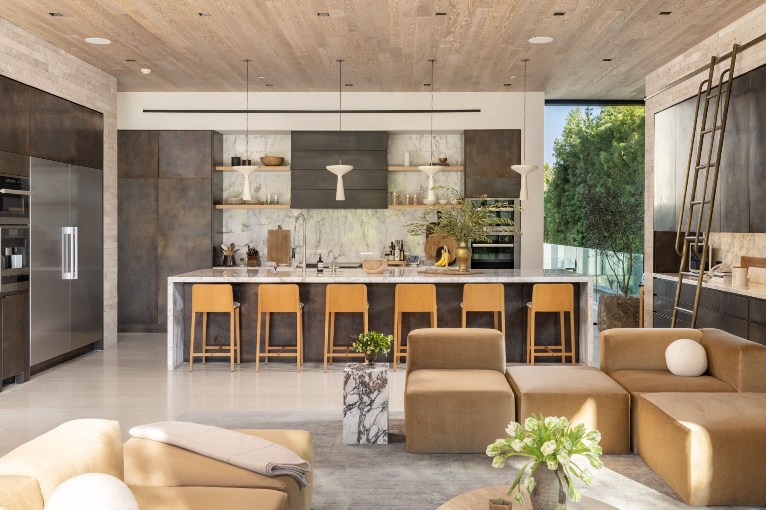Discover world-class design and luxury in this organic contemporary Trousdale masterpiece crafted by award-winning architect Paul McClean and designer Lindsay Chambers and reimagined by Nate Berkus & Jeremiah Brent. Set on a prestigious, quiet cul-de-sac, this 11,000 SF home boasts an architectural exterior with custom Italian stonework. Mid-century-inspired steel grillwork surround the front door that opens to a showstopping glass bridge entrance. The two-story courtyard and walls of glass allow sunlight to fill the home and highlight the beautiful oak ceilings and Travertine walls. Glass walls open to a spectacular outdoor space featuring an expansive infinity pool with city and ocean views and a tranquil Japanese garden. The primary suite sits beside the pool as if it's floating above the water and offers a custom walk-in closet, and spa-like bathroom. Rejuvenate in the marble-clad indoor wellness center with hot and cold plunge, cedar sauna, and gym. Additional amenities include a stunning Nero Marquina-clad bar, home theater, subterranean auto gallery, and fairytale pink playroom. This architecturally significant home is a rare offering, even among the most discerning tastemakers in the city.