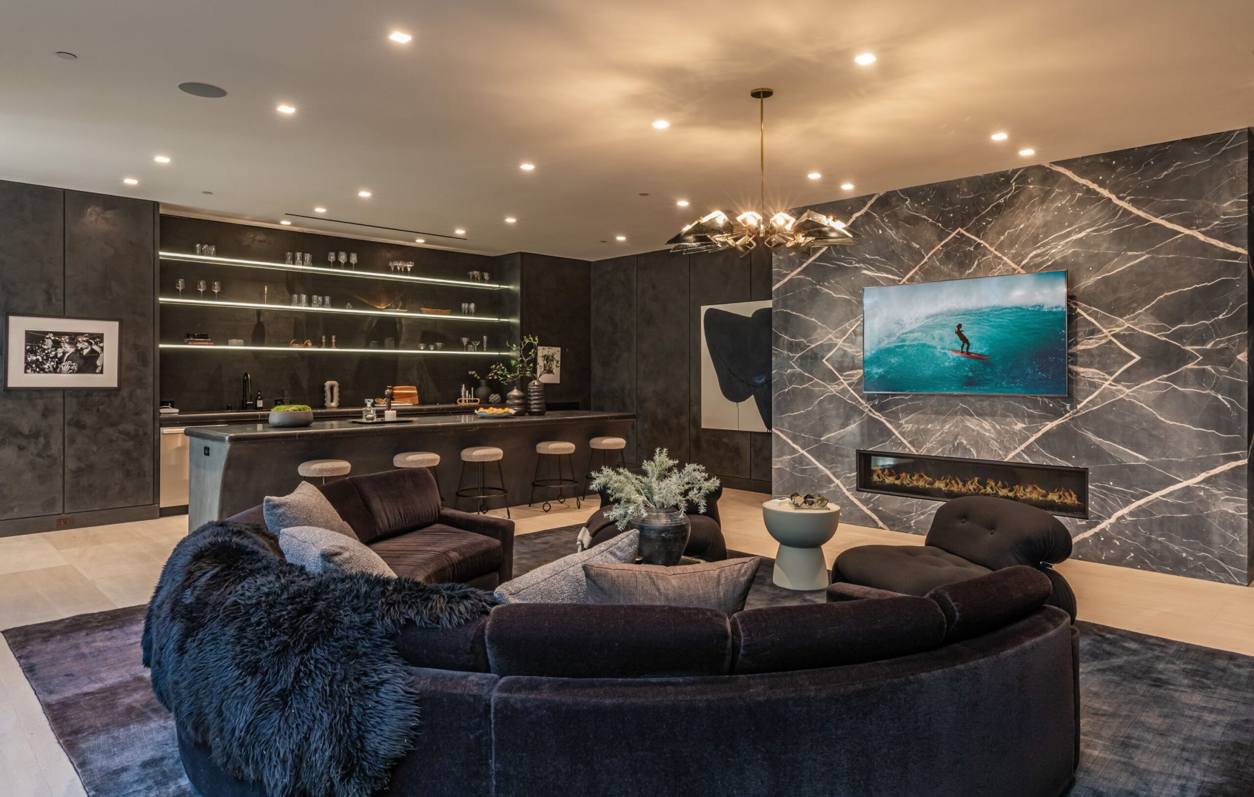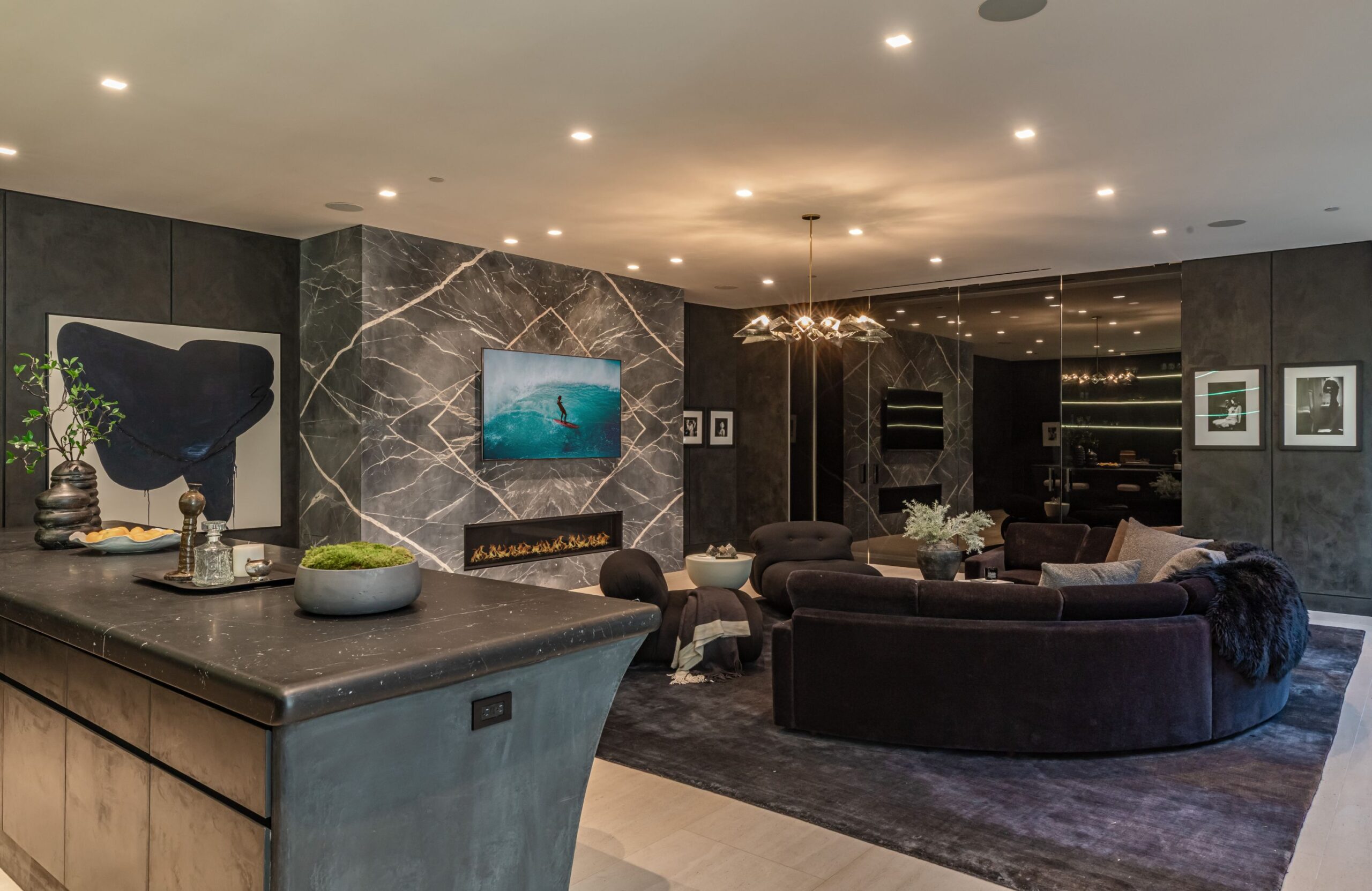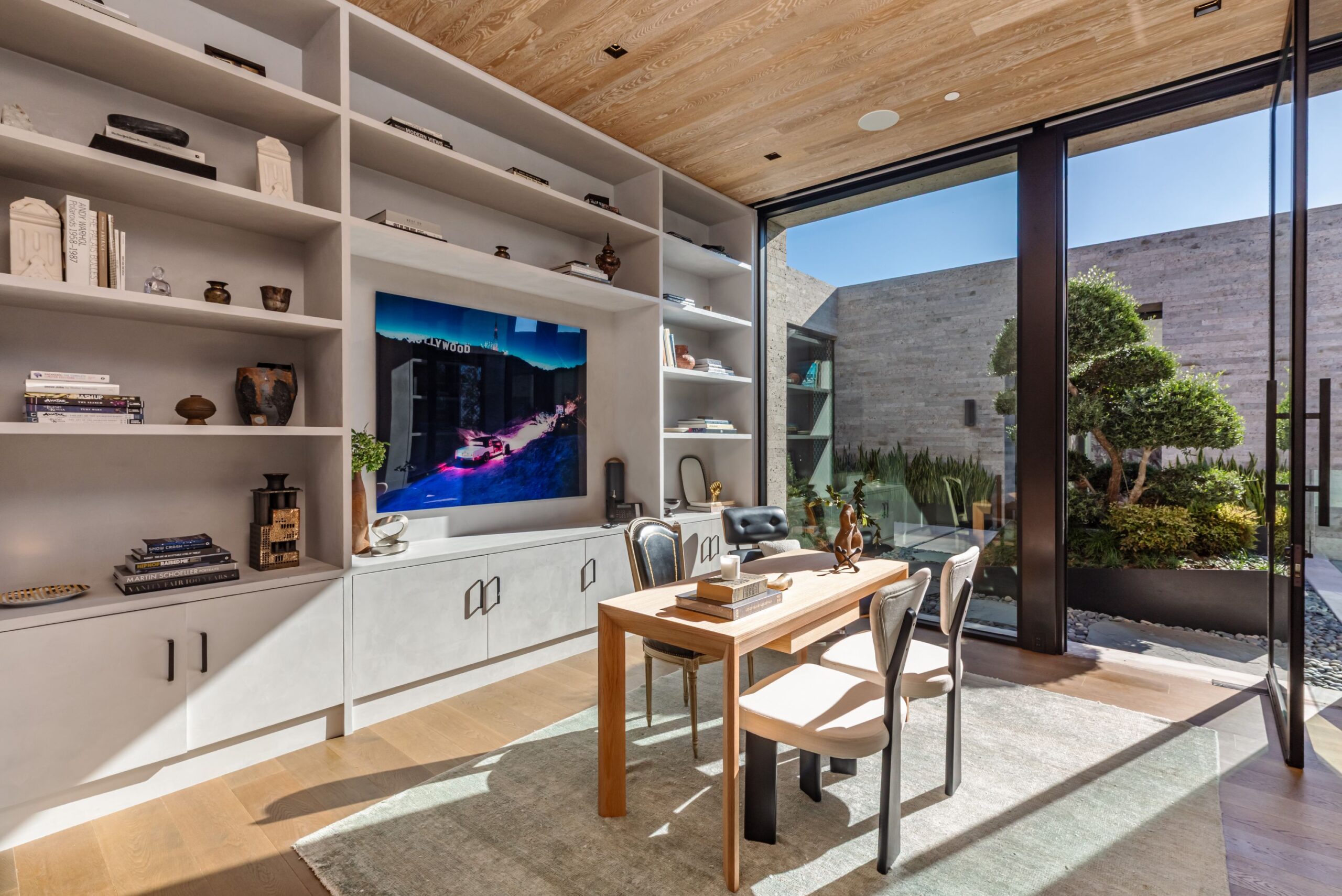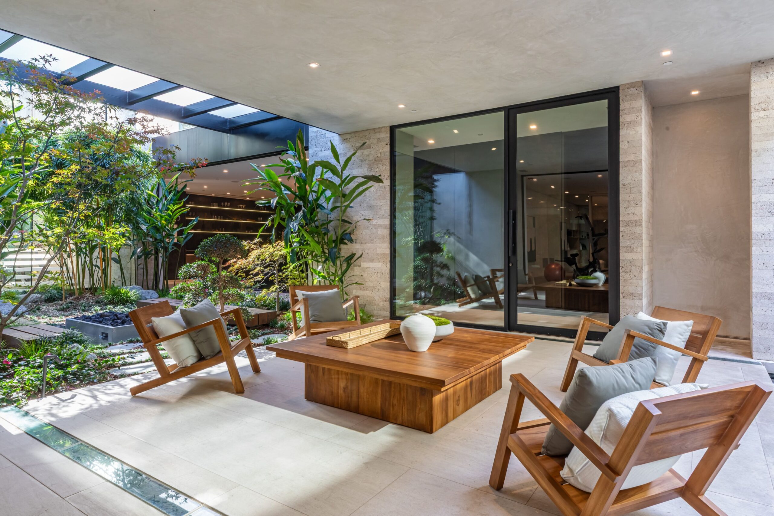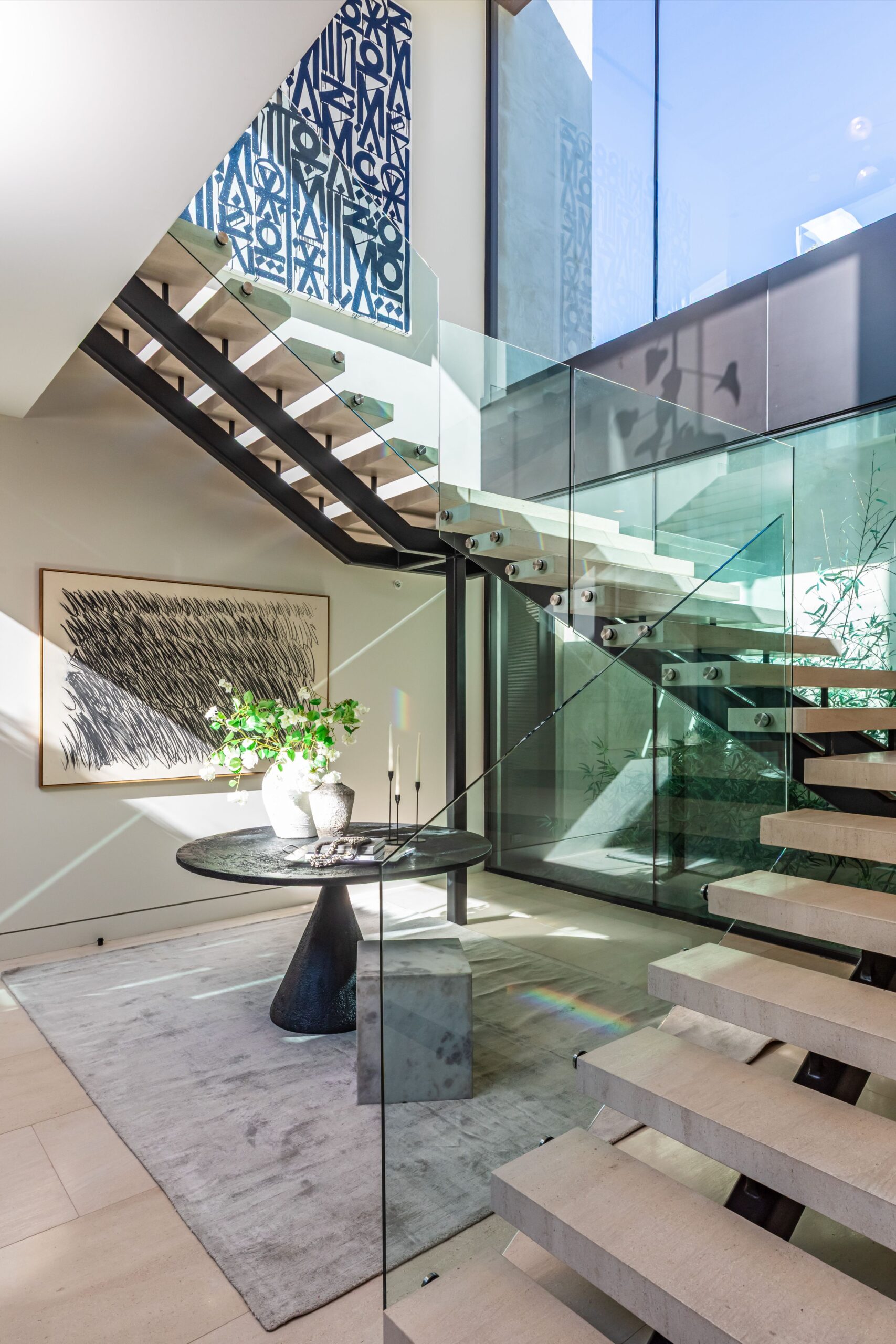 Discover world-class design and luxury in this organic contemporary Trousdale masterpiece crafted by award-winning architect Paul McClean and designer Lindsay Chambers and reimagined by Nate Berkus & Jeremiah Brent. Set on a prestigious, quiet cul-de-sac, this 11,000 SF home boasts an architectural exterior with custom Italian stonework. Mid-century-inspired steel grillwork surround the front door that opens to a showstopping glass bridge entrance. The two-story courtyard and walls of glass allow sunlight to fill the home and highlight the beautiful oak ceilings and Travertine walls. Glass walls open to a spectacular outdoor space featuring an expansive infinity pool with city and ocean views and a tranquil Japanese garden. The primary suite sits beside the pool as if it's floating above the water and offers a custom walk-in closet, and spa-like bathroom. Rejuvenate in the marble-clad indoor wellness center with hot and cold plunge, cedar sauna, and gym. Additional amenities include a stunning Nero Marquina-clad bar, home theater, subterranean auto gallery, and fairytale pink playroom. This architecturally significant home is a rare offering, even among the most discerning tastemakers in the city.