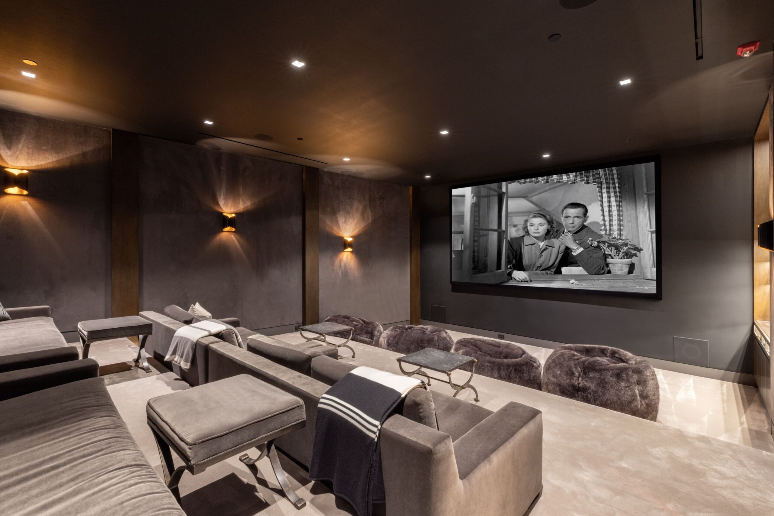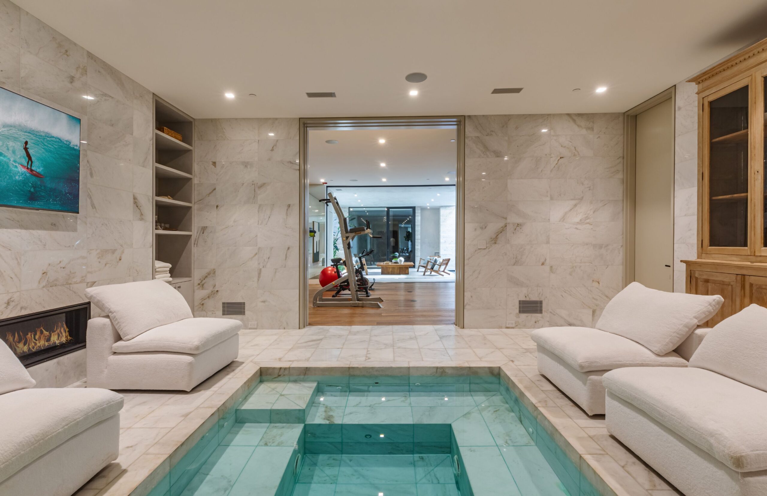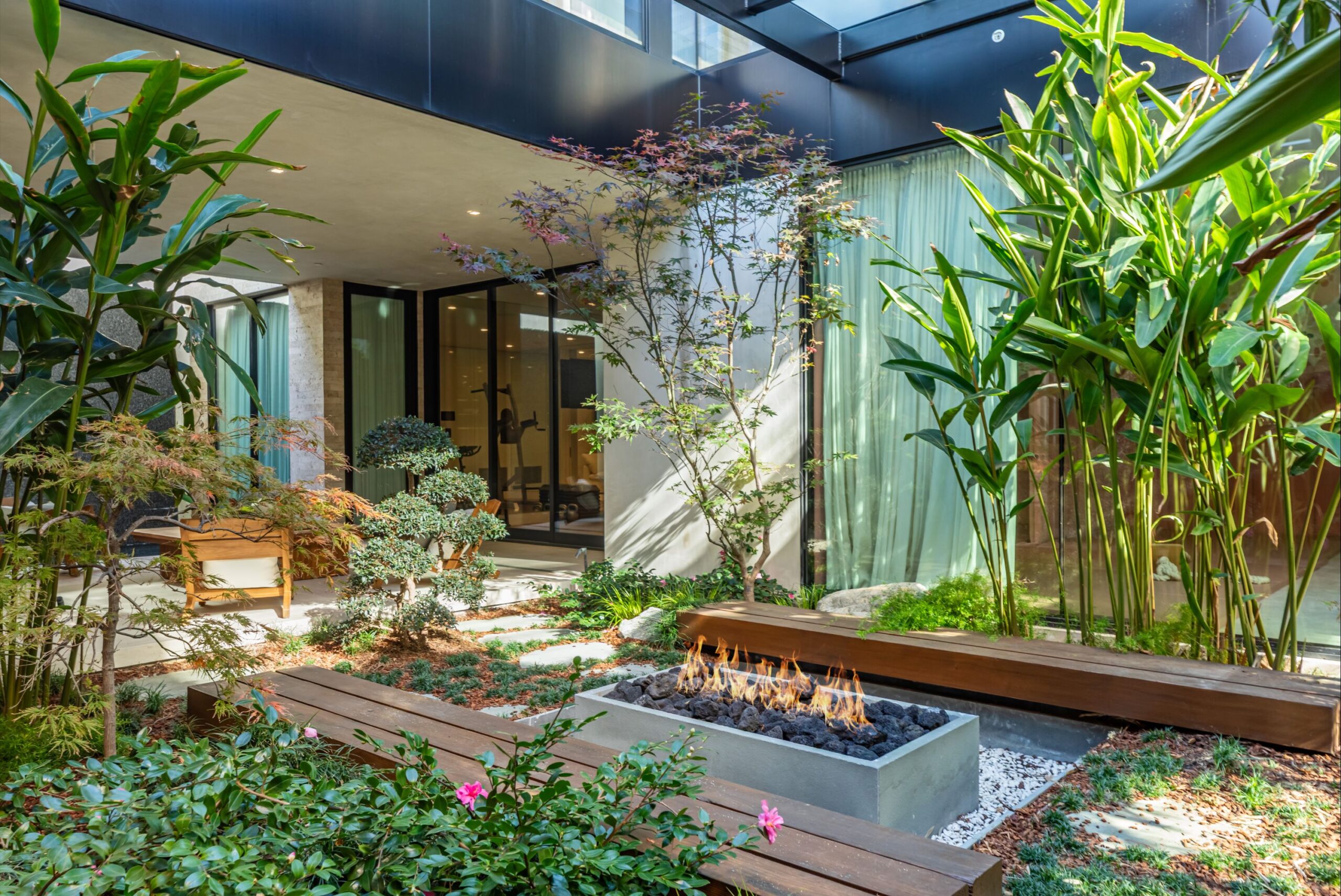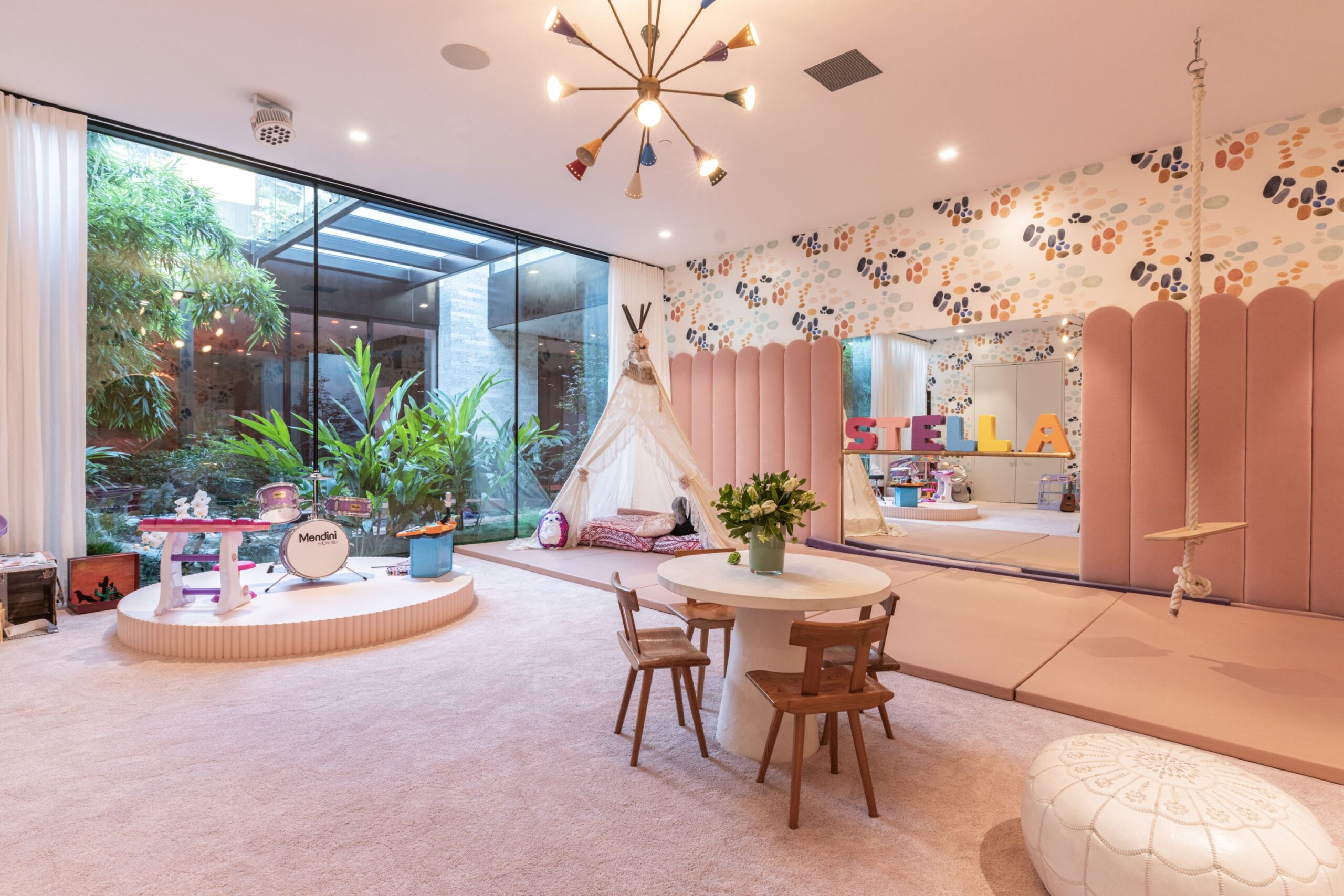 Discover world-class design and luxury in this organic contemporary Trousdale masterpiece crafted by award-winning architect Paul McClean and designer Lindsay Chambers and reimagined by Nate Berkus & Jeremiah Brent. Set on a prestigious, quiet cul-de-sac, this 11,000 SF home boasts an architectural exterior with custom Italian stonework. Mid-century-inspired steel grillwork surround the front door that opens to a showstopping glass bridge entrance. The two-story courtyard and walls of glass allow sunlight to fill the home and highlight the beautiful oak ceilings and Travertine walls. Glass walls open to a spectacular outdoor space featuring an expansive infinity pool with city and ocean views and a tranquil Japanese garden. The primary suite sits beside the pool as if it's floating above the water and offers a custom walk-in closet, and spa-like bathroom. Rejuvenate in the marble-clad indoor wellness center with hot and cold plunge, cedar sauna, and gym. Additional amenities include a stunning Nero Marquina-clad bar, home theater, subterranean auto gallery, and fairytale pink playroom. This architecturally significant home is a rare offering, even among the most discerning tastemakers in the city.