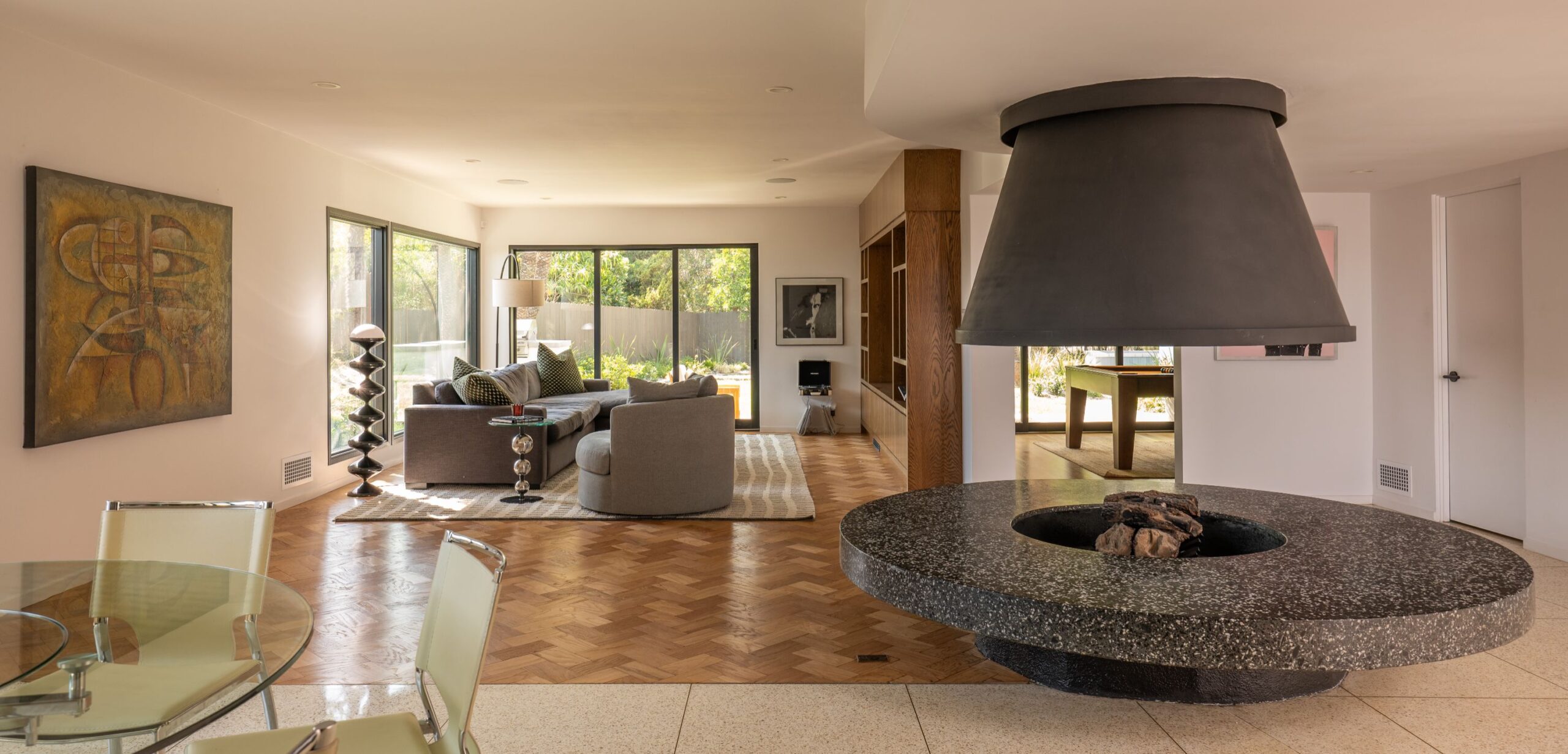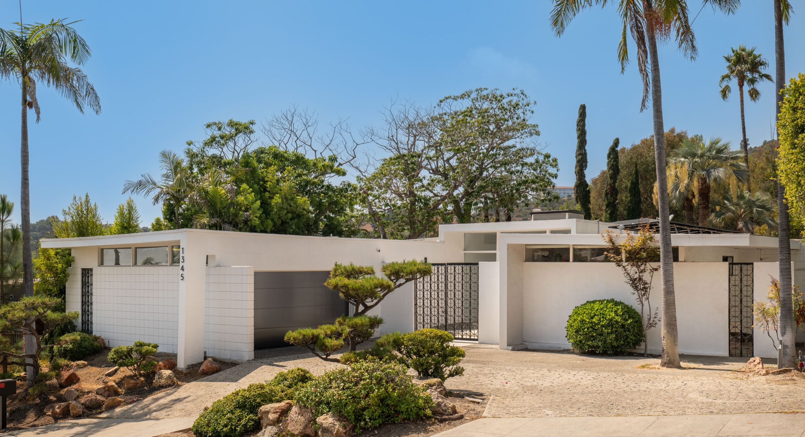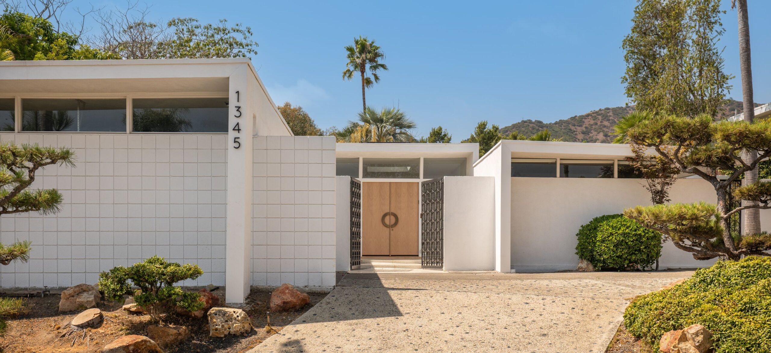 A CLASSIC LA TURN-KEY MID-CENTURY, RIVALING THE TIMELESS APPEAL OF THE ICONIC CASE STUDY HOMES. Set on an expansive three-quarter-acre west-facing lot, the single-story residence seamlessly marries breathtaking canyon views with an effortless indoor-outdoor lifestyle. The home has been thoughtfully reimagined for contemporary living while preserving its authentic mid-century soul. Original brass-bordered terrazzo floors and rich herringbone hardwood create a foundation of timeless elegance, while expansive walls of glass bathe the interiors in natural light and frame serene canyon vistas. A dramatic skylight adds another layer of illumination, and the iconic round black terrazzo fireplace serves as a striking focal point that anchors the living space. Spanning approximately 3,100 square feet, the residence offers four bedrooms and three-and-a-half bathrooms, complemented by thoughtful entertaining spaces. The spacious primary suite features a walk-in closet and a luxurious bathroom with a steam shower, creating a true spa-like retreat. The dining area includes a sleek wet bar perfect for hosting, while the family room showcases custom built-in cabinetry that seamlessly blends form and function. A dedicated game room and spacious mudroom/laundry complete the interior layout. The outdoor spaces are equally impressive, featuring a resort-style pool and spa, professional BBQ area, and expansive flat grassy yard - all designed for both intimate gatherings and grand-scale entertaining. A two-car garage with direct access and a circular motor court with ample parking. This is a rare, turnkey offering in prime Bel Air - an architectural gem where classic mid-century design meets modern luxury in a truly exceptional canyon setting.