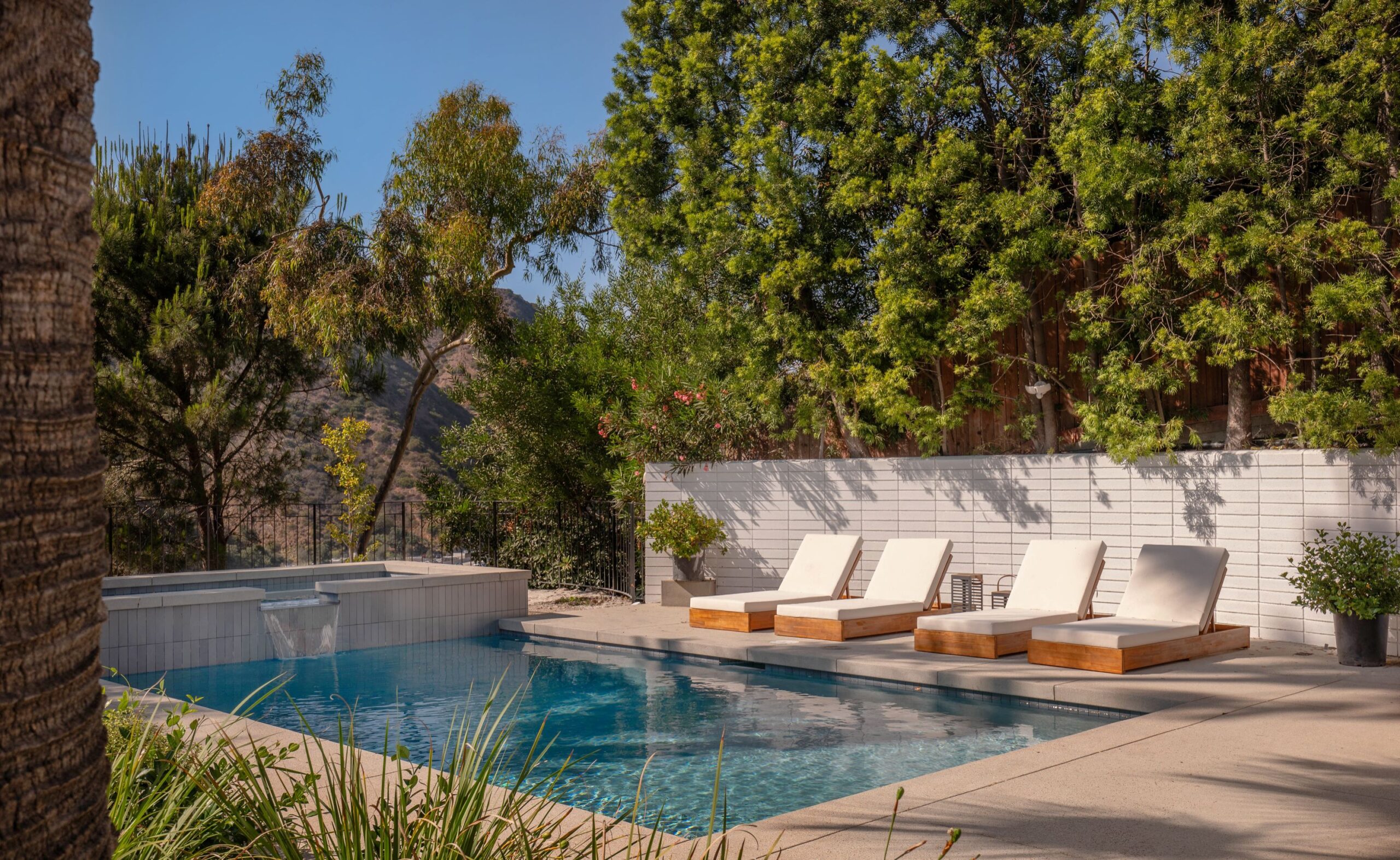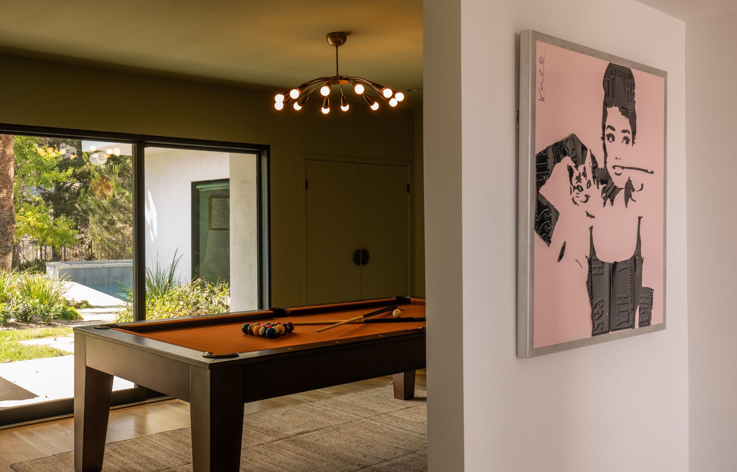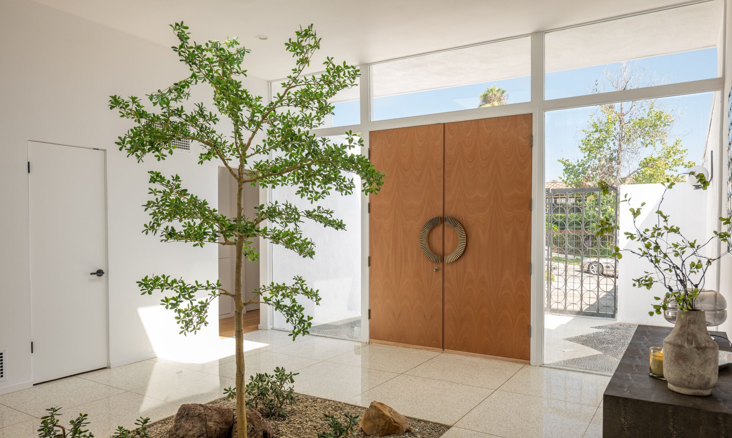 A CLASSIC LA TURN-KEY MID-CENTURY, RIVALING THE TIMELESS APPEAL OF THE ICONIC CASE STUDY HOMES. Set on an expansive three-quarter-acre west-facing lot, the single-story residence seamlessly marries breathtaking canyon views with an effortless indoor-outdoor lifestyle. The home has been thoughtfully reimagined for contemporary living while preserving its authentic mid-century soul. Original brass-bordered terrazzo floors and rich herringbone hardwood create a foundation of timeless elegance, while expansive walls of glass bathe the interiors in natural light and frame serene canyon vistas. A dramatic skylight adds another layer of illumination, and the iconic round black terrazzo fireplace serves as a striking focal point that anchors the living space. Spanning approximately 3,100 square feet, the residence offers four bedrooms and three-and-a-half bathrooms, complemented by thoughtful entertaining spaces. The spacious primary suite features a walk-in closet and a luxurious bathroom with a steam shower, creating a true spa-like retreat. The dining area includes a sleek wet bar perfect for hosting, while the family room showcases custom built-in cabinetry that seamlessly blends form and function. A dedicated game room and spacious mudroom/laundry complete the interior layout. The outdoor spaces are equally impressive, featuring a resort-style pool and spa, professional BBQ area, and expansive flat grassy yard - all designed for both intimate gatherings and grand-scale entertaining. A two-car garage with direct access and a circular motor court with ample parking. This is a rare, turnkey offering in prime Bel Air - an architectural gem where classic mid-century design meets modern luxury in a truly exceptional canyon setting.