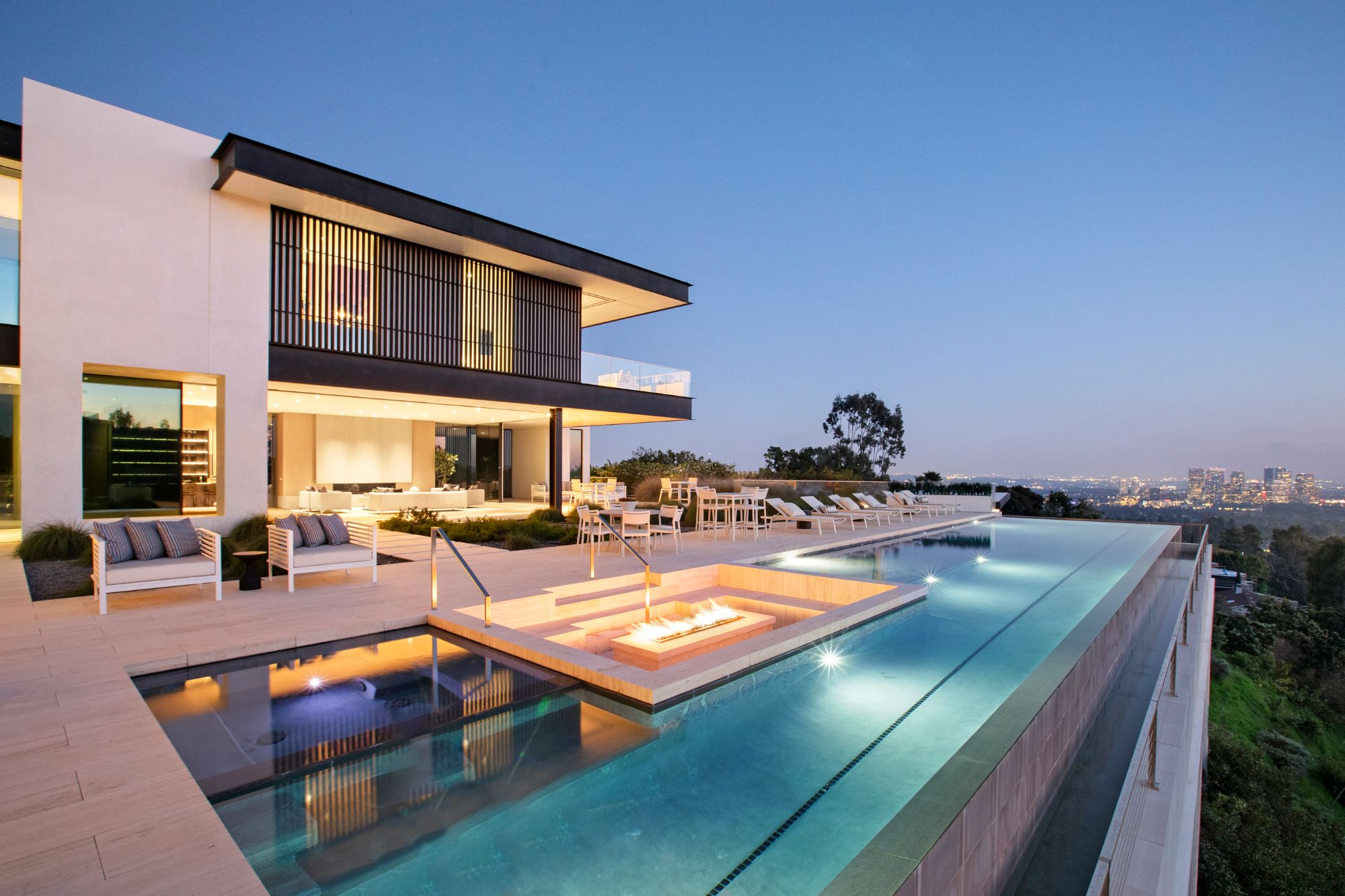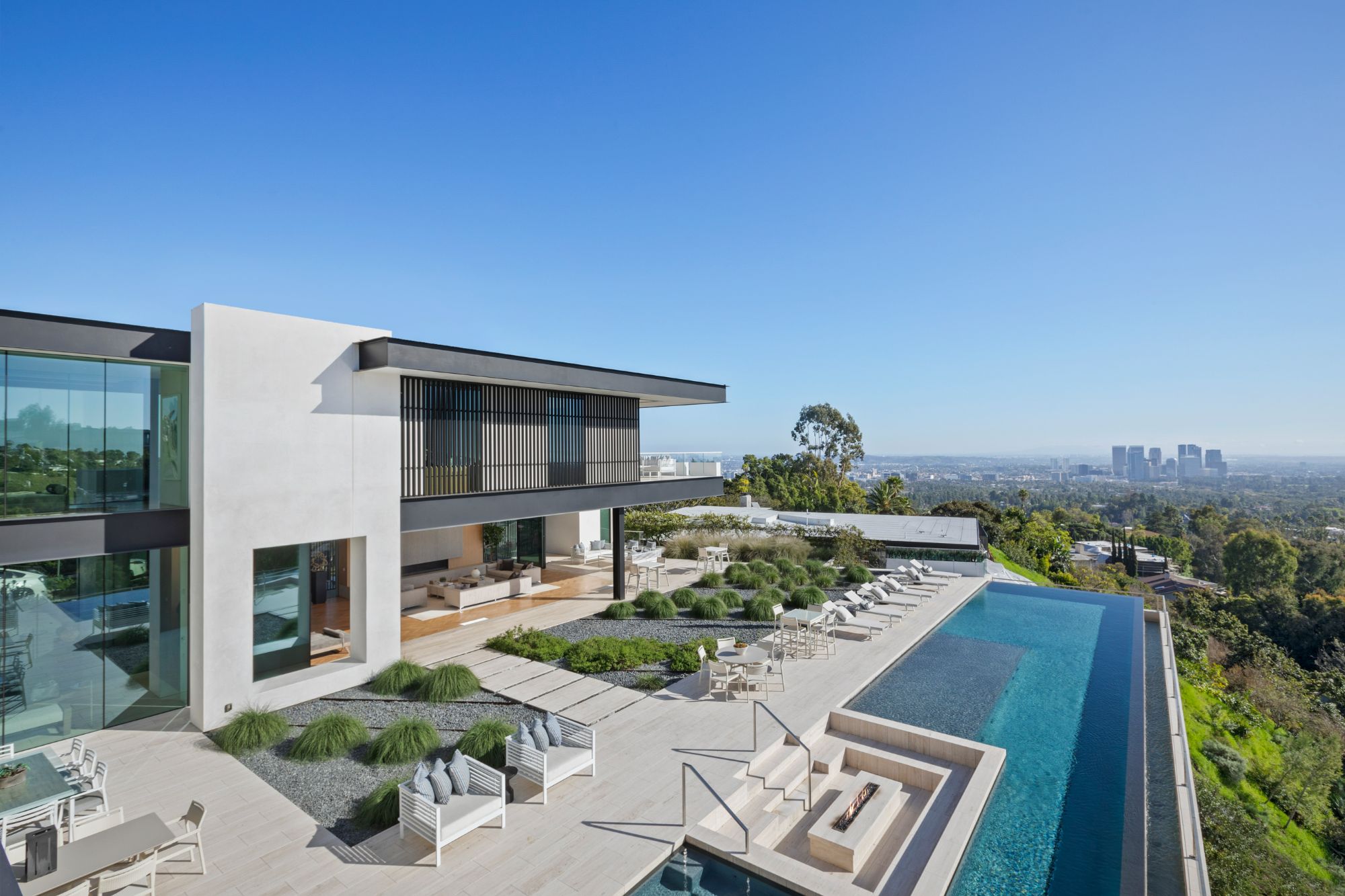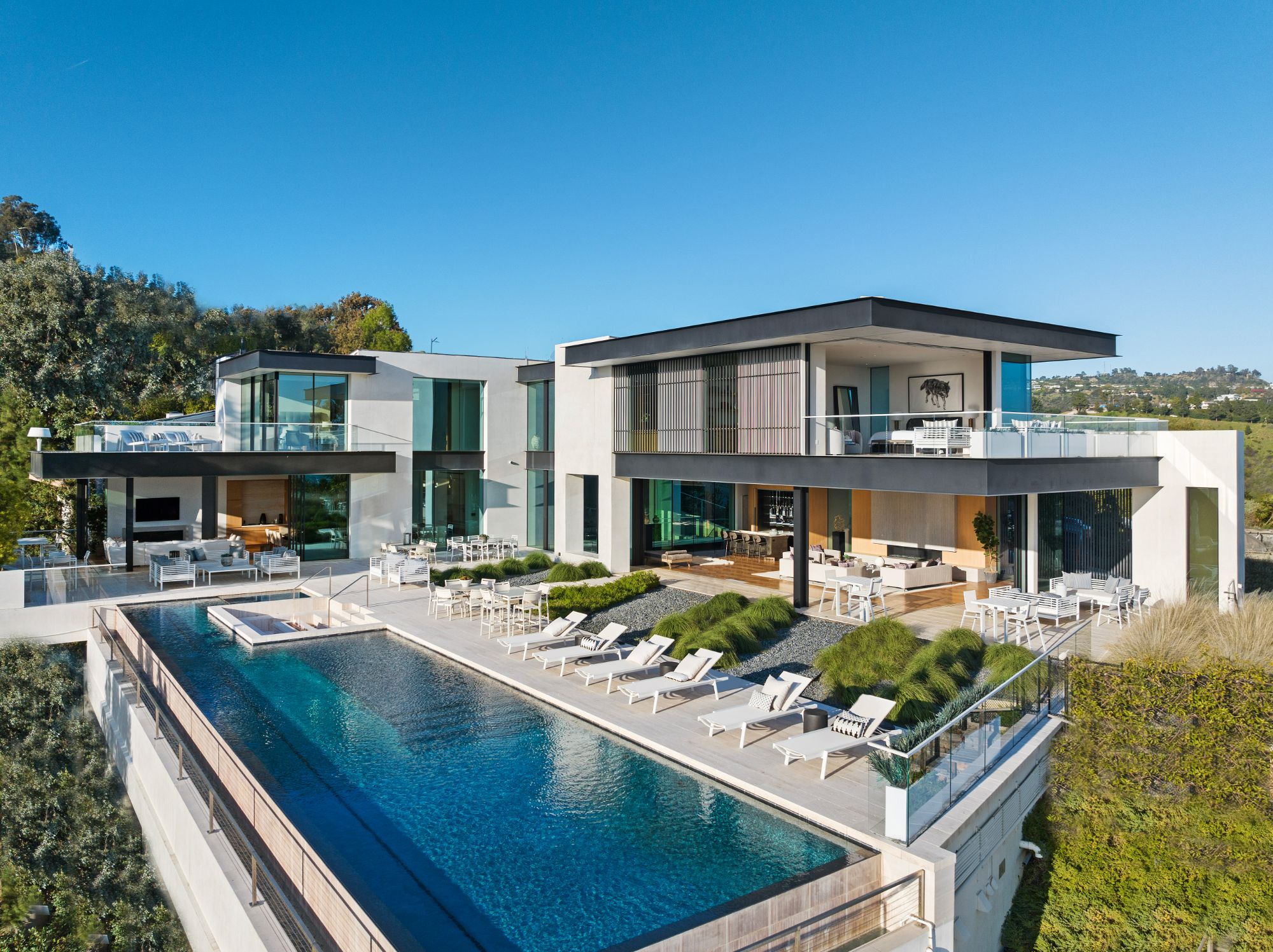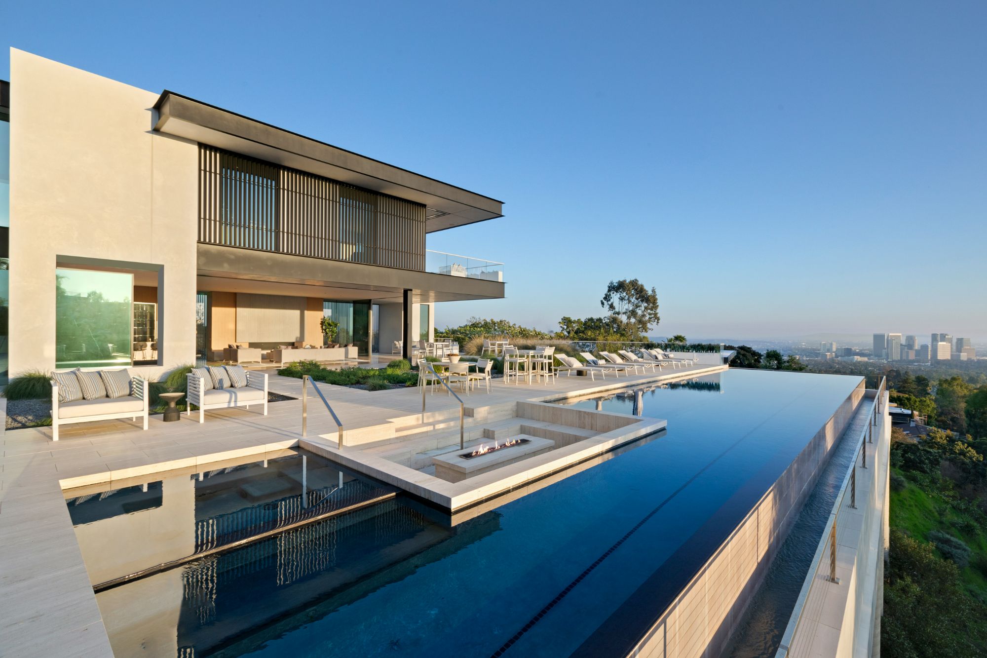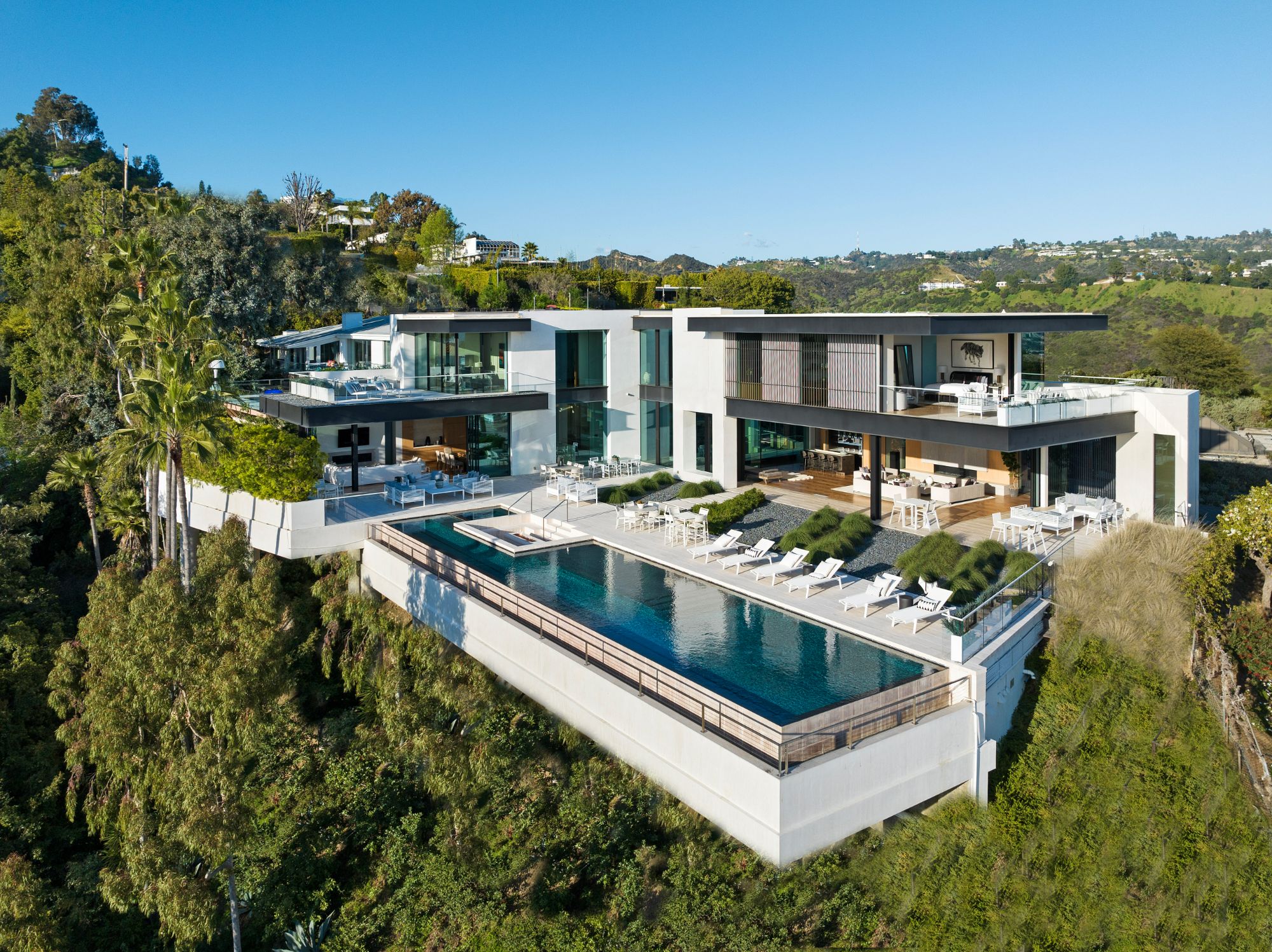 Discover contemporary elegance in this modern estate by McClean Design. A bridge, overlooking a lounge area with waterfall and living wall, welcomes you to this approx. 11,225 SF home. The formal living room features a beautiful herringbone floor, custom bar, fireplace, and walls of glass that showcase the view and open to create an unforgettable indoor/outdoor living experience. The gourmet kitchen offers top-of-the-line appliances, massive dual islands, and seamlessly blends into the dining room and secondary living room. Boasting 5 bedrooms and 9 bathrooms, this home offers ample space for family, friends, and guests. The spacious primary suite offers walk-in closet, spa-like bathroom, sitting area with fireplace, and glass walls that open to a private balcony overlooking the City of Angels. The daylit lower-level amenities include a fitness studio with sauna, a bar with walk-in wine cellar, billiards table, and movie theater. The beautifully landscaped outdoor oasis offers a large deck for dining al fresco, multiple seating areas, sunken fire pit, pool with spa, and sweeping views. Experience the pinnacle of luxury living in Beverly Hills.