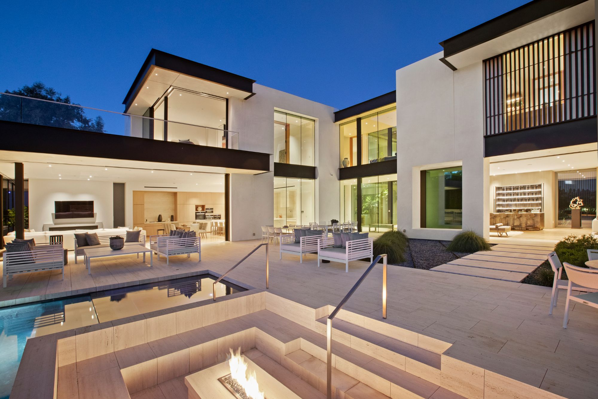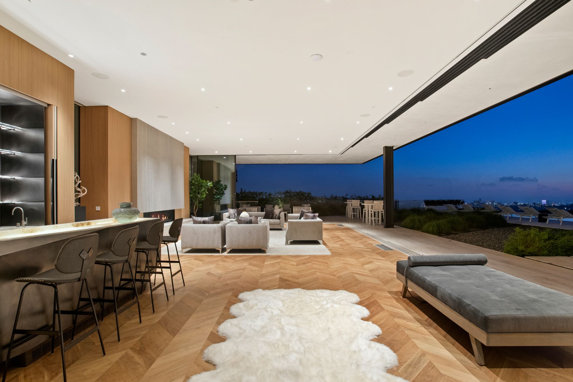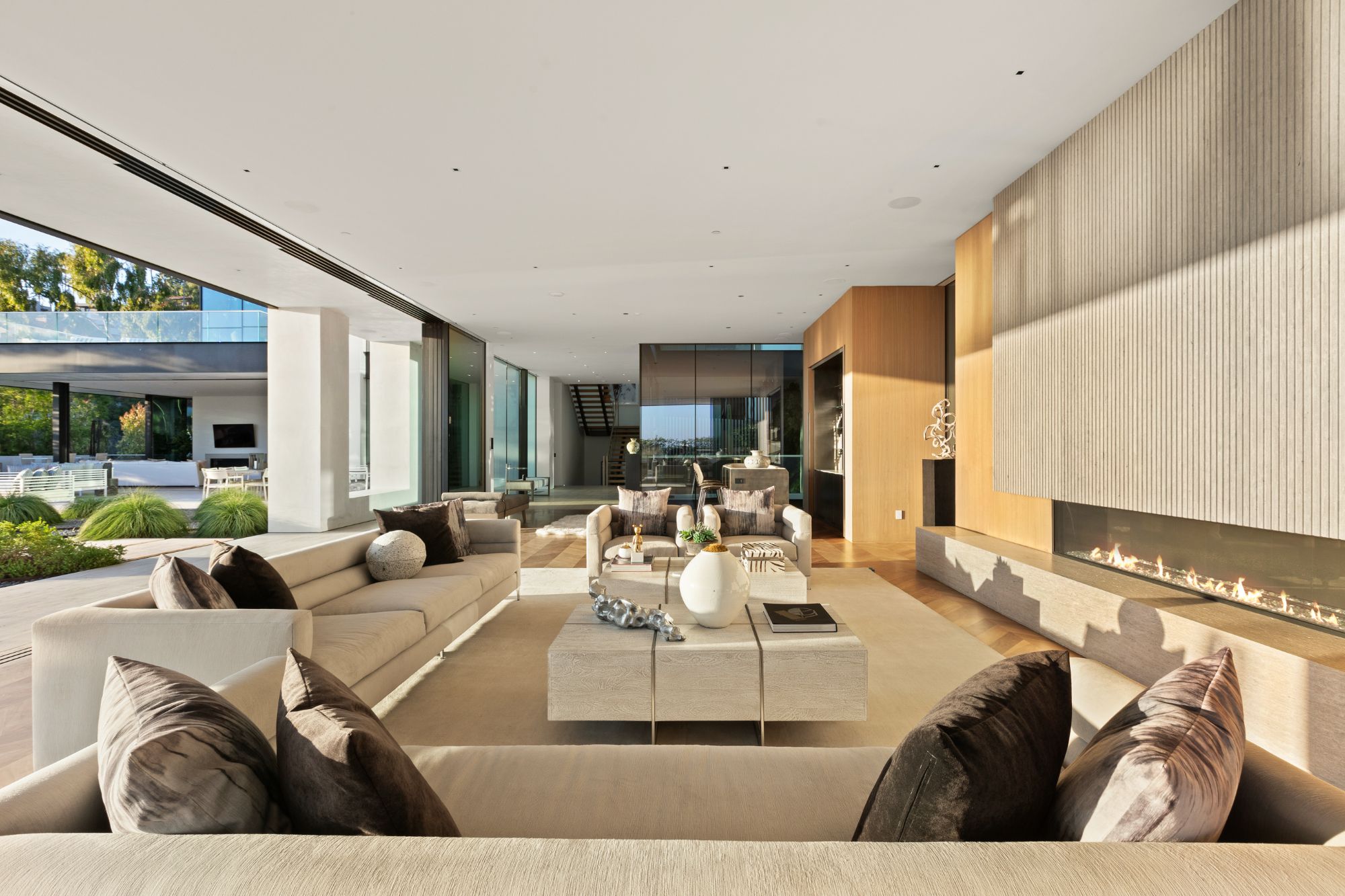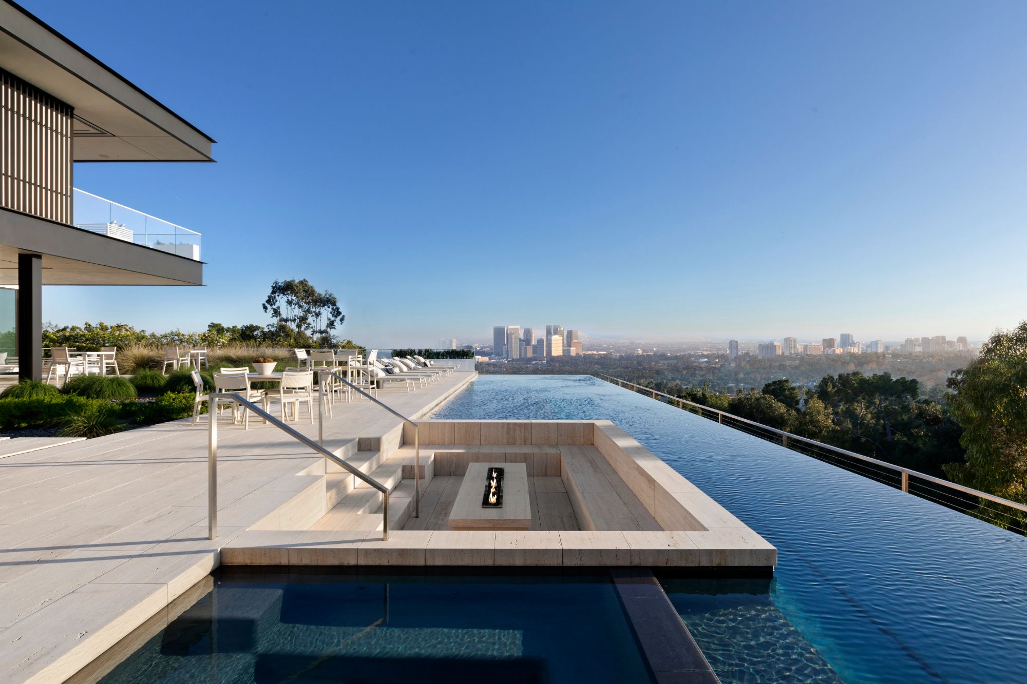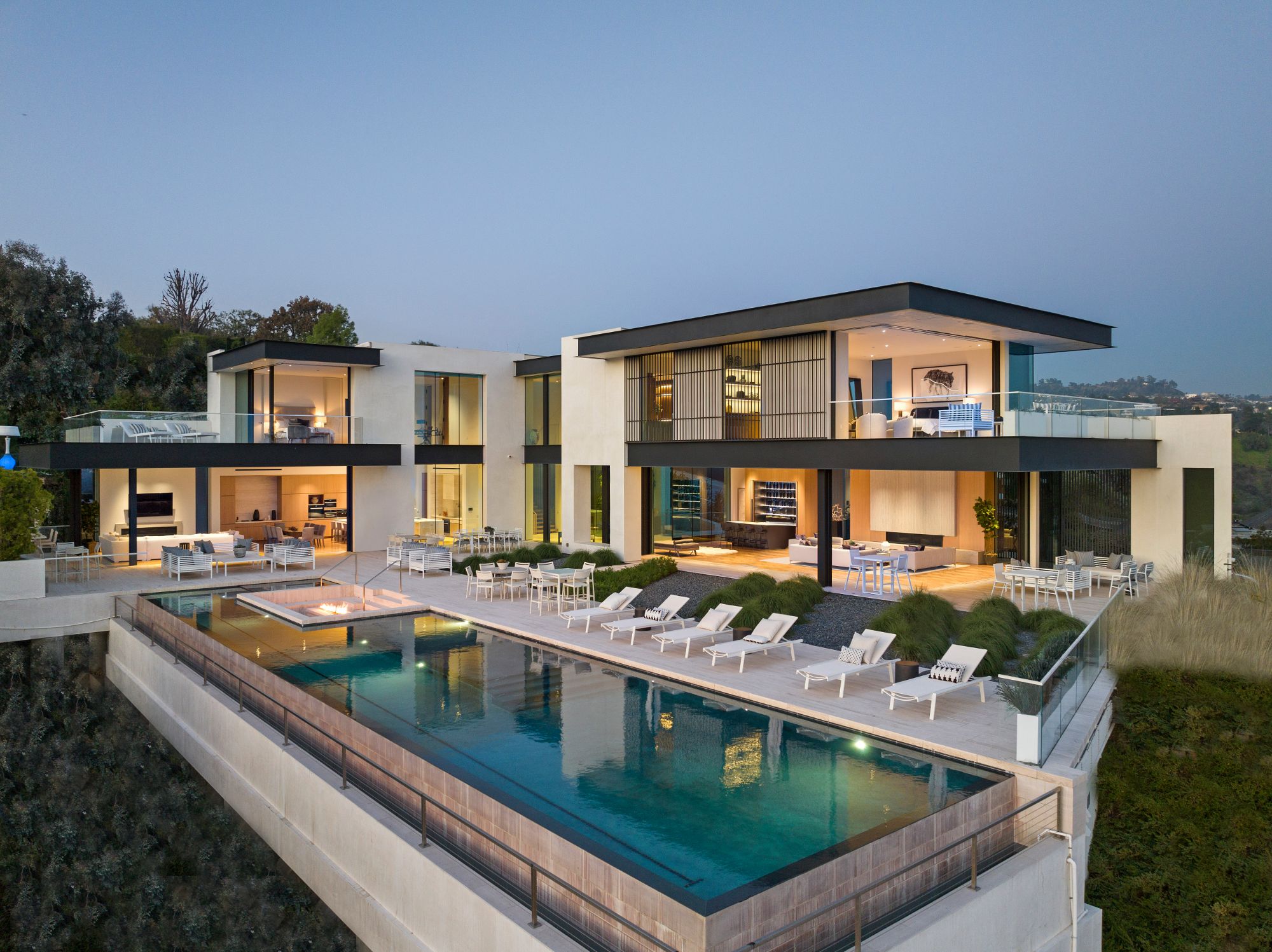 Discover contemporary elegance in this modern estate by McClean Design. A bridge, overlooking a lounge area with waterfall and living wall, welcomes you to this approx. 11,225 SF home. The formal living room features a beautiful herringbone floor, custom bar, fireplace, and walls of glass that showcase the view and open to create an unforgettable indoor/outdoor living experience. The gourmet kitchen offers top-of-the-line appliances, massive dual islands, and seamlessly blends into the dining room and secondary living room. Boasting 5 bedrooms and 9 bathrooms, this home offers ample space for family, friends, and guests. The spacious primary suite offers walk-in closet, spa-like bathroom, sitting area with fireplace, and glass walls that open to a private balcony overlooking the City of Angels. The daylit lower-level amenities include a fitness studio with sauna, a bar with walk-in wine cellar, billiards table, and movie theater. The beautifully landscaped outdoor oasis offers a large deck for dining al fresco, multiple seating areas, sunken fire pit, pool with spa, and sweeping views. Experience the pinnacle of luxury living in Beverly Hills.