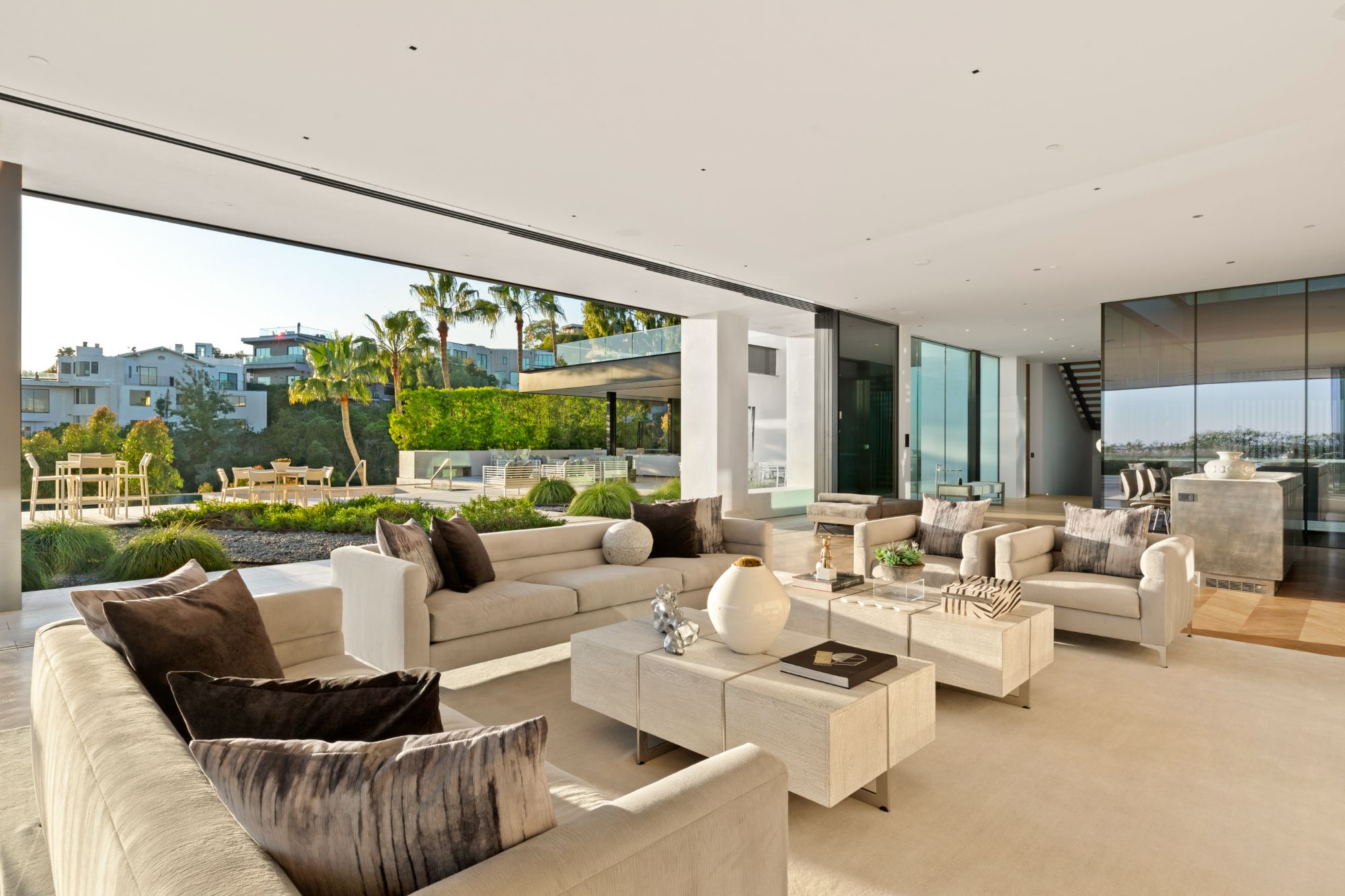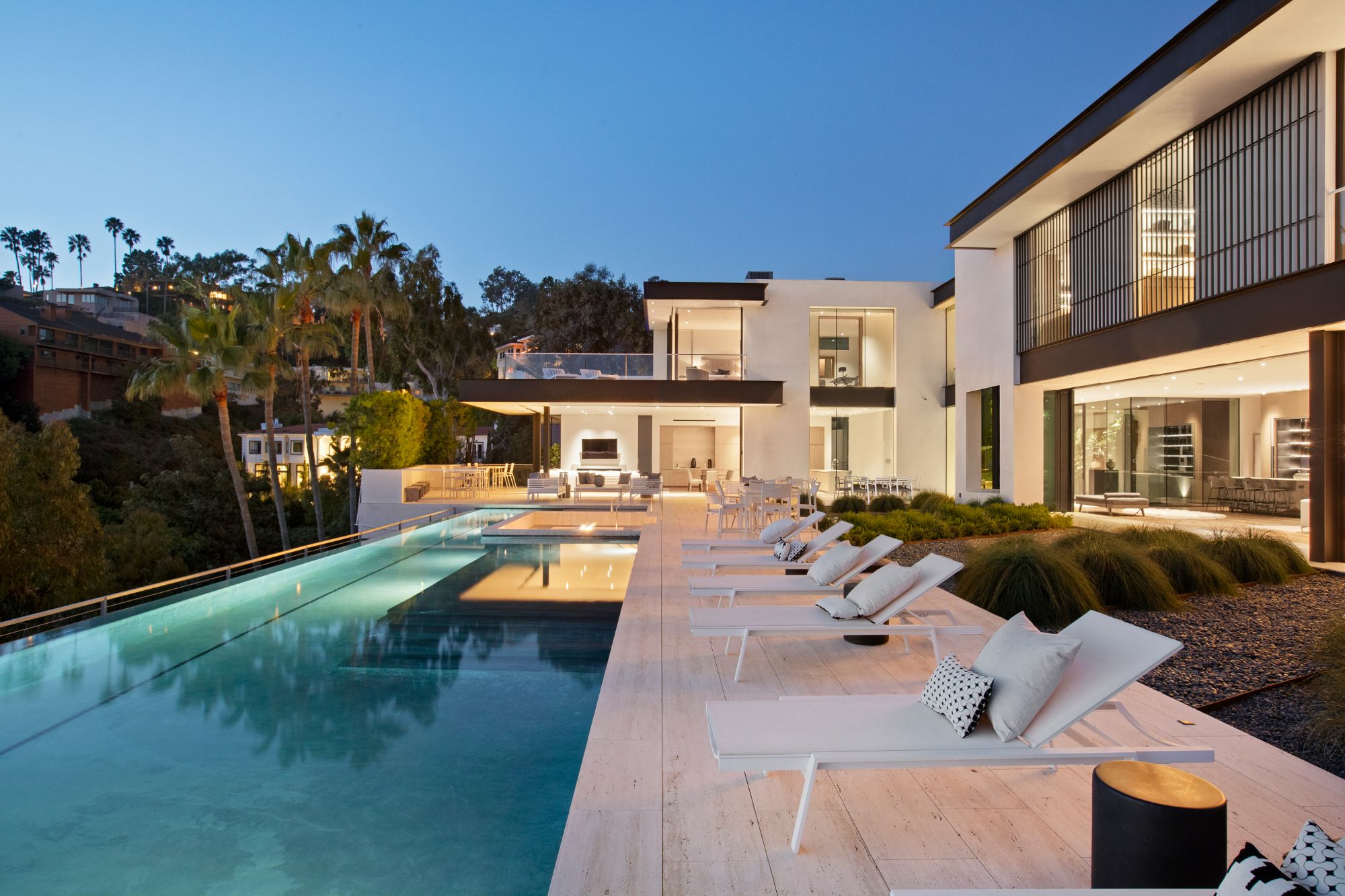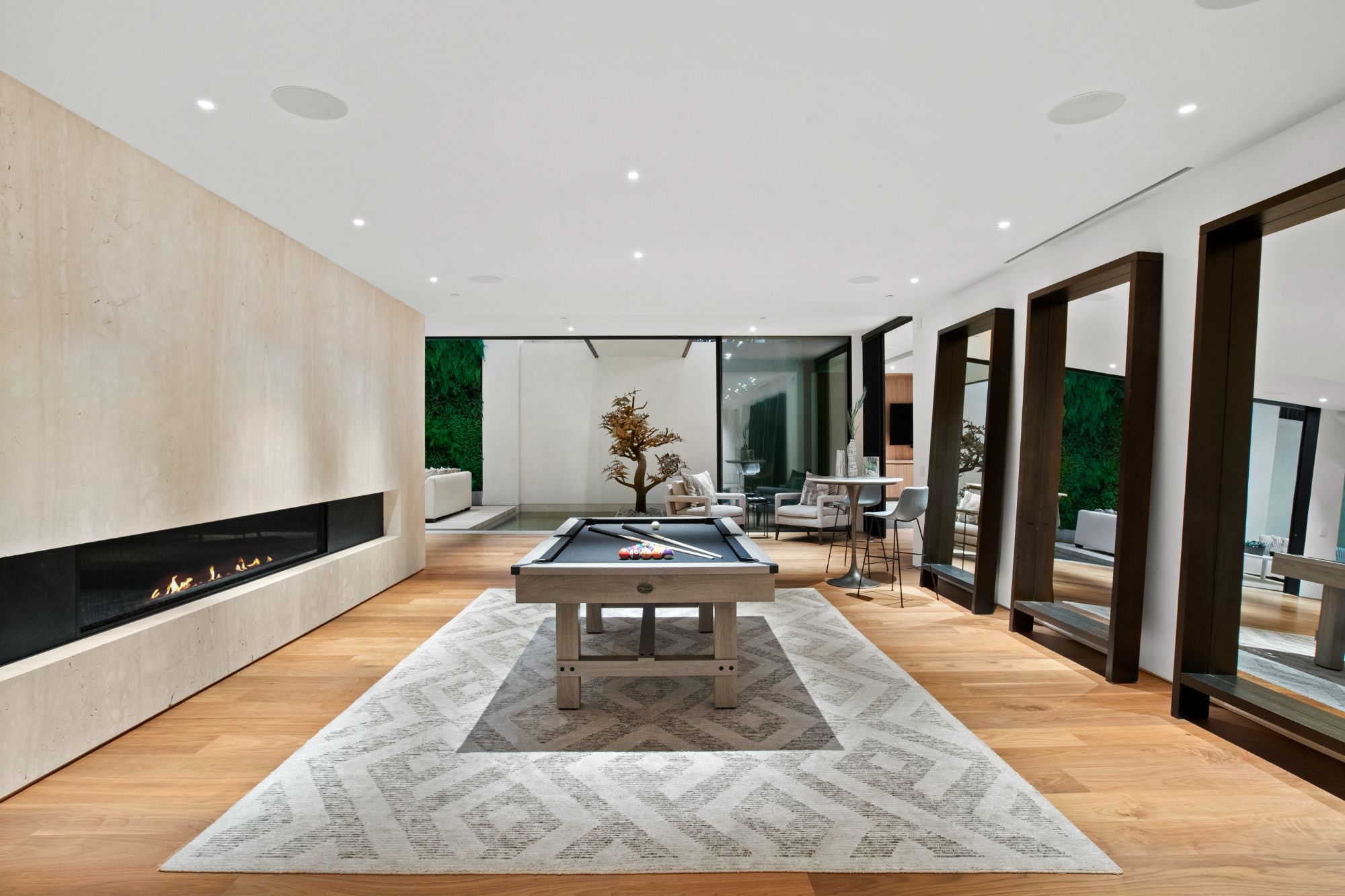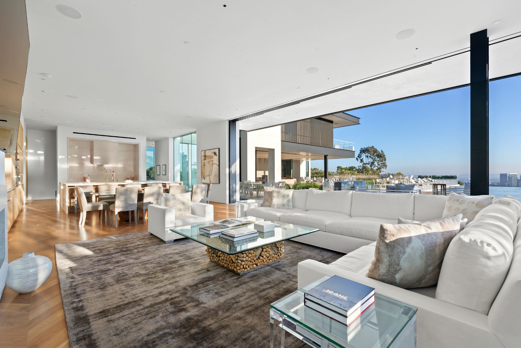 Discover contemporary elegance in this modern estate by McClean Design. A bridge, overlooking a lounge area with waterfall and living wall, welcomes you to this approx. 11,225 SF home. The formal living room features a beautiful herringbone floor, custom bar, fireplace, and walls of glass that showcase the view and open to create an unforgettable indoor/outdoor living experience. The gourmet kitchen offers top-of-the-line appliances, massive dual islands, and seamlessly blends into the dining room and secondary living room. Boasting 5 bedrooms and 9 bathrooms, this home offers ample space for family, friends, and guests. The spacious primary suite offers walk-in closet, spa-like bathroom, sitting area with fireplace, and glass walls that open to a private balcony overlooking the City of Angels. The daylit lower-level amenities include a fitness studio with sauna, a bar with walk-in wine cellar, billiards table, and movie theater. The beautifully landscaped outdoor oasis offers a large deck for dining al fresco, multiple seating areas, sunken fire pit, pool with spa, and sweeping views. Experience the pinnacle of luxury living in Beverly Hills.