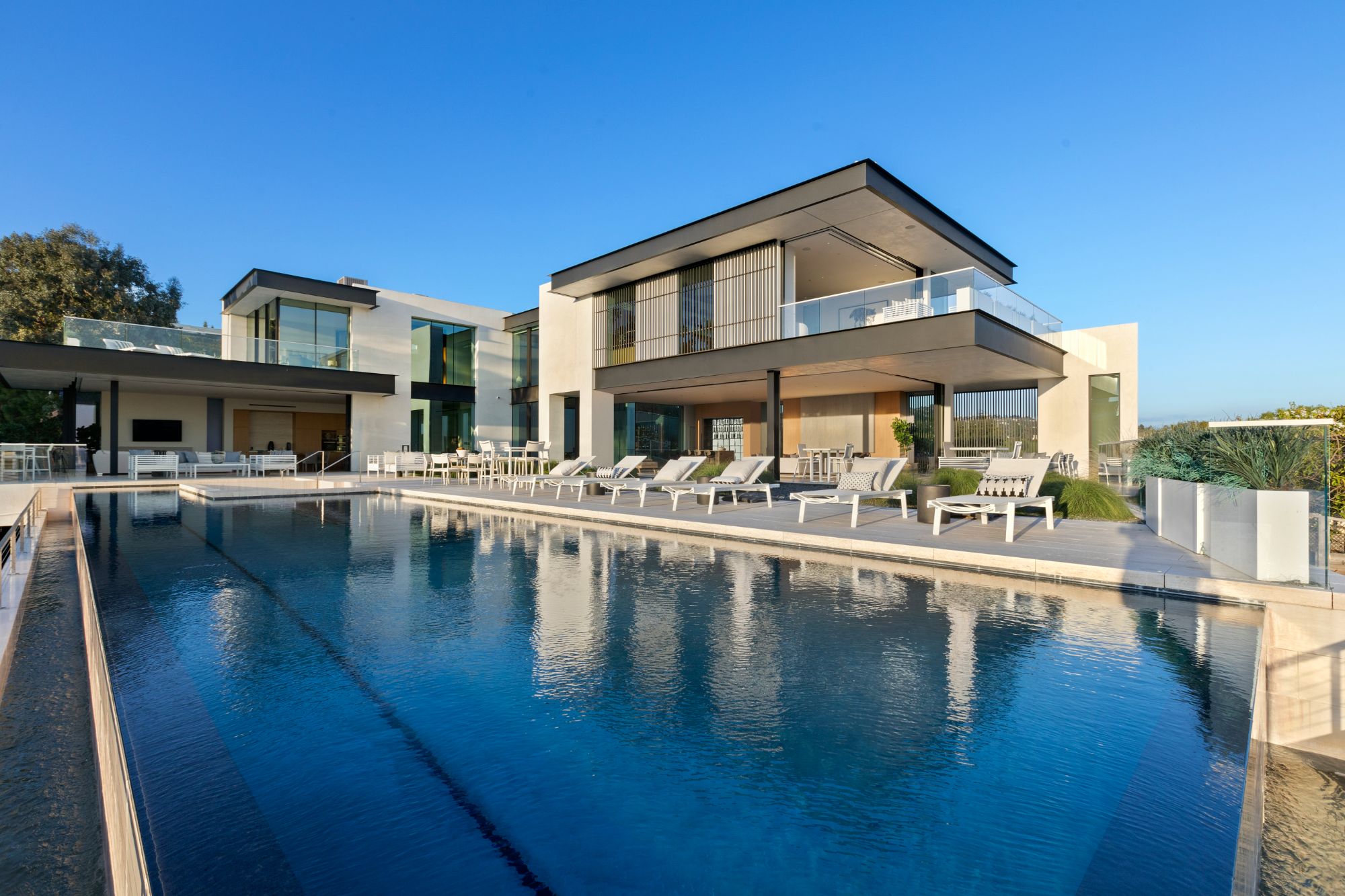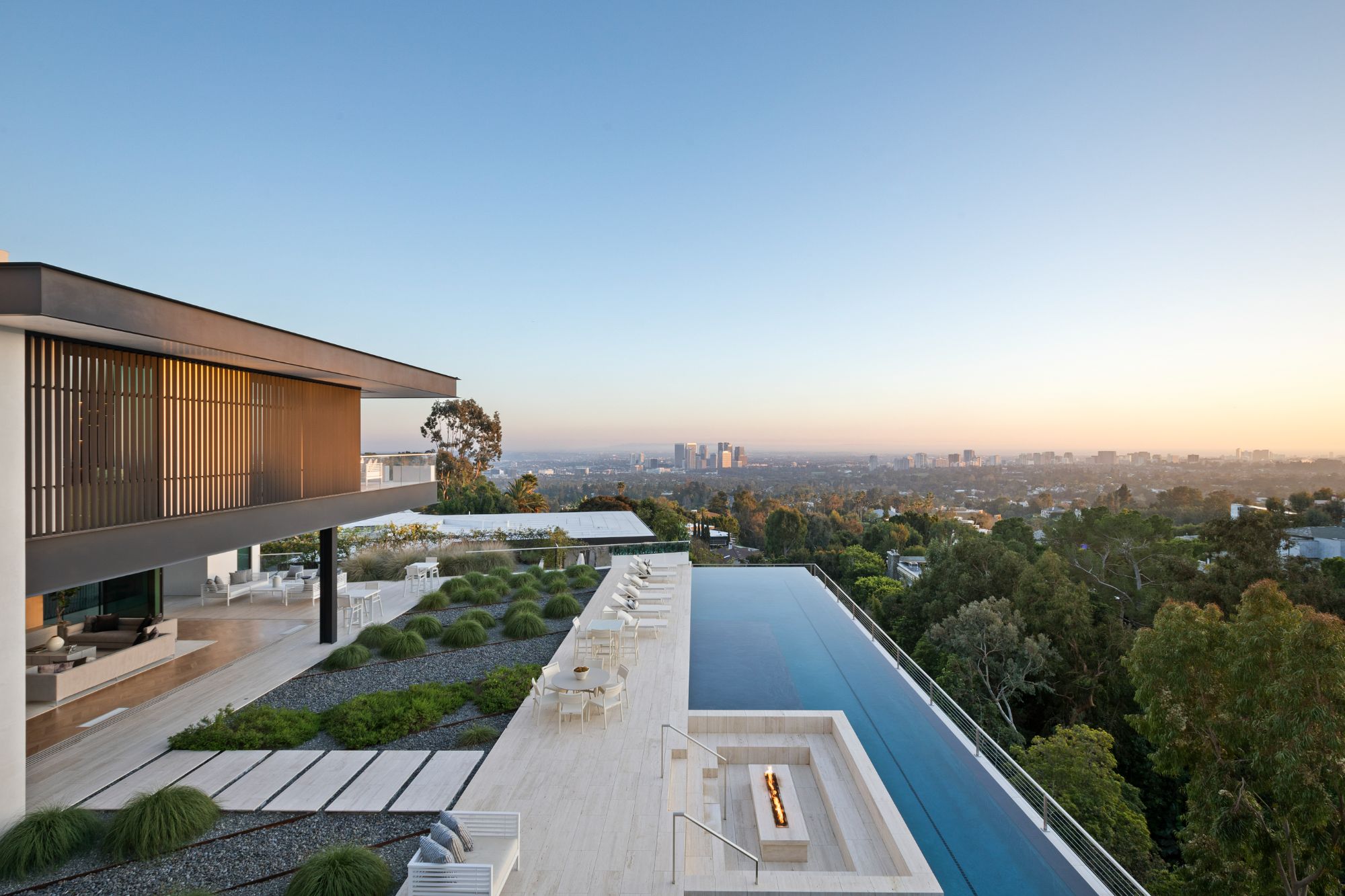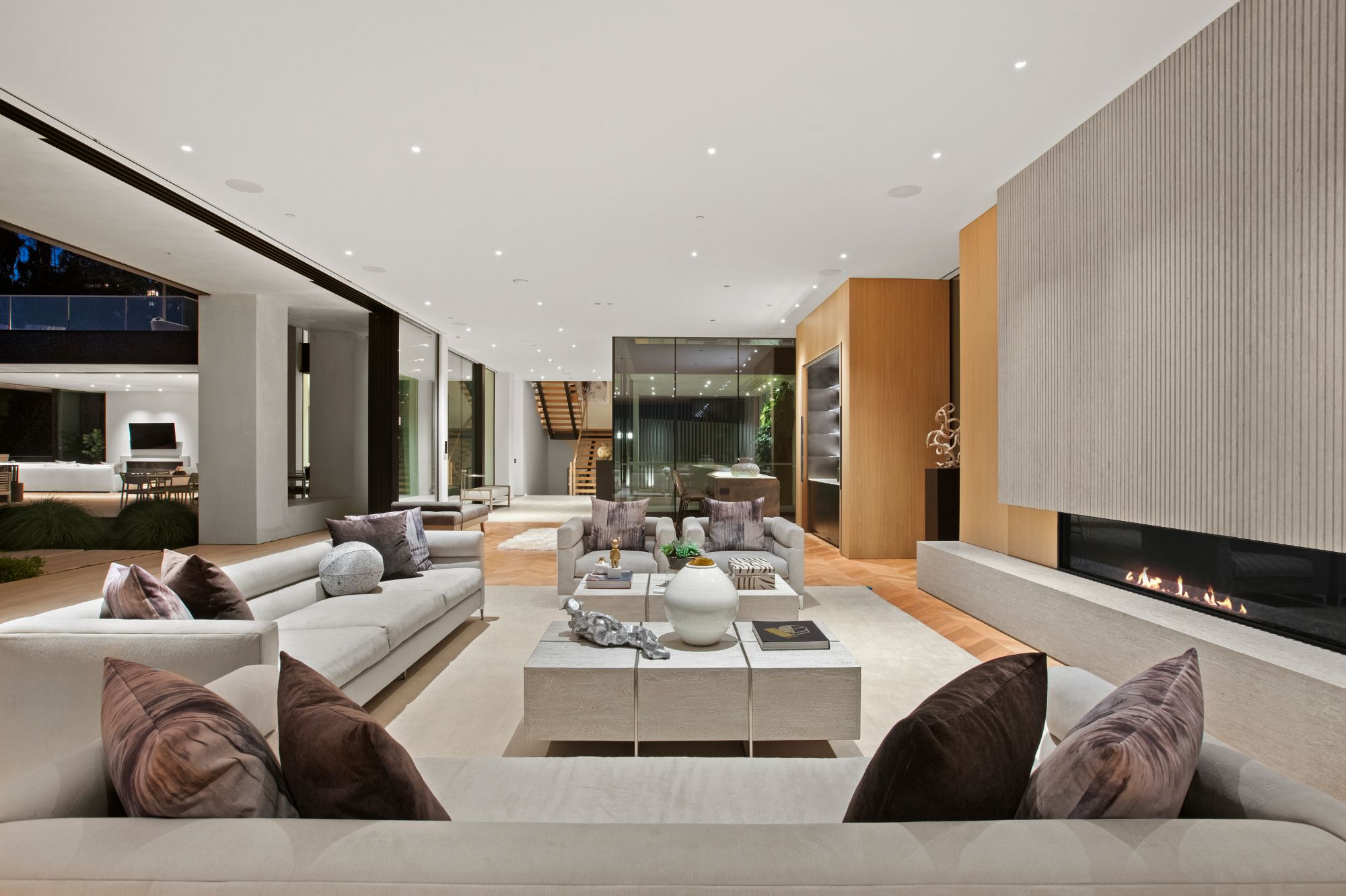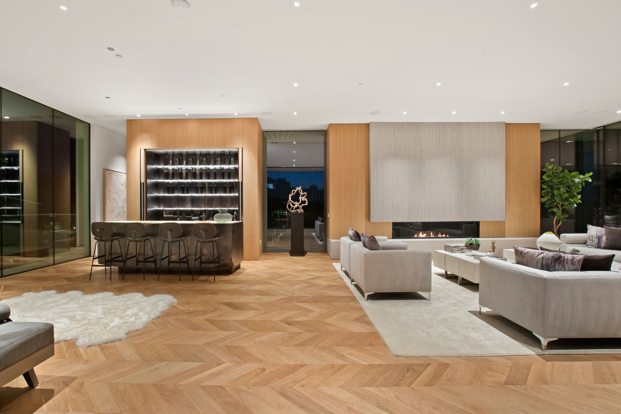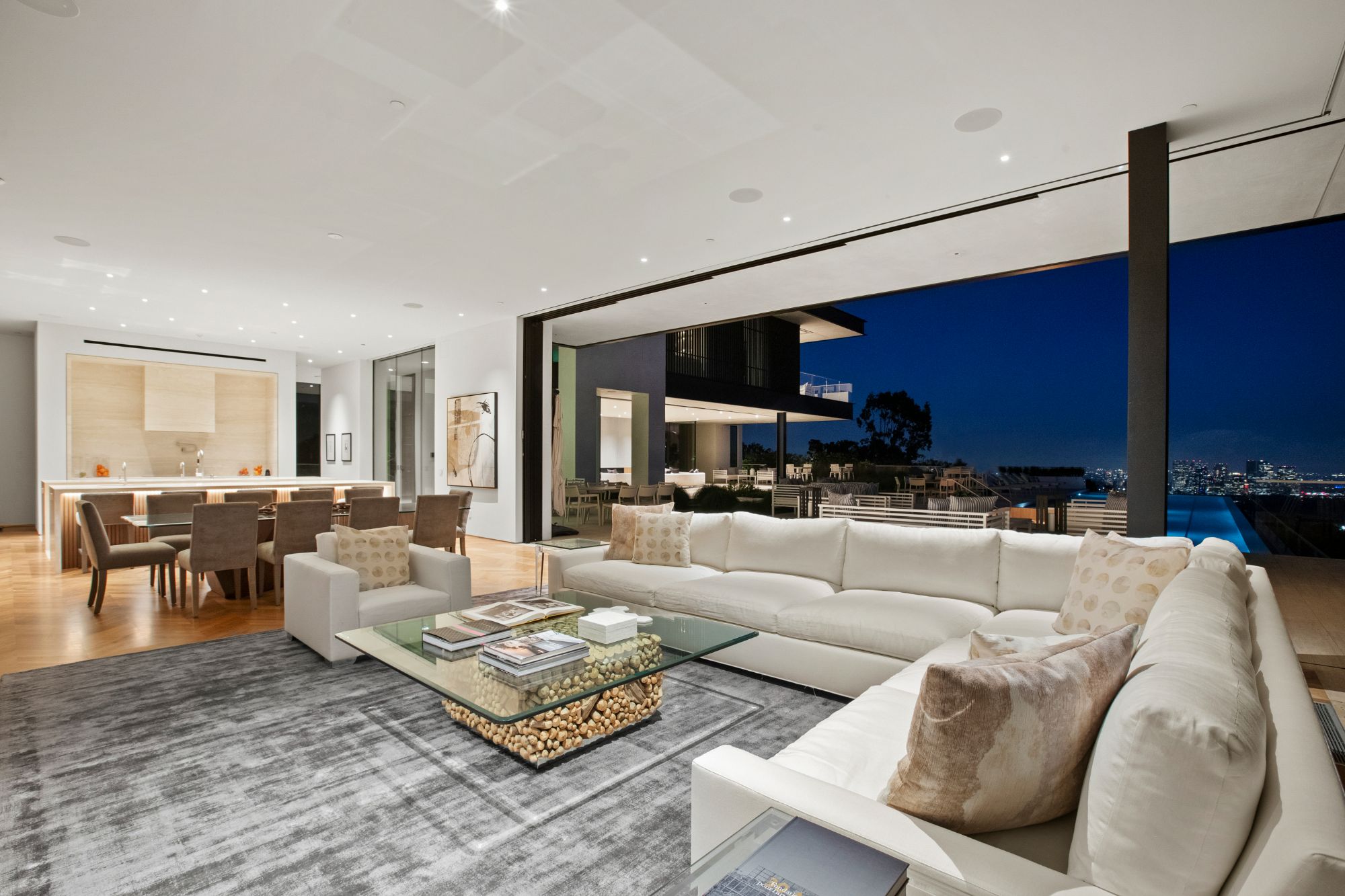 Discover contemporary elegance in this modern estate by McClean Design. A bridge, overlooking a lounge area with waterfall and living wall, welcomes you to this approx. 11,225 SF home. The formal living room features a beautiful herringbone floor, custom bar, fireplace, and walls of glass that showcase the view and open to create an unforgettable indoor/outdoor living experience. The gourmet kitchen offers top-of-the-line appliances, massive dual islands, and seamlessly blends into the dining room and secondary living room. Boasting 5 bedrooms and 9 bathrooms, this home offers ample space for family, friends, and guests. The spacious primary suite offers walk-in closet, spa-like bathroom, sitting area with fireplace, and glass walls that open to a private balcony overlooking the City of Angels. The daylit lower-level amenities include a fitness studio with sauna, a bar with walk-in wine cellar, billiards table, and movie theater. The beautifully landscaped outdoor oasis offers a large deck for dining al fresco, multiple seating areas, sunken fire pit, pool with spa, and sweeping views. Experience the pinnacle of luxury living in Beverly Hills.