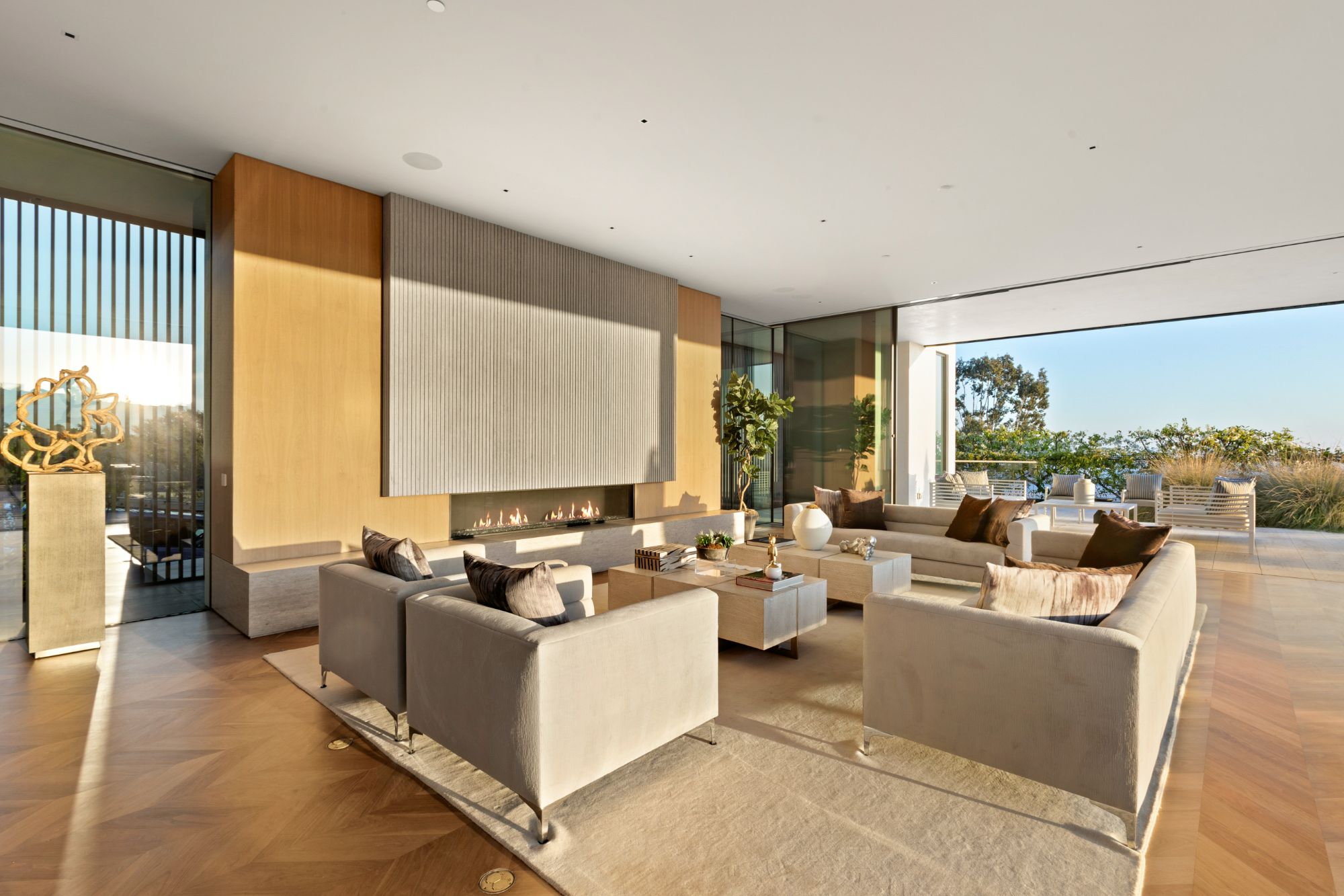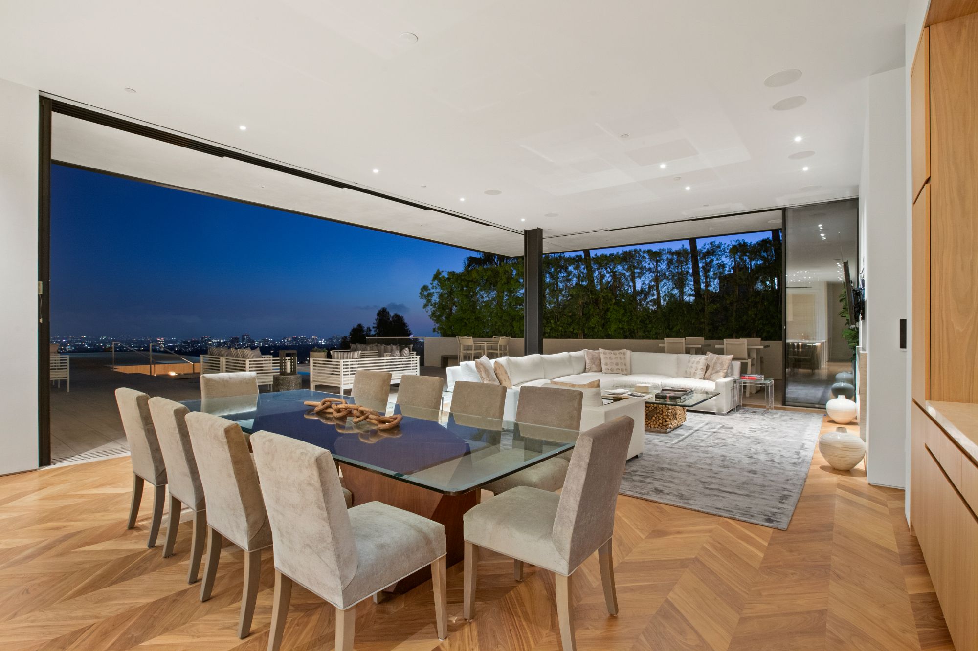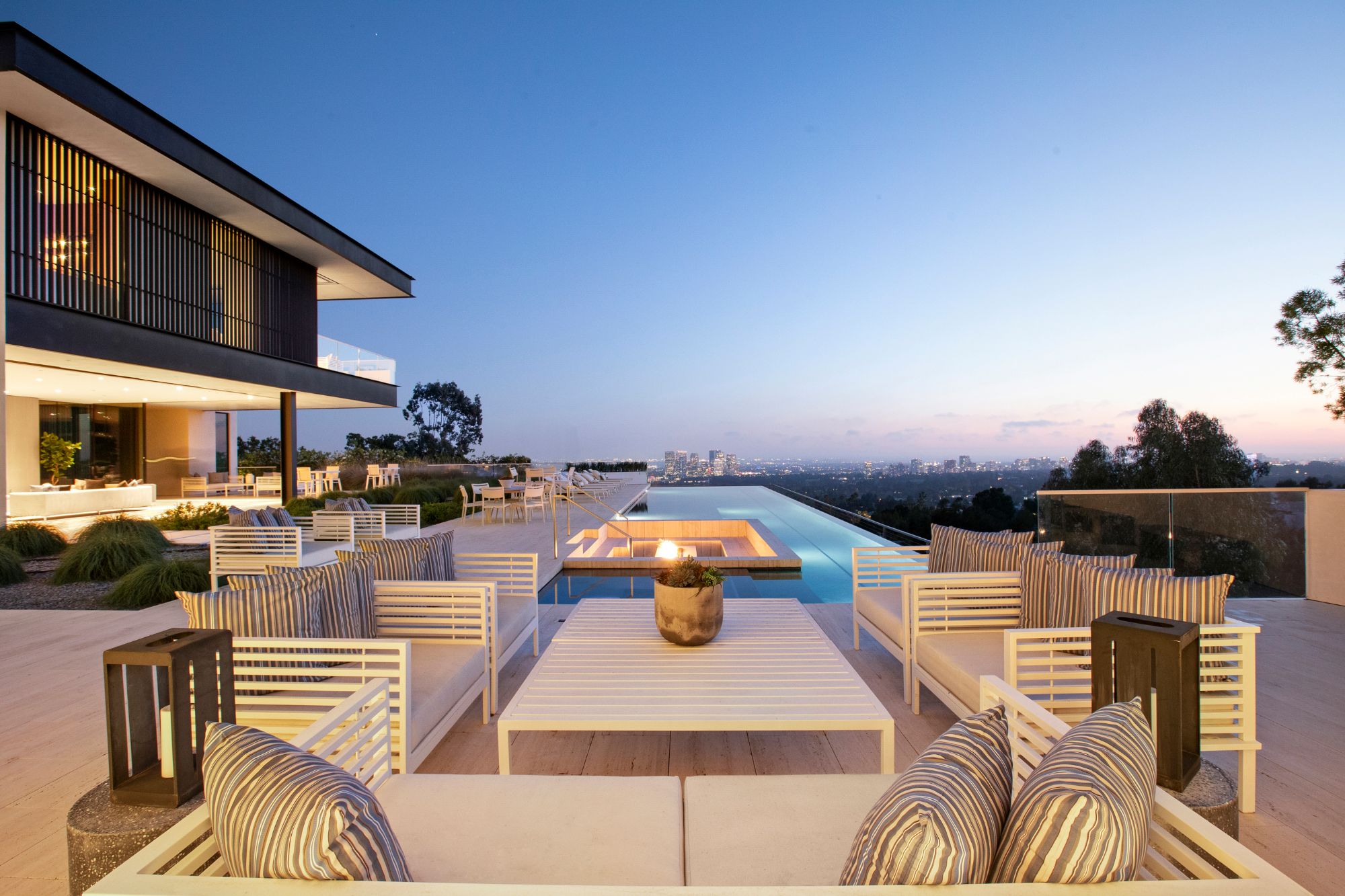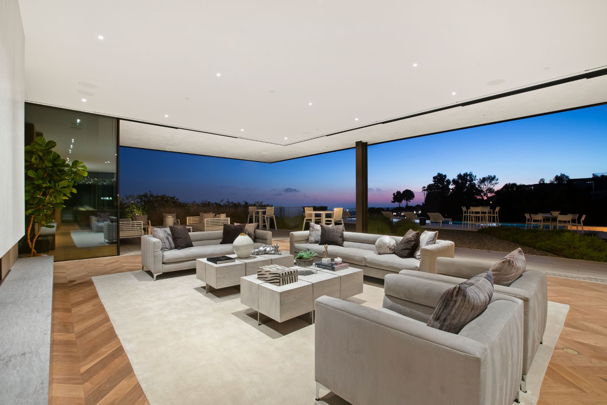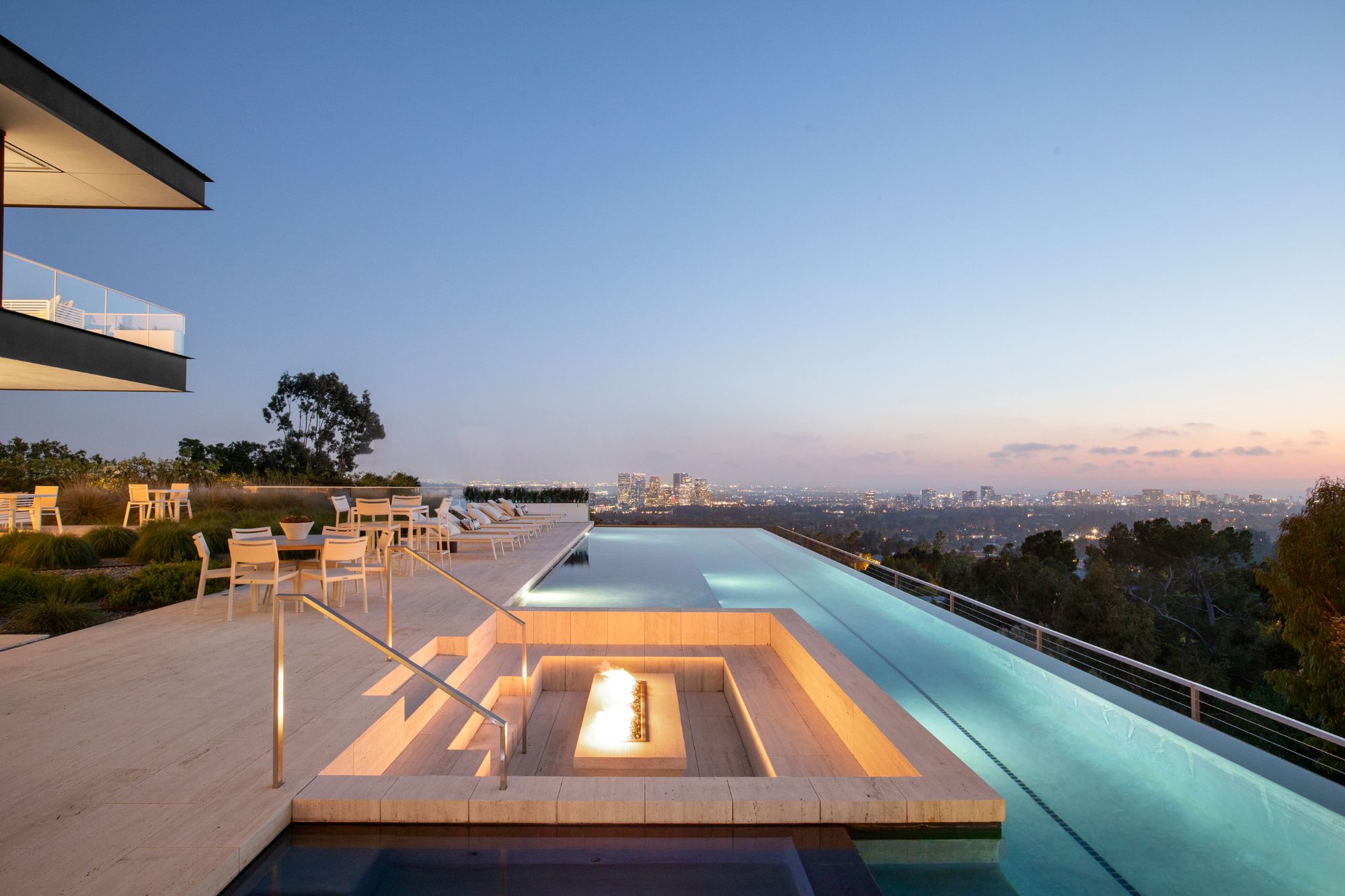 Discover contemporary elegance in this modern estate by McClean Design. A bridge, overlooking a lounge area with waterfall and living wall, welcomes you to this approx. 11,225 SF home. The formal living room features a beautiful herringbone floor, custom bar, fireplace, and walls of glass that showcase the view and open to create an unforgettable indoor/outdoor living experience. The gourmet kitchen offers top-of-the-line appliances, massive dual islands, and seamlessly blends into the dining room and secondary living room. Boasting 5 bedrooms and 9 bathrooms, this home offers ample space for family, friends, and guests. The spacious primary suite offers walk-in closet, spa-like bathroom, sitting area with fireplace, and glass walls that open to a private balcony overlooking the City of Angels. The daylit lower-level amenities include a fitness studio with sauna, a bar with walk-in wine cellar, billiards table, and movie theater. The beautifully landscaped outdoor oasis offers a large deck for dining al fresco, multiple seating areas, sunken fire pit, pool with spa, and sweeping views. Experience the pinnacle of luxury living in Beverly Hills.