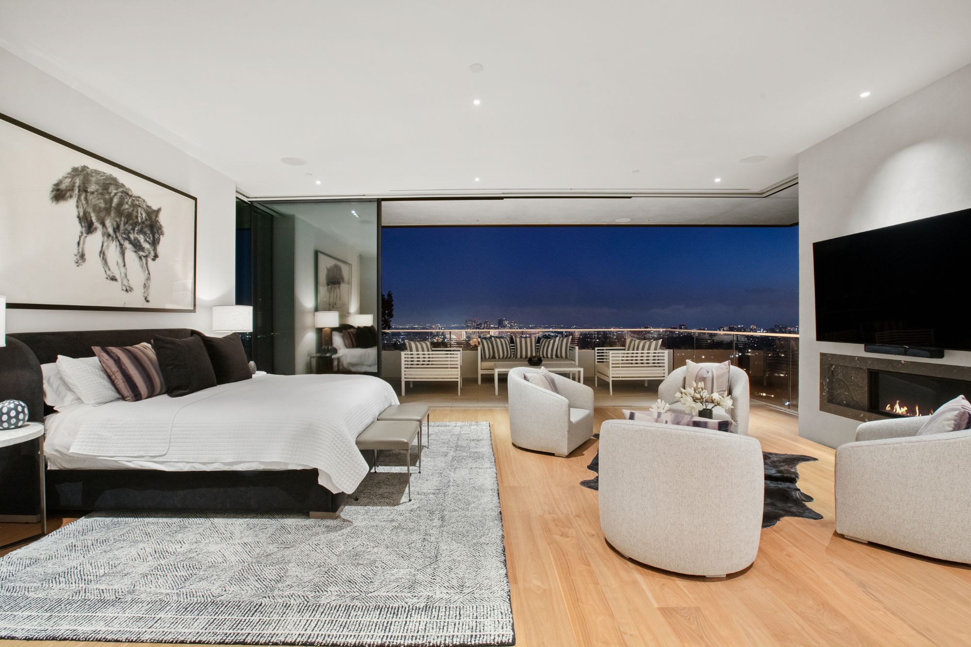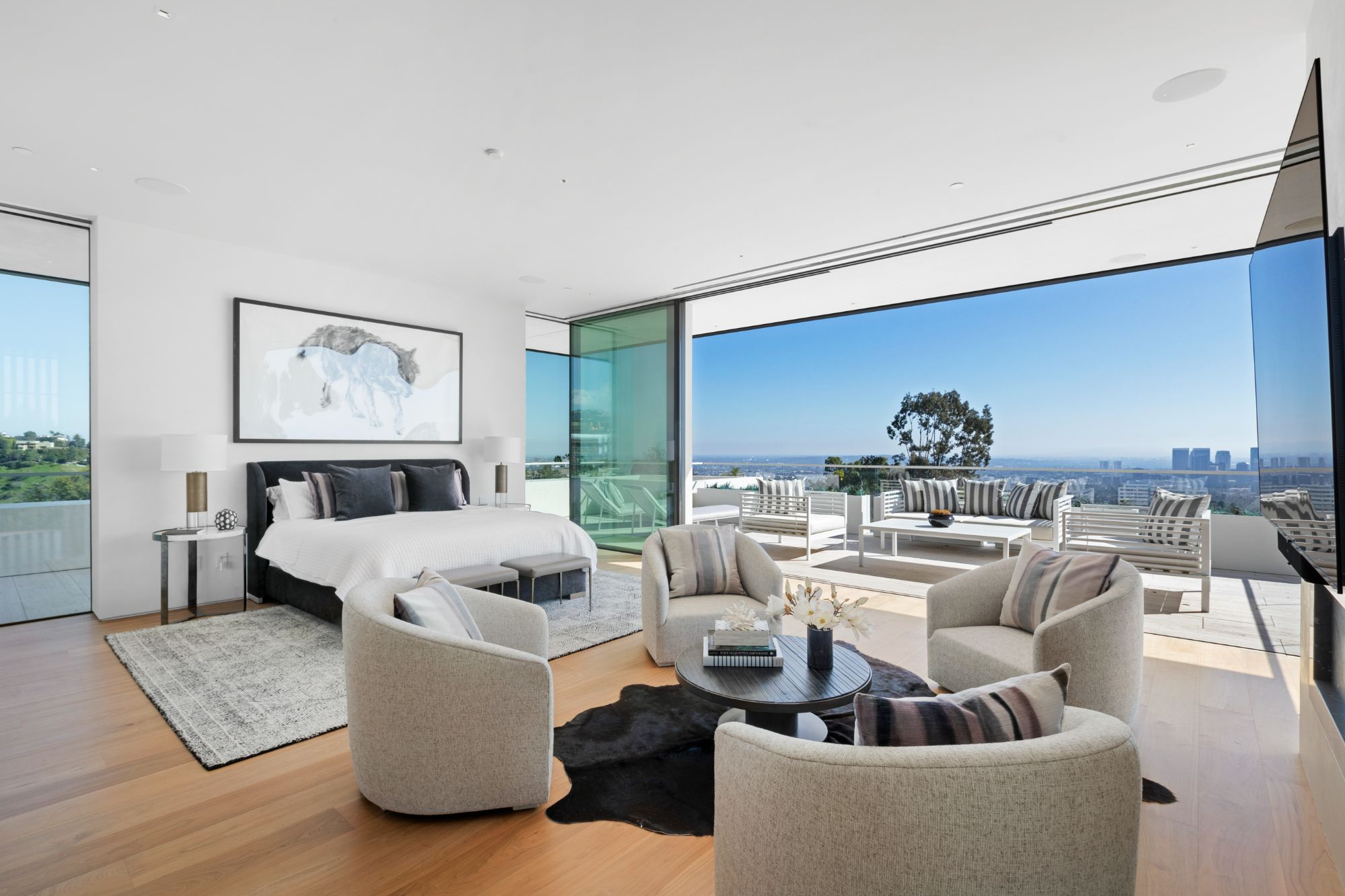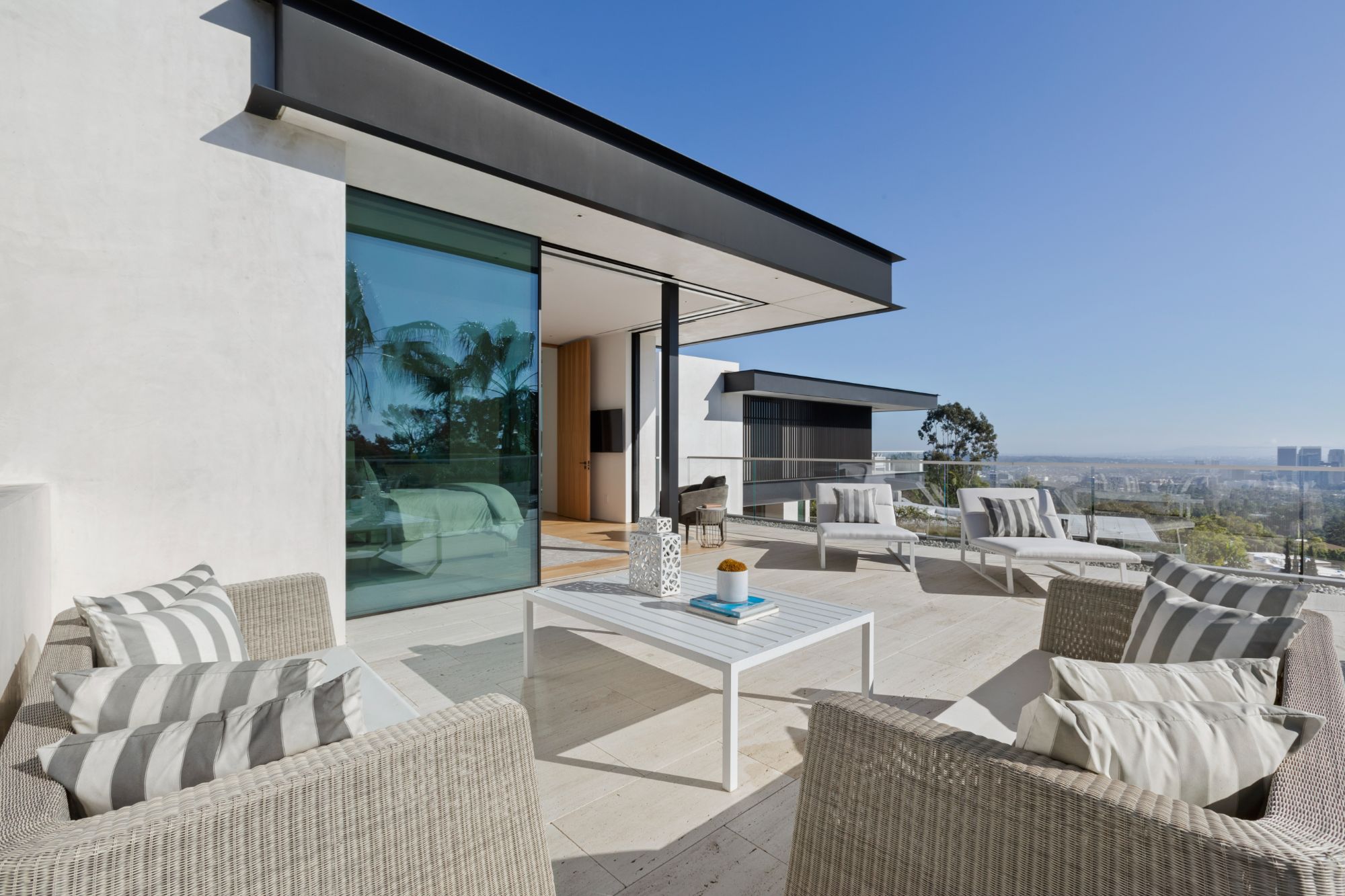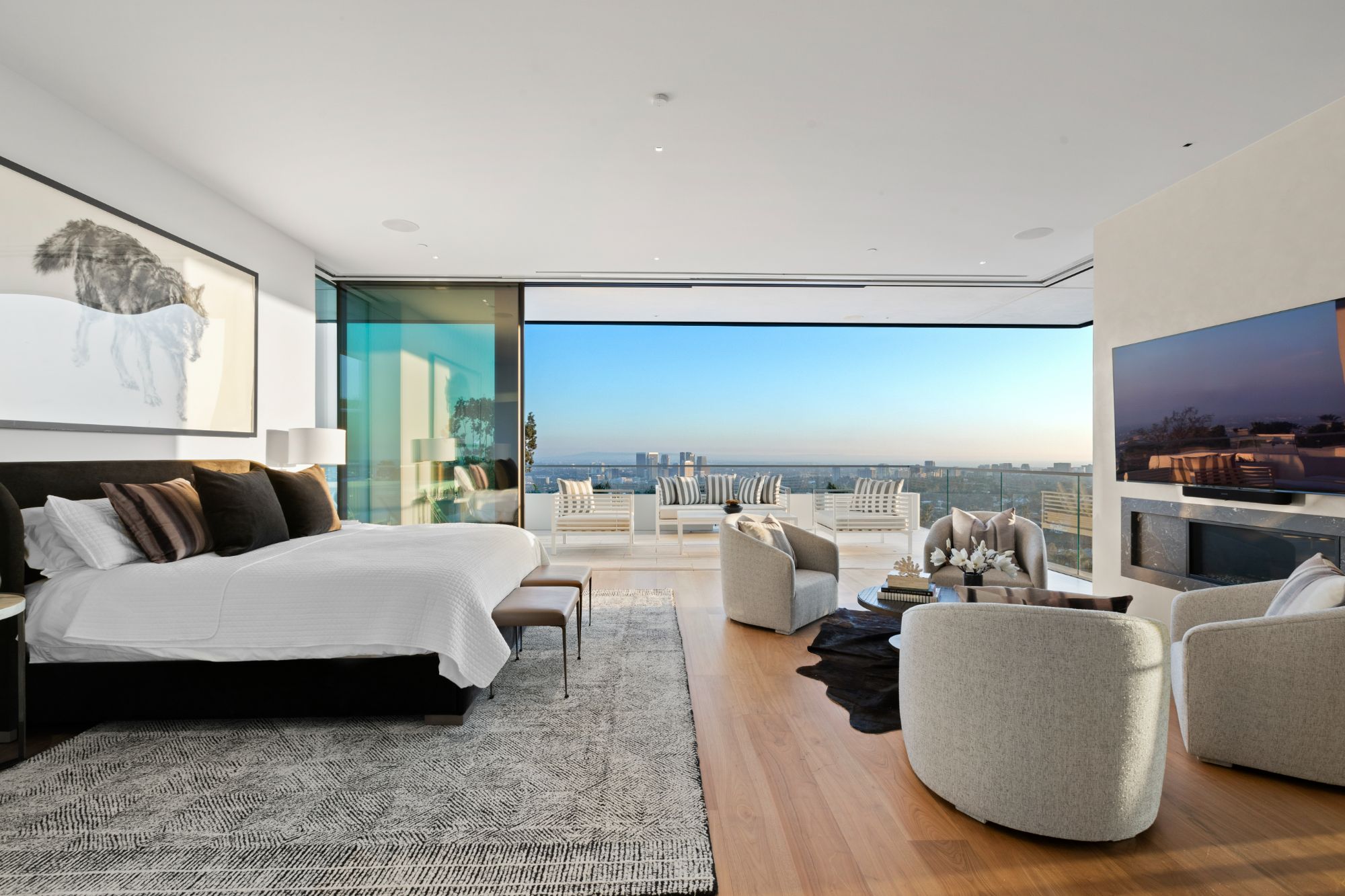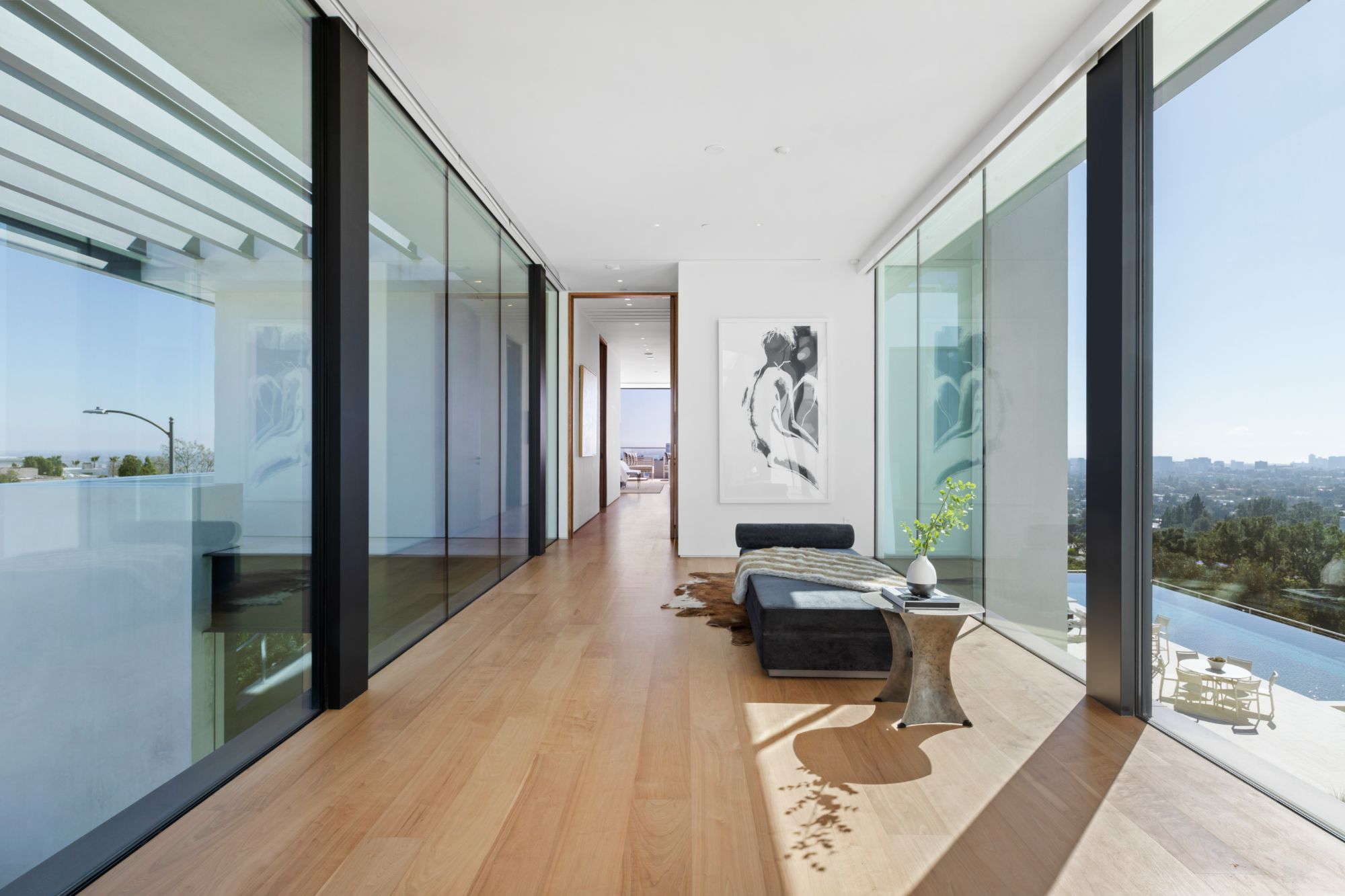 Discover contemporary elegance in this modern estate by McClean Design. A bridge, overlooking a lounge area with waterfall and living wall, welcomes you to this approx. 11,225 SF home. The formal living room features a beautiful herringbone floor, custom bar, fireplace, and walls of glass that showcase the view and open to create an unforgettable indoor/outdoor living experience. The gourmet kitchen offers top-of-the-line appliances, massive dual islands, and seamlessly blends into the dining room and secondary living room. Boasting 5 bedrooms and 9 bathrooms, this home offers ample space for family, friends, and guests. The spacious primary suite offers walk-in closet, spa-like bathroom, sitting area with fireplace, and glass walls that open to a private balcony overlooking the City of Angels. The daylit lower-level amenities include a fitness studio with sauna, a bar with walk-in wine cellar, billiards table, and movie theater. The beautifully landscaped outdoor oasis offers a large deck for dining al fresco, multiple seating areas, sunken fire pit, pool with spa, and sweeping views. Experience the pinnacle of luxury living in Beverly Hills.