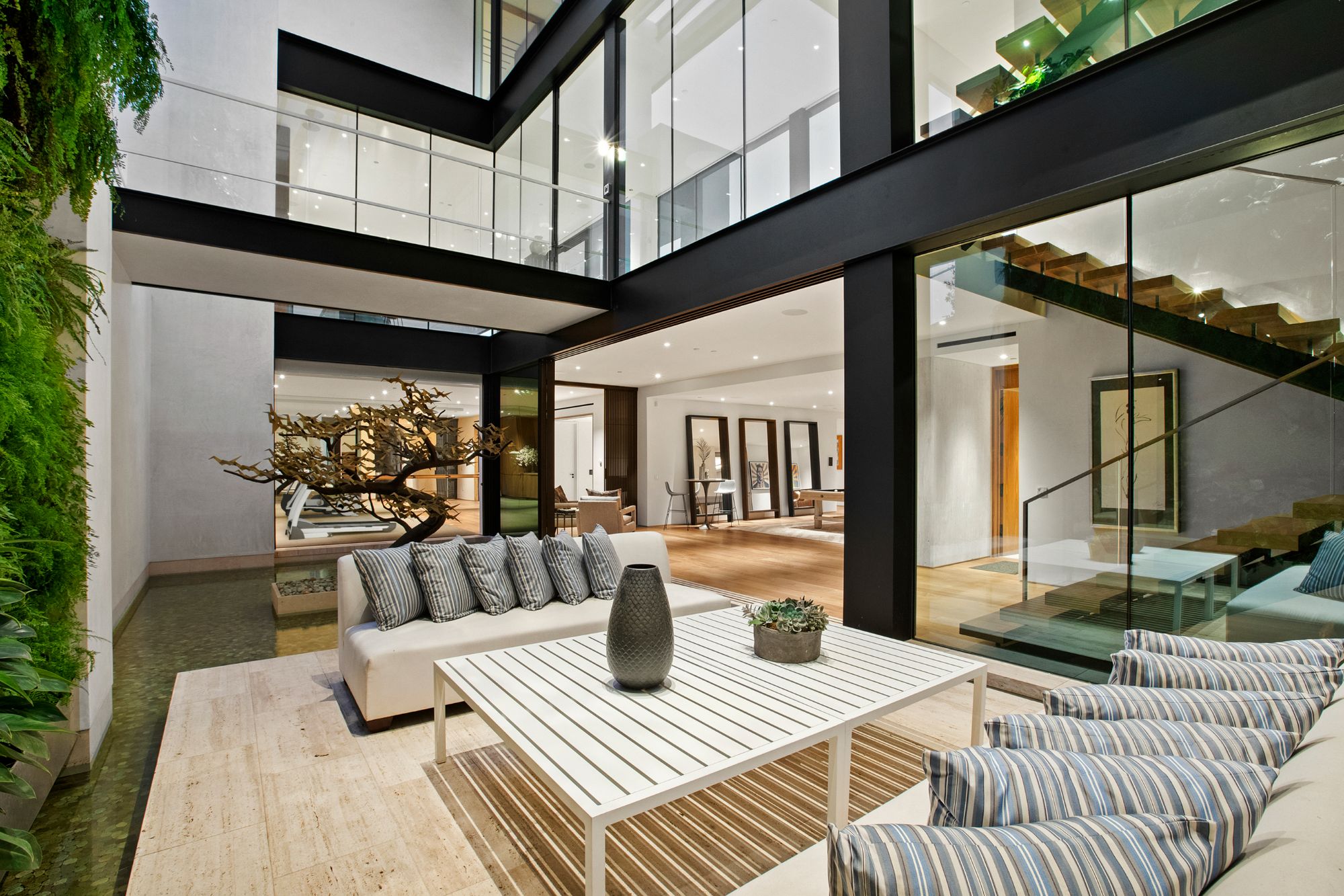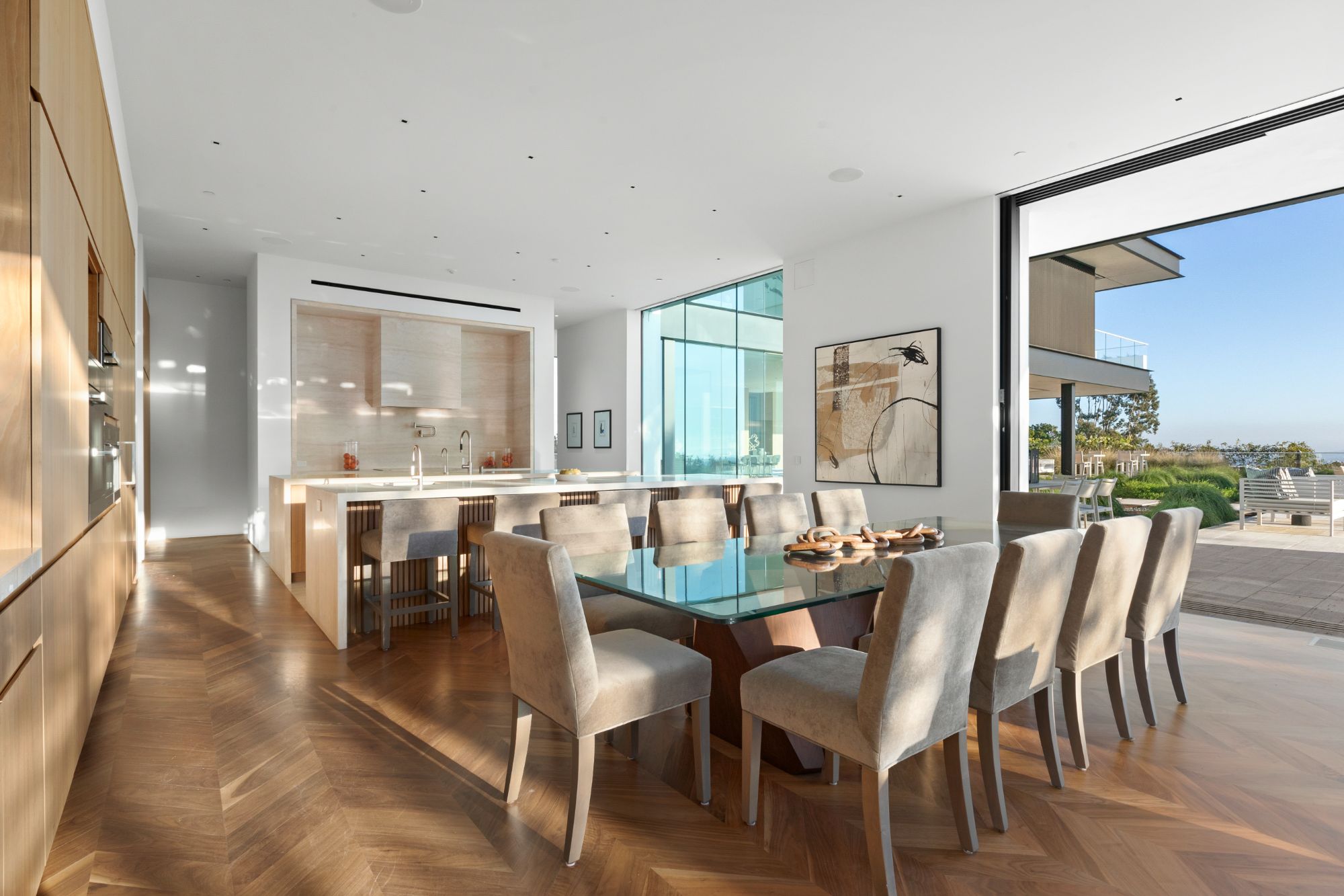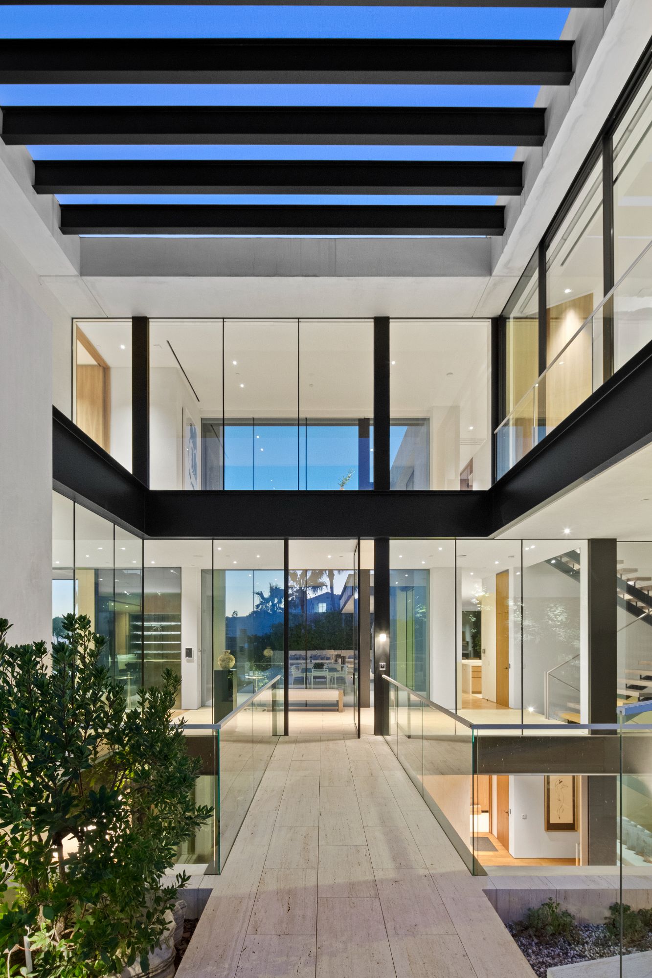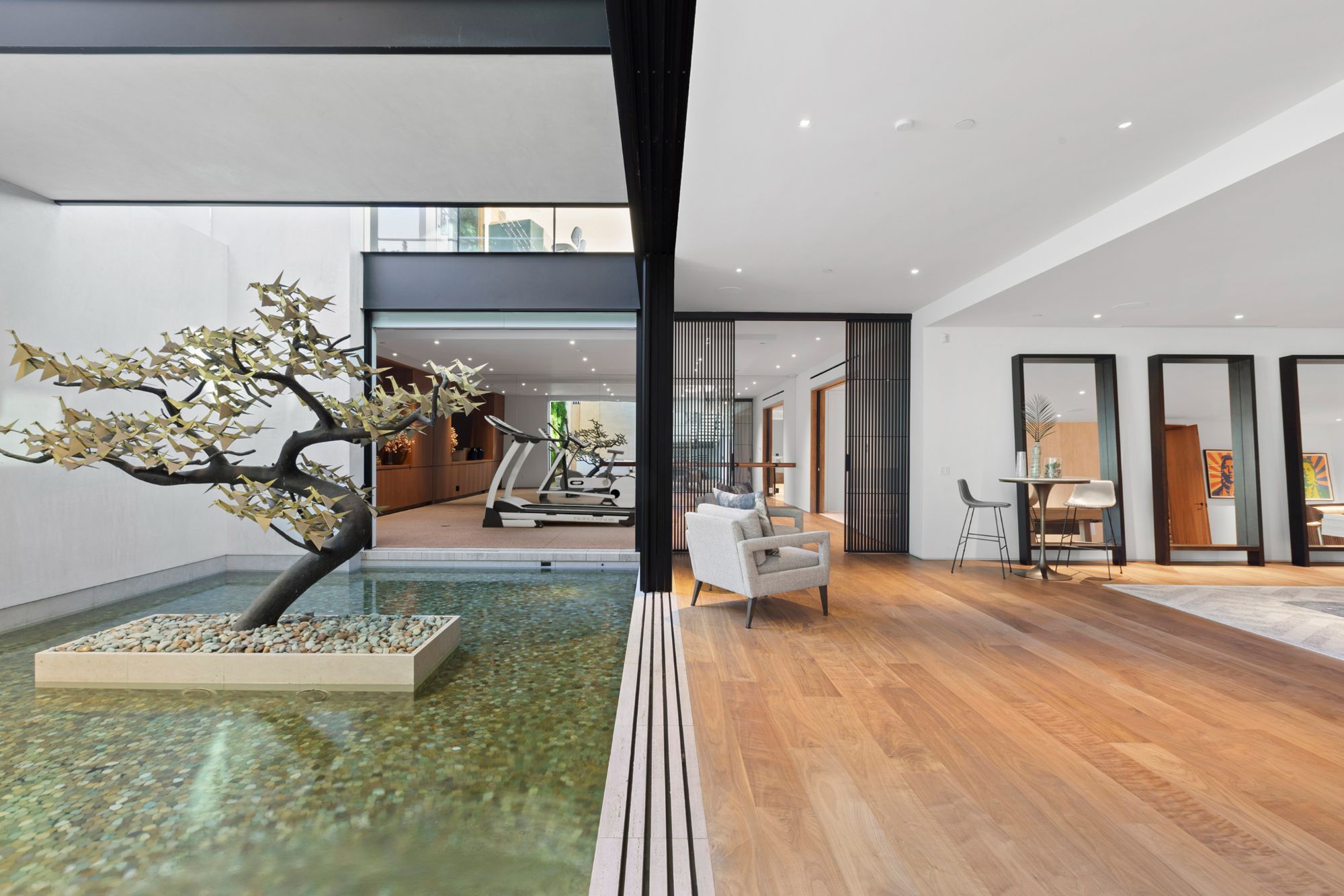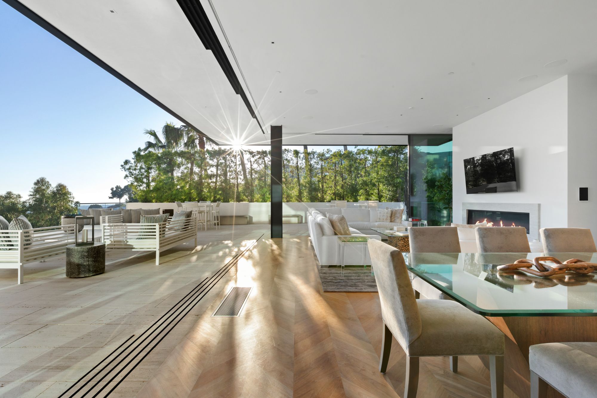 Discover contemporary elegance in this modern estate by McClean Design. A bridge, overlooking a lounge area with waterfall and living wall, welcomes you to this approx. 11,225 SF home. The formal living room features a beautiful herringbone floor, custom bar, fireplace, and walls of glass that showcase the view and open to create an unforgettable indoor/outdoor living experience. The gourmet kitchen offers top-of-the-line appliances, massive dual islands, and seamlessly blends into the dining room and secondary living room. Boasting 5 bedrooms and 9 bathrooms, this home offers ample space for family, friends, and guests. The spacious primary suite offers walk-in closet, spa-like bathroom, sitting area with fireplace, and glass walls that open to a private balcony overlooking the City of Angels. The daylit lower-level amenities include a fitness studio with sauna, a bar with walk-in wine cellar, billiards table, and movie theater. The beautifully landscaped outdoor oasis offers a large deck for dining al fresco, multiple seating areas, sunken fire pit, pool with spa, and sweeping views. Experience the pinnacle of luxury living in Beverly Hills.