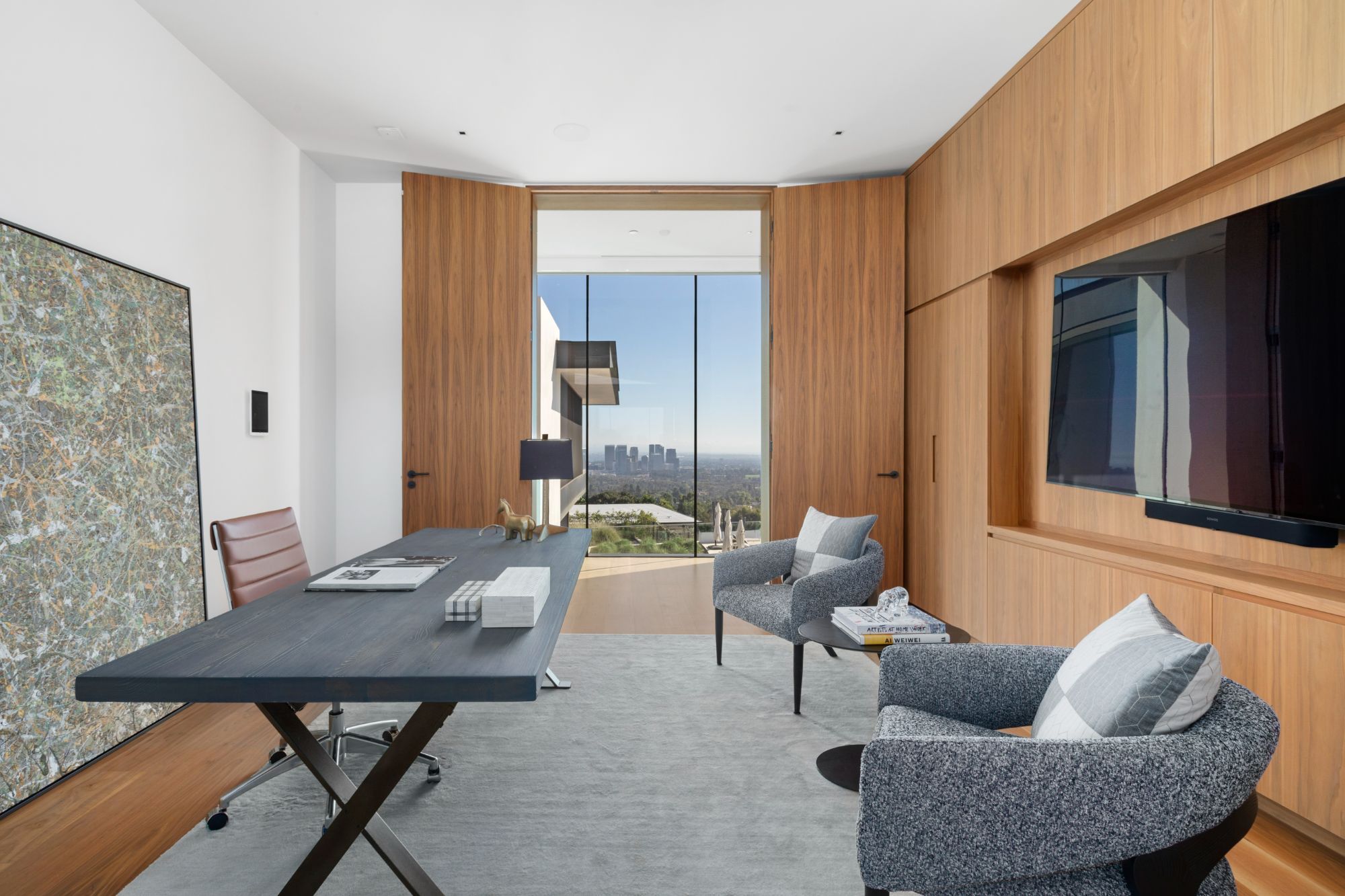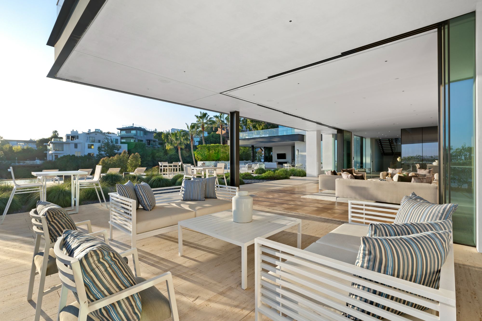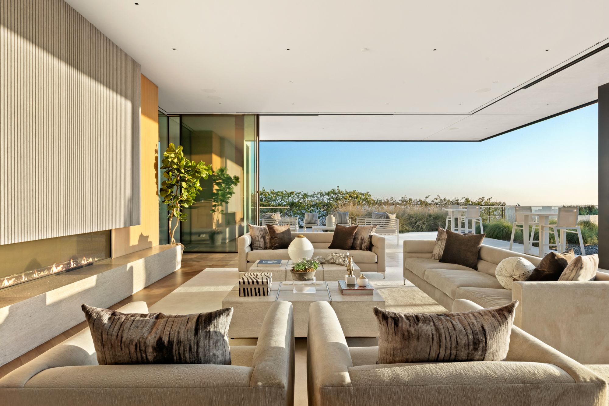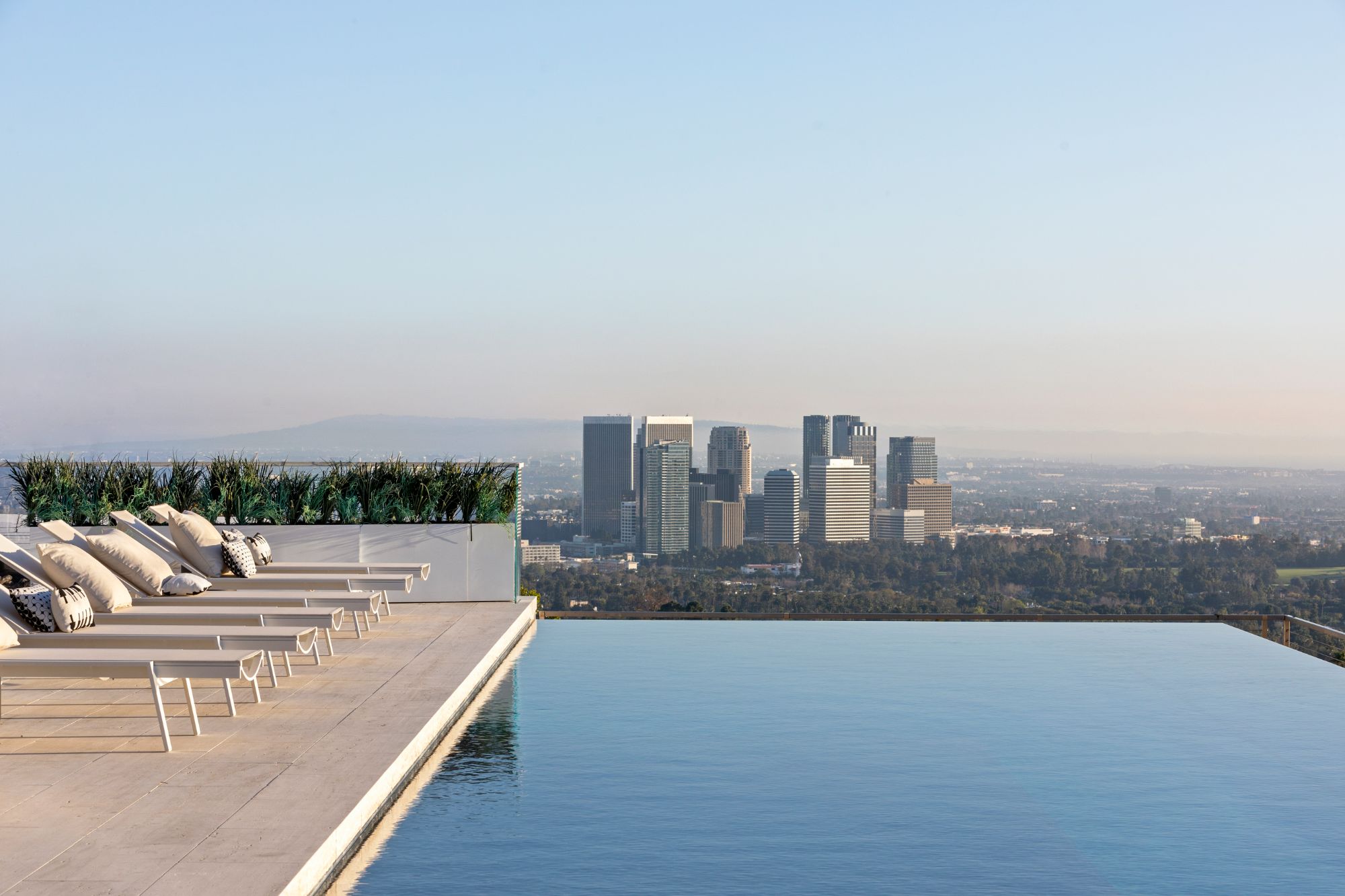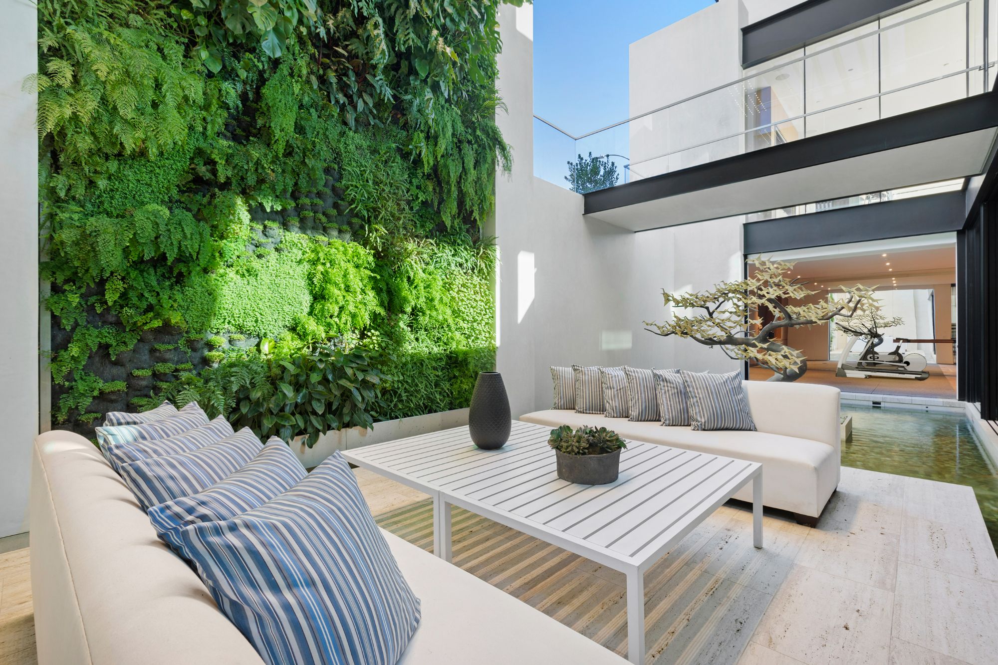 Discover contemporary elegance in this modern estate by McClean Design. A bridge, overlooking a lounge area with waterfall and living wall, welcomes you to this approx. 11,225 SF home. The formal living room features a beautiful herringbone floor, custom bar, fireplace, and walls of glass that showcase the view and open to create an unforgettable indoor/outdoor living experience. The gourmet kitchen offers top-of-the-line appliances, massive dual islands, and seamlessly blends into the dining room and secondary living room. Boasting 5 bedrooms and 9 bathrooms, this home offers ample space for family, friends, and guests. The spacious primary suite offers walk-in closet, spa-like bathroom, sitting area with fireplace, and glass walls that open to a private balcony overlooking the City of Angels. The daylit lower-level amenities include a fitness studio with sauna, a bar with walk-in wine cellar, billiards table, and movie theater. The beautifully landscaped outdoor oasis offers a large deck for dining al fresco, multiple seating areas, sunken fire pit, pool with spa, and sweeping views. Experience the pinnacle of luxury living in Beverly Hills.