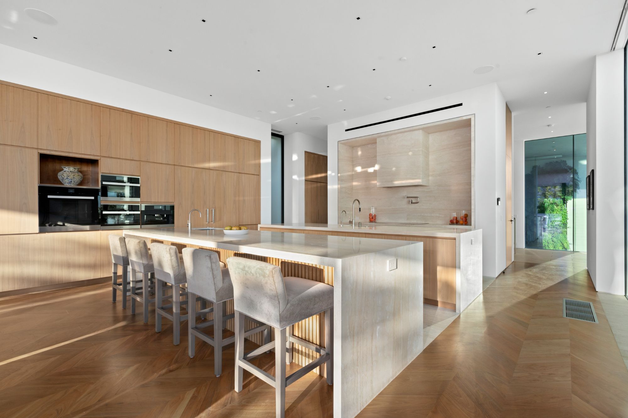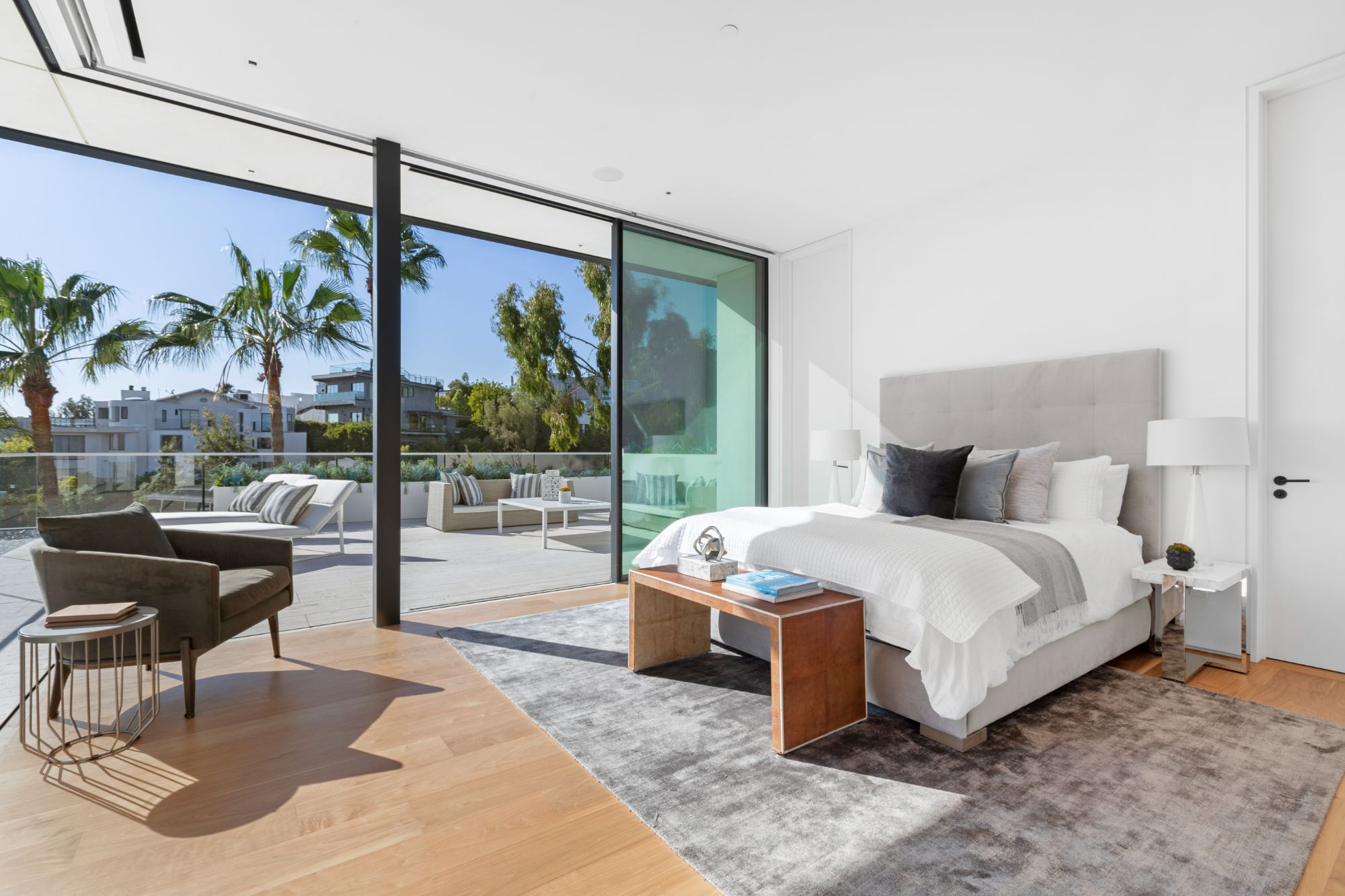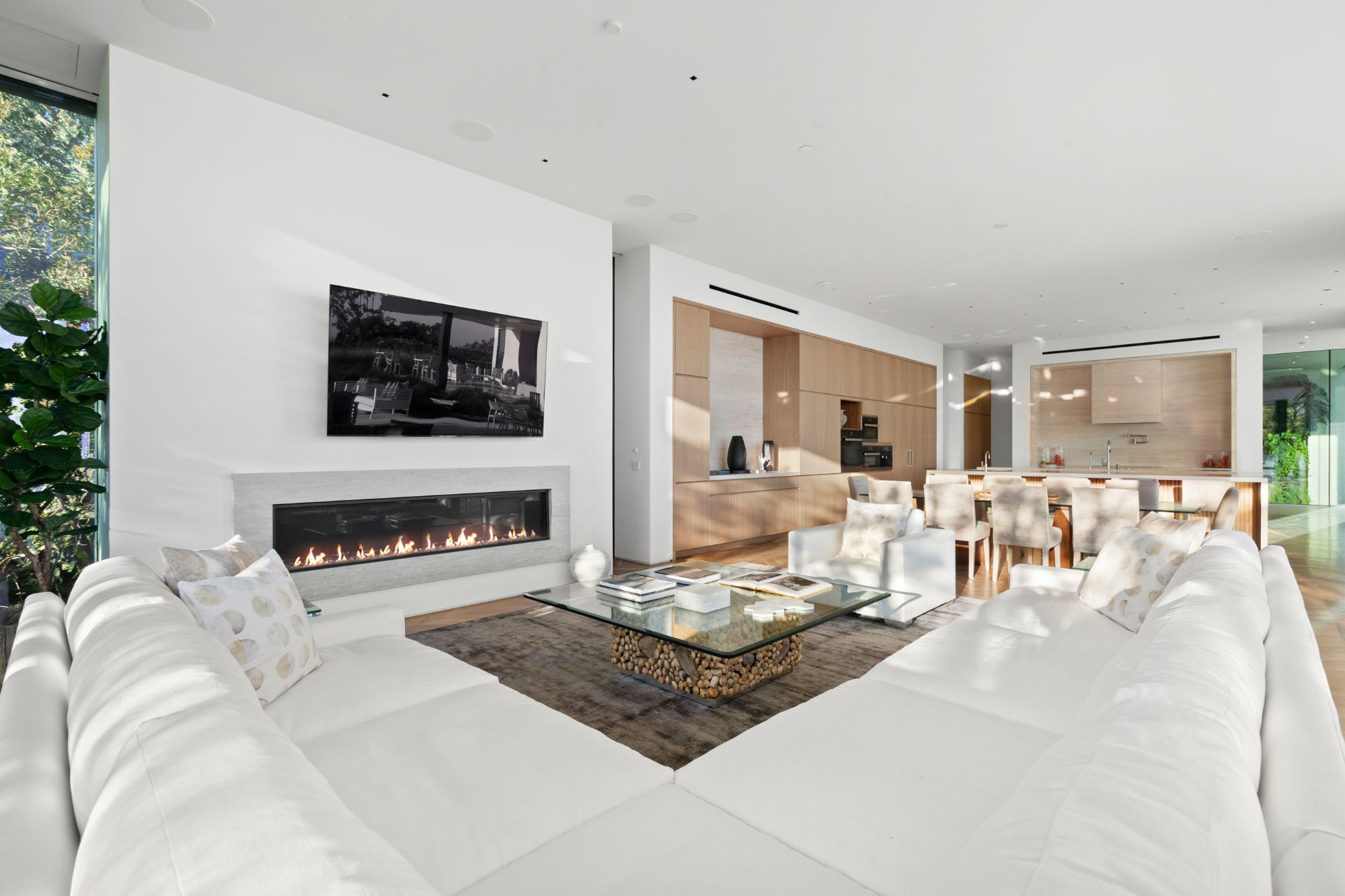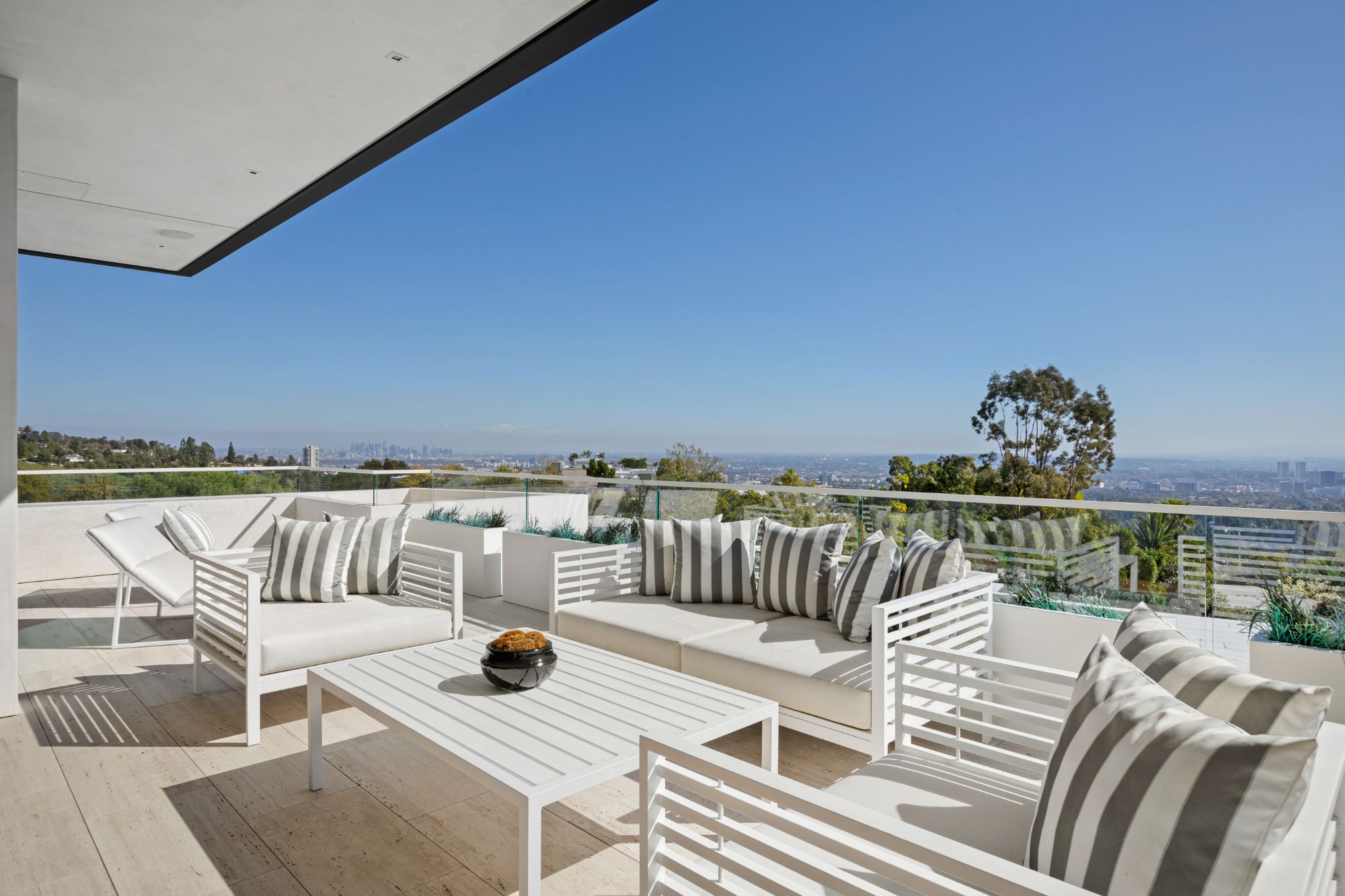Discover contemporary elegance in this modern estate by McClean Design. A bridge, overlooking a lounge area with waterfall and living wall, welcomes you to this approx. 11,225 SF home. The formal living room features a beautiful herringbone floor, custom bar, fireplace, and walls of glass that showcase the view and open to create an unforgettable indoor/outdoor living experience. The gourmet kitchen offers top-of-the-line appliances, massive dual islands, and seamlessly blends into the dining room and secondary living room. Boasting 5 bedrooms and 9 bathrooms, this home offers ample space for family, friends, and guests. The spacious primary suite offers walk-in closet, spa-like bathroom, sitting area with fireplace, and glass walls that open to a private balcony overlooking the City of Angels. The daylit lower-level amenities include a fitness studio with sauna, a bar with walk-in wine cellar, billiards table, and movie theater. The beautifully landscaped outdoor oasis offers a large deck for dining al fresco, multiple seating areas, sunken fire pit, pool with spa, and sweeping views. Experience the pinnacle of luxury living in Beverly Hills.
