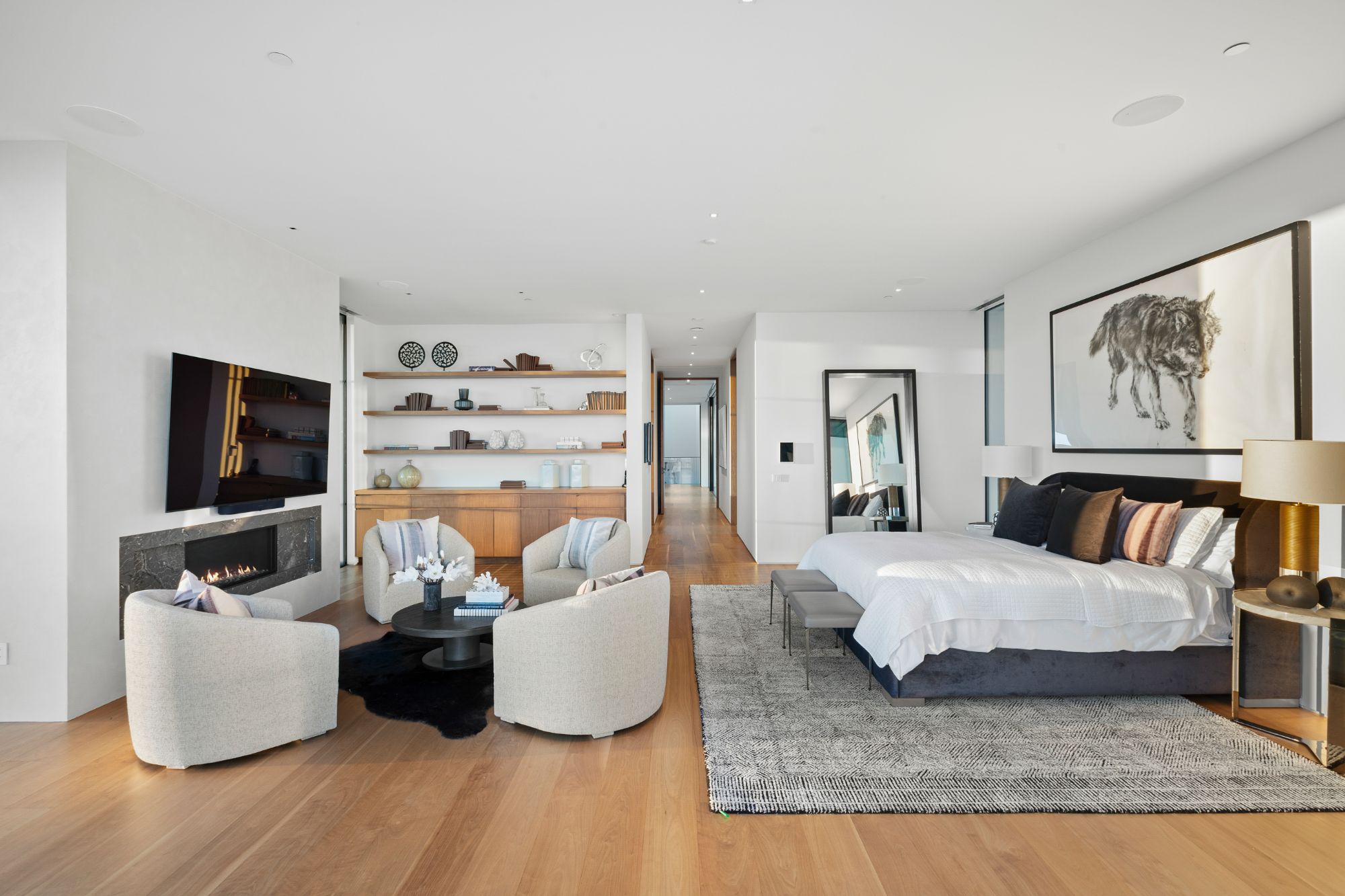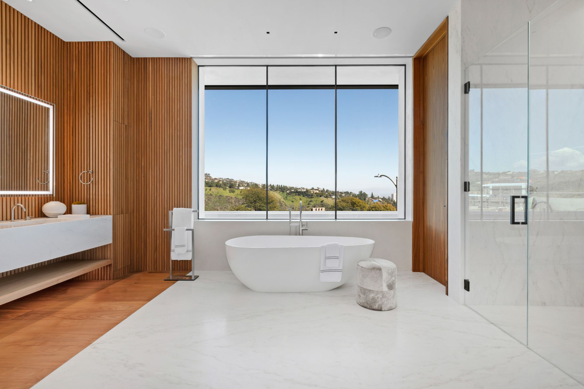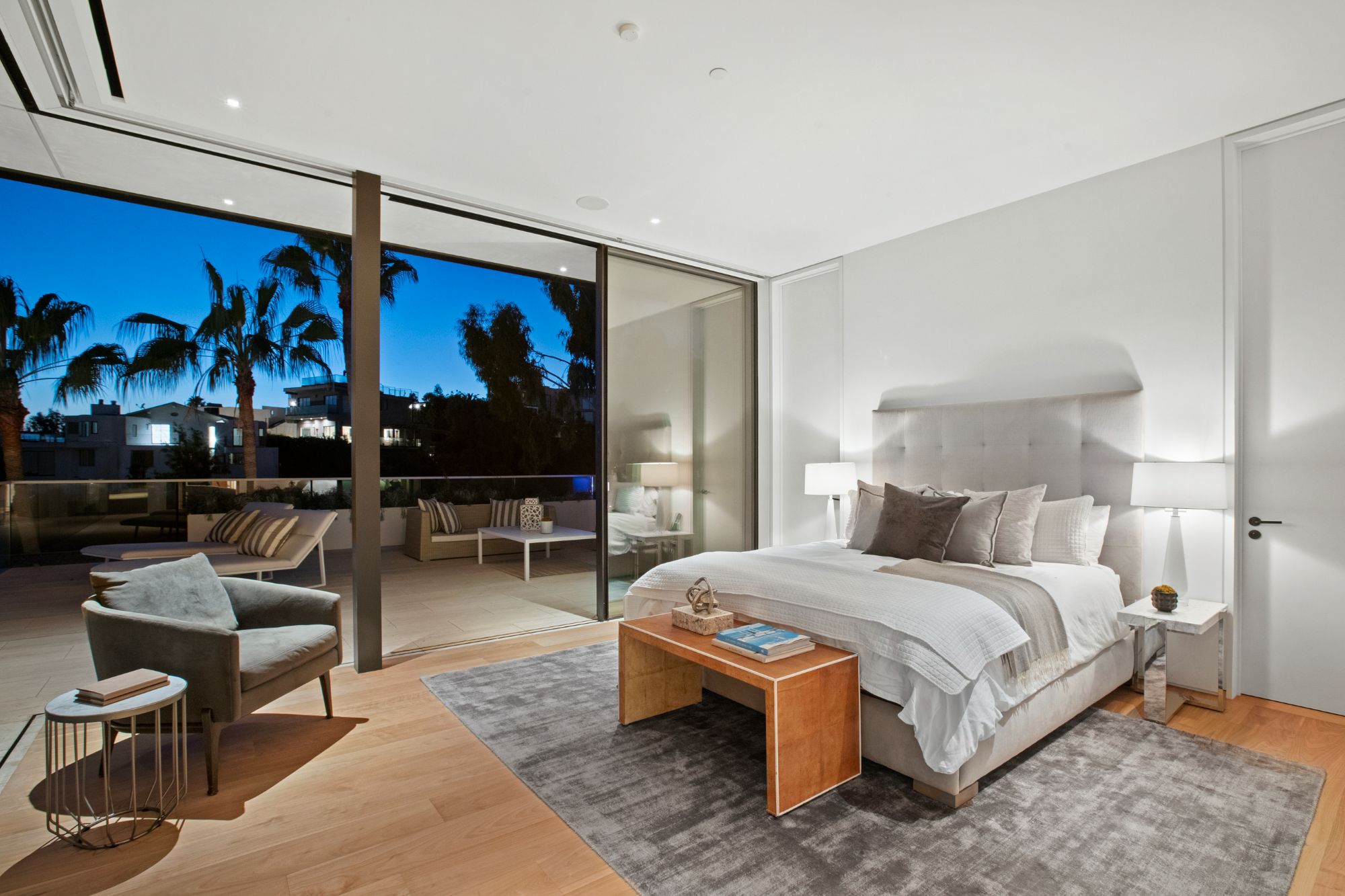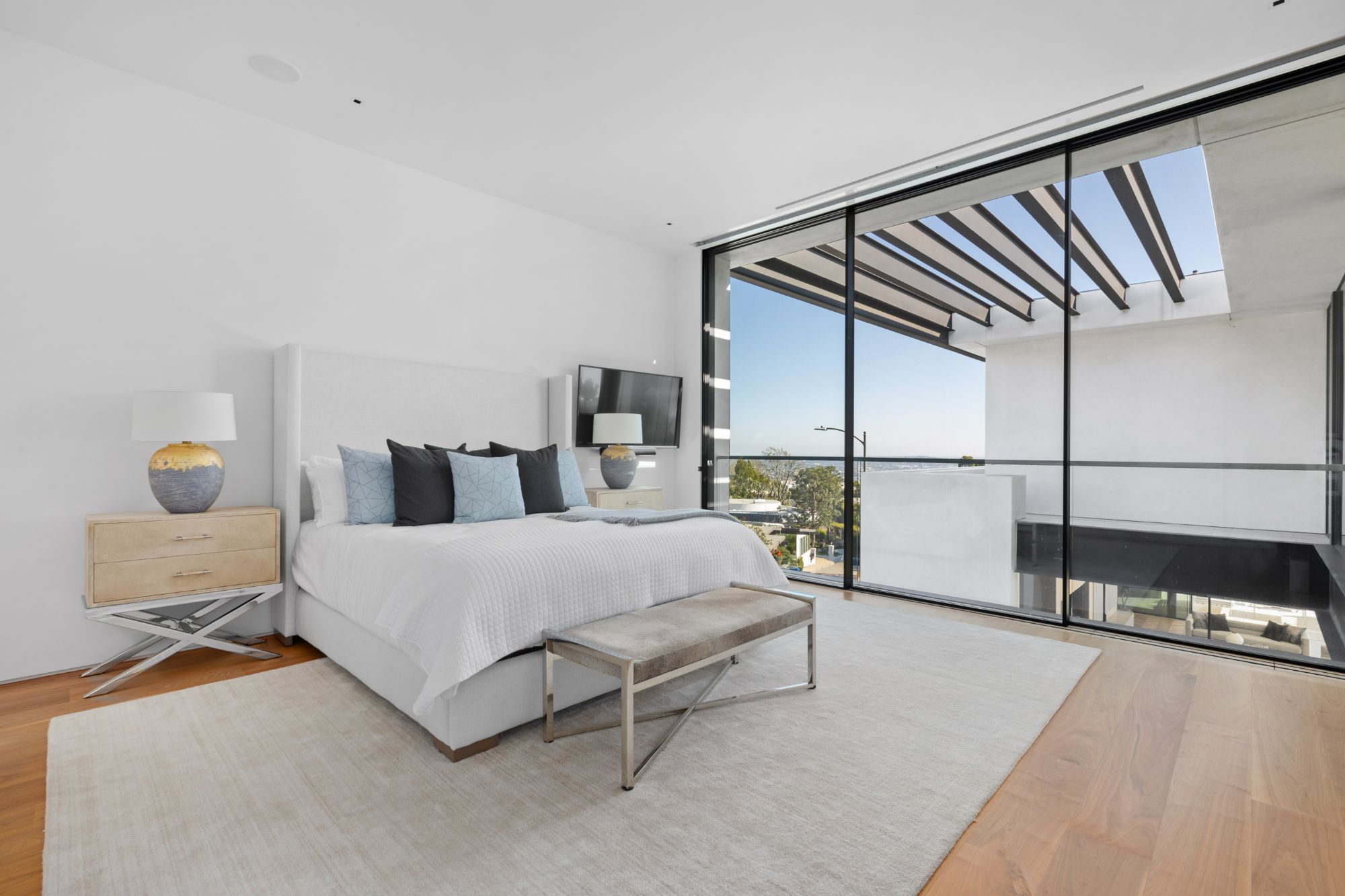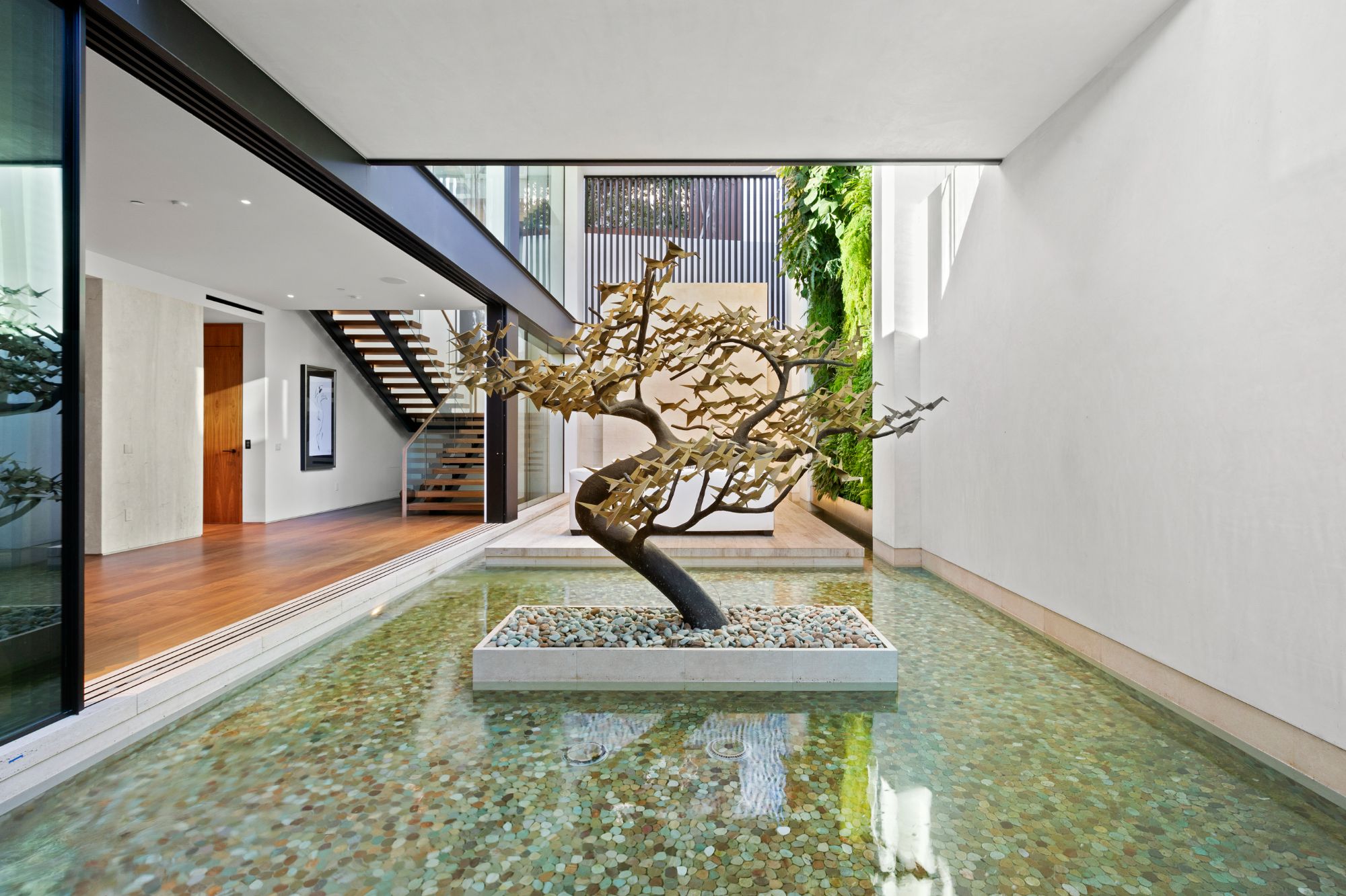 Discover contemporary elegance in this modern estate by McClean Design. A bridge, overlooking a lounge area with waterfall and living wall, welcomes you to this approx. 11,225 SF home. The formal living room features a beautiful herringbone floor, custom bar, fireplace, and walls of glass that showcase the view and open to create an unforgettable indoor/outdoor living experience. The gourmet kitchen offers top-of-the-line appliances, massive dual islands, and seamlessly blends into the dining room and secondary living room. Boasting 5 bedrooms and 9 bathrooms, this home offers ample space for family, friends, and guests. The spacious primary suite offers walk-in closet, spa-like bathroom, sitting area with fireplace, and glass walls that open to a private balcony overlooking the City of Angels. The daylit lower-level amenities include a fitness studio with sauna, a bar with walk-in wine cellar, billiards table, and movie theater. The beautifully landscaped outdoor oasis offers a large deck for dining al fresco, multiple seating areas, sunken fire pit, pool with spa, and sweeping views. Experience the pinnacle of luxury living in Beverly Hills.