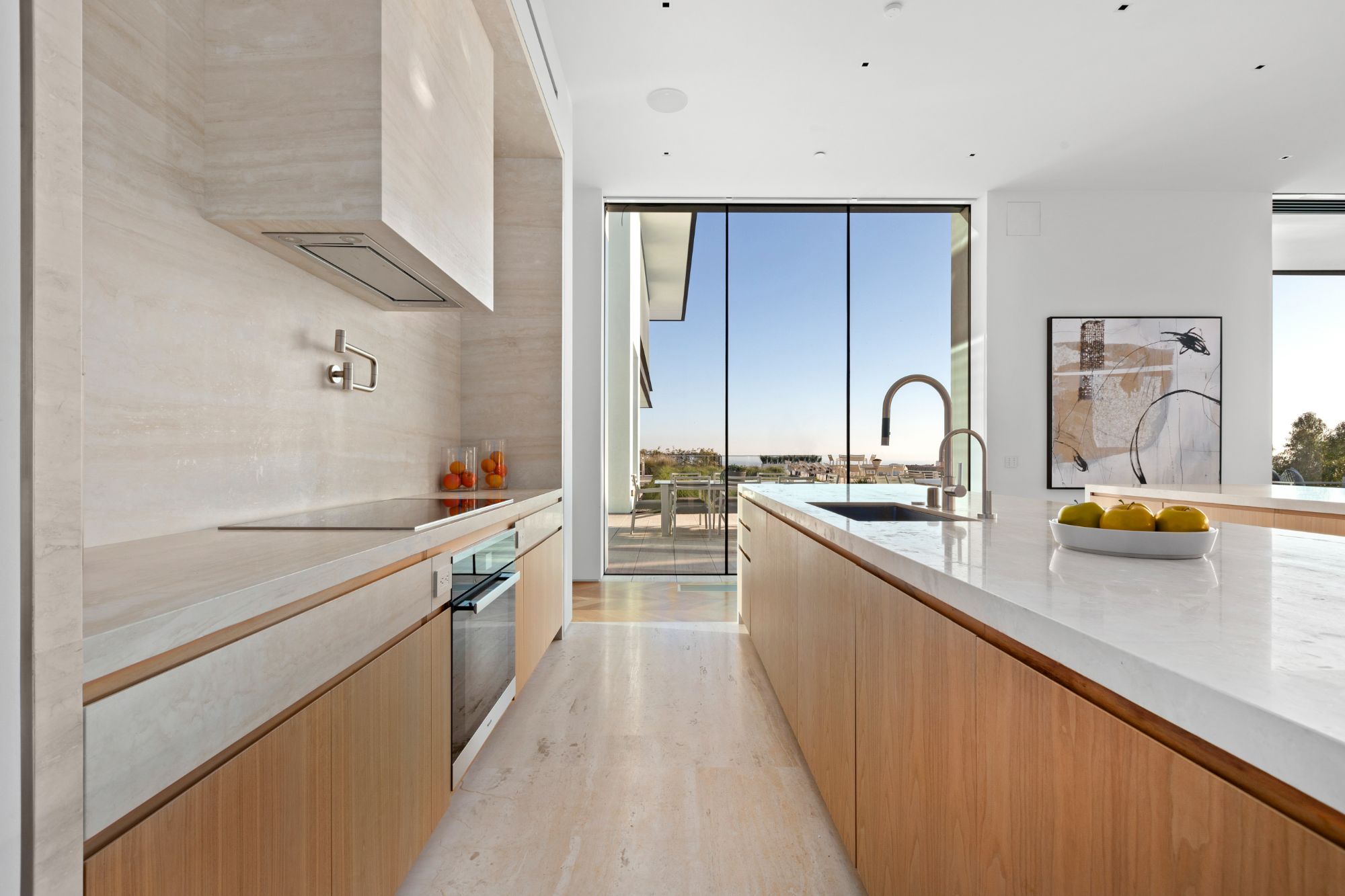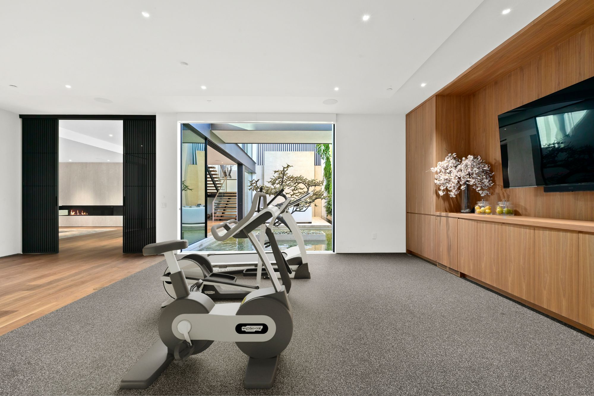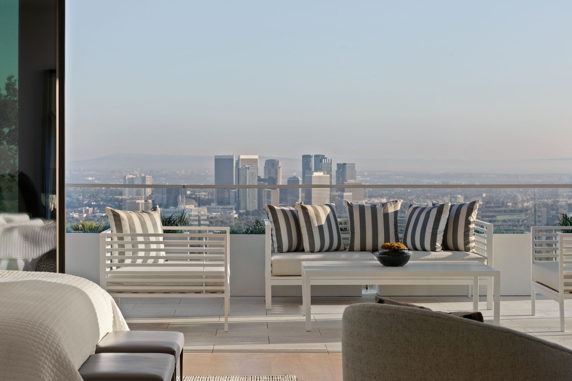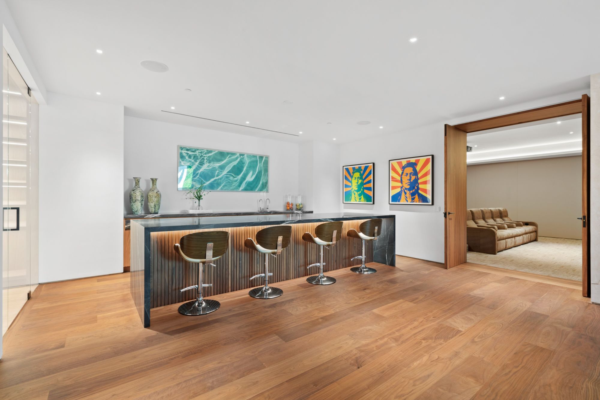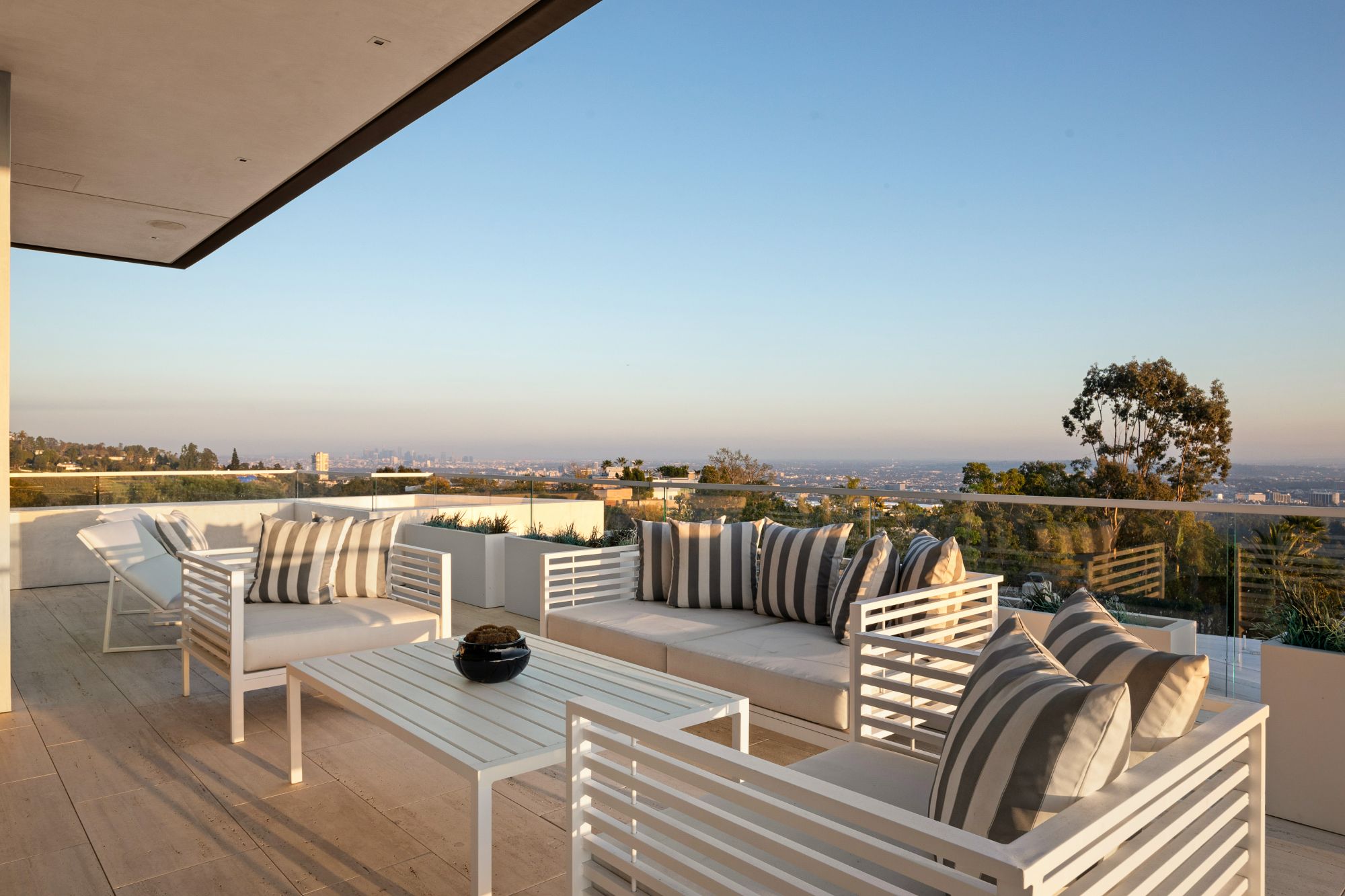 Discover contemporary elegance in this modern estate by McClean Design. A bridge, overlooking a lounge area with waterfall and living wall, welcomes you to this approx. 11,225 SF home. The formal living room features a beautiful herringbone floor, custom bar, fireplace, and walls of glass that showcase the view and open to create an unforgettable indoor/outdoor living experience. The gourmet kitchen offers top-of-the-line appliances, massive dual islands, and seamlessly blends into the dining room and secondary living room. Boasting 5 bedrooms and 9 bathrooms, this home offers ample space for family, friends, and guests. The spacious primary suite offers walk-in closet, spa-like bathroom, sitting area with fireplace, and glass walls that open to a private balcony overlooking the City of Angels. The daylit lower-level amenities include a fitness studio with sauna, a bar with walk-in wine cellar, billiards table, and movie theater. The beautifully landscaped outdoor oasis offers a large deck for dining al fresco, multiple seating areas, sunken fire pit, pool with spa, and sweeping views. Experience the pinnacle of luxury living in Beverly Hills.