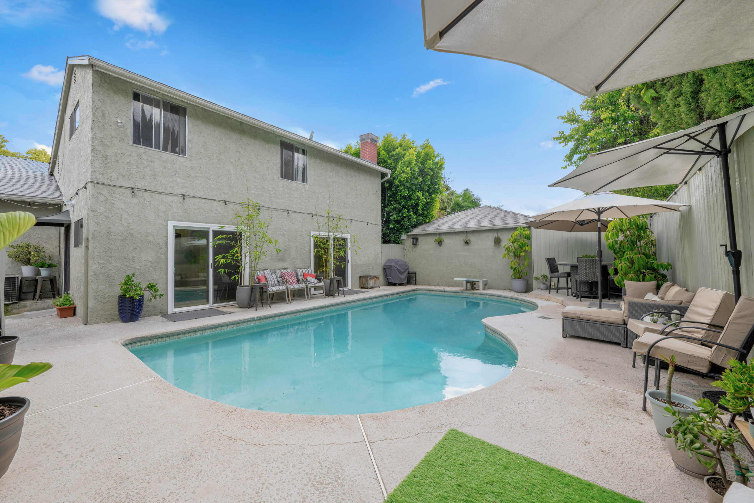 Location and Charm await you on a beautiful tree lined street in one of Sherman Oaks most sought-after neighborhoods, Fashion Square. From the exterior the home looks very traditional yet welcomes you with a modern vibe on the interior. This charming 3 bedroom, with private upstairs Primary Suite, family home comes with a pool and has all the amenities needed. There is a fully equipped Kitchen with a double oven which flows to both the rear family room and to the large living room with a separate dining area. The large back family room opens out to the pool area. To make it extra cozy there are fireplaces in both the living and family room. There is a fully equipped laundry room. The 2-car garage is unattached in the rear with more parking in the driveway. Location can't be beat, it's a short walk to Fashion Square Mall and Trader Joes. Easy access to both the 101 and 405 freeway. The neighborhood is quiet and secluded from through traffic which makes it perfect for leisurely walks right out your door. This truly is one of the premier neighborhoods in the Valley.