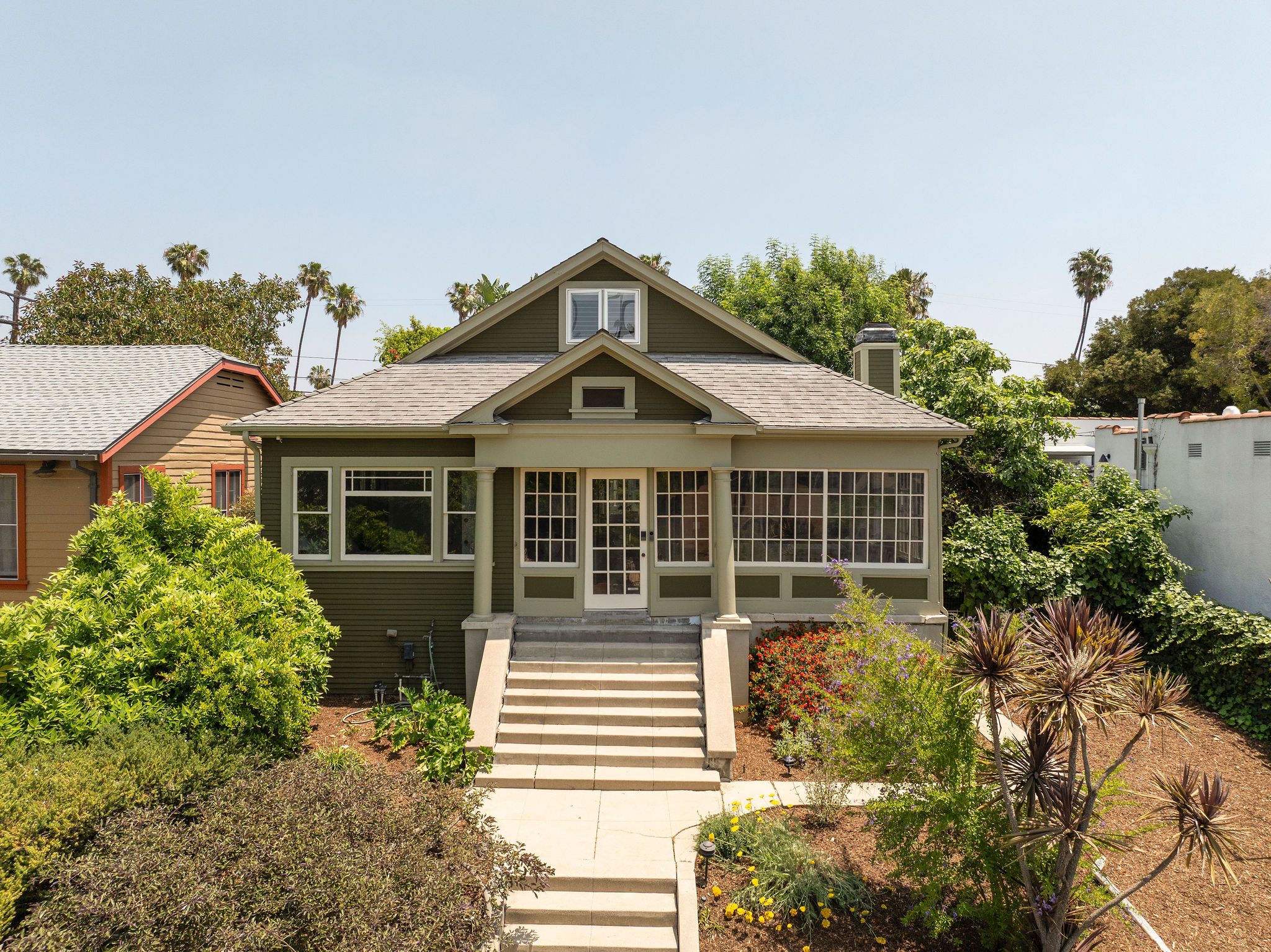 Set high in the Silver Lake hills, this striking Craftsman residence beautifully marries vintage charm with modern updates. Up past the manicured garden, a Saltillo-tiled enclosed sun porch leads to the main living space, a 2 bed, 2.5 bath light-filled home brimming with character, offering thoughtful details at every turn. Through the back atrium, find a detached studio with its own full bathroom surrounded by new landscaping, pergola-covered outdoor dining, and a romantic gazebo with a built-in hot tub. The front living room is bathed in natural light from plentiful windows centered around a cozy fireplace. Adjacent is a formal dining room that flows effortlessly into a stunning glass-paneled atrium, perfect as a den or sunlit home office. The kitchen has been tastefully refreshed with painted cabinetry, matte black pulls, refinished floors, and stainless steel appliances. A laundry area with a stacked washer/dryer, mudroom, powder bath, and extra storage cabinets adds everyday functionality. The front bedroom features its own separate entrance, perfect for guests, and offers large windows, a built-in drop-down desk, and an updated ensuite bath with a spacious shower. The second bedroom, ideal as the primary, sits at the rear of the main home, with romantic French doors that open to a generous deck. Down its own private hallway, you'll also find a full bath with penny tile floors, a linen closet, and an oversized storage closet. The home's showstopper is a vaulted, windowed atrium, with French doors opening to the backyard. Newly landscaped, fenced, and hedged, with an intimate dining area and mature plantings, the backyard is a true retreat. Additionally, find an elevated terrace with a built-in spa and seating area. At the rear of the property, a detached studio offers even more flexibility with an open floor plan, kitchenette, full bath, walk-in closet, and loft space. Every inch of this home is smartly used, including a whimsical fully finished bonus attic space with A-frame ceilings, vinyl plank floors with recessed closets, and peekaboo views of the Hollywood Sign and Griffith Observatory. The property's additional features include a single-car garage, a tankless water heater, and a Nest thermostat. Located near some of L.A.'s most beloved spots, you're minutes from exploring the shops and eateries of Echo Park and Silver Lake, including Greekman's, Cafe Nido, and Bodega Park. Whether you're lounging in the sunroom or dining under the stars, this Craftsman gem delivers charm, functionality, and that signature California lifestyle.