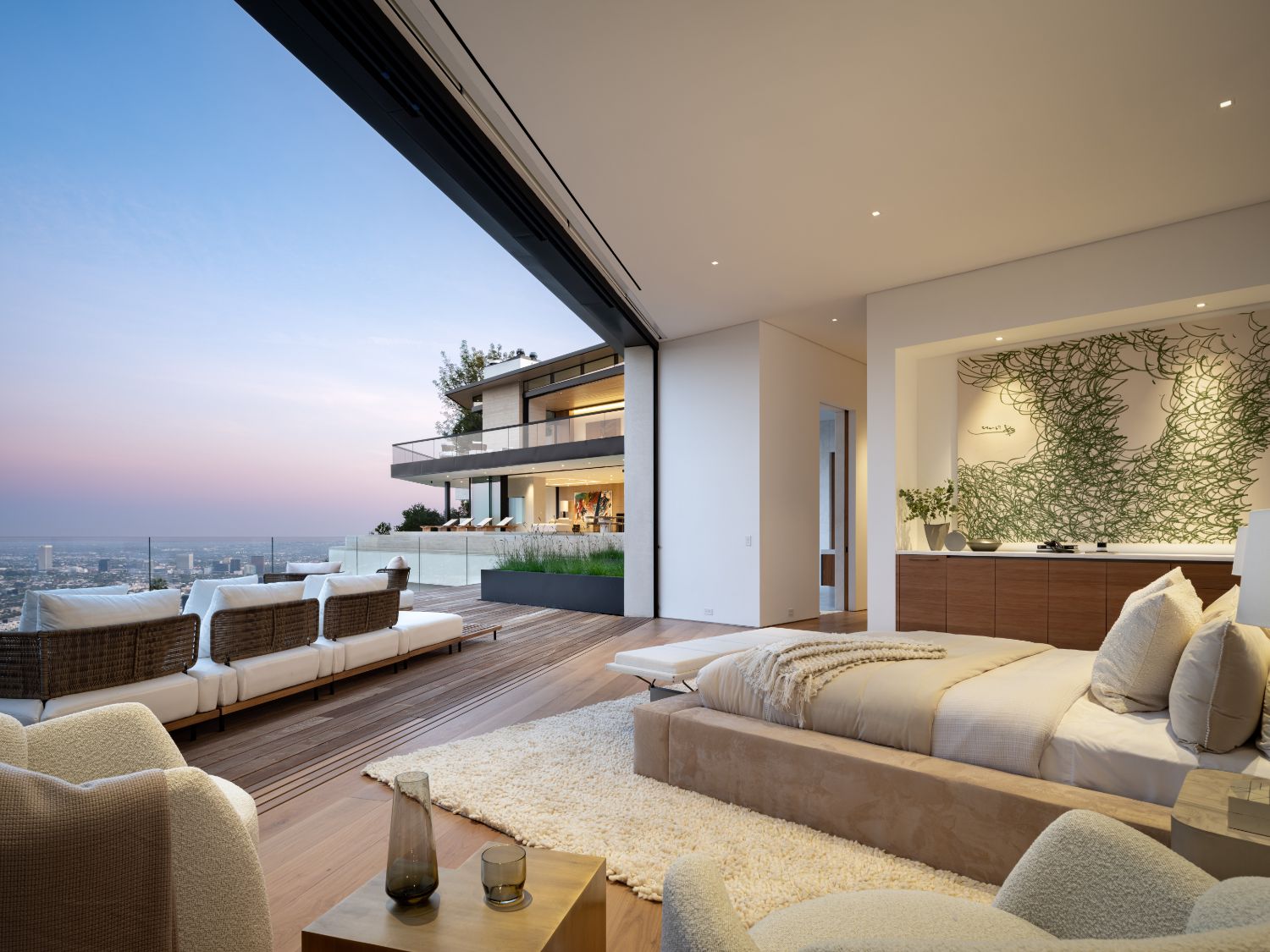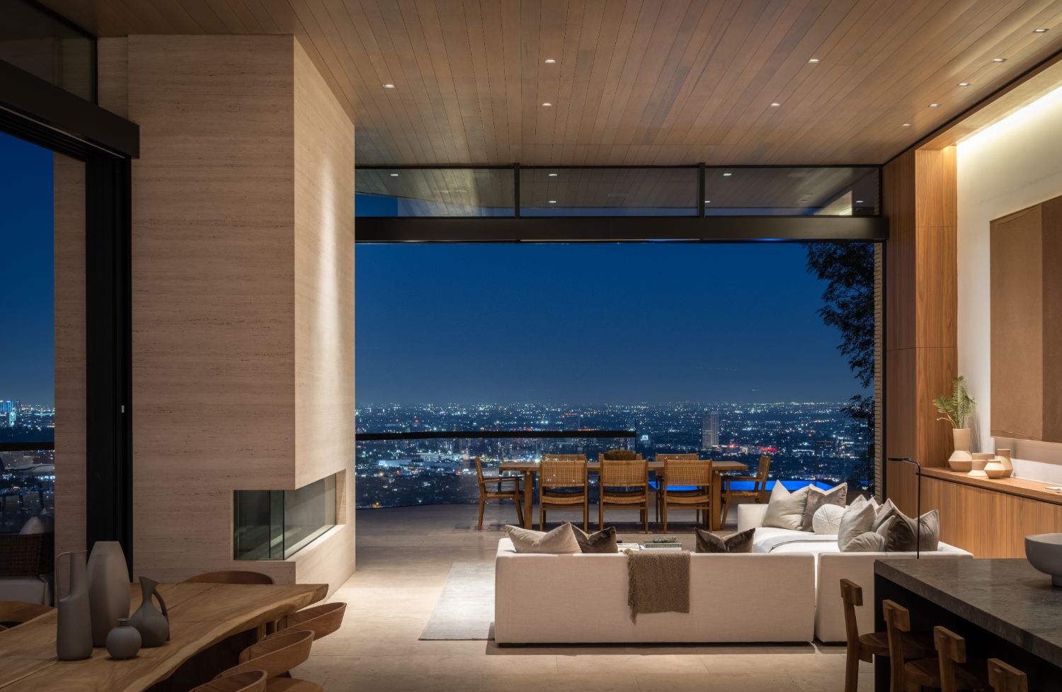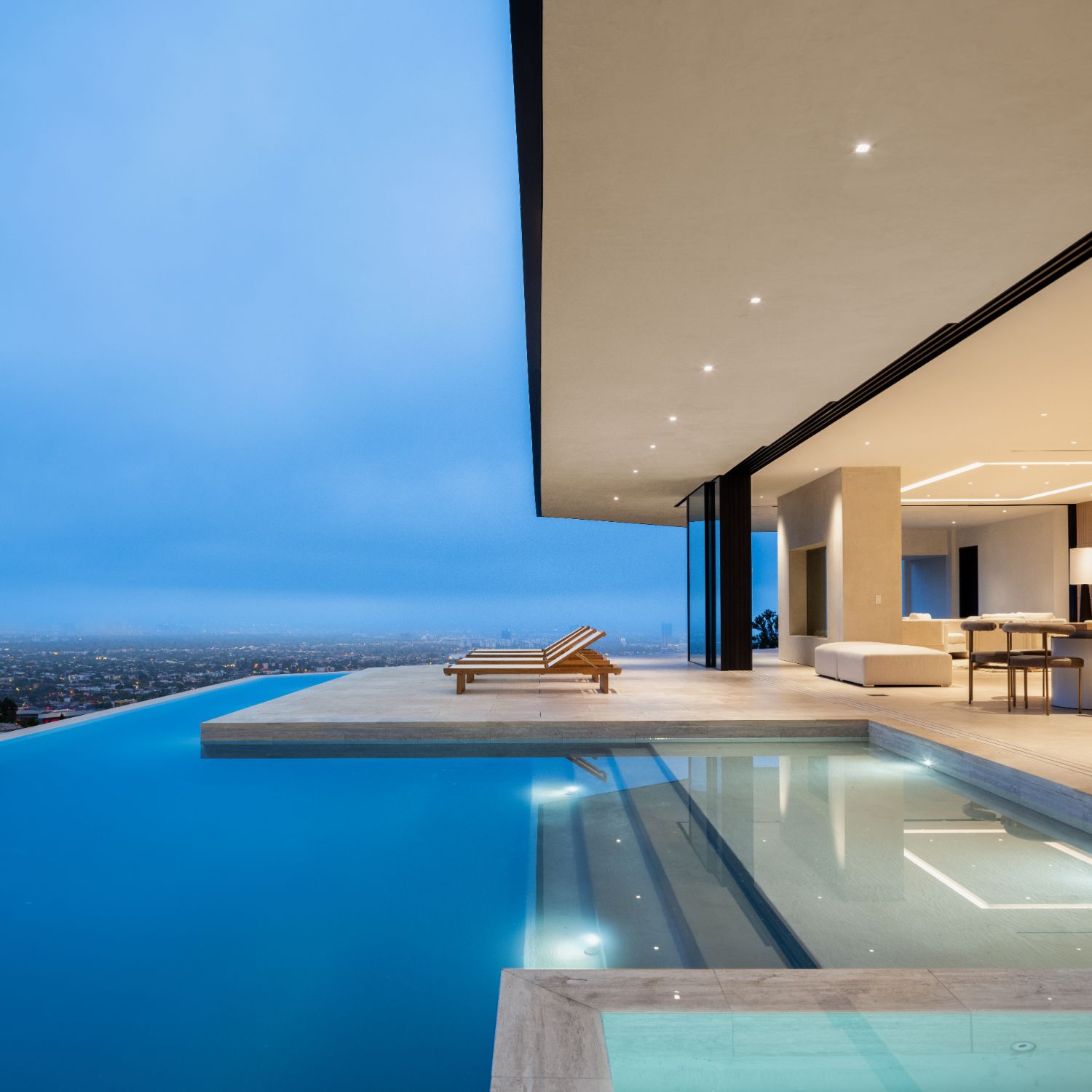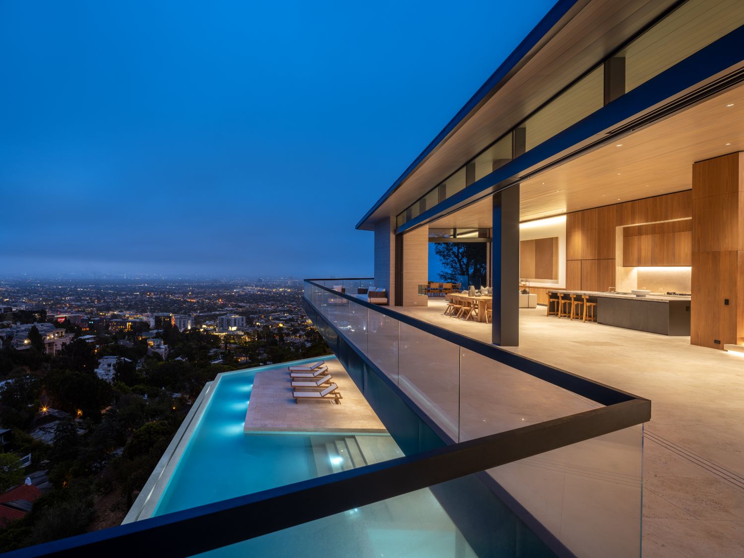 Sited on the most prestigious cul-de-sac in the famed Bird Streets, this remarkable modern home designed by Vantage Design Group features the finest finishes, incredible volume, and jetliner views over the Los Angeles basin. A discreet facade leads to the upper level via a skylit foyer framing the perfect entry to a dramatic living space. Disappearing walls of glass create an idyllic indoor/outdoor entertainment area with panoramic views. Honed travertine, walnut millwork, and natural materials create a warm aesthetic blending seamlessly to the expansive outdoor deck. The home features a bar, spa, and multiple seating areas. The second level entertaining area is framed by a jaw-dropping infinity pool featuring a baja shelf, a cascading water wall, and a spa where one can soak amongst the sparkling city lights. A gorgeous Jade bar sits in front of a beautiful walk-in wine room, perfect for entertaining guests. The spacious private primary suite features a generous walk-in closet and opens to its own lounging deck with an outdoor fire pit. Lower level guest suites and a maid's quarter all feature stunning bathrooms and sweeping city views. Additional amenities include an elevator, smart home system, large gym with yoga area overlooking an atrium, steam room, dry sauna, outdoor pool bathroom, and bbq. 5+ years in the making, a true trophy in a blue-chip location.
