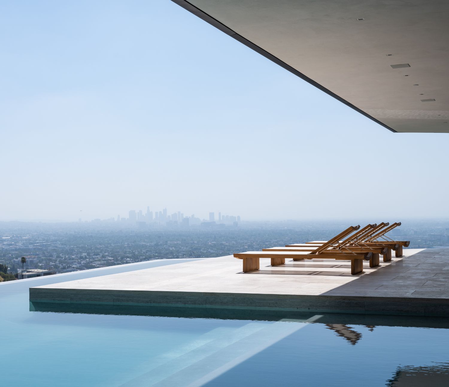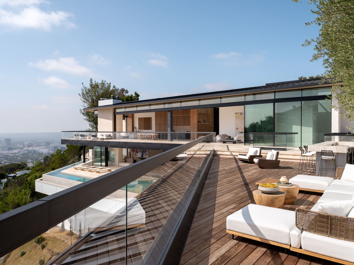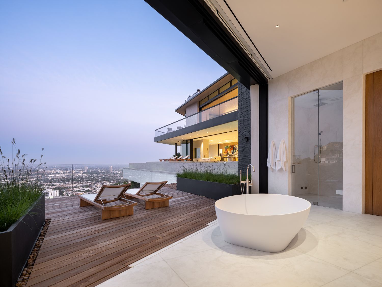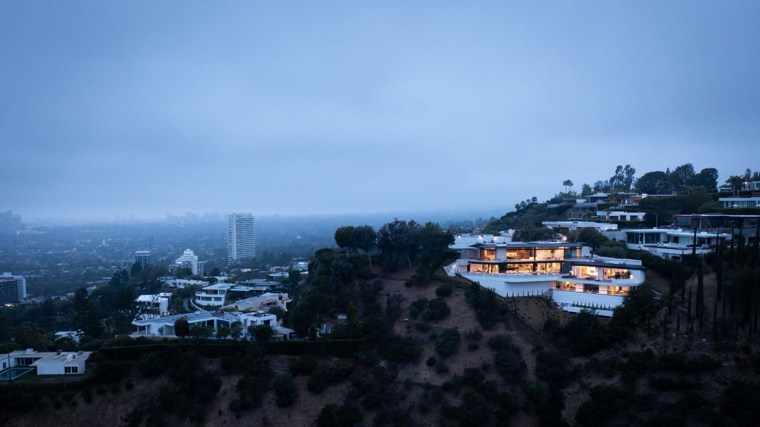 Sited on the most prestigious cul-de-sac in the famed Bird Streets, this remarkable modern home designed by Vantage Design Group features the finest finishes, incredible volume, and jetliner views over the Los Angeles basin. A discreet facade leads to the upper level via a skylit foyer framing the perfect entry to a dramatic living space. Disappearing walls of glass create an idyllic indoor/outdoor entertainment area with panoramic views. Honed travertine, walnut millwork, and natural materials create a warm aesthetic blending seamlessly to the expansive outdoor deck. The home features a bar, spa, and multiple seating areas. The second level entertaining area is framed by a jaw-dropping infinity pool featuring a baja shelf, a cascading water wall, and a spa where one can soak amongst the sparkling city lights. A gorgeous Jade bar sits in front of a beautiful walk-in wine room, perfect for entertaining guests. The spacious private primary suite features a generous walk-in closet and opens to its own lounging deck with an outdoor fire pit. Lower level guest suites and a maid's quarter all feature stunning bathrooms and sweeping city views. Additional amenities include an elevator, smart home system, large gym with yoga area overlooking an atrium, steam room, dry sauna, outdoor pool bathroom, and bbq. 5+ years in the making, a true trophy in a blue-chip location.