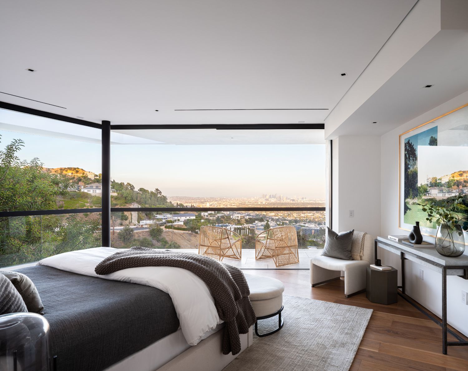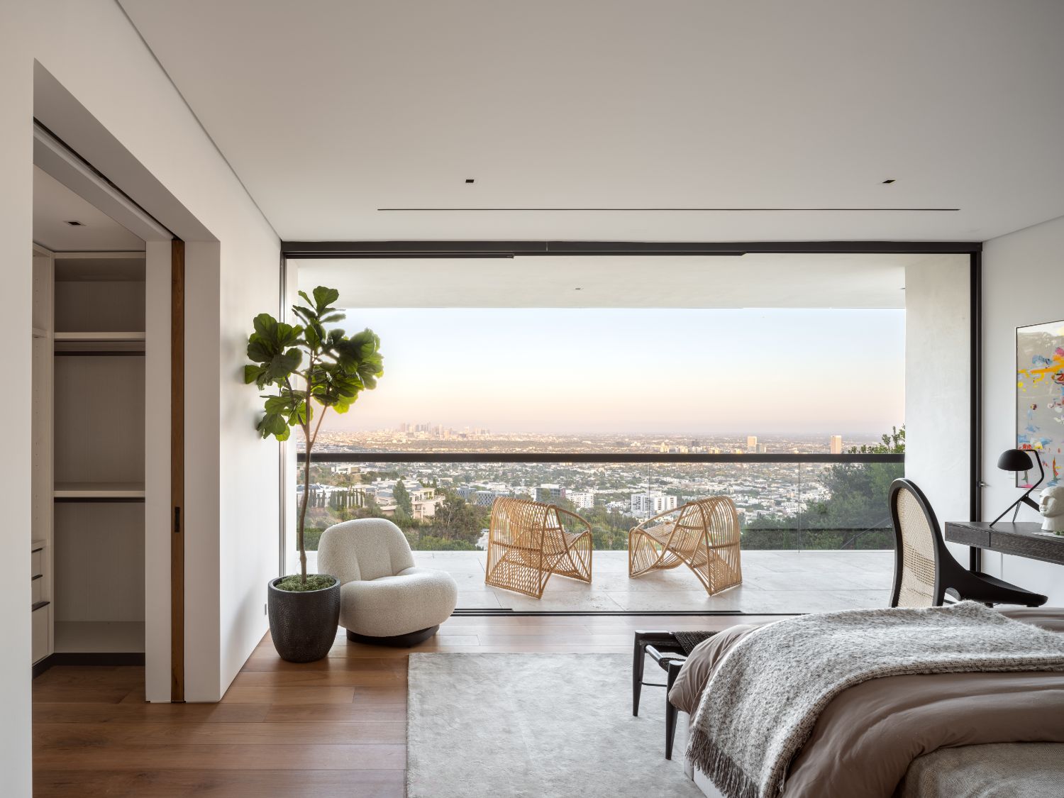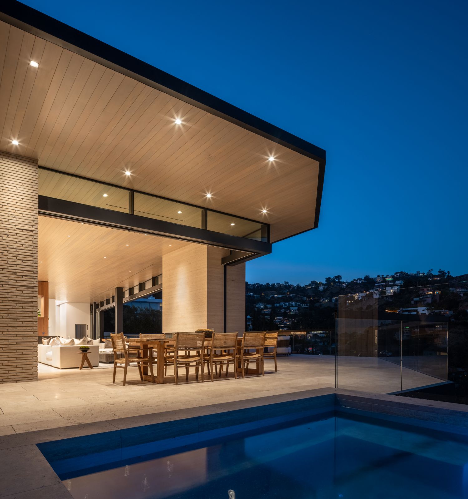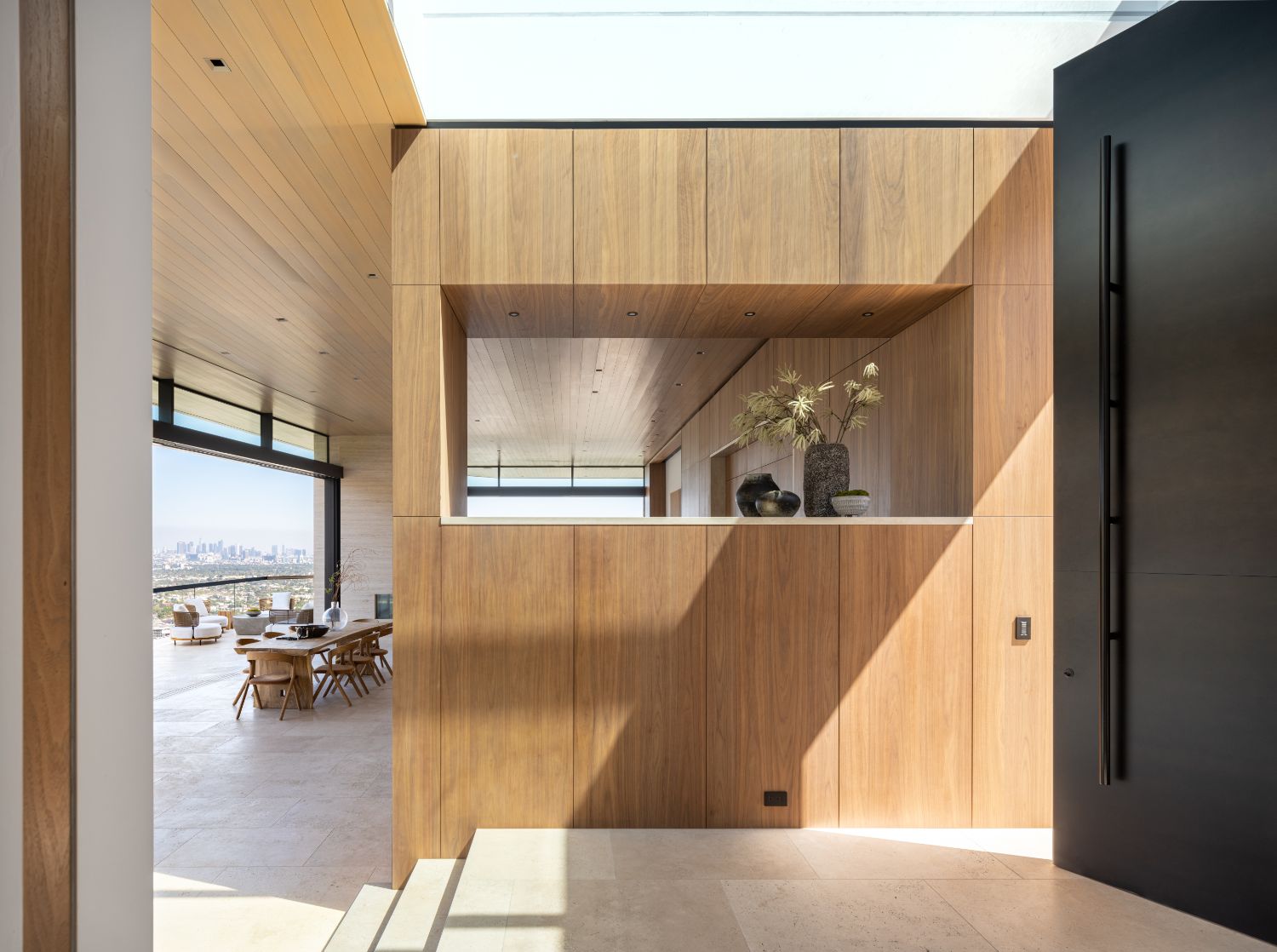Sited on the most prestigious cul-de-sac in the famed Bird Streets, this remarkable modern home designed by Vantage Design Group features the finest finishes, incredible volume, and jetliner views over the Los Angeles basin. A discreet facade leads to the upper level via a skylit foyer framing the perfect entry to a dramatic living space. Disappearing walls of glass create an idyllic indoor/outdoor entertainment area with panoramic views. Honed travertine, walnut millwork, and natural materials create a warm aesthetic blending seamlessly to the expansive outdoor deck. The home features a bar, spa, and multiple seating areas. The second level entertaining area is framed by a jaw-dropping infinity pool featuring a baja shelf, a cascading water wall, and a spa where one can soak amongst the sparkling city lights. A gorgeous Jade bar sits in front of a beautiful walk-in wine room, perfect for entertaining guests. The spacious private primary suite features a generous walk-in closet and opens to its own lounging deck with an outdoor fire pit. Lower level guest suites and a maid's quarter all feature stunning bathrooms and sweeping city views. Additional amenities include an elevator, smart home system, large gym with yoga area overlooking an atrium, steam room, dry sauna, outdoor pool bathroom, and bbq. 5+ years in the making, a true trophy in a blue-chip location.