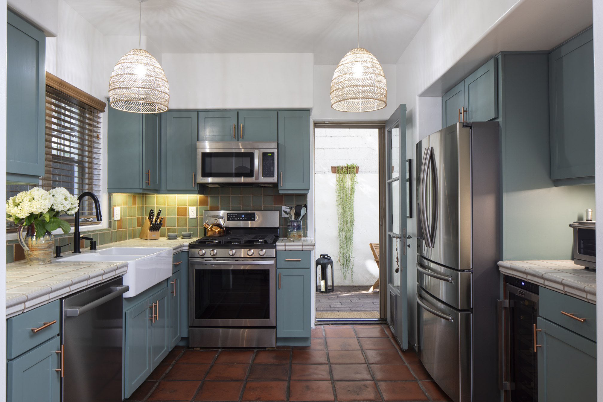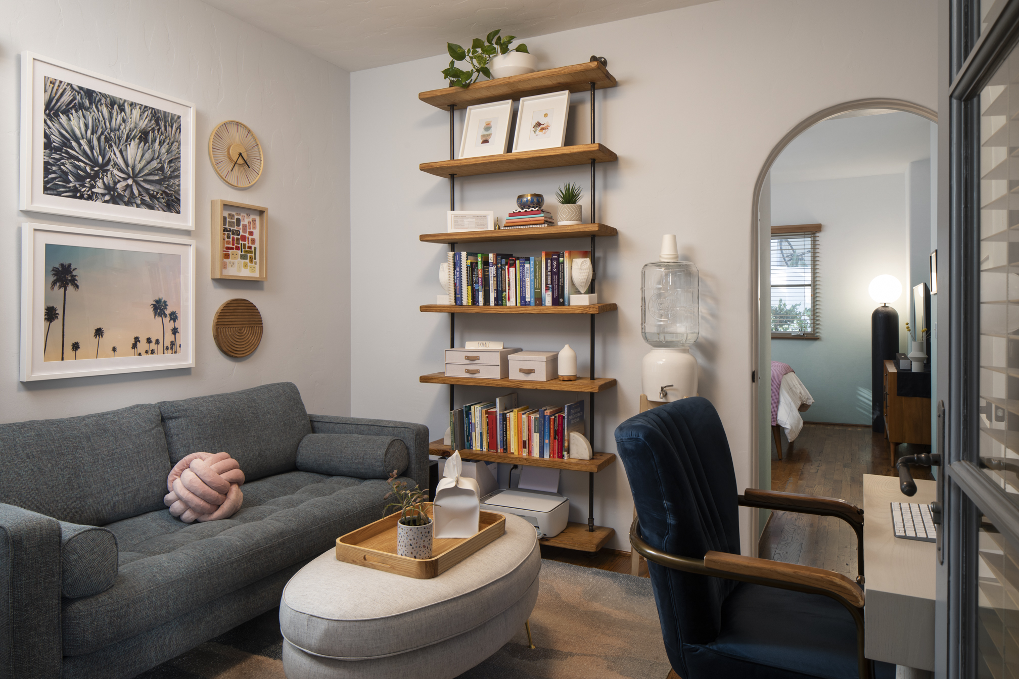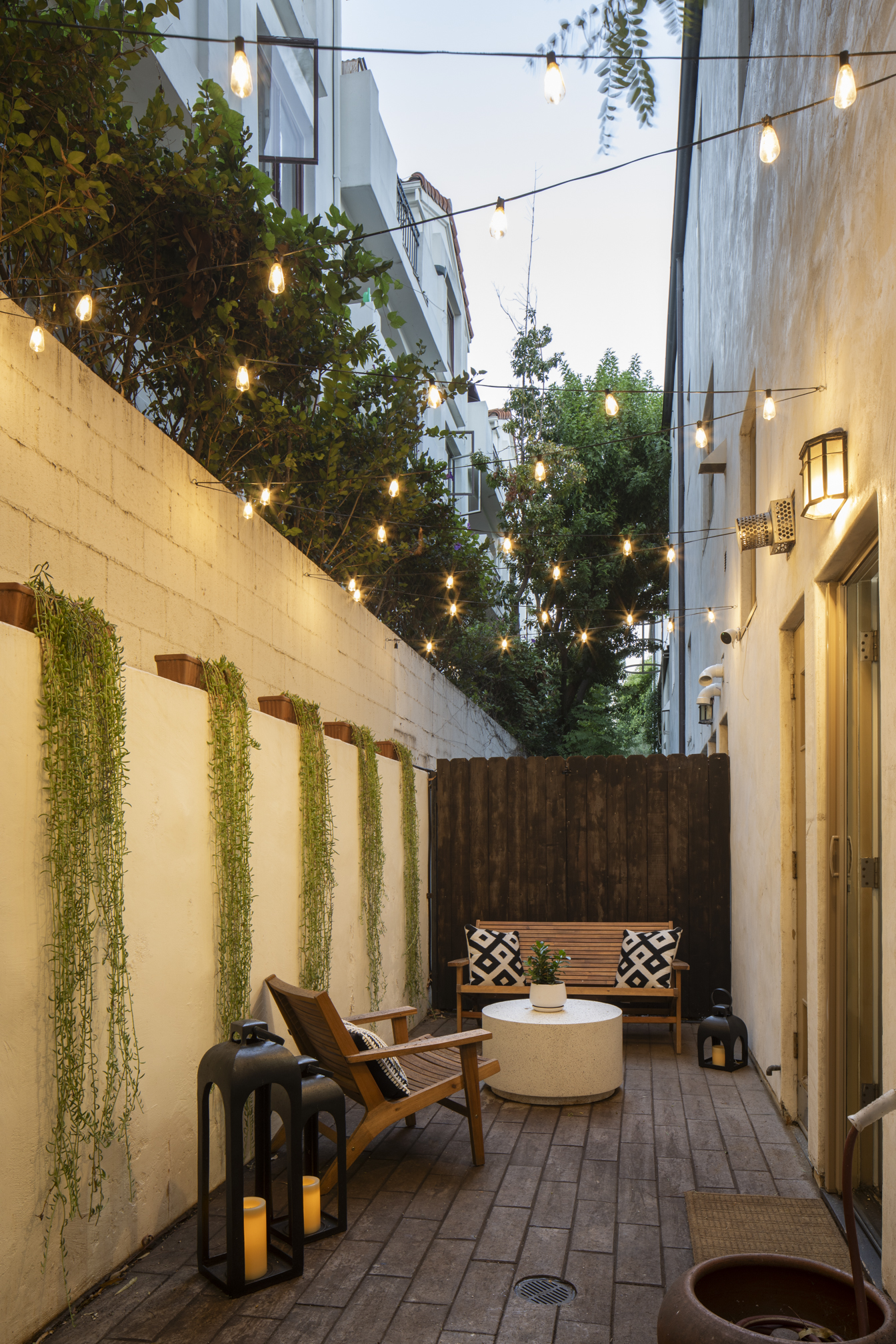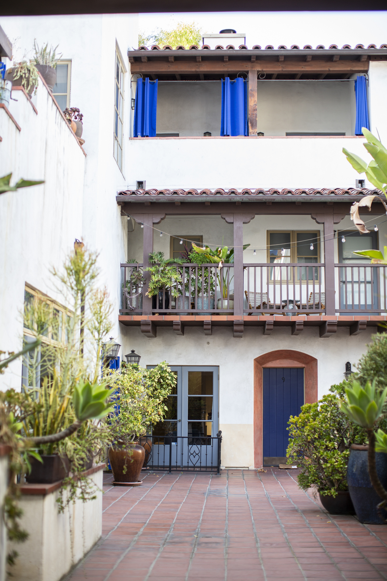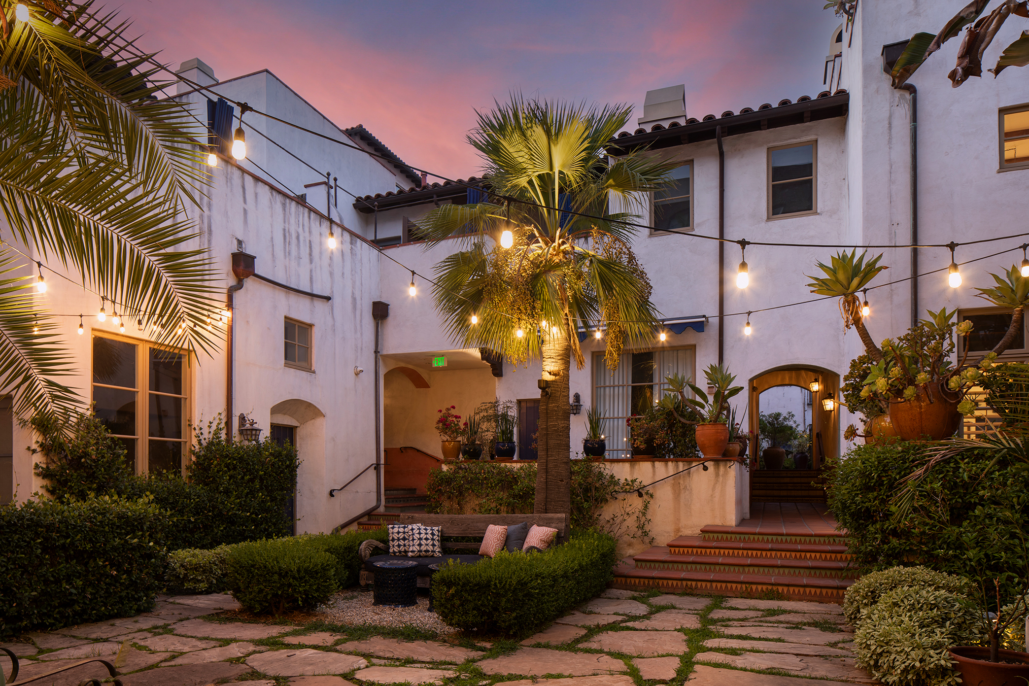 Elevate your lifestyle in the heart of West Hollywood with this rare end-unit townhome, which combines award-winning Spanish Revival architecture with modern luxury. With five exterior entrances and three private outdoor spaces, this unique 2-bedroom, 2.5-bath residence is designed for ease and seamless indoor-outdoor living. An additional office and waiting area enjoy exclusive access directly off a manicured guest parking lot, offering rare and ideal live/work convenience. Enjoy custom features including designer light fixtures, built-ins, and a commissioned four-story mural by notable artists. Surrounded by a peaceful tree canopy, the primary suite boasts a walk-in closet, ensuite spa bath with hand-painted terra cotta tiles, bright Juliet balcony, and inviting covered patio. On the ground floor, a hardscaped side yard with turfed pet area provides relaxation and convenience. Other amenities include a brand-new HVAC system, brand new Bosch dishwasher, updated appliances, new Apollo retractable screens, state-of-the-art alarm system / security cameras, and two designated, side x side parking spaces in a secure underground garage-not visible from the street and one of several vehicle-to-door access points. Three large and secure storage spaces round out the well-appointed package. Surrounded by lush courtyards with trickling fountains, koi ponds, an outdoor fireplace, a spa, and its own bronze angel statue, this well-known gated community, commonly called "Seven Fountains" provides both a serene escape and a creative community in the heart of West Hollywood. Close to the vibrant Sunset and Santa Monica Boulevards, with proximity to the Chateau Marmont and The Sunset Tower Hotel, you'll have in this townhome a lifestyle upgrade that's hard to replicate in all of Los Angeles.